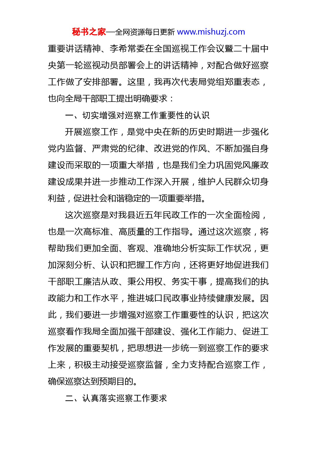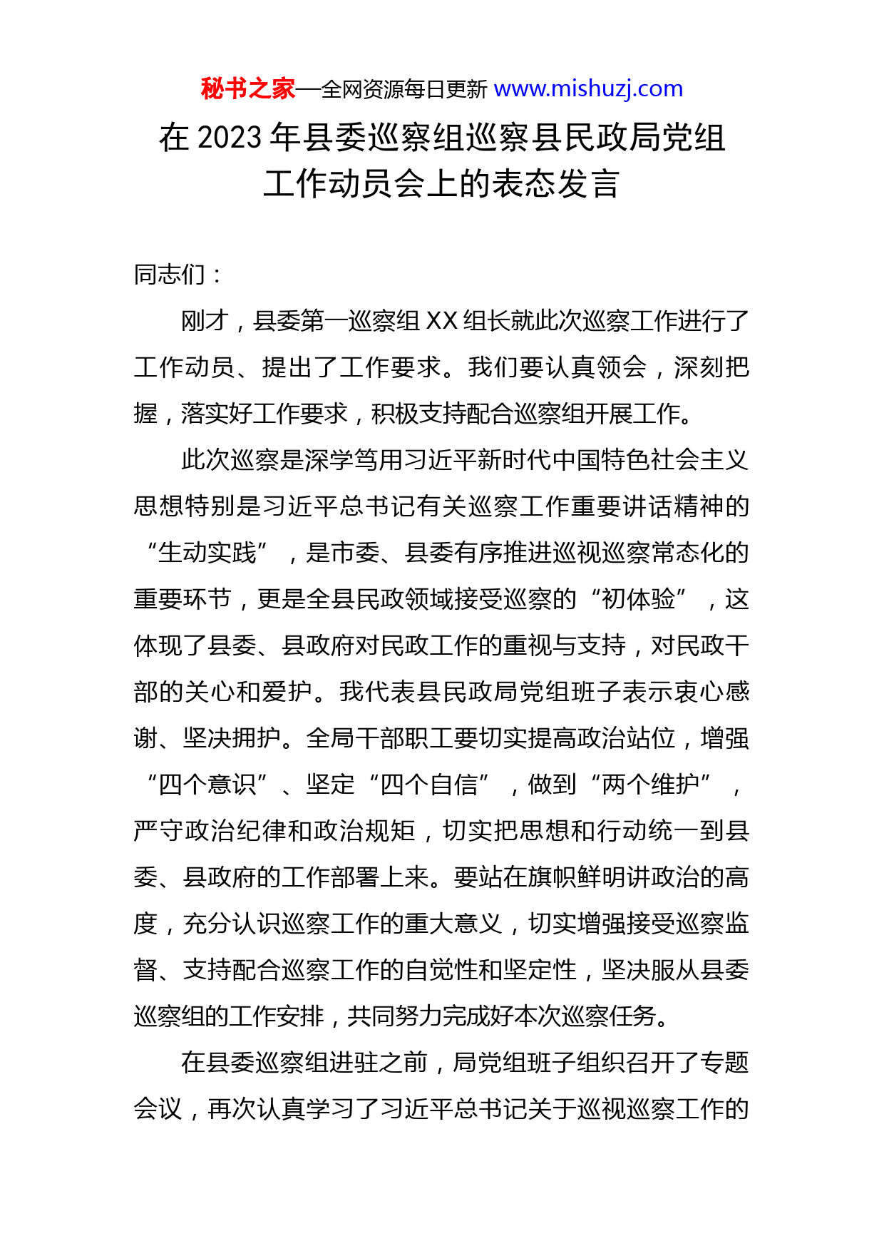 秘书之家—全网资源每日更新www.mishuzj.com在2023年县委巡察组巡察县民政局党组工作动员会上的表态发言同志们:刚才,县委第一巡察组XX组长就此次巡察工作进行了工作动员、提出了工作要求。我们要认真领会,深刻把握,落实好工作要求,积极支持配合巡察组开展工作。此次巡察是深学笃用习近平新时代中国特色社会主义思想特别是习近平总书记有关巡察工作重要讲话精神的“生动实践”,是市委、县委有序推进巡视巡察常态化的重要环节,更是全县民政领域接受巡察的“初体验”,这体现了县委、县政府对民政工作的重视与支持,对民政干部的关心和爱护。我代表县民政局党组班子表示衷心感谢、坚决拥护。全局干部职工要切实提高政治站位,增强“四个意识”、坚定“四个自信”,做到“两个维护”,严守政治纪律和政治规矩,切实把思想和行动统一到县委、县政府的工作部署上来。要站在旗帜鲜明讲政治的高度,充分认识巡察工作的重大意义,切实增强接受巡察监督、支持配合巡察工作的自觉性和坚定性,坚决服从县委巡察组的工作安排,共同努力完成好本次巡察任务。在县委巡察组进驻之前,局党组班子组织召开了专题会议,再次认真学习了习近平总书记关于巡视巡察工作的秘书之家—全网资源每日更新www.mishuzj.com重要讲话精神、李希常委在全国巡视工作会议暨二十届中央第一轮巡视动员部署会上的讲话精神,对配合做好巡察工作做了安排部署。这里,我再次代表局党组郑重表态,也向全局干部职工提出明确要求:一、切实增强对巡察工作重要性的认识开展巡察工作,是党中央在新的历史时期进一步强化党内监督、严肃党的纪律、改进党的作风、不断加强自身建设而采取的一项重大举措,也是我们全力巩固党风廉政建设成果并进一步推动工作深入开展,维护人民群众切身利益,促进社会和谐稳定的一项重要举措。这次巡察是对我县近五年民政工作的一次全面检阅,也是一次高标准、高质量的工作指导。通过这次巡察,将帮助我们更加全面、客观、准确地分析实际工作状况,更加深刻分析、认识和把握工作方向,还将更好地促进我们干部职工廉洁从政、秉公用权、务实干事,提高我们的执政能力和工作水平,推进城口民政事业持续健康发展。因此,我们要进一步增强对巡察工作重要性的认识,把这次巡察看作我局全面加强干部建设、强化工作能力、促进工作发展的重要契机,把思想进一步统一到巡察工作的要求上来,积极主动接受巡察监督,全力支持配合巡察工作,确保巡察达到预期目的。二、认真落实巡察工作要求秘书之家—全网资源每日更新www.mishuzj.com这次巡察明确围绕“三个聚焦”,将重点了解局党组班子政治建设、思想建设、组织建设、作风建设、纪律建设和反腐败压倒性胜利等方面工作开展情况。全局干部职工要按照巡察工作纪律要求,实事求是地反映情况和问题,客观公正地提出意见和看法,确保巡察组了解真实情况。对巡察组要求提交的有关材料,要准确及时提供,做到不隐瞒、不拖延;对巡察组要求作出的工作汇报,要坚持实事求是和问题导向,实事求是讲工作,毫不掩饰摆问题;对巡察组反馈的意见建议,要主动认领、全盘接收,形成工作台账,认真整改。三、积极支持配合巡察工作全局干部职工一定要按照巡察组的工作计划和要求,按照局党组的工作部署,加强组织协调,积极主动地支持配合巡察组开展工作,绝不允许以任何理由影响巡察工作的开展。巡察期间,全局干部职工要合理安排工作和时间,时刻保持通讯畅通,减少非必要外出,确需外出的,必须严格执行请假报告制度。负责联系协调巡察工作的协调人和联络员,要主动与巡察组保持密切的沟通联系,及时向反映各项工作开展落实情况,为巡察工作做好服务和保障。四、正确对待巡察发现的问题巡察工作对于我们深入分析自身存在的缺点和不足,秘书之家—全网资源每日更新www.mishuzj.com进一步明确努力方向是有力的指导和督促。巡察的目的不在巡察本身,而在于抓好巡察中发现问题的整改落实,实现加强自身建设、推动事业发展的目标。因此,我们恳切地希望巡察组对我局党组班子及各方面的工作多提批评意见,我们将会客观对待、虚心接受巡察组提出的意见和建议,决不回避敷衍。局党组班子充分重视正视实际存在的问题,逐一对比排查,认真剖析研究,拿出整改措施,分解落实责任,把整改工作与制度建设有机结合起来,充分发挥巡察整改的促进作用,推动民政事业向好向优地发展,不辜负市县委的期期盼和人民群众的重托。以上发言,不妥之处,请巡察组各位领导批评指正。