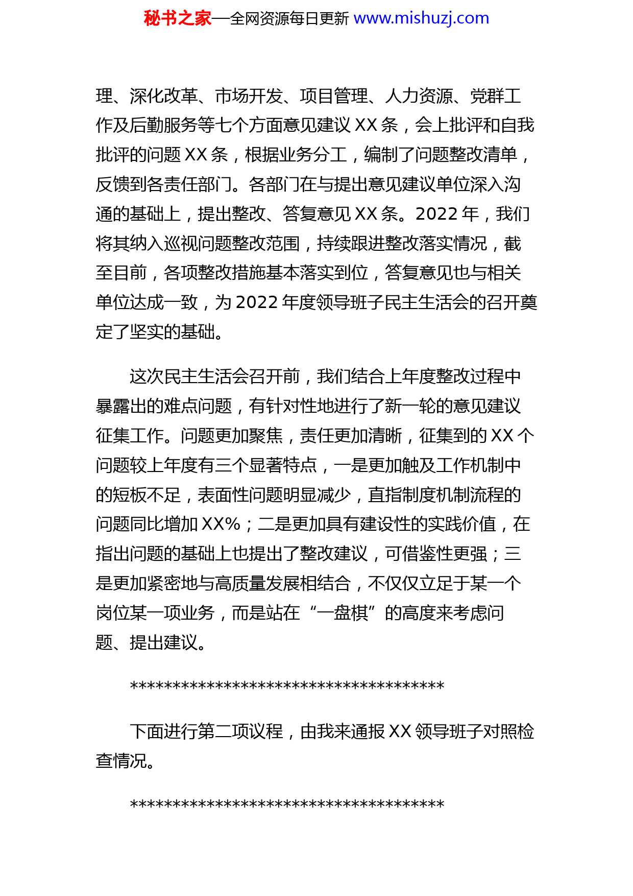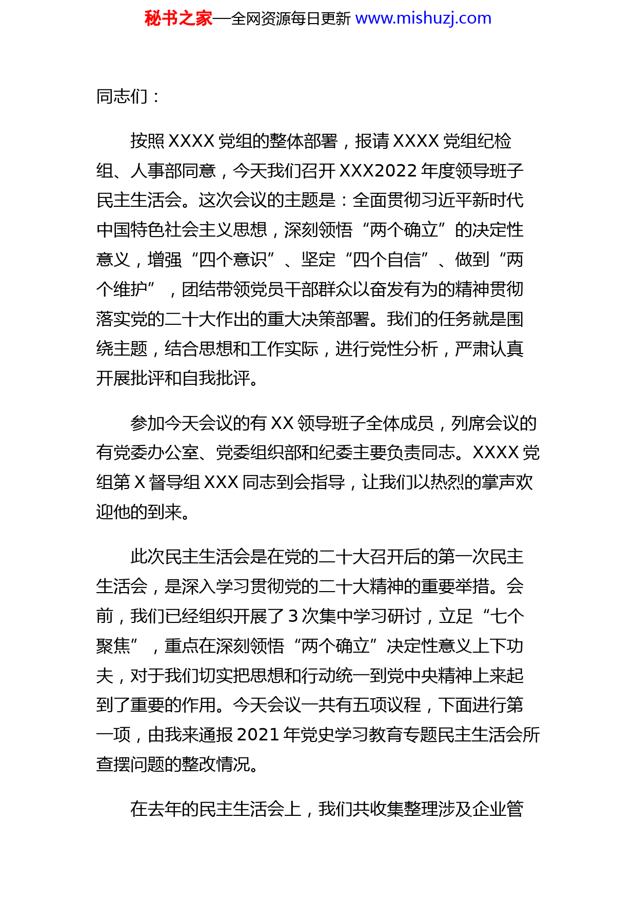 秘书之家—全网资源每日更新www.mishuzj.com同志们:按照XXXX党组的整体部署,报请XXXX党组纪检组、人事部同意,今天我们召开XXX2022年度领导班子民主生活会。这次会议的主题是:全面贯彻习近平新时代中国特色社会主义思想,深刻领悟“两个确立”的决定性意义,增强“四个意识”、坚定“四个自信”、做到“两个维护”,团结带领党员干部群众以奋发有为的精神贯彻落实党的二十大作出的重大决策部署。我们的任务就是围绕主题,结合思想和工作实际,进行党性分析,严肃认真开展批评和自我批评。参加今天会议的有XX领导班子全体成员,列席会议的有党委办公室、党委组织部和纪委主要负责同志。XXXX党组第X督导组XXX同志到会指导,让我们以热烈的掌声欢迎他的到来。此次民主生活会是在党的二十大召开后的第一次民主生活会,是深入学习贯彻党的二十大精神的重要举措。会前,我们已经组织开展了3次集中学习研讨,立足“七个聚焦”,重点在深刻领悟“两个确立”决定性意义上下功夫,对于我们切实把思想和行动统一到党中央精神上来起到了重要的作用。今天会议一共有五项议程,下面进行第一项,由我来通报2021年党史学习教育专题民主生活会所查摆问题的整改情况。在去年的民主生活会上,我们共收集整理涉及企业管秘书之家—全网资源每日更新www.mishuzj.com理、深化改革、市场开发、项目管理、人力资源、党群工作及后勤服务等七个方面意见建议XX条,会上批评和自我批评的问题XX条,根据业务分工,编制了问题整改清单,反馈到各责任部门。各部门在与提出意见建议单位深入沟通的基础上,提出整改、答复意见XX条。2022年,我们将其纳入巡视问题整改范围,持续跟进整改落实情况,截至目前,各项整改措施基本落实到位,答复意见也与相关单位达成一致,为2022年度领导班子民主生活会的召开奠定了坚实的基础。这次民主生活会召开前,我们结合上年度整改过程中暴露出的难点问题,有针对性地进行了新一轮的意见建议征集工作。问题更加聚焦,责任更加清晰,征集到的XX个问题较上年度有三个显著特点,一是更加触及工作机制中的短板不足,表面性问题明显减少,直指制度机制流程的问题同比增加XX%;二是更加具有建设性的实践价值,在指出问题的基础上也提出了整改建议,可借鉴性更强;三是更加紧密地与高质量发展相结合,不仅仅立足于某一个岗位某一项业务,而是站在“一盘棋”的高度来考虑问题、提出建议。下面进行第二项议程,由我来通报XX领导班子对照检查情况。秘书之家—全网资源每日更新www.mishuzj.com下面进行第三项议程,领导成员依次发言,开展批评与自我批评,按照规定,一位同志讲完后,大家互相帮助。讲的时候尽可能抓住重点,开展批评要开门见山,针对主要问题谈自己的意见建议。首先,由我发言。请其他同志对我进行批评帮助。下面,请XXX同志发言。本篇文章由[萌筱竼]生成下载请其他同志对XXX同志进行批评帮助。下面,请XXX同志发言。请其他同志对XXX同志进行批评帮助。下面,请XXX同志发言。秘书之家—全网资源每日更新www.mishuzj.com请其他同志对XXX同志进行批评帮助。下面,请XXX同志发言。请其他同志对XXX同志进行批评帮助。下面,请XXX同志发言。请其他同志对XXX同志进行批评帮助。下面,请XXX同志发言。请其他同志对XXX同志进行批评帮助。下面,请XXX同志发言。秘书之家—全网资源每日更新www.mishuzj.com请其他同志对XXX同志进行批评帮助。下面,请XXX同志发言。请其他同志对XXX同志进行批评帮助。领导班子的发言以及大家互相批评到此结束。下面进行第四项议程,XXXX党组第X督导组XXX同志点评。本篇文章由[萌筱竼]生成下载感谢XXX同志客观中肯的点评,他不仅充分肯定了我们这次民主生活会的成果,让我们倍感振奋与激励;提出的三点意见更是十分精准深刻,值得我们认真学习揣摩。这些意见不仅仅是XXX同志的个人意见,也是第X督导组的集体意见,更代表了XXXX党组对我们XXX的评价。会后,党委组织部要把XXX同志的点评意见整理出来,发给每一位班子成员,在后续的整改落实中深入贯彻、全面落秘书之家—全网资源每日更新www.mishuzj.com实。同志们,经过充分认真的准备,我们今天召开了XXX2022年度领导班子民主生活会。在会上,大家紧紧围绕全面贯彻习近平新时代中国特色社会主义思想,深入联系实际,聚焦“两个确立”的决定性意义,针对六个方面对照查摆的要求,认真进行了对照检查,深入开展了批评与自我批评,达到了“团结-批评-团结”的目的。这次会议有四个特点:一是态度端正、实事求是。大家在发言中能够出于公心、出自真心、发自内心,讲真话、讲实话、讲心里话,有一说一、有二说二。二是敞开心扉、坦诚相见。因为会前的谈心谈话进行的比较彻底,所以在会上克服了“不想说、不敢说、不愿说”的思想障碍,抛弃私心杂念,对自己剖析深刻、触及灵魂,主动把问题“亮”出来,说问题、讲不足,真正做到“见人见事见思想”。三是开门见山、讲出辣味。各位同志的发言都能够“打开天窗说亮话”,直截了当、切中要害,是一次思想上的正面交锋,这对于我们新一届领导班子具有重要的意义。四是深挖根源、明确方向。针对查摆出的问题,能够紧密联系自己的思想和工作实际,深挖思想根源,制定切实可行的整改措施,是一次高水准、高