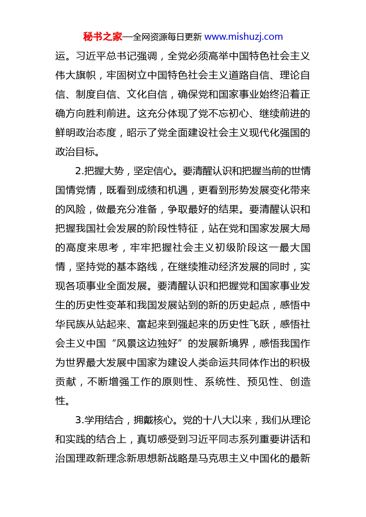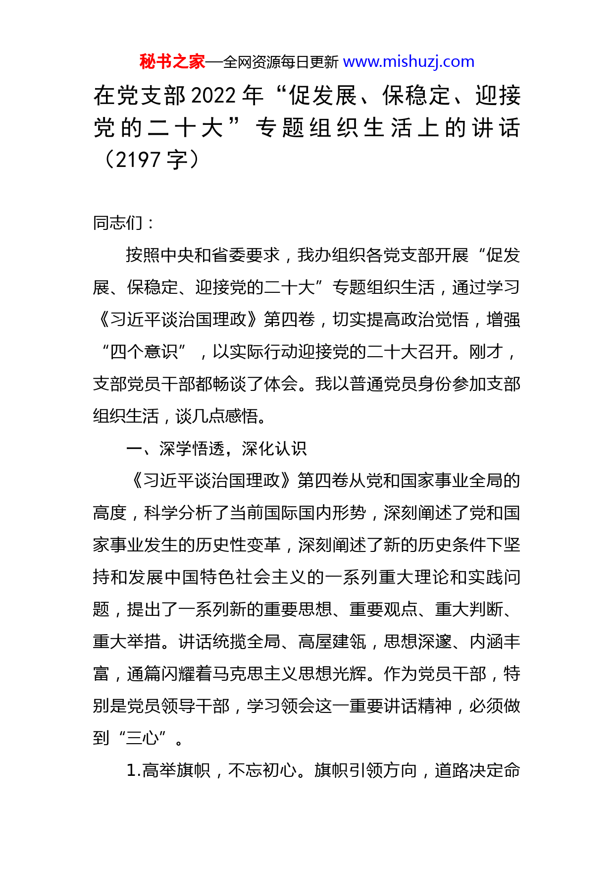 秘书之家—全网资源每日更新www.mishuzj.com在党支部2022年“促发展、保稳定、迎接党的二十大”专题组织生活上的讲话(2197字)同志们:按照中央和省委要求,我办组织各党支部开展“促发展、保稳定、迎接党的二十大”专题组织生活,通过学习《习近平谈治国理政》第四卷,切实提高政治觉悟,增强“四个意识”,以实际行动迎接党的二十大召开。刚才,支部党员干部都畅谈了体会。我以普通党员身份参加支部组织生活,谈几点感悟。一、深学悟透,深化认识《习近平谈治国理政》第四卷从党和国家事业全局的高度,科学分析了当前国际国内形势,深刻阐述了党和国家事业发生的历史性变革,深刻阐述了新的历史条件下坚持和发展中国特色社会主义的一系列重大理论和实践问题,提出了一系列新的重要思想、重要观点、重大判断、重大举措。讲话统揽全局、高屋建瓴,思想深邃、内涵丰富,通篇闪耀着马克思主义思想光辉。作为党员干部,特别是党员领导干部,学习领会这一重要讲话精神,必须做到“三心”。1.高举旗帜,不忘初心。旗帜引领方向,道路决定命秘书之家—全网资源每日更新www.mishuzj.com运。习近平总书记强调,全党必须高举中国特色社会主义伟大旗帜,牢固树立中国特色社会主义道路自信、理论自信、制度自信、文化自信,确保党和国家事业始终沿着正确方向胜利前进。这充分体现了党不忘初心、继续前进的鲜明政治态度,昭示了党全面建设社会主义现代化强国的政治目标。2.把握大势,坚定信心。要清醒认识和把握当前的世情国情党情,既看到成绩和机遇,更看到形势发展变化带来的风险,做最充分准备,争取最好的结果。要清醒认识和把握我国社会发展的阶段性特征,站在党和国家发展大局的高度来思考,牢牢把握社会主义初级阶段这一最大国情,坚持党的基本路线,在继续推动经济发展的同时,实现各项事业全面发展。要清醒认识和把握党和国家事业发生的历史性变革和我国发展站到的新的历史起点,感悟中华民族从站起来、富起来到强起来的历史性飞跃,感悟社会主义中国“风景这边独好”的发展新境界,感悟我国作为世界最大发展中国家为建设人类命运共同体作出的积极贡献,不断增强工作的原则性、系统性、预见性、创造性。3.学用结合,拥戴核心。党的十八大以来,我们从理论和实践的结合上,真切感受到习近平同志系列重要讲话和治国理政新理念新思想新战略是马克思主义中国化的最新秘书之家—全网资源每日更新www.mishuzj.com成果,是在新的历史条件下推进中国特色社会主义的科学理论指导,是实现党长期执政和国家长治久安的行动指南,坚决与以习近平同志为核心的党中央保持高度一致。实践发展永无止境,认识真理永无止境,理论创新永无止境。面向未来,我们要在迅速变化的时代中赢得主动,要在新的伟大斗争中赢得胜利,必须在理论上不断拓展新视野,切实用马克思主义中国化最新成果武装头脑、指导工作、推动实践。二、红色传承,攻坚克难作为党员干部,学习习近平的七年知青岁月,要学在前列、用在前列、走在前列。1.深厚根基。马克思主义经典作家强调权威和服从不是由人的主观愿望确定的,而是社会发展的客观要求。《习近平的七年知青岁月》向我们展示了习近平总书记在青年时期的成长过程,让我们深刻领会深厚的根基。习近平总书记追寻真理、脚踏大地、植根人民的成长历程,激发我们把忠诚核心、拥戴核心、维护核心、紧跟核心融入血脉、植入灵魂,化为坚定的信仰信念和自觉行动。2.信念坚守。《习近平的七年知青岁月》以习近平总书记坚定理想信念、锤炼意志品质、加强自身修养,展示我们要从习近平总书记成长道路的一个个故事中,学习怎么做一名合格共产党员,进而寻找到中国共产党为什么能从秘书之家—全网资源每日更新www.mishuzj.com强大走向强大、从胜利走向胜利的答案。3.植根群众。《习近平的七年知青岁月》,向我们全景式地展现了总书记当年“与群众坐在一条凳子上”“与群众一块过、一块苦、一块干”的经历,是一本总书记“手把手”教我们做群众工作的教材。可以说书中的每一个故事,都是一堂党的群众工作精品课程。学习这篇文章,就是要学习习近平总书记以人民为中心,融入群众、植根群众、造福群众的群众工作方法,把以人民为中心的思想牢记心中、落到实处。三、担当风险,狠抓落实党的二十大是是党和国家政治生活中的一件大事。学习好、宣传好、贯彻好党的二十大精神,是当前和今后一个时期的重大政治任务,全省机构编制系统必须抓紧抓好,全面贯彻。1.加强统筹谋划。班子成员要带头学懂弄透,增强担当贯彻的自觉性。机关党委要做好中心组学习安排。各党支部要切实增强使命感和责任感,紧紧围绕迎接、学习、贯彻党的二十大精神,结合巩固深化党史学习教育成果,提出明确要求。同时,要创新形式,通过专题研讨、心得交流、征文演讲等方式,推动学习贯彻工作深入开展、务实担当。2.加强责任落实。要把学习贯彻党的二十大精神纳入重秘书之家—全网资源每日更新www.mishuzj.com中之重的任务。办领导班子成员要率先垂范。党支部要切实负起主体责任,特别是党支部书记,立足一线,抓规划、抓推动、抓落实,坚持抓业务抓党建“两手抓,两手都要硬”。要层层传导压力,确保