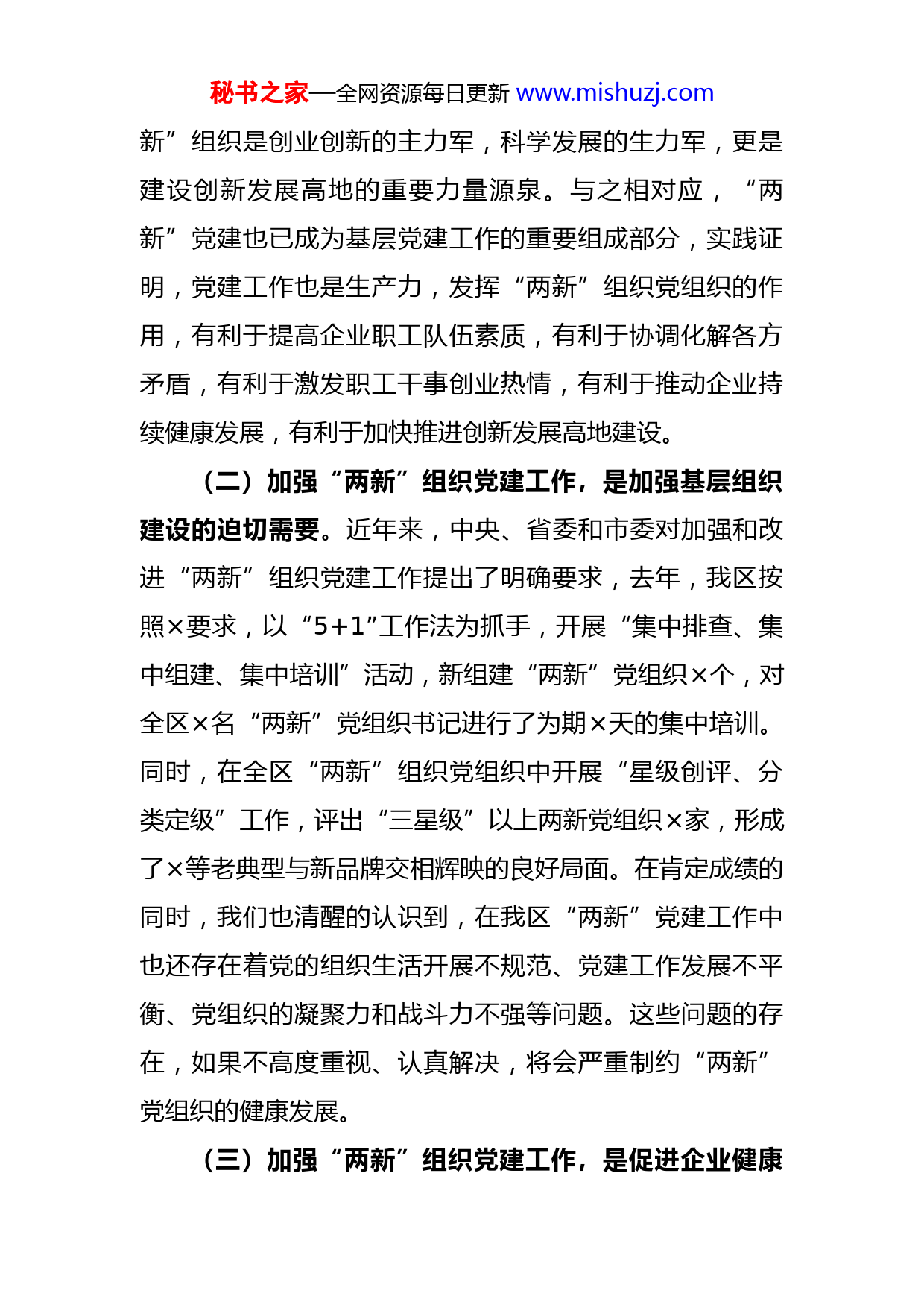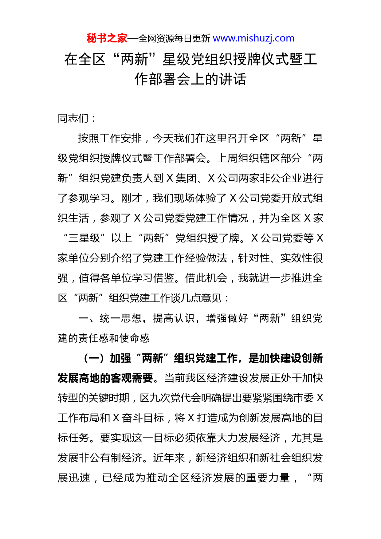 秘书之家—全网资源每日更新www.mishuzj.com在全区“两新”星级党组织授牌仪式暨工作部署会上的讲话同志们:按照工作安排,今天我们在这里召开全区“两新”星级党组织授牌仪式暨工作部署会。上周组织辖区部分“两新”组织党建负责人到X集团、X公司两家非公企业进行了参观学习。刚才,我们现场体验了X公司党委开放式组织生活,参观了X公司党委党建工作情况,并为全区X家“三星级”以上“两新”党组织授了牌。X公司党委等X家单位分别介绍了党建工作经验做法,针对性、实效性很强,值得各单位学习借鉴。借此机会,我就进一步推进全区“两新”组织党建工作谈几点意见:一、统一思想,提高认识,增强做好“两新”组织党建的责任感和使命感(一)加强“两新”组织党建工作,是加快建设创新发展高地的客观需要。当前我区经济建设发展正处于加快转型的关键时期,区九次党代会明确提出要紧紧围绕市委X工作布局和X奋斗目标,将X打造成为创新发展高地的目标任务。要实现这一目标必须依靠大力发展经济,尤其是发展非公有制经济。近年来,新经济组织和新社会组织发展迅速,已经成为推动全区经济发展的重要力量,“两秘书之家—全网资源每日更新www.mishuzj.com新”组织是创业创新的主力军,科学发展的生力军,更是建设创新发展高地的重要力量源泉。与之相对应,“两新”党建也已成为基层党建工作的重要组成部分,实践证明,党建工作也是生产力,发挥“两新”组织党组织的作用,有利于提高企业职工队伍素质,有利于协调化解各方矛盾,有利于激发职工干事创业热情,有利于推动企业持续健康发展,有利于加快推进创新发展高地建设。(二)加强“两新”组织党建工作,是加强基层组织建设的迫切需要。近年来,中央、省委和市委对加强和改进“两新”组织党建工作提出了明确要求,去年,我区按照×要求,以“5+1”工作法为抓手,开展“集中排查、集中组建、集中培训”活动,新组建“两新”党组织×个,对全区×名“两新”党组织书记进行了为期×天的集中培训。同时,在全区“两新”组织党组织中开展“星级创评、分类定级”工作,评出“三星级”以上两新党组织×家,形成了×等老典型与新品牌交相辉映的良好局面。在肯定成绩的同时,我们也清醒的认识到,在我区“两新”党建工作中也还存在着党的组织生活开展不规范、党建工作发展不平衡、党组织的凝聚力和战斗力不强等问题。这些问题的存在,如果不高度重视、认真解决,将会严重制约“两新”党组织的健康发展。(三)加强“两新”组织党建工作,是促进企业健康秘书之家—全网资源每日更新www.mishuzj.com发展的现实需要。“两新”组织的党员,大都是生产、经营和管理的骨干,对职工群众有较强的影响力和带动作用。“两新”组织要在激烈的市场竞争中求得进一步发展壮大,需要党组织的引导、支持和帮助,需要党员职工充分发挥先进性和模范带头作用。党建作为企业发展的“红色引擎”,必须把党建工作作为“两新”组织的自身事业来抓,不断让党的组织和政治优势转化为企业发展优势,党的领导和企业发展才能相得益彰、相互促进,党建兴则事业兴,党建强则事业强。二、积极探索,勇于创新,着力破解“两新”组织党建工作重点难点(一)在扩大党的组织和党的工作“两个覆盖”上下功夫。加强“两新”组织党建工作,首要任务就是扩大党的组织覆盖和工作覆盖。要继续发展壮大党员队伍,切实提升企业职工中党员的比例,加大在生产一线职工、专业技术骨干和经营管理人员中发展党员,把党员培养成业务骨干,把业务骨干发展成党员。积极探索流动党员管理办法,摸排企业中的“口袋党员”和“隐形党员”,引导和督促他们主动亮明身份,参加党的活动。要创新党组织设置方式,凡是有3名以上正式党员、条件成熟的企业,都要单独建立党组织;对不具备单独组建条件的小型、微型企业,可采取区域联建、行业统建、楼宇共建等灵活多样秘书之家—全网资源每日更新www.mishuzj.com的方式建立党组织;对尚不具备建立党组织条件的“两新”组织,要通过选派党建工作指导员、建立工会和共青团组织,把群团组织负责人发展成党员等形式来实现工作覆盖,做到没有党员的独立法人企业都有党建指导员或联络员。(二)在发挥党组织和党员“两个作用”上下功夫。“两新”党组织只有充分发挥好在企业职工群众中的政治核心作用和在企业发展中的政治引领作用,才能得到广大党员的认同和响应,才能取得出资人的理解和支持,才能受到职工群众的拥护和欢迎。“两新”党组织要按照“围绕发展抓党建、抓好党建促发展”的要求,明确职责定位,紧紧围绕“两新”组织主营业务,积极提出意见建议,帮助支持出资人和经营者把企业做大做强;要坚决贯彻党的路线方针政策,引导和监督企业遵守法律法规,诚信经营,自觉履行社会责任;要按照“双强六好”标准,扎实开展服务型党组织创建活动,严格落实“三会一课”等党内组织生活制度,着力突出抓班子、带队伍、强阵地、促发展;要坚持党群共建,带领工会、共青团等群众组织,广泛动员职工群众开展劳动竞赛、技能比武、技术创新活动,提高企业整体实力和市场竞争力;要不断加强和改进企业思想政治工作,注重对职工的人文关怀和心理疏导,坚持用社会主义核心价值体