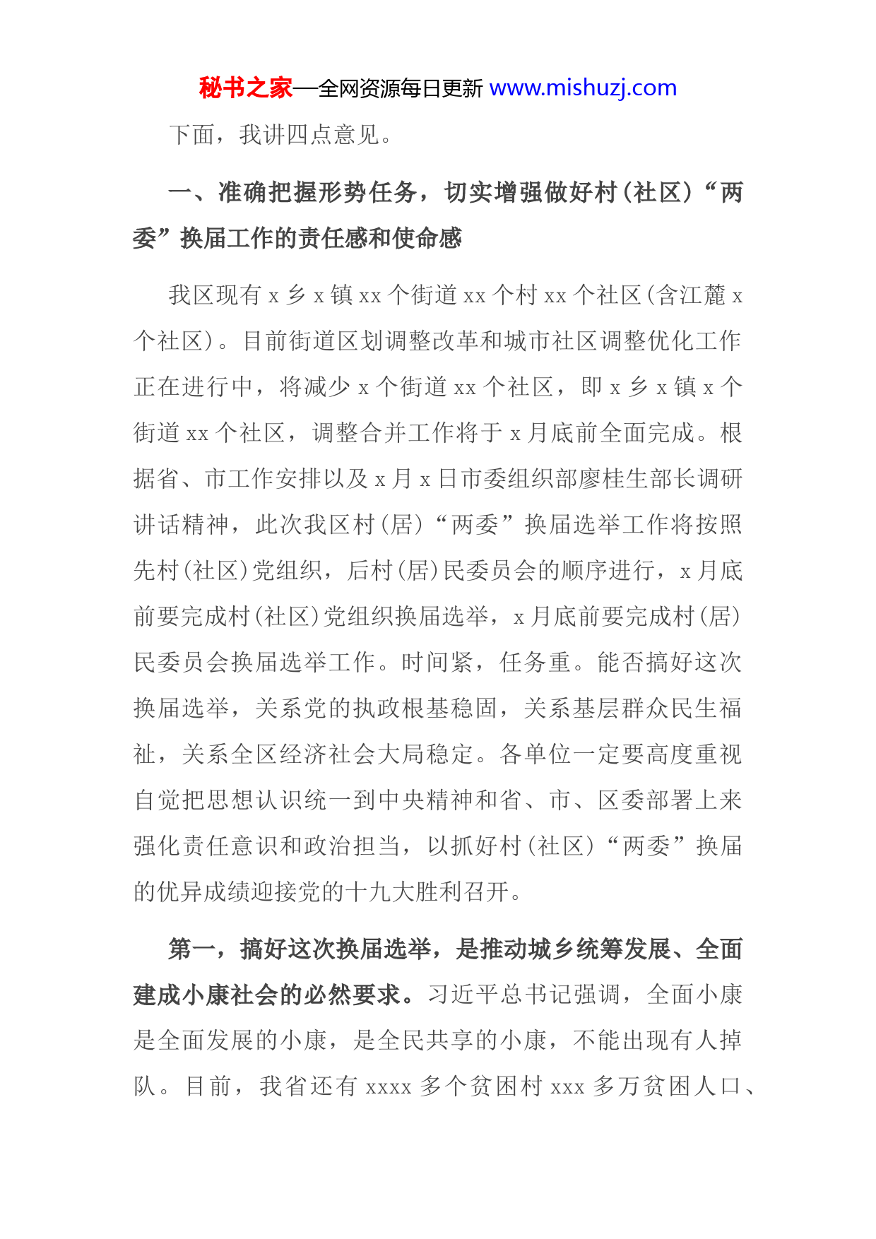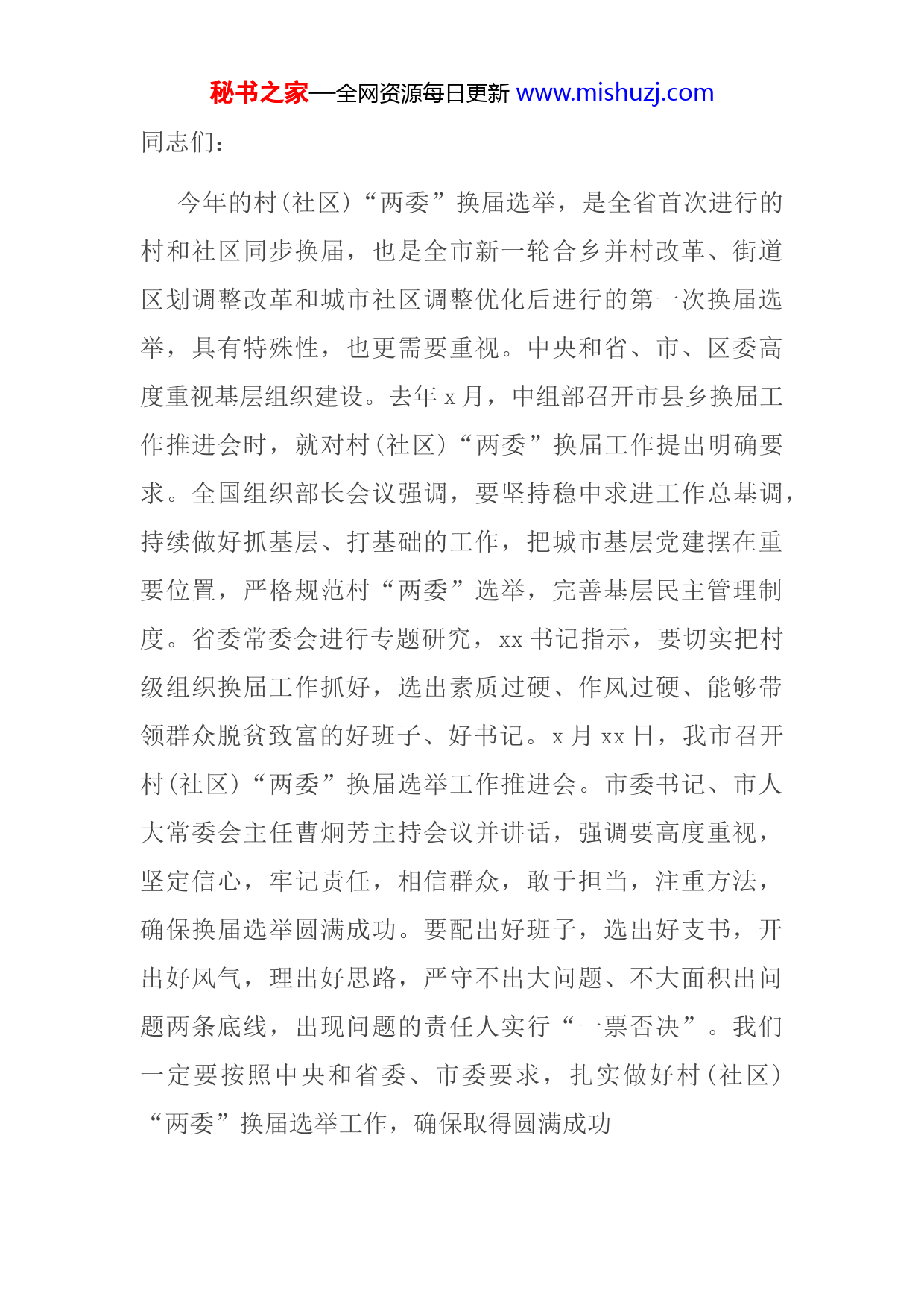 秘书之家—全网资源每日更新www.mishuzj.com同志们:今年的村(社区)“两委”换届选举,是全省首次进行的村和社区同步换届,也是全市新一轮合乡并村改革、街道区划调整改革和城市社区调整优化后进行的第一次换届选举,具有特殊性,也更需要重视。中央和省、市、区委高度重视基层组织建设。去年x月,中组部召开市县乡换届工作推进会时,就对村(社区)“两委”换届工作提出明确要求。全国组织部长会议强调,要坚持稳中求进工作总基调,持续做好抓基层、打基础的工作,把城市基层党建摆在重要位置,严格规范村“两委”选举,完善基层民主管理制度。省委常委会进行专题研究,xx书记指示,要切实把村级组织换届工作抓好,选出素质过硬、作风过硬、能够带领群众脱贫致富的好班子、好书记。x月xx日,我市召开村(社区)“两委”换届选举工作推进会。市委书记、市人大常委会主任曹炯芳主持会议并讲话,强调要高度重视,坚定信心,牢记责任,相信群众,敢于担当,注重方法,确保换届选举圆满成功。要配出好班子,选出好支书,开出好风气,理出好思路,严守不出大问题、不大面积出问题两条底线,出现问题的责任人实行“一票否决”。我们一定要按照中央和省委、市委要求,扎实做好村(社区)“两委”换届选举工作,确保取得圆满成功秘书之家—全网资源每日更新www.mishuzj.com下面,我讲四点意见。一、准确把握形势任务,切实增强做好村(社区)“两委”换届工作的责任感和使命感我区现有x乡x镇xx个街道xx个村xx个社区(含江麓x个社区)。目前街道区划调整改革和城市社区调整优化工作正在进行中,将减少x个街道xx个社区,即x乡x镇x个街道xx个社区,调整合并工作将于x月底前全面完成。根据省、市工作安排以及x月x日市委组织部廖桂生部长调研讲话精神,此次我区村(居)“两委”换届选举工作将按照先村(社区)党组织,后村(居)民委员会的顺序进行,x月底前要完成村(社区)党组织换届选举,x月底前要完成村(居)民委员会换届选举工作。时间紧,任务重。能否搞好这次换届选举,关系党的执政根基稳固,关系基层群众民生福祉,关系全区经济社会大局稳定。各单位一定要高度重视自觉把思想认识统一到中央精神和省、市、区委部署上来强化责任意识和政治担当,以抓好村(社区)“两委”换届的优异成绩迎接党的十九大胜利召开。第一,搞好这次换届选举,是推动城乡统筹发展、全面建成小康社会的必然要求。习近平总书记强调,全面小康是全面发展的小康,是全民共享的小康,不能出现有人掉队。目前,我省还有xxxx多个贫困村xxx多万贫困人口、秘书之家—全网资源每日更新www.mishuzj.comxxx多万低保人口,其中不少是贫中之贫、困中之困。从现在起到2020年,只有x年多时间,这与换届后的村(社区)“两委”任期高度重合,新的一届村(社区)“两委”担负着实现全面小康目标“排头兵”的重任。无论是推进城市和谐文明社区建设、为居民提供多样化的优质服务,还是加快美丽乡村建设、发展现代农业、促进农民增收致富,都需要基层党组织发挥好领导核心作用和战斗堡垒作用,离不开群众信任的好班子、好书记。我们一定要站在战略和全局的高度,切实抓好村(社区)“两委”换届,真正把基层组织建设成为坚强领导核心,确保基层组织带头人个个过硬,为打赢脱贫攻坚战、全面建成小康社会提供组织保证。第二,搞好这次换届选举,是深化改革、提升基层治理水平的关键之举。习近平总书记指出,推进改革发展稳定大量任务在基层,推进国家治理体系和治理能力现代化的基础性工作也在基层;社会治理的重心必须落到城乡社区社区服务和管理能力强了,社会治理的基础就实了。当前随着新型城镇化加快推进,大量人口进入城市就业、定居和生活,群众的利益诉求日益多元化,城市基层改革治理的任务很重,迫切需要社区基层组织发挥好协调各方利益促进社区和谐稳定的“托底”作用。在农村,推进农业经秘书之家—全网资源每日更新www.mishuzj.com营体系、农村集体产权制度等方面改革,依法打击非法宗族、宗教和黑恶势力,维护农村社会和谐稳定,以及妥善处理好并村改革的后续问题,都迫切需要农村基层组织解放思想、开拓创新、敢于担当、化解矛盾、团结群众。只有切实抓好村(社区)“两委”换届选举,选出勇于负责、善于治理、能打硬仗、群众拥护的基层组织领导班子和“当家人”,深化城乡改革的各项任务才能落地见效,基层社会治理才能朝着法治化、现代化的目标不断迈进。第三,搞好这次换届选举,是推动全面从严治党向基层延伸、夯实党的执政根基的重要实践。基层组织是党执政大厦的地基,基层干部是这个地基中的钢筋,只有把基层党组织这个地基打牢了,把地基中的钢筋配强了,我们党才能从容应对各种风险挑战,永远立于不败之地。这些年各地树立大抓基层的鲜明导向,基层组织建设进一步加强基层面貌有了很大改观,但基层基础总体薄弱的状况仍然没有得到根本改变,一些基层党组织软弱涣散,基层民主管理制度不够健全,有的地方村级事务不公开、“雁过拔毛”式腐败时有发生,基层党员干部队伍年龄老化、能力弱化的问题还比较突出,等等。这些问题的存在,严重影响党和政府的形象,影响党的执政根基的巩固。搞好村(社区)“两委”换届,既为我们加强基层组织班子建设、解