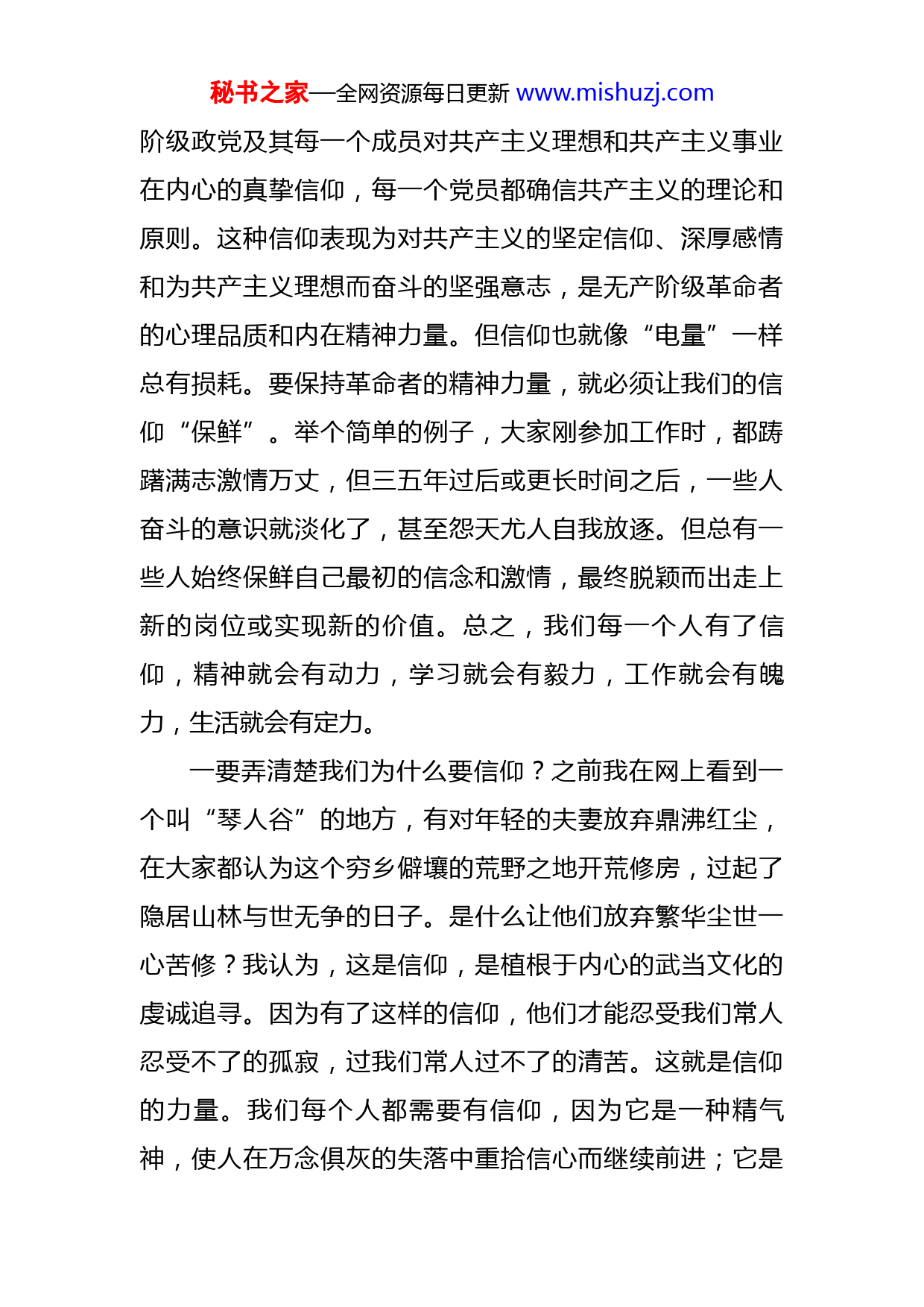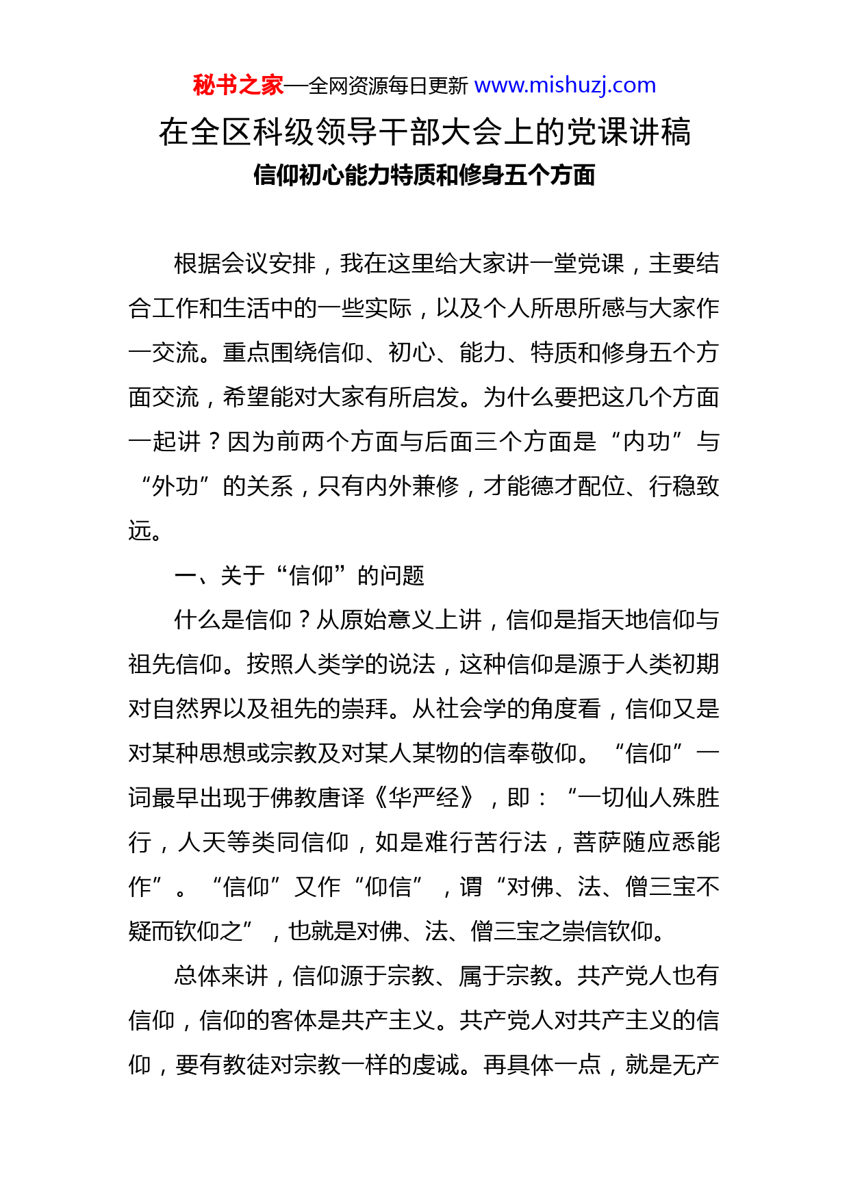 秘书之家—全网资源每日更新www.mishuzj.com在全区科级领导干部大会上的党课讲稿信仰初心能力特质和修身五个方面根据会议安排,我在这里给大家讲一堂党课,主要结合工作和生活中的一些实际,以及个人所思所感与大家作一交流。重点围绕信仰、初心、能力、特质和修身五个方面交流,希望能对大家有所启发。为什么要把这几个方面一起讲?因为前两个方面与后面三个方面是“内功”与“外功”的关系,只有内外兼修,才能德才配位、行稳致远。一、关于“信仰”的问题什么是信仰?从原始意义上讲,信仰是指天地信仰与祖先信仰。按照人类学的说法,这种信仰是源于人类初期对自然界以及祖先的崇拜。从社会学的角度看,信仰又是对某种思想或宗教及对某人某物的信奉敬仰。“信仰”一词最早出现于佛教唐译《华严经》,即:“一切仙人殊胜行,人天等类同信仰,如是难行苦行法,菩萨随应悉能作”。“信仰”又作“仰信”,谓“对佛、法、僧三宝不疑而钦仰之”,也就是对佛、法、僧三宝之崇信钦仰。总体来讲,信仰源于宗教、属于宗教。共产党人也有信仰,信仰的客体是共产主义。共产党人对共产主义的信仰,要有教徒对宗教一样的虔诚。再具体一点,就是无产秘书之家—全网资源每日更新www.mishuzj.com阶级政党及其每一个成员对共产主义理想和共产主义事业在内心的真挚信仰,每一个党员都确信共产主义的理论和原则。这种信仰表现为对共产主义的坚定信仰、深厚感情和为共产主义理想而奋斗的坚强意志,是无产阶级革命者的心理品质和内在精神力量。但信仰也就像“电量”一样总有损耗。要保持革命者的精神力量,就必须让我们的信仰“保鲜”。举个简单的例子,大家刚参加工作时,都踌躇满志激情万丈,但三五年过后或更长时间之后,一些人奋斗的意识就淡化了,甚至怨天尤人自我放逐。但总有一些人始终保鲜自己最初的信念和激情,最终脱颖而出走上新的岗位或实现新的价值。总之,我们每一个人有了信仰,精神就会有动力,学习就会有毅力,工作就会有魄力,生活就会有定力。一要弄清楚我们为什么要信仰?之前我在网上看到一个叫“琴人谷”的地方,有对年轻的夫妻放弃鼎沸红尘,在大家都认为这个穷乡僻壤的荒野之地开荒修房,过起了隐居山林与世无争的日子。是什么让他们放弃繁华尘世一心苦修?我认为,这是信仰,是植根于内心的武当文化的虔诚追寻。因为有了这样的信仰,他们才能忍受我们常人忍受不了的孤寂,过我们常人过不了的清苦。这就是信仰的力量。我们每个人都需要有信仰,因为它是一种精气神,使人在万念俱灰的失落中重拾信心而继续前进;它是秘书之家—全网资源每日更新www.mishuzj.com一种道德底线,使人在眼花缭乱的物欲中谨守纯真质朴而岿然不动;它更是一种追求,使人在百般苦千般难中至死不渝的追寻梦想的绽放。共产党人更要有信仰,没有对主义的信仰,那就不是真正的共产党人。二要弄清楚我们要信仰什么?我们在座的都是共产党员,马克思主义、共产主义、中国特色社会主义就是我们的信仰。具体到我们最普通最基层的党员干部来说,这个信仰最起码的表现是“对得起工作,对得起岗位”。首先要对得起工作。人们对工作有四种境界。境界之一,是把工作当谋生手段。这意味着,不工作就不能养家糊口没有饭吃。这是最普遍也是最乏味的一种,在这种境界下普遍都活得非常累并且连累着全家一起跟着累!境界之二,是把工作当副业。这意味着,工作只是一种生存的退路,能应付则应付、能推拖则推拖,但长此以往极容易砸掉“饭碗”。境界之三,是把工作当职业。这是高于前两种的工作境界,意味着能够为了完成任务而不断努力工作,但久了极容易“混一天是一天,当天和尚撞天钟”。境界之四,是把工作当事业。这是最高境界,意味着人会投身其中全力以赴,不断给自己建立新的奋斗目标,并能够在不断的成功中找到乐趣。大家扪心自问包括我在内,是属于哪种境界?有本书叫《把工作当成事业来做》,这本书认为每个人只有把工作当作事业干,才会对工作怀有敬仰之秘书之家—全网资源每日更新www.mishuzj.com心珍爱之情,才会沉下心来脚踏实地地做事,才会克服浮躁的情绪克服好高骛远急于求成的心态,才能有遇到困难不畏惧不达目的不罢休的豪气。我们都是凡夫俗子避免不了俗套,但必须知道——我们是共产党员,是共产党的干部,这又不同于普通群众。所以无论我们之前处于哪种境界,从现在开始都要有明确的目标正确对待工作,力求把每一件具体的事哪怕是琐碎的小事都做好做扎实,平心静气地享受工作过程中的喜怒哀乐。其二要对得起岗位。不论我们现在处于什么位置,但必须起码明确工作至少是我们的“饭碗”,尽管不足称羡但却衣食无忧。吃这碗“饭”,我们都很不容易,一路走过来更不容易。所以,要常想“今我何功德,曾不事农桑。吏禄三百石,岁晏有余粮。念此私自愧,尽日不能忘。”这个“饭碗”是人民给我们的,是组织给我们的,我们要感激我们的岗位、感激我们的组织。现在有个现象,有相当一部分同志把工作当作负担累赘,当作无可奈何不得不干的事,在待遇上总要争别人有的我就该有,但从来不想别人干了什么自己干了什么。大家试想一下,假如我们有天失业了,走向社会我们还能靠什么养家糊口?都说吃公家饭
