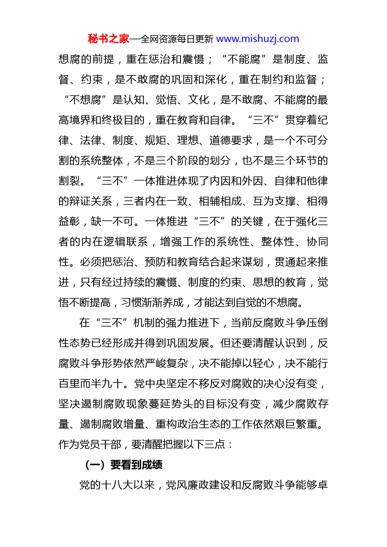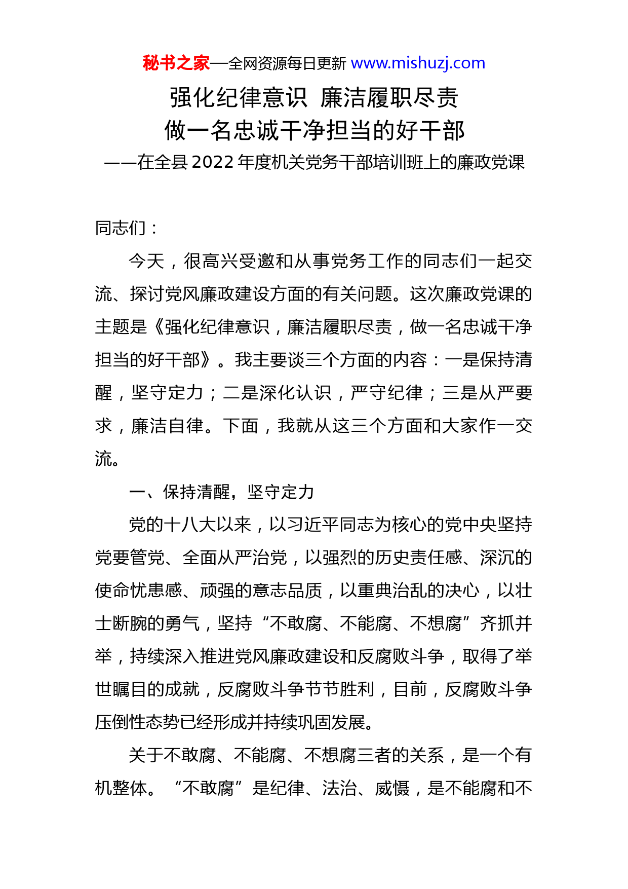秘书之家—全网资源每日更新www.mishuzj.com强化纪律意识廉洁履职尽责做一名忠诚干净担当的好干部——在全县2022年度机关党务干部培训班上的廉政党课同志们:今天,很高兴受邀和从事党务工作的同志们一起交流、探讨党风廉政建设方面的有关问题。这次廉政党课的主题是《强化纪律意识,廉洁履职尽责,做一名忠诚干净担当的好干部》。我主要谈三个方面的内容:一是保持清醒,坚守定力;二是深化认识,严守纪律;三是从严要求,廉洁自律。下面,我就从这三个方面和大家作一交流。一、保持清醒,坚守定力党的十八大以来,以习近平同志为核心的党中央坚持党要管党、全面从严治党,以强烈的历史责任感、深沉的使命忧患感、顽强的意志品质,以重典治乱的决心,以壮士断腕的勇气,坚持“不敢腐、不能腐、不想腐”齐抓并举,持续深入推进党风廉政建设和反腐败斗争,取得了举世瞩目的成就,反腐败斗争节节胜利,目前,反腐败斗争压倒性态势已经形成并持续巩固发展。关于不敢腐、不能腐、不想腐三者的关系,是一个有机整体。“不敢腐”是纪律、法治、威慑,是不能腐和不秘书之家—全网资源每日更新www.mishuzj.com想腐的前提,重在惩治和震慑;“不能腐”是制度、监督、约束,是不敢腐的巩固和深化,重在制约和监督;“不想腐”是认知、觉悟、文化,是不敢腐、不能腐的最高境界和终极目的,重在教育和自律。“三不”贯穿着纪律、法律、制度、规矩、理想、道德要求,是一个不可分割的系统整体,不是三个阶段的划分,也不是三个环节的割裂。“三不”一体推进体现了内因和外因、自律和他律的辩证关系,三者内在一致、相辅相成、互为支撑、相得益彰,缺一不可。一体推进“三不”的关键,在于强化三者的内在逻辑联系,增强工作的系统性、整体性、协同性。必须把惩治、预防和教育结合起来谋划,贯通起来推进,只有经过持续的震慑、制度的约束、思想的教育,觉悟不断提高,习惯渐渐养成,才能达到自觉的不想腐。在“三不”机制的强力推进下,当前反腐败斗争压倒性态势已经形成并得到巩固发展。但还要清醒认识到,反腐败斗争形势依然严峻复杂,决不能掉以轻心,决不能行百里而半九十。党中央坚定不移反对腐败的决心没有变,坚决遏制腐败现象蔓延势头的目标没有变,减少腐败存量、遏制腐败增量、重构政治生态的工作依然艰巨繁重。作为党员干部,要清醒把握以下三点:(一)要看到成绩党的十八大以来,党风廉政建设和反腐败斗争能够卓秘书之家—全网资源每日更新www.mishuzj.com有成效地开展,这是与党中央在反腐败方面具有坚强的意志和坚定决心是分不开的,这是根本也是前提。以习近平同志为核心的党中央,抓党风廉政建设和反腐败斗争旗帜鲜明、立场坚定,意志品质顽强,领导坚强有力,围绕推进反腐败斗争作出了一系列重要指示和讲话,并亲自抓落实,推动了反腐败斗争深入有效开展,取得了举世瞩目的成就,极大地振奋了党心民心。一是坚定不移“打虎”“拍蝇”,形成了强力震慑。党中央坚持无禁区、全覆盖、零容忍,坚持重遏制、强高压、长震慑,坚持受贿行贿一起查,坚定不移、精准有序惩治腐败。党的十九大以来,中央纪委立案审查调查省部级干部人。在高压震慑下,全国共有万余名党员干部主动交代违纪违法问题,包括多名省部级干部在内的余名党员干部主动投案。数字背后,彰显出的是“打虎拍蝇”不手软、惩治腐败不停歇的决心。二是驰而不息整治“四风”,净化了党内政治生态。以落实中央八项规定精神为突破口,从具体问题抓起,以“小切口”推动“深治理”,精准发力、久久为功,解决了多年来看似不可能解决的顽症,实现了党内正气上升、社会风气上扬,党内政治生态不断好转。据统计,仅2021年,全国共查处违反中央八项规定精神问题数万余个、处理万余人、给予党纪政务处分人数万余人,中央八项规秘书之家—全网资源每日更新www.mishuzj.com定精神在持续狠抓中得到有效落实。三是实践运用监督执纪“四种形态”,纯洁了党员干部队伍。各级纪委把握好“树木”和“森林”的关系,贯通运用监督执纪“四种形态”,既充分运用好第一种形态,又综合运用好第二、第三种形态,同时坚决不放松第四种形态,保持和强化了惩治腐败高压态势,纯洁了党员队伍,保持了党的先进性和纯洁性,进一步增强了党的创造力、凝聚力和战斗力。(二)要正视问题在肯定成绩的同时,也要冷静清醒地看到,党风廉政建设和反腐败斗争还存在一些不容忽视的问题。在履行管党治党责任上,有的党组织和党员领导干部对全面从严治党的紧迫性认识不深,抓党风廉政建设的自觉性不高,主体责任还没有扛在肩上、抓在手中、落到实处。在严守政治纪律和政治规矩方面,有的置若罔闻,搞拉帮结派、团团伙伙,一门心思钻营权力;有的搞非组织活动、小山头、拉小圈子,对党中央决策部署阳奉阴违。在腐败问题上,有的仍心存侥幸,搞迂回战术,卖官帽、批土地、抢项目、收红包,变着花样收钱敛财;有的欺骗组织、对抗组织,藏匿赃款赃物,与相关人员订立攻守同盟,企图逃避党纪国法惩处。在“四风”问题上,面上有所收敛,但并没有绝迹;十八大之后查处的领导干部,很多在享乐主秘书之家—全网资源每日更新www.mishuzj.com义和奢靡之风上没有收手;有的改头换面、花样翻