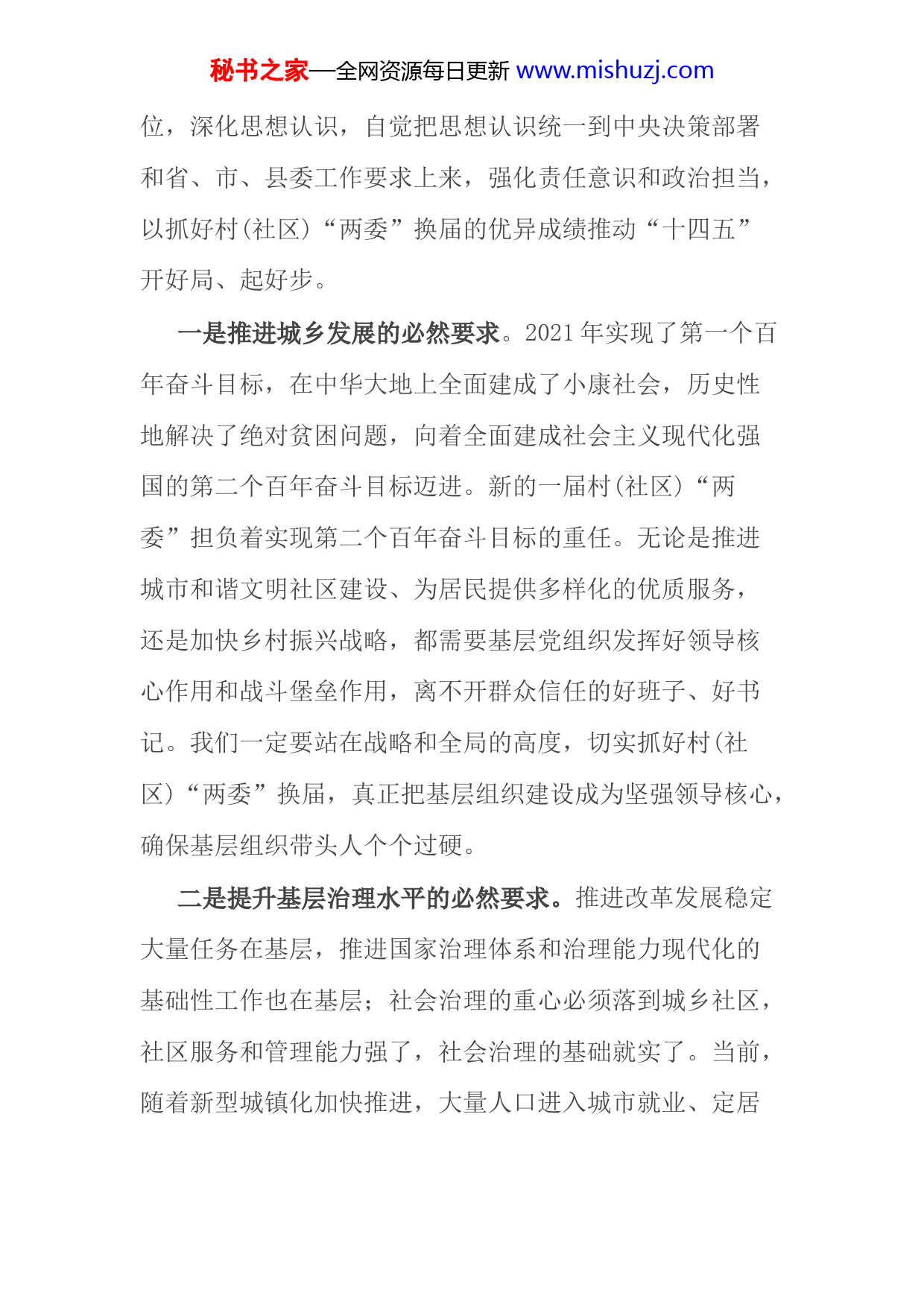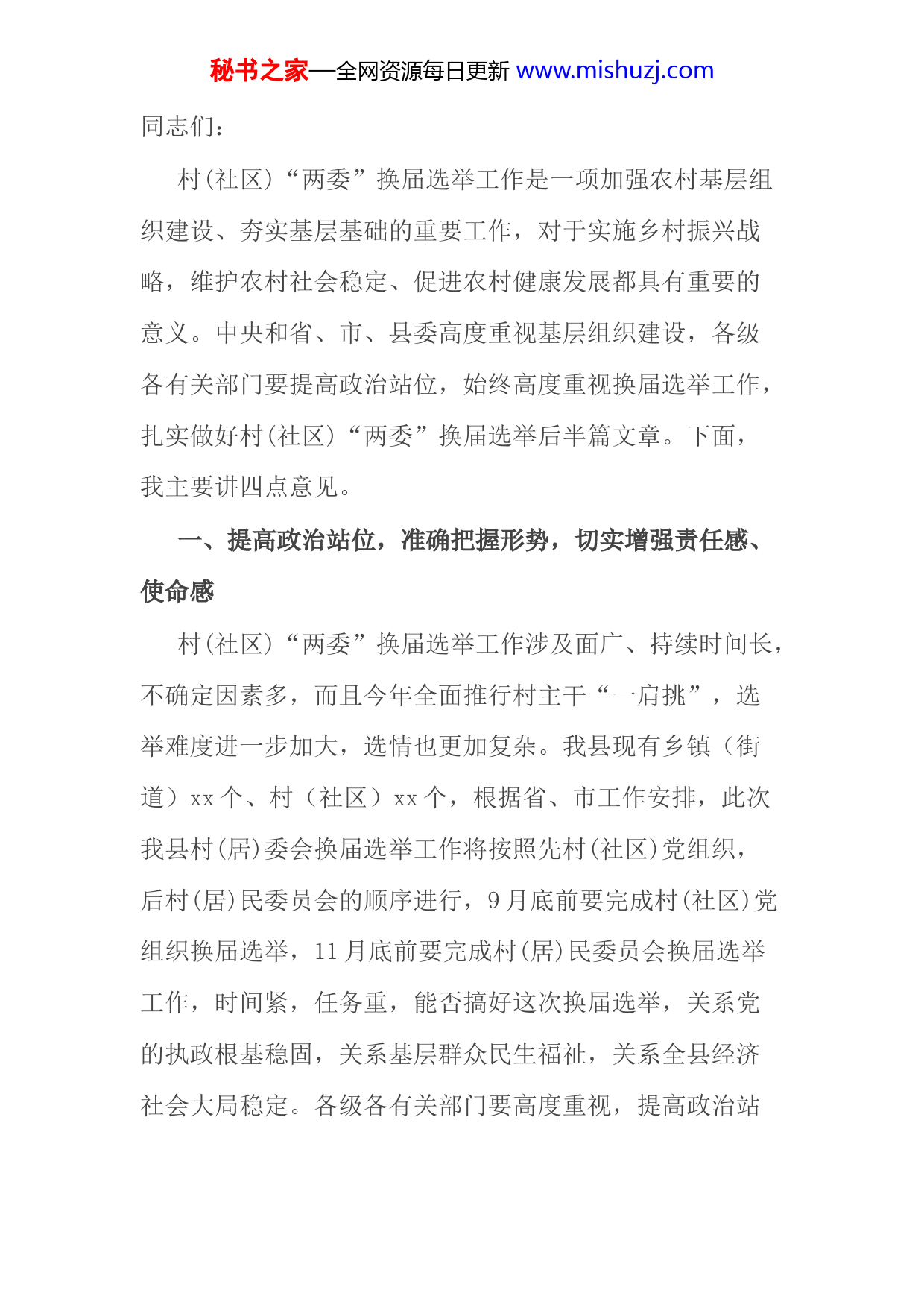 秘书之家—全网资源每日更新www.mishuzj.com同志们:村(社区)“两委”换届选举工作是一项加强农村基层组织建设、夯实基层基础的重要工作,对于实施乡村振兴战略,维护农村社会稳定、促进农村健康发展都具有重要的意义。中央和省、市、县委高度重视基层组织建设,各级各有关部门要提高政治站位,始终高度重视换届选举工作,扎实做好村(社区)“两委”换届选举后半篇文章。下面,我主要讲四点意见。一、提高政治站位,准确把握形势,切实增强责任感、使命感村(社区)“两委”换届选举工作涉及面广、持续时间长,不确定因素多,而且今年全面推行村主干“一肩挑”,选举难度进一步加大,选情也更加复杂。我县现有乡镇(街道)xx个、村(社区)xx个,根据省、市工作安排,此次我县村(居)委会换届选举工作将按照先村(社区)党组织,后村(居)民委员会的顺序进行,9月底前要完成村(社区)党组织换届选举,11月底前要完成村(居)民委员会换届选举工作,时间紧,任务重,能否搞好这次换届选举,关系党的执政根基稳固,关系基层群众民生福祉,关系全县经济社会大局稳定。各级各有关部门要高度重视,提高政治站秘书之家—全网资源每日更新www.mishuzj.com位,深化思想认识,自觉把思想认识统一到中央决策部署和省、市、县委工作要求上来,强化责任意识和政治担当,以抓好村(社区)“两委”换届的优异成绩推动“十四五”开好局、起好步。一是推进城乡发展的必然要求。2021年实现了第一个百年奋斗目标,在中华大地上全面建成了小康社会,历史性地解决了绝对贫困问题,向着全面建成社会主义现代化强国的第二个百年奋斗目标迈进。新的一届村(社区)“两委”担负着实现第二个百年奋斗目标的重任。无论是推进城市和谐文明社区建设、为居民提供多样化的优质服务,还是加快乡村振兴战略,都需要基层党组织发挥好领导核心作用和战斗堡垒作用,离不开群众信任的好班子、好书记。我们一定要站在战略和全局的高度,切实抓好村(社区)“两委”换届,真正把基层组织建设成为坚强领导核心,确保基层组织带头人个个过硬。二是提升基层治理水平的必然要求。推进改革发展稳定大量任务在基层,推进国家治理体系和治理能力现代化的基础性工作也在基层;社会治理的重心必须落到城乡社区,社区服务和管理能力强了,社会治理的基础就实了。当前,随着新型城镇化加快推进,大量人口进入城市就业、定居秘书之家—全网资源每日更新www.mishuzj.com和生活,群众的利益诉求日益多元化,城市基层改革治理的任务很重,迫切需要社区基层组织发挥好协调各方利益、促进社区和谐稳定的“托底”作用。在农村,推进农业经营体系、农村集体产权制度等方面改革,都迫切需要农村基层组织解放思想、开拓创新、敢于担当、化解矛盾、团结群众。只有切实抓好村(社区)“两委”换届选举,选出勇于负责、善于治理、能打硬仗、群众拥护的基层组织领导班子和“当家人”,深化城乡改革的各项任务才能落地见效,基层社会治理才能朝着法治化、现代化的目标不断迈进。三是推动全面从严治党的必然要求。这些年,各地树立大抓基层的鲜明导向,基层组织建设进一步加强,基层面貌有了很大改观,但基层基础总体薄弱的状况仍然没有得到根本改变,一些基层党组织软弱涣散,基层民主管理制度不够健全,有的地方基层党员干部队伍年龄老化、能力弱化的问题还比较突出等等。这些问题的存在,严重影响党和政府的形象,影响党的执政根基的巩固。搞好村(居)委会换届,既为我们加强基层组织班子建设、解决基层党建突出问题提供了有利契机,又为推动全面从严治党各项措施落地生根见效提供了有力抓手。我们要认真贯彻全面秘书之家—全网资源每日更新www.mishuzj.com从严治党的要求,扎实抓好换届,确保换届过程严守党章党规党纪、有序推进、风清气正,确保选举结果实现组织意图、体现群众意愿,充分彰显基层组织的凝聚力战斗力,不断厚植党的执政根基。二、提高思想认识,把握工作主动权,切实把党的领导贯穿始终党政军民学,东南西北中,党是领导一切的。在这次村(社区)“两委”换届中,要理直气壮、旗帜鲜明地把党的领导贯穿全过程,统筹做好会前准备、人事安排、会议选举等各项工作,确保党组织在换届工作中始终处于主导地位、发挥主导作用,确保村(社区)“两委”换届选举实现提出好思路、选出好干部、配出好班子、换出好风气的“四好”目标。一要树立正确导向。选准人选好人,是换届选举的核心任务。选什么样的人,不选什么样的人,关系人心向背、影响社会风气。抓好换届选举,关键要树立鲜明的用人导向,着力优化班子结构,着力选优配强村(社区)党组织带头人。要坚持选人标准,把那些政治素质好、带富能力强、有奉献精神、公道正派、廉洁自律、群众公认的优秀人才选进“两委”班子,特别要把党性强、能力强、改革意识秘书之家—全网资源每日更新www.mishuzj.com强、服务意识强的党员选为村(社区)党组织书记。这次村(社区)“两委”换届,省委、省政府提出了不宜进入村(居)委会班子的“xx种情形”,我县又进一步进行了细化,各乡镇(街道)可以结合实际更进一步明确,对“两委”候选人提出具体要求,让广大党员群众明白该选什么样的人、不该选什么样的人。要扩大选人视野,注重