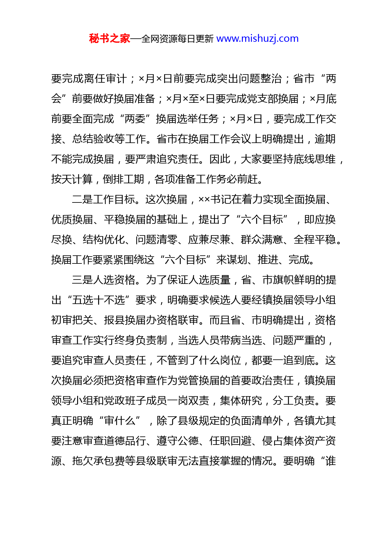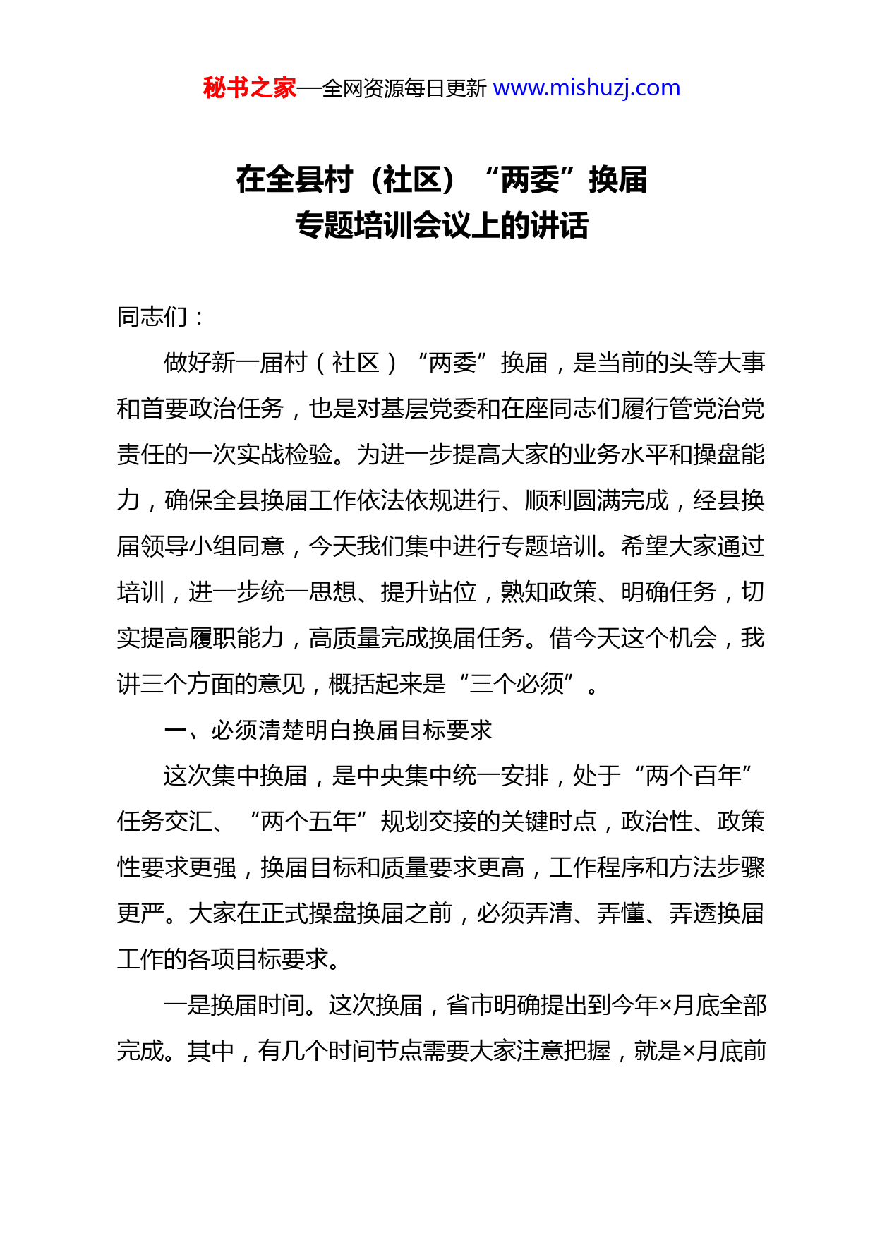 秘书之家—全网资源每日更新www.mishuzj.com在全县村(社区)“两委”换届专题培训会议上的讲话同志们:做好新一届村(社区)“两委”换届,是当前的头等大事和首要政治任务,也是对基层党委和在座同志们履行管党治党责任的一次实战检验。为进一步提高大家的业务水平和操盘能力,确保全县换届工作依法依规进行、顺利圆满完成,经县换届领导小组同意,今天我们集中进行专题培训。希望大家通过培训,进一步统一思想、提升站位,熟知政策、明确任务,切实提高履职能力,高质量完成换届任务。借今天这个机会,我讲三个方面的意见,概括起来是“三个必须”。一、必须清楚明白换届目标要求这次集中换届,是中央集中统一安排,处于“两个百年”任务交汇、“两个五年”规划交接的关键时点,政治性、政策性要求更强,换届目标和质量要求更高,工作程序和方法步骤更严。大家在正式操盘换届之前,必须弄清、弄懂、弄透换届工作的各项目标要求。一是换届时间。这次换届,省市明确提出到今年×月底全部完成。其中,有几个时间节点需要大家注意把握,就是×月底前秘书之家—全网资源每日更新www.mishuzj.com要完成离任审计;×月×日前要完成突出问题整治;省市“两会”前要做好换届准备;×月×至×日要完成党支部换届;×月底前要全面完成“两委”换届选举任务;×月×日,要完成工作交接、总结验收等工作。省市在换届工作会议上明确提出,逾期不能完成换届,要严肃追究责任。因此,大家要坚持底线思维,按天计算,倒排工期,各项准备工作务必前赶。二是工作目标。这次换届,××书记在着力实现全面换届、优质换届、平稳换届的基础上,提出了“六个目标”,即应换尽换、结构优化、问题清零、应兼尽兼、群众满意、全程平稳。换届工作要紧紧围绕这“六个目标”来谋划、推进、完成。三是人选资格。为了保证人选质量,省、市旗帜鲜明的提出“五选十不选”要求,明确要求候选人要经镇换届领导小组初审把关、报县换届办资格联审。而且省、市明确提出,资格审查工作实行终身负责制,当选人员带病当选、问题严重的,要追究审查人员责任,不管到了什么岗位,都要一追到底。这次换届必须把资格审查作为党管换届的首要政治责任,镇换届领导小组和党政班子成员一岗双责,集体研究,分工负责。要真正明确“审什么”,除了县级规定的负面清单外,各镇尤其要注意审查道德品行、遵守公德、任职回避、侵占集体资产资源、拖欠承包费等县级联审无法直接掌握的情况。要明确“谁秘书之家—全网资源每日更新www.mishuzj.com来审”,参照县换届办做法,成立资格审查小组,建立统一调度、各负其责、共同会商、签字背书的审查机制。四是结构质量。这次换届,省市对换届质量有着较高要求,具体总结有以下四个方面的规定。第一要实现交叉任职。交叉任职是精干村“两委”队伍、提高工作效率、提升待遇水平的有效手段。为了鼓励交叉任职,这次换届,中央、省、市明确要求按照精干高效、就低不就高的原则合理设置职数。具体要求是××××。这次换届,我们必须严格落实省、市、县委要求,100%实现省市提出的目标要求。第二年龄要降低。年龄要求是本次换届的重点和难点。这次换届要求支部书记年龄原则上不超过×岁,其他“两委”干部参照执行。社区原班子成员超过退休年龄的不再提名,原班子成员提名支部书记的年龄不超×岁,新任职的年龄不超×岁。这次换届,每个村(社区)班子中,至少有1名35岁以下干部,每个镇(街道)至少新选任1名35岁以下的支部书记。第三学历要提升。这次换届,明确要求支部书记一般应具有高中以上学历,其中大专以上学历的要达到×以上。每个镇(街道)至少新选任×名大专以上学历的党支部书记,新提名的社区书记要具有本科以上学历。第四来源要拓宽。换届后,村党组织书记中致富能手、外出务工经商返乡人员、本乡本土大学毕业生、退役军人占比要达到×%以上。以上这些秘书之家—全网资源每日更新www.mishuzj.com目标要求,是实现优质换届的重要保障,更是中央省市提出的基本目标。大家一定要准确理解,全面掌握,统筹分析,结合镇村实际千方百计抓好落实、确保全面完成。二、必须学好用准换届政策法规用准用足换届政策规定,是夺取换届工作全面胜利的关键换届之前,大家一定静下心来,采取集中培训,分组研讨,个人自学等方式,学透弄准各项规定。一是切实学好政策法规。村(社区)“两委”换届,法律性规范性要求很高。大家要全面学习会上下发的《村“两委”换届工作指导手册》,学好《党章》《党支部工作条例》《村民委员会组织法》等和换届选举密切相关的法律知识。尤其是要学好新颁布了《中国共产党基层组织选举工作条例》,掌握条例中对“会议有效”“始得当选”等人数票数新的规定,坚决摒弃经验主义,克服通常观念,防止因政策不懂不通、造成的信访、影响换届进度的问题发生。二是全面落实“党管换届”。不管是安排部署、人选准入,还是程序操作、过程把控,要让党管换届原则贯穿始终。比如在严格选人标准方面,要求把牢底线,坚决杜绝受过刑事处罚等人员进入“两委”班子;在强化党组织把关方面,要求落实村党组织书记县级备案管理,乡镇党委要“下深水”选人,对秘书之家—全网资源每日更新www.mishuzj.com