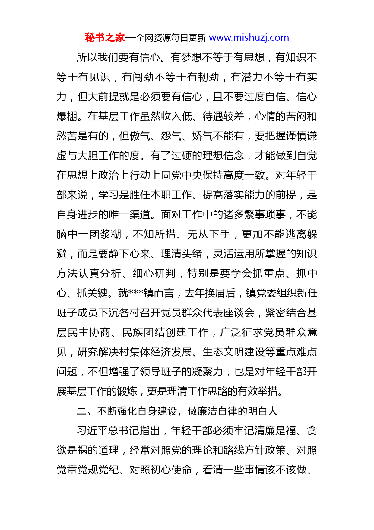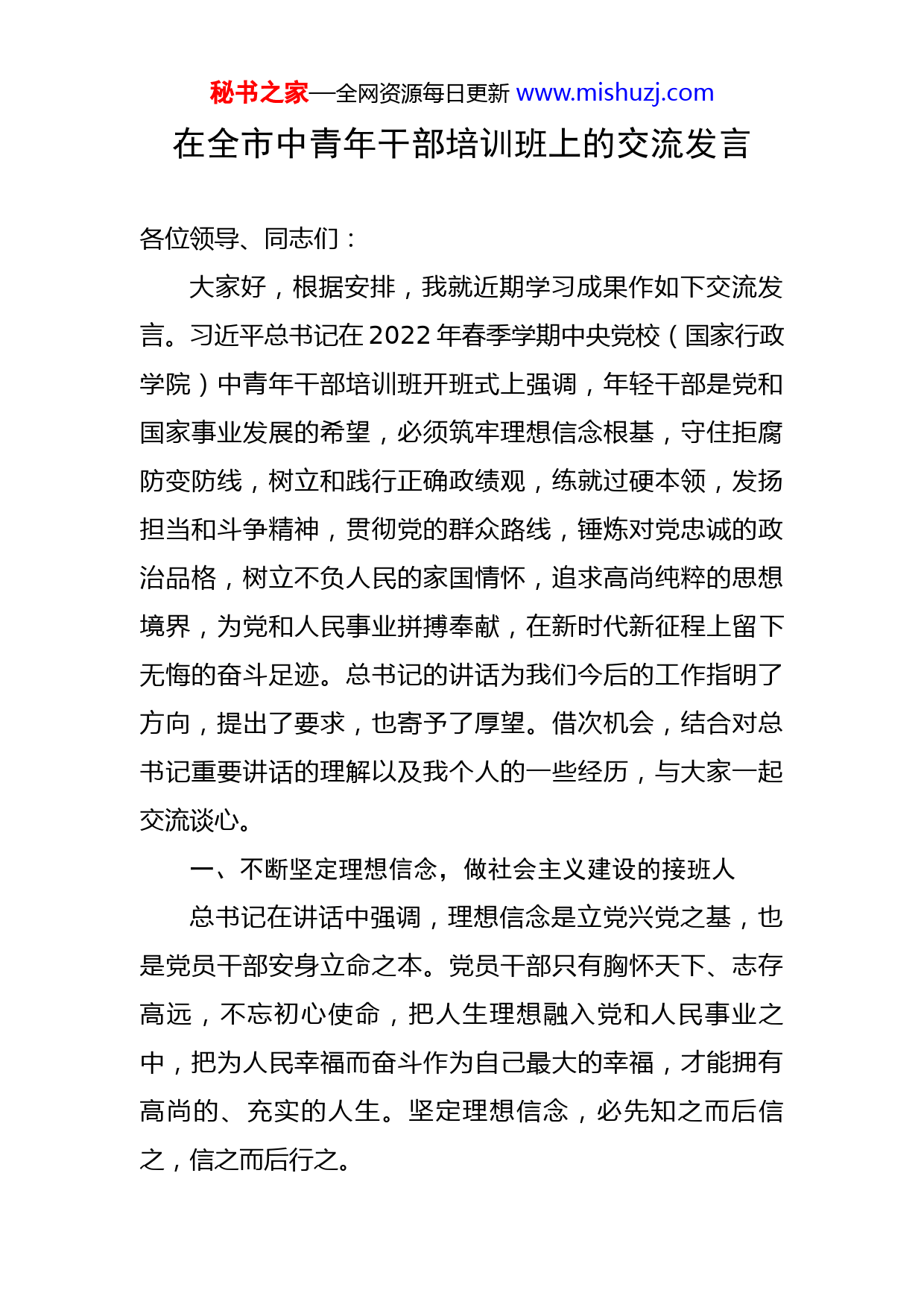 秘书之家—全网资源每日更新www.mishuzj.com在全市中青年干部培训班上的交流发言各位领导、同志们:大家好,根据安排,我就近期学习成果作如下交流发言。习近平总书记在2022年春季学期中央党校(国家行政学院)中青年干部培训班开班式上强调,年轻干部是党和国家事业发展的希望,必须筑牢理想信念根基,守住拒腐防变防线,树立和践行正确政绩观,练就过硬本领,发扬担当和斗争精神,贯彻党的群众路线,锤炼对党忠诚的政治品格,树立不负人民的家国情怀,追求高尚纯粹的思想境界,为党和人民事业拼搏奉献,在新时代新征程上留下无悔的奋斗足迹。总书记的讲话为我们今后的工作指明了方向,提出了要求,也寄予了厚望。借次机会,结合对总书记重要讲话的理解以及我个人的一些经历,与大家一起交流谈心。一、不断坚定理想信念,做社会主义建设的接班人总书记在讲话中强调,理想信念是立党兴党之基,也是党员干部安身立命之本。党员干部只有胸怀天下、志存高远,不忘初心使命,把人生理想融入党和人民事业之中,把为人民幸福而奋斗作为自己最大的幸福,才能拥有高尚的、充实的人生。坚定理想信念,必先知之而后信之,信之而后行之。秘书之家—全网资源每日更新www.mishuzj.com所以我们要有信心。有梦想不等于有思想,有知识不等于有见识,有闯劲不等于有韧劲,有潜力不等于有实力,但大前提就是必须要有信心,且不要过度自信、信心爆棚。在基层工作虽然收入低、待遇较差,心情的苦闷和愁苦是有的,但傲气、怨气、娇气不能有,要把握谨慎谦虚与大胆工作的度。有了过硬的理想信念,才能做到自觉在思想上政治上行动上同党中央保持高度一致。对年轻干部来说,学习是胜任本职工作、提高落实能力的前提,是自身进步的唯一渠道。面对工作中的诸多繁事琐事,不能脑中一团浆糊,不知所措、无从下手,更加不能逃离躲避,而是要静下心来、理清头绪,灵活运用所掌握的知识方法认真分析、细心研判,特别是要学会抓重点、抓中心、抓关键。就镇而言,去年换届后,镇党委组织新任班子成员下沉各村召开党员群众代表座谈会,紧密结合基层民主协商、民族团结创建工作,广泛征求党员群众意见,研究解决村集体经济发展、生态文明建设等重点难点问题,不但增强了领导班子的凝聚力,也是对年轻干部开展基层工作的锻炼,更是理清工作思路的有效举措。二、不断强化自身建设,做廉洁自律的明白人习近平总书记指出,年轻干部必须牢记清廉是福、贪欲是祸的道理,经常对照党的理论和路线方针政策、对照党章党规党纪、对照初心使命,看清一些事情该不该做、秘书之家—全网资源每日更新www.mishuzj.com能不能干,时刻自重自省,严守纪法规矩。一要坚持政治操守。要把本领体现在“会干事”上,把目标锁定在“干成事”上。一定要学会感恩,要用感恩的心对待组织;要用欣赏的眼光对待同志;要用细节决定成败的观念对待工作;要用慎独的习惯对待自己。二要坚持洁身自好。好的作风是抓工作落实的重要保障,体现着我们的能力素质和党性修养。我们必须适应新常态,不断加强自身的作风建设。要自省自励,面对形形色色的诱惑,我们要加强自我约束,耐得住寂寞、守得住清贫、稳得住心神,严守党纪红线、筑牢廉洁防线、夯实道德底线。要自觉加强党性修养和作风养成,时刻做到“不该做的事不做、不该伸的手不伸,不该去的地方不去,八小时之内和八小时之外一个样”,始终坚持讲党性、重品行、作表率,以平和之心对待“名”,以淡泊之心对待“位”,以知足之心对待“利”,以敬畏之心对待“权”,自觉抵制腐朽思想的侵蚀。三、不断提高工作能力,做政策落实的推进人习近平总书记指出,党员干部一定要加强理论学习、厚实理论功底,自觉用新时代党的创新理论观察新形势、研究新情况、解决新问题,使各项工作朝着正确方向、按照客观规律推进。一是要永远求真务实,奋斗不止。实践证明,一切难秘书之家—全网资源每日更新www.mishuzj.com题,只有在实干中才能破解;一切机遇,只有在实干中才能把握;一切愿景,只有在实干中才能实现。抓落实也是同样的道理,我们身处基层,大事难事不会天天有,每天面对的基本都是常规性工作,时间久了容易麻痹松懈,就可能会出这样那样的纰漏。这个时候尤其需要我们沉下心来,把每一项工作当成一件作品精雕细琢、反复打磨,严谨细致、精益求精,力求事事精心、件件完美。结合实际来说,开展工作难度大,群众难管理,产业基础薄弱都是客观存在的问题,这就需要我们领导干部大力践行为人民服务的根本宗旨,坚持做到从群众来到群众中去,充分结合实际谋划推动发展,为群众不断提高生活质量和经济收入做努力。二是要做到从不抱怨,心态平和。俗话说“上面千条线,下面一根针”,基层工作苦活儿、累活儿、急活儿多,加班加点是常事,所以不少同志存在着抱怨心态,着手开展工作前首先要抱怨一通,抱怨周末上班、晚上加班,抱怨工作节奏快、任务重……一人抱怨,往往周边人跟着心烦,满满的负能量充斥着大家的内心。这种消极的心态不仅影响着大家的自我认知判断,影响着工作质量和效率,久而久之,还会影响个人的成长和进步。所以我们就要大力弘扬不怕吃苦、勇往直前的精神,做到不抱怨、不放弃,以百折不挠、一往无前的姿态推动各