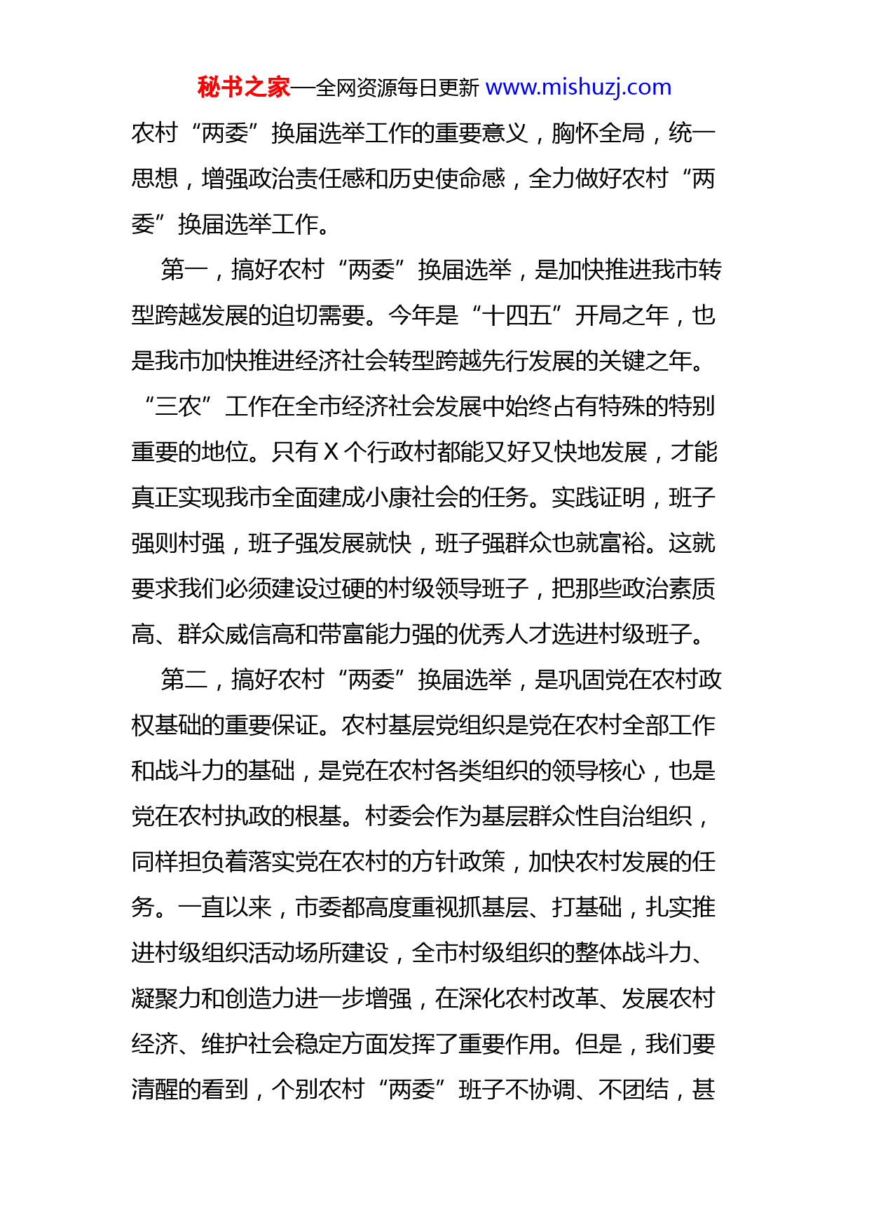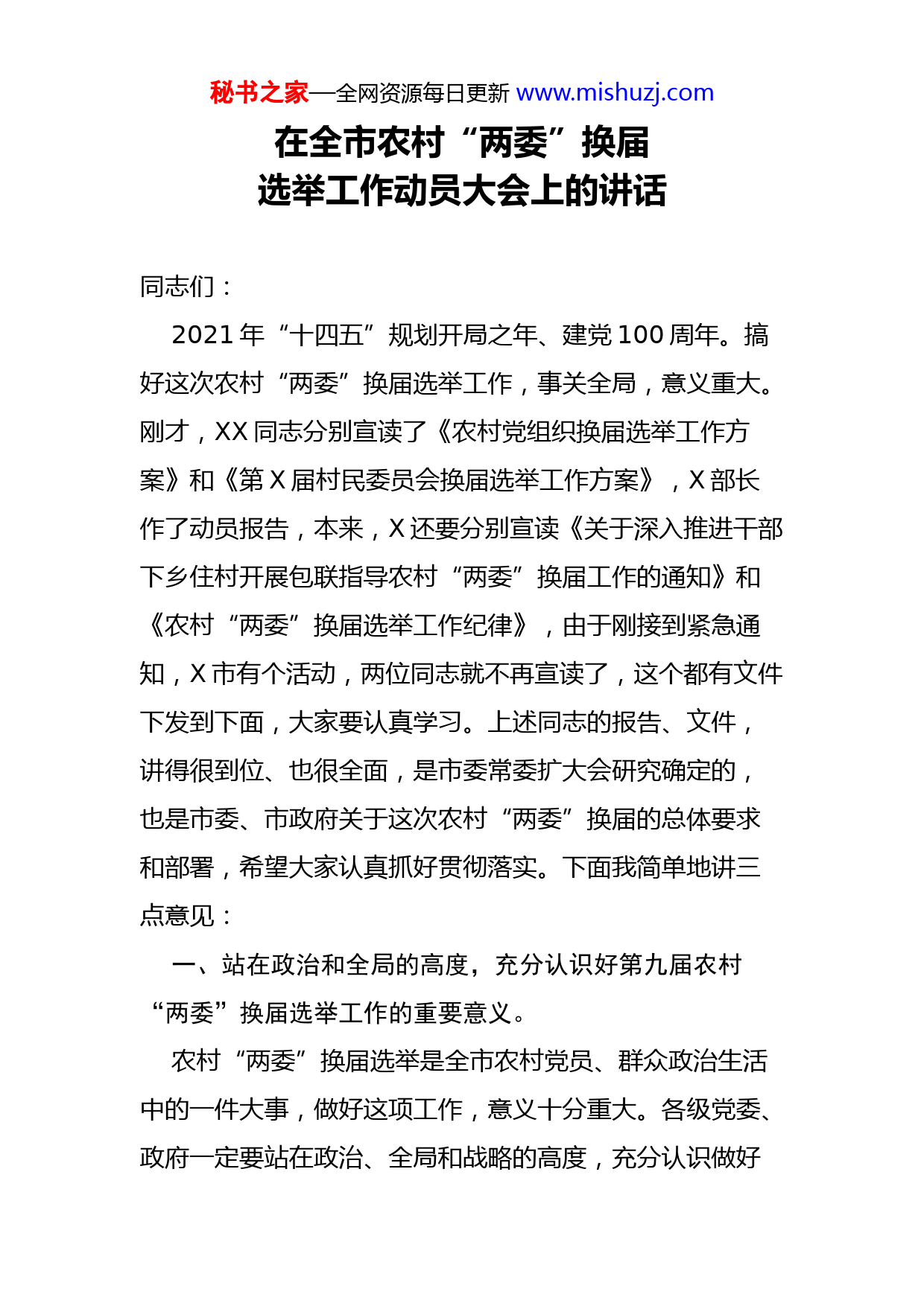 秘书之家—全网资源每日更新www.mishuzj.com在全市农村“两委”换届选举工作动员大会上的讲话同志们:2021年“十四五”规划开局之年、建党100周年。搞好这次农村“两委”换届选举工作,事关全局,意义重大。刚才,XX同志分别宣读了《农村党组织换届选举工作方案》和《第X届村民委员会换届选举工作方案》,X部长作了动员报告,本来,X还要分别宣读《关于深入推进干部下乡住村开展包联指导农村“两委”换届工作的通知》和《农村“两委”换届选举工作纪律》,由于刚接到紧急通知,X市有个活动,两位同志就不再宣读了,这个都有文件下发到下面,大家要认真学习。上述同志的报告、文件,讲得很到位、也很全面,是市委常委扩大会研究确定的,也是市委、市政府关于这次农村“两委”换届的总体要求和部署,希望大家认真抓好贯彻落实。下面我简单地讲三点意见:一、站在政治和全局的高度,充分认识好第九届农村“两委”换届选举工作的重要意义。农村“两委”换届选举是全市农村党员、群众政治生活中的一件大事,做好这项工作,意义十分重大。各级党委、政府一定要站在政治、全局和战略的高度,充分认识做好秘书之家—全网资源每日更新www.mishuzj.com农村“两委”换届选举工作的重要意义,胸怀全局,统一思想,增强政治责任感和历史使命感,全力做好农村“两委”换届选举工作。第一,搞好农村“两委”换届选举,是加快推进我市转型跨越发展的迫切需要。今年是“十四五”开局之年,也是我市加快推进经济社会转型跨越先行发展的关键之年。“三农”工作在全市经济社会发展中始终占有特殊的特别重要的地位。只有X个行政村都能又好又快地发展,才能真正实现我市全面建成小康社会的任务。实践证明,班子强则村强,班子强发展就快,班子强群众也就富裕。这就要求我们必须建设过硬的村级领导班子,把那些政治素质高、群众威信高和带富能力强的优秀人才选进村级班子。第二,搞好农村“两委”换届选举,是巩固党在农村政权基础的重要保证。农村基层党组织是党在农村全部工作和战斗力的基础,是党在农村各类组织的领导核心,也是党在农村执政的根基。村委会作为基层群众性自治组织,同样担负着落实党在农村的方针政策,加快农村发展的任务。一直以来,市委都高度重视抓基层、打基础,扎实推进村级组织活动场所建设,全市村级组织的整体战斗力、凝聚力和创造力进一步增强,在深化农村改革、发展农村经济、维护社会稳定方面发挥了重要作用。但是,我们要清醒的看到,个别农村“两委”班子不协调、不团结,甚秘书之家—全网资源每日更新www.mishuzj.com至极个别的村子内耗严重,因此影响了本村的经济发展,影响了本村的农民致富,还有极个别村子村级组织软弱涣散、党务村务管理混乱、经济社会发展滞后的问题还较为突出。如任其发展,必将削弱党在农村的执政根基和政权基础。我们必须紧紧抓住第九届农村“两委”换届的有利契机,选好配强班子,把农村的各类组织和广大党员干部群众团结到“两委”班子周围,凝心聚力,把“乡村振兴”战略落实落地落好。第三,搞好农村“两委”换届选举,是加强农村基层民主政治建设的具体体现。农村“两委”换届选举,广大农民群众按照自己的意愿选举农村“两委”班子,是农村党员和农民群众参与最直接、最广泛、最生动的民主政治教育和实践,是发展社会主义民主政治的基础工程。通过民主选举的办法选举产生农村“两委”干部,切实尊重和落实党员群众的选举权、知情权、参与权和监督权,有利于调动农村党员和农民群众政治参与的积极性,增强广大农村党员群众当家作主的责任感和民主法制意识,提高发扬民主、依法办事的能力,有利于完善村务公开和民主管理的各项制度,确保农村基层民主朝着正确、健康的方向发展,不断把农村基层民主政治建设提高到一个新水平。二、牢牢把握基本原则,切实保证农村“两委”换届选举工作的正确方向秘书之家—全网资源每日更新www.mishuzj.com搞好农村“两委”换届选举,加强党的领导是关键。各级各部门要切实加强对换届选举工作的领导和指导,充分发挥党的政治优势、思想优势、组织优势,保证换届选举不偏离正确的方向。(一)加强党的领导,选好配强班子。XX书记在全省第X届村民委员会换届选举工作电视电话会议上的讲话明确指出,不能把村民自治和党的领导对立起来。农村党组织在村级组织换届选举中发挥领导核心作用,是法律的规定,是村民自治的有机组成部分,要旗帜鲜明、理直气壮地加强领导。各级党组织要加强宣传,使广大群众切实明白该选什么人、不该选什么人,充分相信和紧紧依靠广大群众,真正把政治素质高、“双带”能力强的村干部选出来。按照上级要求,今后我们在全市范围开展干部下乡住村包联帮扶活动,不仅仅局限在为所包村办几件实事,更要着重从积极谋划发展农村经济、增加农民收入上解决问题。原来是专项包,这次四大班子包联工作要全面的包,各项工作都要包,包括村民选举、村民议事、村务公开、集体经济等一系列事关经济社会发展的工作。所以,大家一定要把这次“两委”换届作为下乡住村包联帮工作的重中之重抓紧抓好,真正把德才兼备的人选出来,增强其自主发展、自主创新的能力。各乡办要认真细致