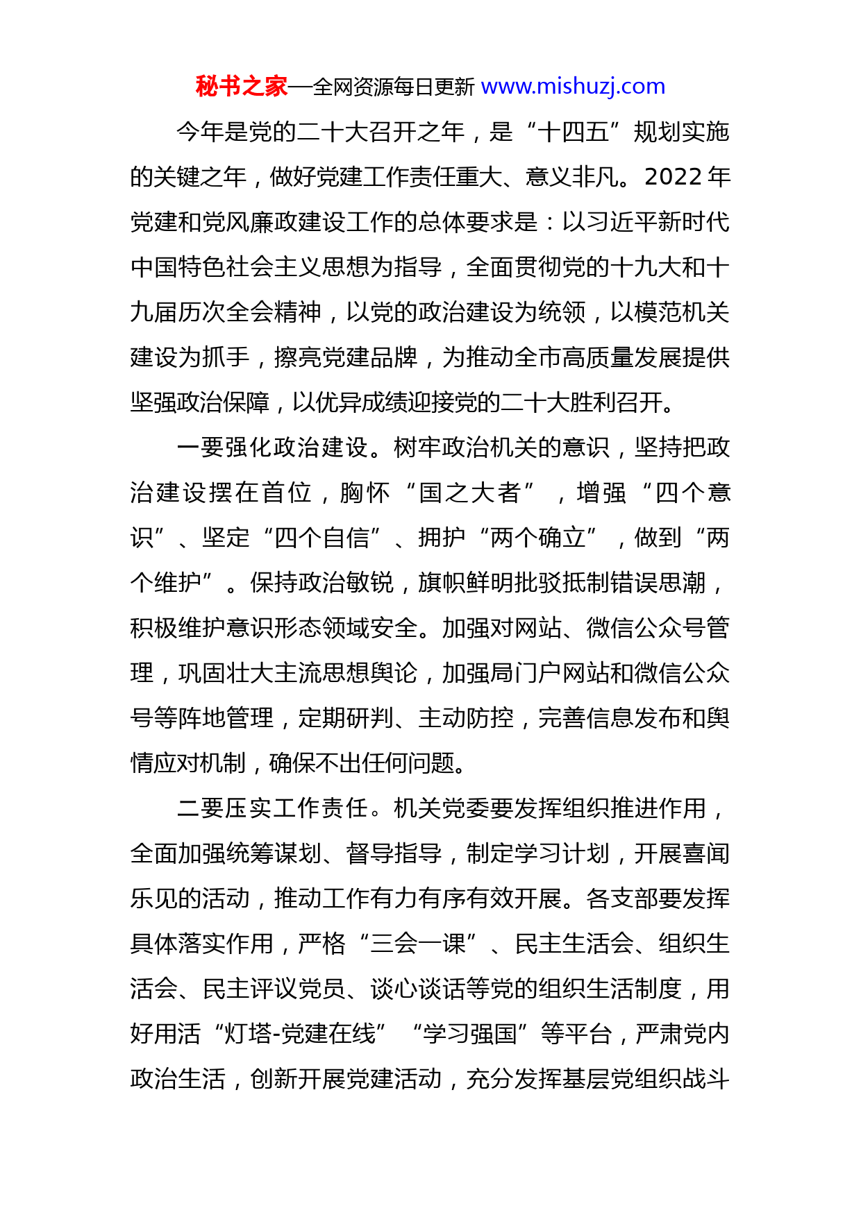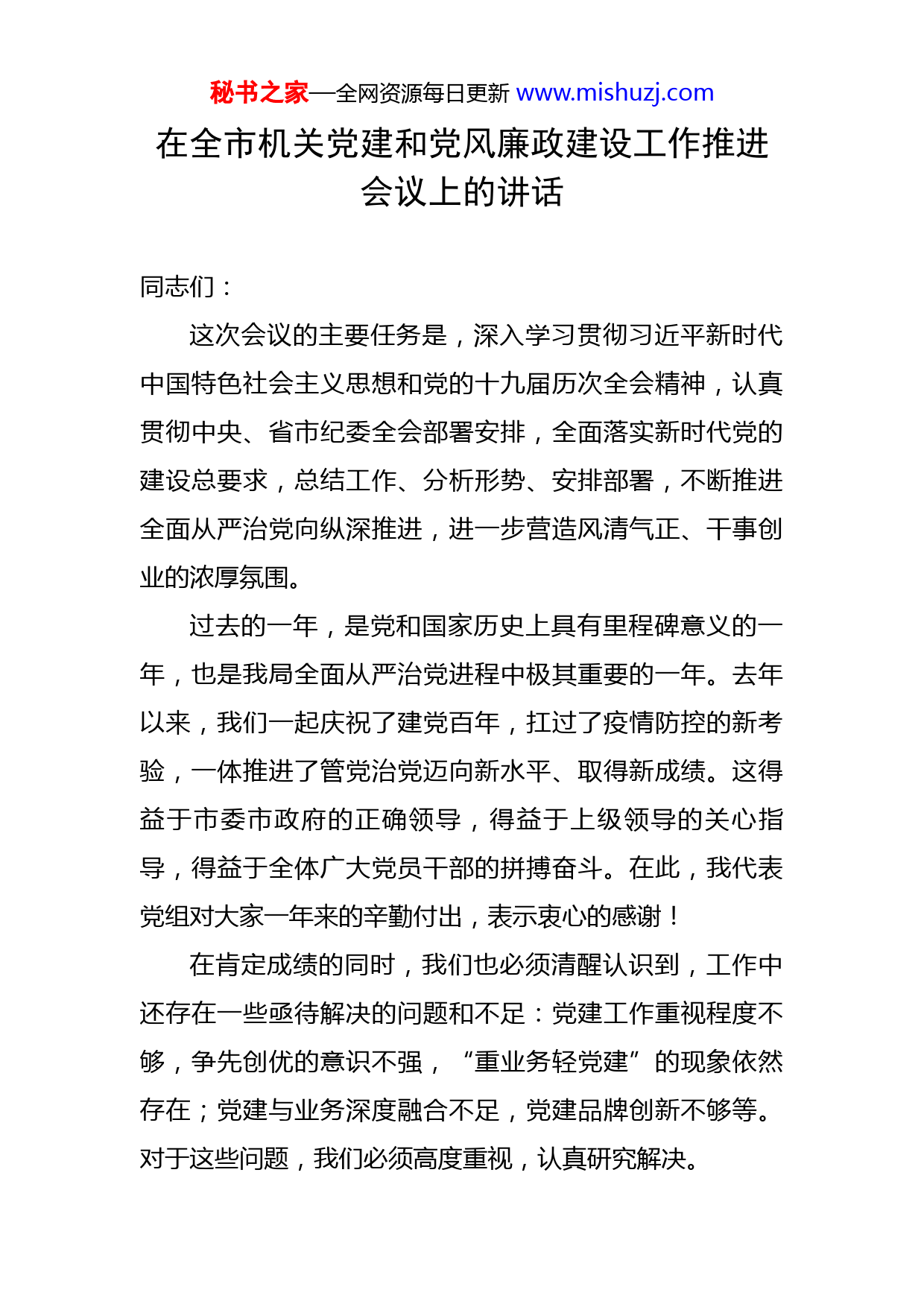 秘书之家—全网资源每日更新www.mishuzj.com在全市机关党建和党风廉政建设工作推进会议上的讲话同志们:这次会议的主要任务是,深入学习贯彻习近平新时代中国特色社会主义思想和党的十九届历次全会精神,认真贯彻中央、省市纪委全会部署安排,全面落实新时代党的建设总要求,总结工作、分析形势、安排部署,不断推进全面从严治党向纵深推进,进一步营造风清气正、干事创业的浓厚氛围。过去的一年,是党和国家历史上具有里程碑意义的一年,也是我局全面从严治党进程中极其重要的一年。去年以来,我们一起庆祝了建党百年,扛过了疫情防控的新考验,一体推进了管党治党迈向新水平、取得新成绩。这得益于市委市政府的正确领导,得益于上级领导的关心指导,得益于全体广大党员干部的拼搏奋斗。在此,我代表党组对大家一年来的辛勤付出,表示衷心的感谢!在肯定成绩的同时,我们也必须清醒认识到,工作中还存在一些亟待解决的问题和不足:党建工作重视程度不够,争先创优的意识不强,“重业务轻党建”的现象依然存在;党建与业务深度融合不足,党建品牌创新不够等。对于这些问题,我们必须高度重视,认真研究解决。秘书之家—全网资源每日更新www.mishuzj.com今年是党的二十大召开之年,是“十四五”规划实施的关键之年,做好党建工作责任重大、意义非凡。2022年党建和党风廉政建设工作的总体要求是:以习近平新时代中国特色社会主义思想为指导,全面贯彻党的十九大和十九届历次全会精神,以党的政治建设为统领,以模范机关建设为抓手,擦亮党建品牌,为推动全市高质量发展提供坚强政治保障,以优异成绩迎接党的二十大胜利召开。一要强化政治建设。树牢政治机关的意识,坚持把政治建设摆在首位,胸怀“国之大者”,增强“四个意识”、坚定“四个自信”、拥护“两个确立”,做到“两个维护”。保持政治敏锐,旗帜鲜明批驳抵制错误思潮,积极维护意识形态领域安全。加强对网站、微信公众号管理,巩固壮大主流思想舆论,加强局门户网站和微信公众号等阵地管理,定期研判、主动防控,完善信息发布和舆情应对机制,确保不出任何问题。二要压实工作责任。机关党委要发挥组织推进作用,全面加强统筹谋划、督导指导,制定学习计划,开展喜闻乐见的活动,推动工作有力有序有效开展。各支部要发挥具体落实作用,严格“三会一课”、民主生活会、组织生活会、民主评议党员、谈心谈话等党的组织生活制度,用好用活“灯塔-党建在线”“学习强国”等平台,严肃党内政治生活,创新开展党建活动,充分发挥基层党组织战斗秘书之家—全网资源每日更新www.mishuzj.com堡垒和党员先锋模范作用。三要持续改进作风。工作作风关系事业兴衰成败。要大力弘扬“严真细实快”作风,毫不松懈地纠“四风”、树新风。坚持“严”字当头、“真”字为先、“细”字着力、“实”字打底、“快”字为要,立说立行、马上就办,力戒虚功、务求实效,对上级的工作部署要求,不等不靠不观望,第一时间学习贯彻、第一时间抓好落实,办实事、谋实策、求实效,切实做到人无我有、人有我快、人快我优、人优我新。四要加强监督执纪。要保持不敢腐的高压。制定完善年度从严治党主体责任清单和任务分工,党组肩负起管党治党主体责任,抓好党建、管住队伍;班子成员要严格落实“一岗双责”,形成一级抓一级、层层抓落实的责任体系。要扎紧不能腐的笼子。坚持民主集中制和“三重一大”事项议事决策机制,定期开展廉政风险点排查工作,提高风险防控意识、能力,做到早发现、早处置、早解决。要增强不想腐的自觉。树立正确的权力观、义利观,强化“若要人不知、除非己莫为”的自警意识,自觉抵御“围猎”风险,明大德、守公德、严私德,做到人前人后一个样、八小时内外一个样、有没有监督一个样,教育引导广大党员干部知敬畏、存戒惧、守底线、不越线。同志们,站在新的历史起点上,让我们更加紧密地团秘书之家—全网资源每日更新www.mishuzj.com结在以习近平同志为核心的党中央周围,围绕中心、服务大局,坚定信心、坚定决心、坚定目标不动摇,埋头苦干、紧抓快干、真抓实干不放松,提升标杆、加压奋进,事争一流、唯旗是夺,不断推动管党治党工作再上新水平、再创新辉煌,以优异成绩迎接党的二十大胜利召开!谢谢大家!