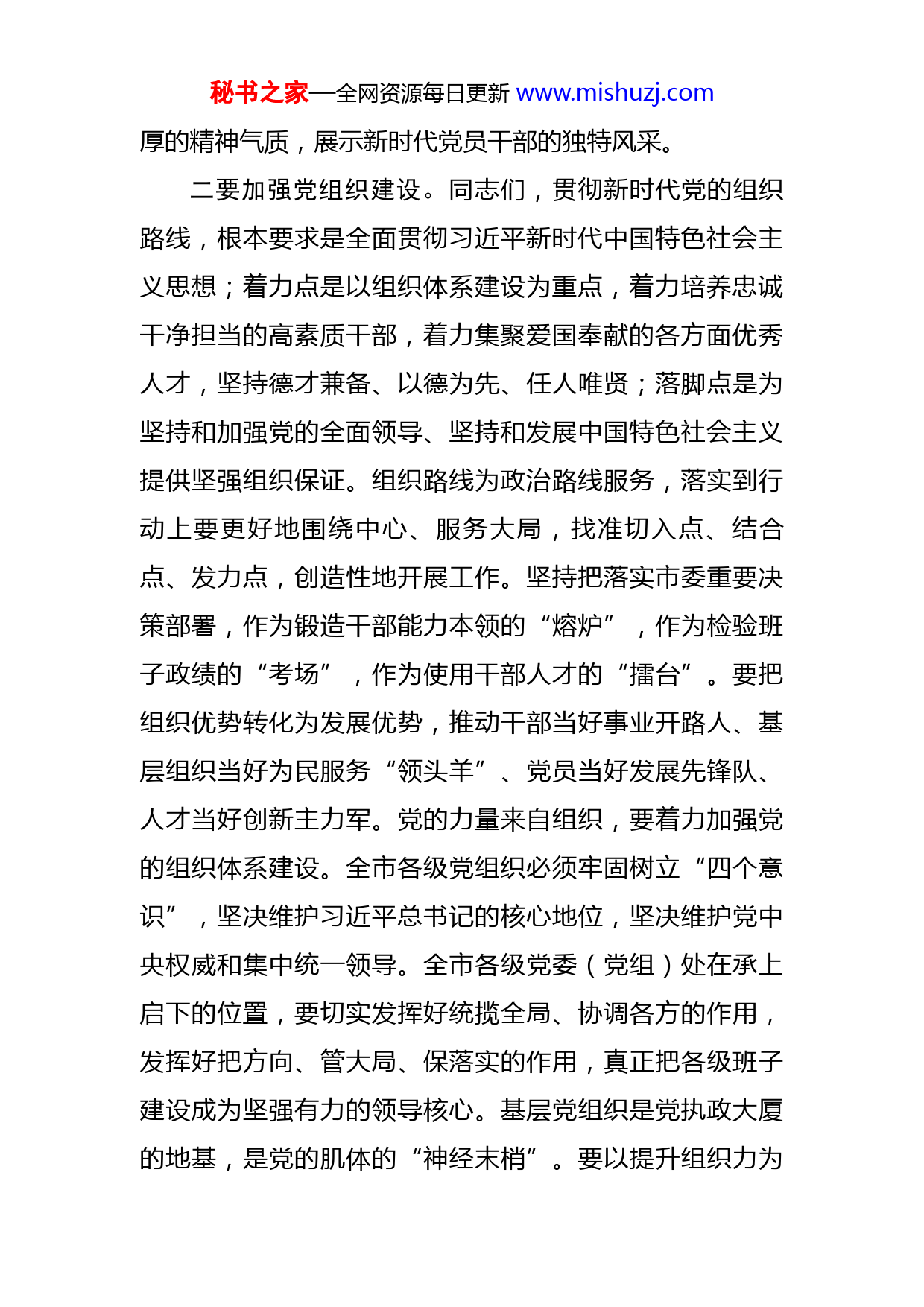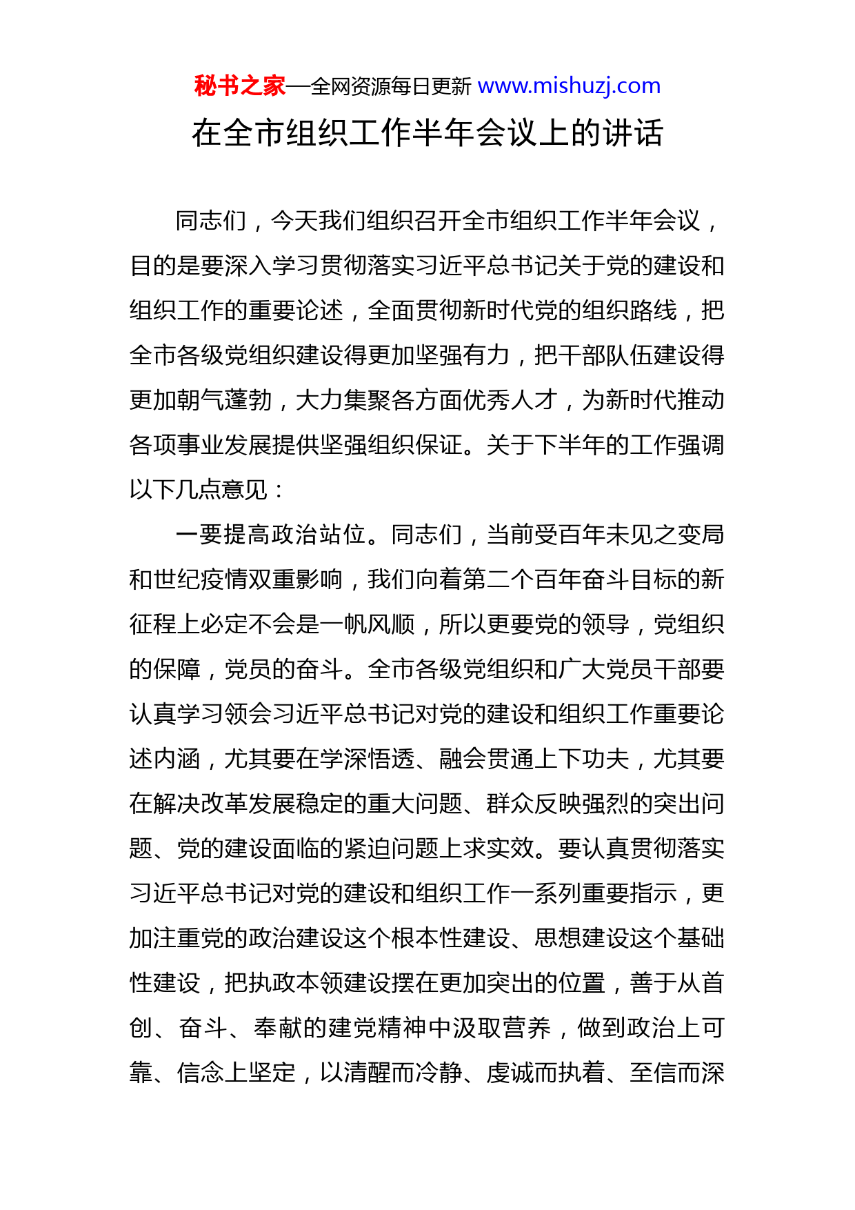 秘书之家—全网资源每日更新www.mishuzj.com在全市组织工作半年会议上的讲话同志们,今天我们组织召开全市组织工作半年会议,目的是要深入学习贯彻落实习近平总书记关于党的建设和组织工作的重要论述,全面贯彻新时代党的组织路线,把全市各级党组织建设得更加坚强有力,把干部队伍建设得更加朝气蓬勃,大力集聚各方面优秀人才,为新时代推动各项事业发展提供坚强组织保证。关于下半年的工作强调以下几点意见:一要提高政治站位。同志们,当前受百年未见之变局和世纪疫情双重影响,我们向着第二个百年奋斗目标的新征程上必定不会是一帆风顺,所以更要党的领导,党组织的保障,党员的奋斗。全市各级党组织和广大党员干部要认真学习领会习近平总书记对党的建设和组织工作重要论述内涵,尤其要在学深悟透、融会贯通上下功夫,尤其要在解决改革发展稳定的重大问题、群众反映强烈的突出问题、党的建设面临的紧迫问题上求实效。要认真贯彻落实习近平总书记对党的建设和组织工作一系列重要指示,更加注重党的政治建设这个根本性建设、思想建设这个基础性建设,把执政本领建设摆在更加突出的位置,善于从首创、奋斗、奉献的建党精神中汲取营养,做到政治上可靠、信念上坚定,以清醒而冷静、虔诚而执着、至信而深秘书之家—全网资源每日更新www.mishuzj.com厚的精神气质,展示新时代党员干部的独特风采。二要加强党组织建设。同志们,贯彻新时代党的组织路线,根本要求是全面贯彻习近平新时代中国特色社会主义思想;着力点是以组织体系建设为重点,着力培养忠诚干净担当的高素质干部,着力集聚爱国奉献的各方面优秀人才,坚持德才兼备、以德为先、任人唯贤;落脚点是为坚持和加强党的全面领导、坚持和发展中国特色社会主义提供坚强组织保证。组织路线为政治路线服务,落实到行动上要更好地围绕中心、服务大局,找准切入点、结合点、发力点,创造性地开展工作。坚持把落实市委重要决策部署,作为锻造干部能力本领的“熔炉”,作为检验班子政绩的“考场”,作为使用干部人才的“擂台”。要把组织优势转化为发展优势,推动干部当好事业开路人、基层组织当好为民服务“领头羊”、党员当好发展先锋队、人才当好创新主力军。党的力量来自组织,要着力加强党的组织体系建设。全市各级党组织必须牢固树立“四个意识”,坚决维护习近平总书记的核心地位,坚决维护党中央权威和集中统一领导。全市各级党委(党组)处在承上启下的位置,要切实发挥好统揽全局、协调各方的作用,发挥好把方向、管大局、保落实的作用,真正把各级班子建设成为坚强有力的领导核心。基层党组织是党执政大厦的地基,是党的肌体的“神经末梢”。要以提升组织力为秘书之家—全网资源每日更新www.mishuzj.com重点,推动城市基层党建进一步深化,扩大覆盖要动态跟进,分类指导要因情施策,提高质量要严格要求,聚焦主业要做深做实。要在“严”和“密”两方面下功夫,加强各级组织建设,增强组织纪律性。三是建强人才队伍。同志们,人才对于社会的发展至关重要,要聚天下英才而用之。着重抓改革措施的落地生效,持续深入推进人才体制机制改革,破除各项障碍,最大限度激发人才创造活力。拓宽人才引进的视野,聚焦实施国家重大战略需求、聚焦产业发展需求、聚焦平台建设需求,精准引进急需紧缺人才,更加注重集聚青年人才。要加强对人才尤其是海外人才的政治引领。抓好干部工作,选人要坚持五湖四海,广开进贤之路,真正形成“一池活水”;用人要树立鲜明导向,真正让想干事、能干事、干成事的干部有机会有职位有舞台,注意用当其时、用人所长,人岗相适、人尽其才。要建立健全容错纠错机制,关心关爱干部,为担当者担当,为负责者负责。要注重培养选拔优秀年轻干部,多让年轻干部到基层岗位、一线岗位、艰苦岗位上加强实践历练,经风雨、见世面、长才干。组工干部要有高境界、大格局、真本领,要有大局意识、奉献精神,政治上绝对可靠、对党绝对忠诚,心有所戒、行有所止、言有所规。要有过硬的专业能力、专业精神,努力成为组织工作的行家里手。秘书之家—全网资源每日更新www.mishuzj.com四是保持良好精气神。同志们,在发展大局中,我们使命光荣、任务艰巨,要把事业发展的需求作为工作的着力点,使充满激情、富于创造、勇于担当成为新时代党员干部的特质。充满激情,就是干事创业必须精神抖擞、斗志旺盛,充满那么一股子气和劲。心里装着工作、装着群众、装着事业,奔着目标去、奔着问题去。用心用情、念兹在兹,只争朝夕、雷厉风行,坚韧不拔、永葆激情。富于创造,就是不能固步自封、因循守旧,要敢闯敢试、敢为人先。善于在不可能中寻找可能;前面没有路,就杀出一条血路、趟出一条新路;没有资源或者资源不足,就要创造条件、借势发力、借船出海,顺应潮流、把握规律。勇于担当,就是愿意做事、敢于扛事、能够成事。勇于挑最重的担子、啃最硬的骨头,勇于到条件艰苦、困难多、矛盾多、任务重的地方去。有舍我其谁、当仁不让的气概,动真碰硬、克难攻坚的劲头,任劳任怨、尽心竭力的情怀。同志们,党的二十大日渐临近,我们要紧密结合“奋进新征程建功新时代”实践活动,在特殊之年,拿出超常举措,展现特别