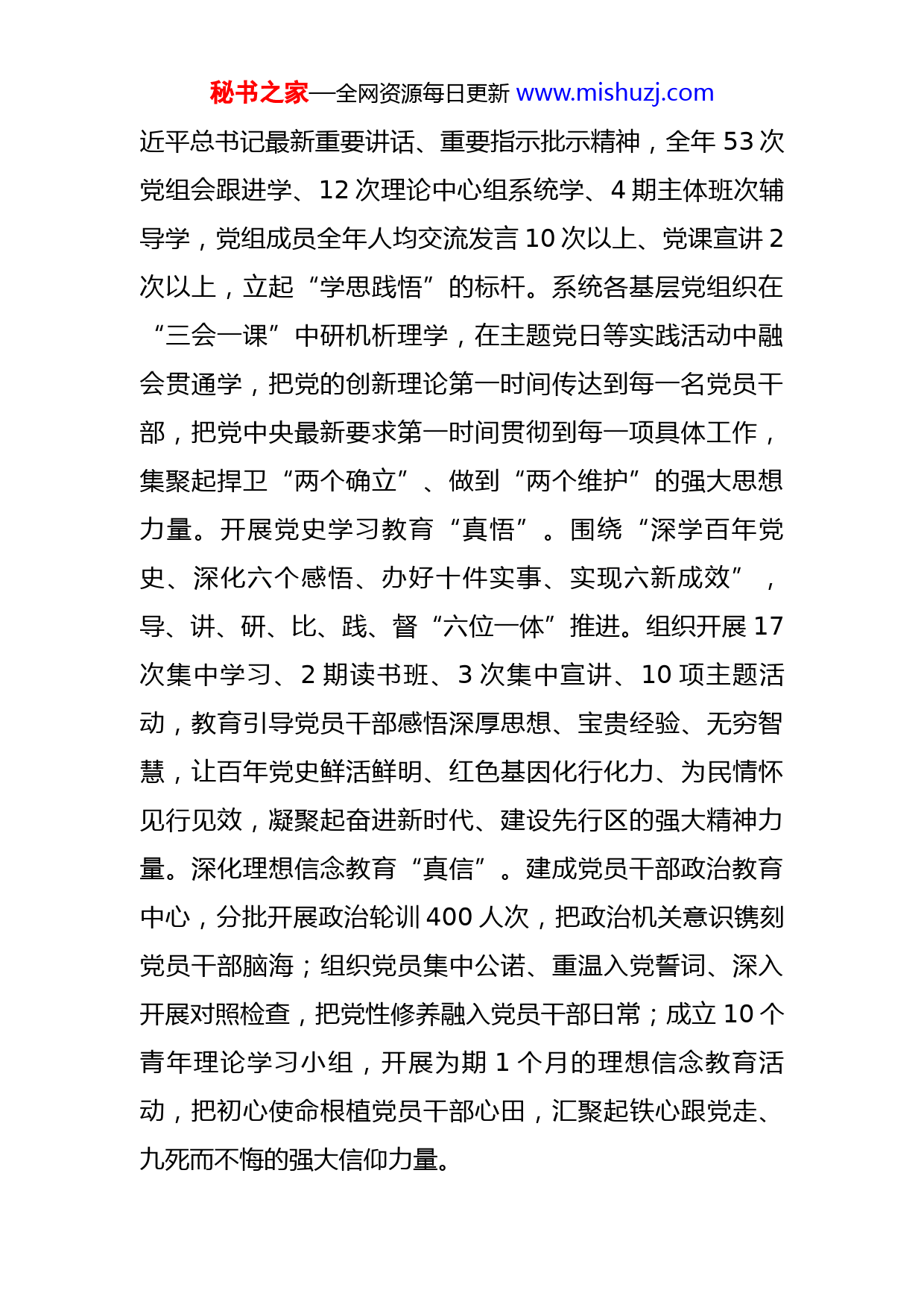 秘书之家—全网资源每日更新www.mishuzj.com在全面从严治党工作会议上的讲话今天,我们召开厅系统全面从严治党工作会议,主要任务是,深入学习贯彻习近平新时代中国特色社会主义思想,全面落实十九届中央纪委六次全会、自治区纪委十二届六次全会精神,总结20XX年全面从严治党工作,部署2022年重点任务。刚才,我们传达学习了中央和自治区有关会议精神,XX组长安排部署了20XX年党风廉政建设和反腐败工作。下面,我就做好今年厅系统全面从严治党工作讲3个方面意见。一、贯彻新时代党的建设总要求,坚持严的主基调不动摇,全面从严治党工作取得新成效20XX年,我们坚决落实党中央、自治区党委关于全面从严治党各项决策部署,以坚定的政治信念、坚强的思想基础、坚实的组织力量,扛起了建设先行区主力军政治责任。过去一年,我们坚持用马克思主义中国化最新理论成果武装头脑,理想信念“总开关”越拧越紧。始终把思想建设作为基础性、长期性任务来抓,引导党员干部把捍卫“两个确立”、做到“两个维护”作为最大政治、最高使命、最真情怀,用心铭记、深切感悟、自觉践行。落实第一议题制度“真学”。厅党组以上率下,第一议题必学习秘书之家—全网资源每日更新www.mishuzj.com近平总书记最新重要讲话、重要指示批示精神,全年53次党组会跟进学、12次理论中心组系统学、4期主体班次辅导学,党组成员全年人均交流发言10次以上、党课宣讲2次以上,立起“学思践悟”的标杆。系统各基层党组织在“三会一课”中研机析理学,在主题党日等实践活动中融会贯通学,把党的创新理论第一时间传达到每一名党员干部,把党中央最新要求第一时间贯彻到每一项具体工作,集聚起捍卫“两个确立”、做到“两个维护”的强大思想力量。开展党史学习教育“真悟”。围绕“深学百年党史、深化六个感悟、办好十件实事、实现六新成效”,导、讲、研、比、践、督“六位一体”推进。组织开展17次集中学习、2期读书班、3次集中宣讲、10项主题活动,教育引导党员干部感悟深厚思想、宝贵经验、无穷智慧,让百年党史鲜活鲜明、红色基因化行化力、为民情怀见行见效,凝聚起奋进新时代、建设先行区的强大精神力量。深化理想信念教育“真信”。建成党员干部政治教育中心,分批开展政治轮训400人次,把政治机关意识镌刻党员干部脑海;组织党员集中公诺、重温入党誓词、深入开展对照检查,把党性修养融入党员干部日常;成立10个青年理论学习小组,开展为期1个月的理想信念教育活动,把初心使命根植党员干部心田,汇聚起铁心跟党走、九死而不悔的强大信仰力量。秘书之家—全网资源每日更新www.mishuzj.com过去一年,我们扎实创建“让党中央放心、让人民群众满意”模范机关,基层党组织“桥头堡”越建越强。以模范机关创建为总抓手,一篙不松抓基层、一丝不苟夯基础,成为区直部门第一批模范机关达标单位。聚实责任“严管”。厅党组会议19次研究全面从严治党重大事项,2次听取基层党组织书记履职情况汇报;党组成员认真履行“一岗双责”,严格落实双重组织生活和基层联系点工作制度,36次深入一线调研,推动分管领域全面从严治党主体责任落实;49个基层党组织自上而下制定全面从严治党“三个清单”,明确了1000余项管党治党主要任务,各党支部书记每季度报告1次抓党建工作情况,形成以上率下、上下贯通的整体合力。擦亮品牌“建强”。“基层党建全面提升年”成效斐然,“三强九严”要求全面落实。测绘地理信息院“精准测量先行区、匠心绘制新宁夏”成为区直机关党建品牌,擦亮了基层党组织服务先行区建设的“名片”;国土资源调查监测院“调查监测守初心、一河三山践使命”党建品牌,成为XXXX事业服务群众的“窗口”;组织13个党员突击队、190余名党员下沉社区,助力打赢“10·17”疫情防控阻击战,让每个支部就是一个坚强堡垒、每名党员就是一名战斗先锋的使命担当,书写在为民服务一线。攻坚克难“见行”。把贯彻落实党中央和自治区党委决策部署,作为检验模范机关建设秘书之家—全网资源每日更新www.mishuzj.com成效的“标尺”。扫黑除恶、违建别墅问题整治、农村乱占耕地建房问题排查清理、贺兰山生态环境综合治理“四场硬仗”打赢打胜,彰显了政治机关建设本色;“我为群众办实事”实践活动扎实推进,135件为民实事全部办结,展现了服务机关建设底色;“以实干展现新作为、靠实干交出新答卷”活动深入开展,制止耕地“非农化”、矿业发展绿色转型、实景三维宁夏建设等重点任务成效明显,凸显了实干机关建设成色。党员干部斗争精神、奋斗意志、创新能力,在模范机关建设实践中得到检验、经受历练,交出了XXXX人新的时代答卷。过去一年,我们守正创新推进宣传思想工作,XXXX领域意识形态“主阵地”越守越严。旗帜鲜明坚持党管宣传,牢牢把握意识形态工作主动权领导权。下好责任“一盘棋”。把意识形态工作纳入效能目标考核,逐级签订责任书,压实主体责任。召开2次意识形态工作领导小组会议、7次网络安全专题会议,30余次听取基层党组织书记抓意识形态工作汇报,分析问题、研判形势,部署任务、推动落实,构建起上下协同、齐抓共管的工作格局。用好宣传“扩音器”。以志辉源石酒庄历史遗留问题解决为主题的《宁