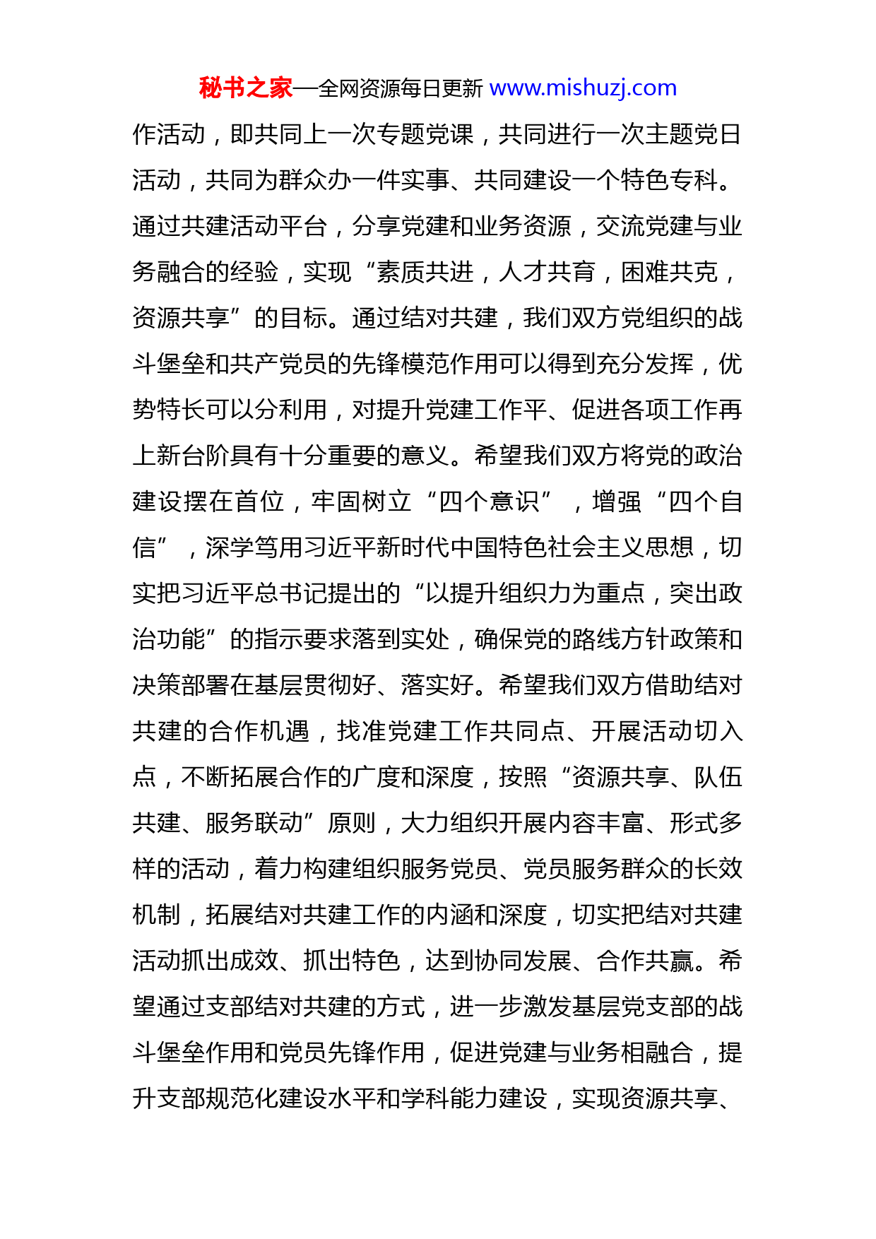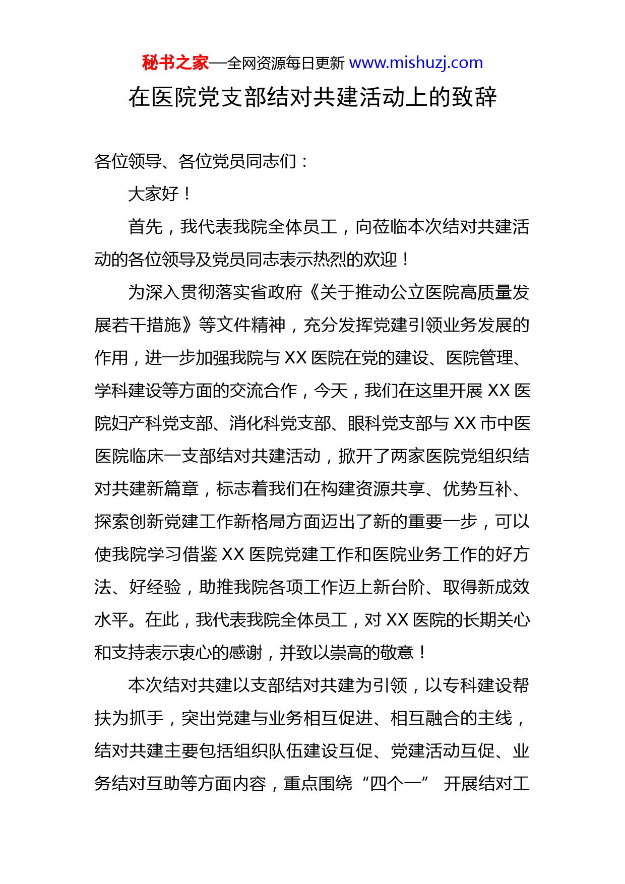 秘书之家—全网资源每日更新www.mishuzj.com在医院党支部结对共建活动上的致辞各位领导、各位党员同志们:大家好!首先,我代表我院全体员工,向莅临本次结对共建活动的各位领导及党员同志表示热烈的欢迎!为深入贯彻落实省政府《关于推动公立医院高质量发展若干措施》等文件精神,充分发挥党建引领业务发展的作用,进一步加强我院与XX医院在党的建设、医院管理、学科建设等方面的交流合作,今天,我们在这里开展XX医院妇产科党支部、消化科党支部、眼科党支部与XX市中医医院临床一支部结对共建活动,掀开了两家医院党组织结对共建新篇章,标志着我们在构建资源共享、优势互补、探索创新党建工作新格局方面迈出了新的重要一步,可以使我院学习借鉴XX医院党建工作和医院业务工作的好方法、好经验,助推我院各项工作迈上新台阶、取得新成效水平。在此,我代表我院全体员工,对XX医院的长期关心和支持表示衷心的感谢,并致以崇高的敬意!本次结对共建以支部结对共建为引领,以专科建设帮扶为抓手,突出党建与业务相互促进、相互融合的主线,结对共建主要包括组织队伍建设互促、党建活动互促、业务结对互助等方面内容,重点围绕“四个一”开展结对工秘书之家—全网资源每日更新www.mishuzj.com作活动,即共同上一次专题党课,共同进行一次主题党日活动,共同为群众办一件实事、共同建设一个特色专科。通过共建活动平台,分享党建和业务资源,交流党建与业务融合的经验,实现“素质共进,人才共育,困难共克,资源共享”的目标。通过结对共建,我们双方党组织的战斗堡垒和共产党员的先锋模范作用可以得到充分发挥,优势特长可以分利用,对提升党建工作平、促进各项工作再上新台阶具有十分重要的意义。希望我们双方将党的政治建设摆在首位,牢固树立“四个意识”,增强“四个自信”,深学笃用习近平新时代中国特色社会主义思想,切实把习近平总书记提出的“以提升组织力为重点,突出政治功能”的指示要求落到实处,确保党的路线方针政策和决策部署在基层贯彻好、落实好。希望我们双方借助结对共建的合作机遇,找准党建工作共同点、开展活动切入点,不断拓展合作的广度和深度,按照“资源共享、队伍共建、服务联动”原则,大力组织开展内容丰富、形式多样的活动,着力构建组织服务党员、党员服务群众的长效机制,拓展结对共建工作的内涵和深度,切实把结对共建活动抓出成效、抓出特色,达到协同发展、合作共赢。希望通过支部结对共建的方式,进一步激发基层党支部的战斗堡垒作用和党员先锋作用,促进党建与业务相融合,提升支部规范化建设水平和学科能力建设,实现资源共享、秘书之家—全网资源每日更新www.mishuzj.com优势互补,达到双向互促、共同提升的良好效果,以坚强组织保障,不断为地方医疗事业卫生发展贡献力量。各位领导、各位党员同志们,相信有了今天这个良好开端,在贵院的大力支持和携手共建下,我们双方医院的各项工作将会再上新台阶、再创新业绩,争取成为结对共建的楷模和典范。我就讲这些,谢谢大家!