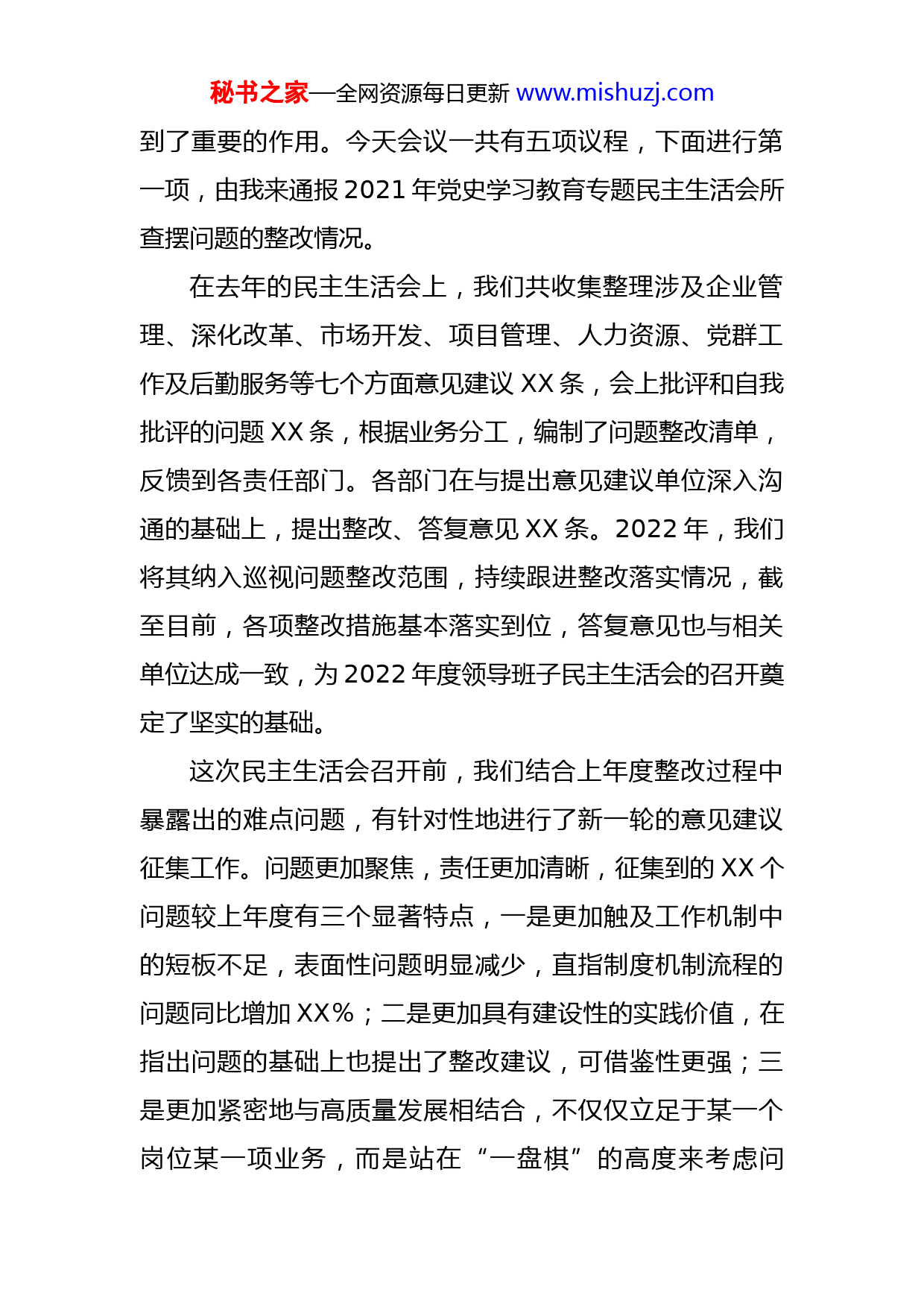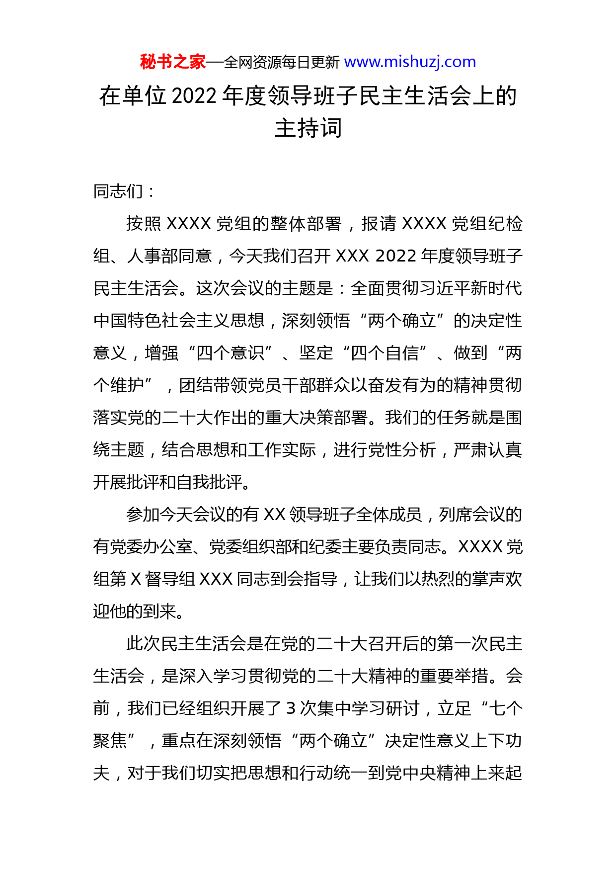 秘书之家—全网资源每日更新www.mishuzj.com在单位2022年度领导班子民主生活会上的主持词同志们:按照XXXX党组的整体部署,报请XXXX党组纪检组、人事部同意,今天我们召开XXX2022年度领导班子民主生活会。这次会议的主题是:全面贯彻习近平新时代中国特色社会主义思想,深刻领悟“两个确立”的决定性意义,增强“四个意识”、坚定“四个自信”、做到“两个维护”,团结带领党员干部群众以奋发有为的精神贯彻落实党的二十大作出的重大决策部署。我们的任务就是围绕主题,结合思想和工作实际,进行党性分析,严肃认真开展批评和自我批评。参加今天会议的有XX领导班子全体成员,列席会议的有党委办公室、党委组织部和纪委主要负责同志。XXXX党组第X督导组XXX同志到会指导,让我们以热烈的掌声欢迎他的到来。此次民主生活会是在党的二十大召开后的第一次民主生活会,是深入学习贯彻党的二十大精神的重要举措。会前,我们已经组织开展了3次集中学习研讨,立足“七个聚焦”,重点在深刻领悟“两个确立”决定性意义上下功夫,对于我们切实把思想和行动统一到党中央精神上来起秘书之家—全网资源每日更新www.mishuzj.com到了重要的作用。今天会议一共有五项议程,下面进行第一项,由我来通报2021年党史学习教育专题民主生活会所查摆问题的整改情况。在去年的民主生活会上,我们共收集整理涉及企业管理、深化改革、市场开发、项目管理、人力资源、党群工作及后勤服务等七个方面意见建议XX条,会上批评和自我批评的问题XX条,根据业务分工,编制了问题整改清单,反馈到各责任部门。各部门在与提出意见建议单位深入沟通的基础上,提出整改、答复意见XX条。2022年,我们将其纳入巡视问题整改范围,持续跟进整改落实情况,截至目前,各项整改措施基本落实到位,答复意见也与相关单位达成一致,为2022年度领导班子民主生活会的召开奠定了坚实的基础。这次民主生活会召开前,我们结合上年度整改过程中暴露出的难点问题,有针对性地进行了新一轮的意见建议征集工作。问题更加聚焦,责任更加清晰,征集到的XX个问题较上年度有三个显著特点,一是更加触及工作机制中的短板不足,表面性问题明显减少,直指制度机制流程的问题同比增加XX%;二是更加具有建设性的实践价值,在指出问题的基础上也提出了整改建议,可借鉴性更强;三是更加紧密地与高质量发展相结合,不仅仅立足于某一个岗位某一项业务,而是站在“一盘棋”的高度来考虑问秘书之家—全网资源每日更新www.mishuzj.com题、提出建议。XXXXXXXXXXXXXXXXXXXXXXXXXXXXXXXXXXXXX下面进行第二项议程,由我来通报XX领导班子对照检查情况。XXXXXXXXXXXXXXXXXXXXXXXXXXXXXXXXXXXXX下面进行第三项议程,领导成员依次发言,开展批评与自我批评,按照规定,一位同志讲完后,大家互相帮助。讲的时候尽可能抓住重点,开展批评要开门见山,针对主要问题谈自己的意见建议。首先,由我发言。XXXXXXXXXXXXXXXXXXXXXXXXXXXXXXXXXXXXX请其他同志对我进行批评帮助。XXXXXXXXXXXXXXXXXXXXXXXXXXXXXXXXXXXXX下面,请XXX同志发言。XXXXXXXXXXXXXXXXXXXXXXXXXXXXXXXXXXXXX请其他同志对XXX同志进行批评帮助。XXXXXXXXXXXXXXXXXXXXXXXXXXXXXXXXXX秘书之家—全网资源每日更新www.mishuzj.comXXX下面,请XXX同志发言。XXXXXXXXXXXXXXXXXXXXXXXXXXXXXXXXXXXXX请其他同志对XXX同志进行批评帮助。XXXXXXXXXXXXXXXXXXXXXXXXXXXXXXXXXXXXXX下面,请XXX同志发言。XXXXXXXXXXXXXXXXXXXXXXXXXXXXXXXXXXXXX请其他同志对XXX同志进行批评帮助。XXXXXXXXXXXXXXXXXXXXXXXXXXXXXXXXXXXXXX下面,请XXX同志发言。XXXXXXXXXXXXXXXXXXXXXXXXXXXXXXXXXXXXX请其他同志对XXX同志进行批评帮助。XXXXXXXXXXXXXXXXXXXXXXXXXXXXXXXXXXXXXX下面,请XXX同志发言。XXXXXXXXXXXXXXXXXXXXXXXXXXXXXXXXXXXXX秘书之家—全网资源每日更新www.mishuzj.com请其他同志对XXX同志进行批评帮助。XXXXXXXXXXXXXXXXXXXXXXXXXXXXXXXXXXXXXX下面,请XXX同志发言。XXXXXXXXXXXXXXXXXXXXXXXXXXXXXXXXXXXXX请其他同志对XXX同志进行批评帮助。XXXXXXXXXXXXXXXXXXXXXXXXXXXXXXXXXXXXXX下面,请XXX同志发言。XXXXXXXXXXXXXXXXXXXXXXXXXXXXXXXXXXXXX请其他同志对XXX同志进行批评帮助。XXXXXXXXXXXXXXXXXXXXXXXXXXXXXXXXXXXXXX下面,请XXX同志发言。XXXXXXXXXXXXXXXXXXXXXXXXXXXXXXXXXXXXX请其他同志对XXX同志进行批评帮助。XXXXXXXXXXXXXXXXXXXXXXXXXXXXXXXXXXXXX领导班子的发言以及大家互相批评到此结束。秘书之家—全网资源每日更新www.mishuzj.com下面进行第四项议程,XXXX党组第X督导组XXX同志点评。XXXXXXXXXXXXXXXXXXXXXXXXXXXXXXXXXXXXXX感谢XXX同志客观中肯的点评,他不仅充分肯定了我们这次民主生活会的成果,让我们倍感振奋与激励;提出的三点意见更是十分精准深刻,值得我们认真学习揣摩。这些意见不仅仅是XXX同志的个人意见,也是第X督导组的集体意见,更代表了XXXX党组对我们XXX的评价。会后,党委组织部要把XXX同志的点评意见整理出来,发给每一位班子成员,在后续的整改落实中深入贯彻、全面落实。同志们,经过充分认真的准备,我们今天召开了XXX2022年度领导班子民主生活会。在会上,大家紧紧围绕全面贯彻习近平新时代中国特色社会主义思想,深入联系实际,聚焦“两个确立”的决定性意义,针对六个方面对照查摆的要求,认真进行了对照检查,深入开展了批评与自我批评,达到了“团结-批评-团结”的目的。这次会议有四个特点:一是态度端正、实事求是。大家在发言中能够出于公心、出自真心、发自内心,讲真话、讲