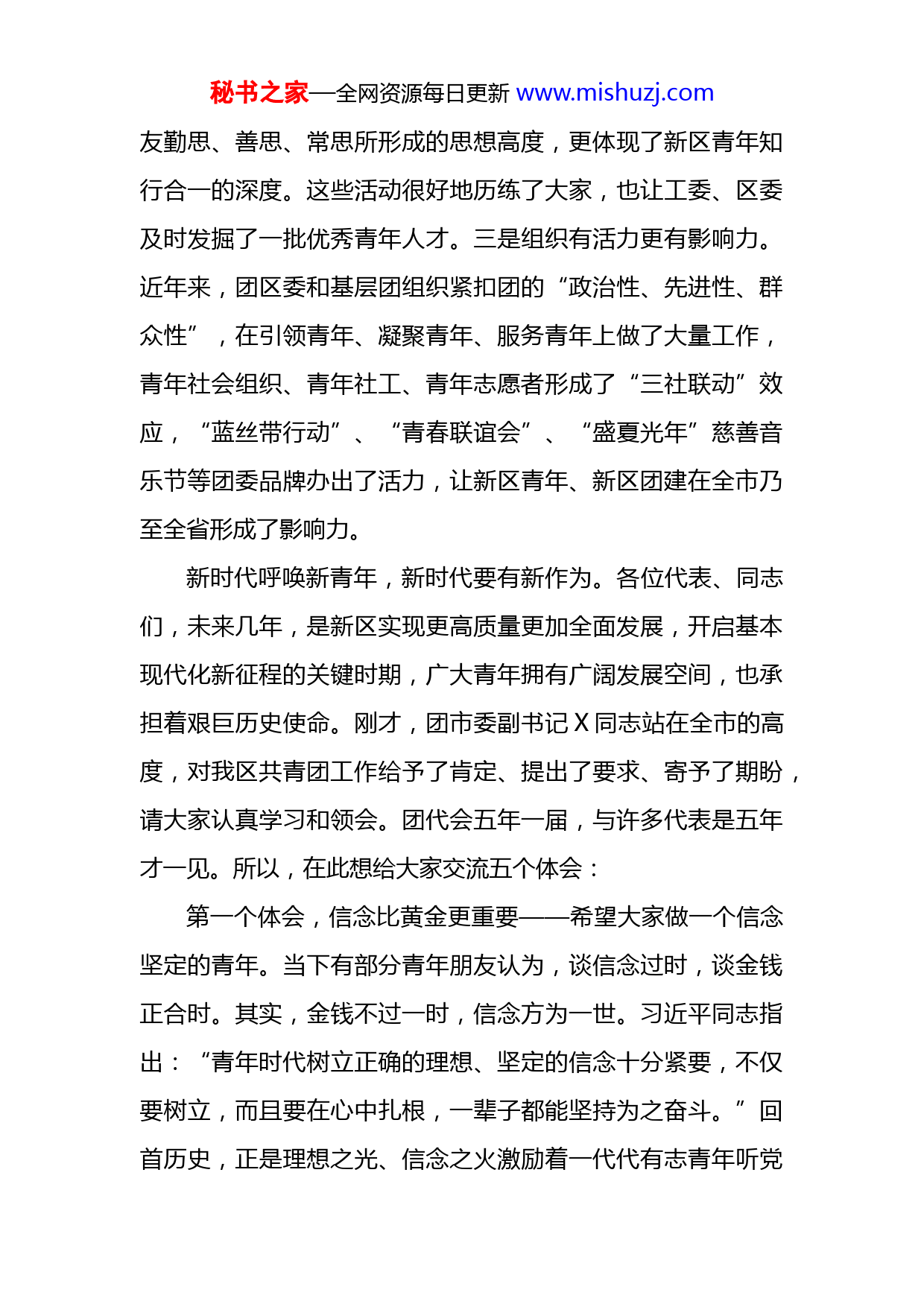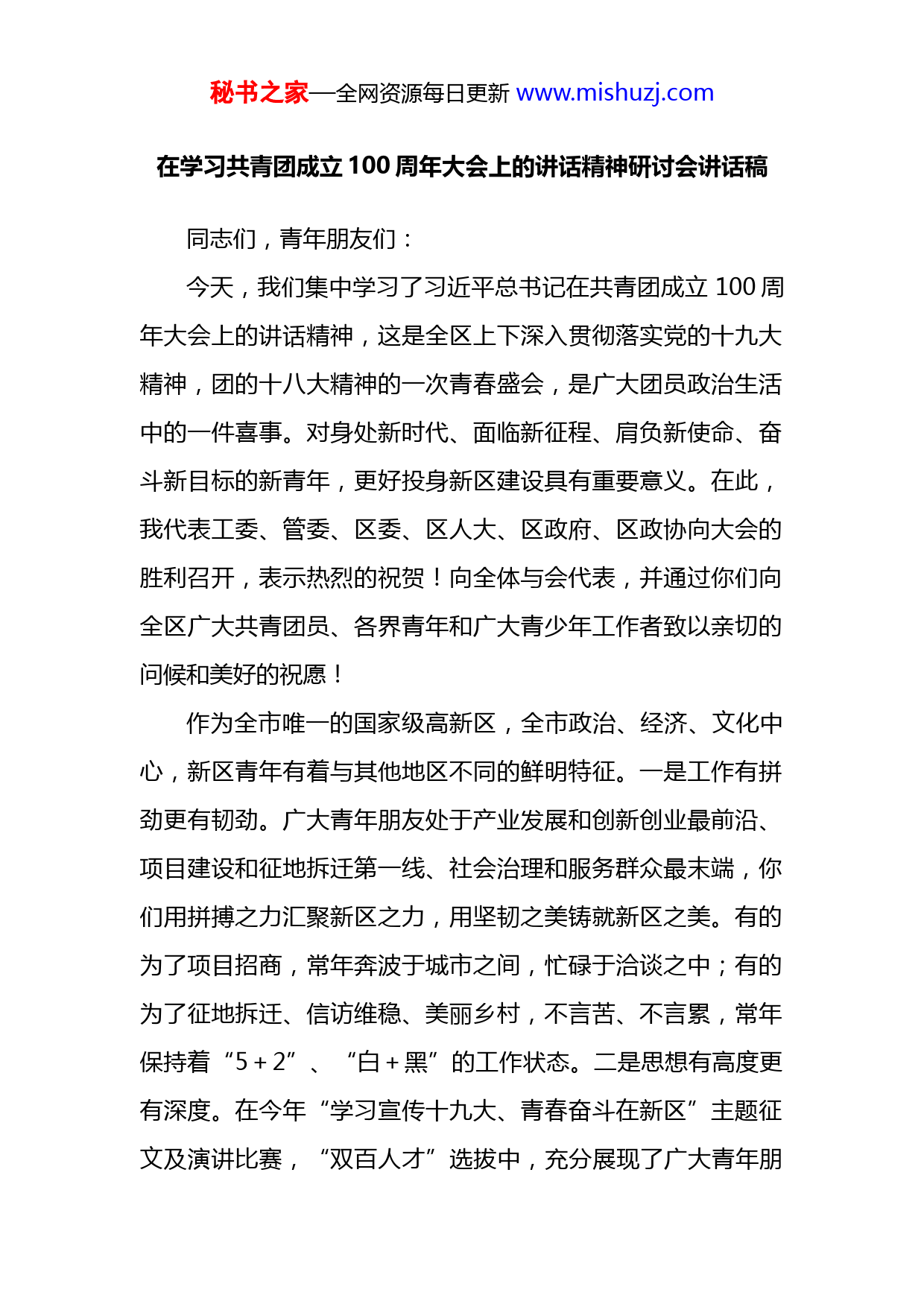 秘书之家—全网资源每日更新www.mishuzj.com在学习共青团成立100周年大会上的讲话精神研讨会讲话稿同志们,青年朋友们:今天,我们集中学习了习近平总书记在共青团成立100周年大会上的讲话精神,这是全区上下深入贯彻落实党的十九大精神,团的十八大精神的一次青春盛会,是广大团员政治生活中的一件喜事。对身处新时代、面临新征程、肩负新使命、奋斗新目标的新青年,更好投身新区建设具有重要意义。在此,我代表工委、管委、区委、区人大、区政府、区政协向大会的胜利召开,表示热烈的祝贺!向全体与会代表,并通过你们向全区广大共青团员、各界青年和广大青少年工作者致以亲切的问候和美好的祝愿!作为全市唯一的国家级高新区,全市政治、经济、文化中心,新区青年有着与其他地区不同的鲜明特征。一是工作有拼劲更有韧劲。广大青年朋友处于产业发展和创新创业最前沿、项目建设和征地拆迁第一线、社会治理和服务群众最末端,你们用拼搏之力汇聚新区之力,用坚韧之美铸就新区之美。有的为了项目招商,常年奔波于城市之间,忙碌于洽谈之中;有的为了征地拆迁、信访维稳、美丽乡村,不言苦、不言累,常年保持着“5+2”、“白+黑”的工作状态。二是思想有高度更有深度。在今年“学习宣传十九大、青春奋斗在新区”主题征文及演讲比赛,“双百人才”选拔中,充分展现了广大青年朋秘书之家—全网资源每日更新www.mishuzj.com友勤思、善思、常思所形成的思想高度,更体现了新区青年知行合一的深度。这些活动很好地历练了大家,也让工委、区委及时发掘了一批优秀青年人才。三是组织有活力更有影响力。近年来,团区委和基层团组织紧扣团的“政治性、先进性、群众性”,在引领青年、凝聚青年、服务青年上做了大量工作,青年社会组织、青年社工、青年志愿者形成了“三社联动”效应,“蓝丝带行动”、“青春联谊会”、“盛夏光年”慈善音乐节等团委品牌办出了活力,让新区青年、新区团建在全市乃至全省形成了影响力。新时代呼唤新青年,新时代要有新作为。各位代表、同志们,未来几年,是新区实现更高质量更加全面发展,开启基本现代化新征程的关键时期,广大青年拥有广阔发展空间,也承担着艰巨历史使命。刚才,团市委副书记X同志站在全市的高度,对我区共青团工作给予了肯定、提出了要求、寄予了期盼,请大家认真学习和领会。团代会五年一届,与许多代表是五年才一见。所以,在此想给大家交流五个体会:第一个体会,信念比黄金更重要——希望大家做一个信念坚定的青年。当下有部分青年朋友认为,谈信念过时,谈金钱正合时。其实,金钱不过一时,信念方为一世。习近平同志指出:“青年时代树立正确的理想、坚定的信念十分紧要,不仅要树立,而且要在心中扎根,一辈子都能坚持为之奋斗。”回首历史,正是理想之光、信念之火激励着一代代有志青年听党秘书之家—全网资源每日更新www.mishuzj.com召唤、跟党奋斗;展望未来,我们要创造新时代新的荣光,广大青年更要有坚定的理想信念。各位代表,无论你来自机关,还是企事业单位,或者基层,大家都有着共同的身份——团代表。如果一个团代表信仰上不坚定、政治上不敏锐,对党的事业缺乏忠诚,对举什么旗、走什么路,既不清醒、也没定力,还谈什么代表?即便能力再强,也难堪大任。希望广大青年特别是各位代表把讲忠诚、讲政治刻在心中、融入灵魂,切实增强“四个意识”,坚定“四个自信”,做到“两个维护”,在政治立场、政治方向、政治原则、政治道路上同以习近平同志为核心的党中央保持高度一致,不论在任何情况下都决不让青春偏离正确航向。第二个体会,干比想更重要——希望大家做一个担当作为的青年。不干,半点马克思主义也没有。想,都是问题;干,才是答案。只有干出来的精彩,没有等出来的辉煌。新区发展都是干出来的。创业之初,广大青年干部风餐露宿于征拆现场,披星戴月转于项目工地,许多青年企业家和工人省吃俭用搞研发,一心一意跑市场。一路走来,经受了多少艰难困苦?一个项目的落地、一个市场的开拓,对别人来说是欢声笑语,对大家来说是泪流满面,这种辛苦只有经历才知道。如今迈入新时代,我们也面临着诸多困难和挑战,但也作出了许多重大抉择。如面对激烈的区域竞争,我们出台了产业发展“1+7+4”政策,大力引项目、招人才。为贯彻习近平总书记民营企业家座秘书之家—全网资源每日更新www.mishuzj.com谈会讲话精神,帮助广大民营企业渡难关,第一时间制定了干货满满的《促进民营经济健康发展十条意见》。为化解企业融资难问题,正在整合资源,组建产业投资发展集团,全方位为企业提供投融资服务。企业也是如此,虽然短期内市场外部环境不乐观,但大家不为外界所扰,坚持做好自己的事,专心搞好自己的研发和市场。可以说,面临问题和机遇,大家都从不等待、不担忧,只有不顾一切地向前冲。有人讲,两种人的事业容易成功,一种是“傻子”,一种是“疯子”。“傻子”并非真傻,而是埋头苦干;“疯子”并非真疯,而是一往无前。今天,青春是用来奋斗的;将来,青春是用来回忆的。希望广大青年少想多干,少担忧多担当,甘做新区值得尊敬的“傻子”和“疯子”,永葆“初生牛犊不怕虎”的勇气和激情,在各项事业中展现新担当新作为。第三个体