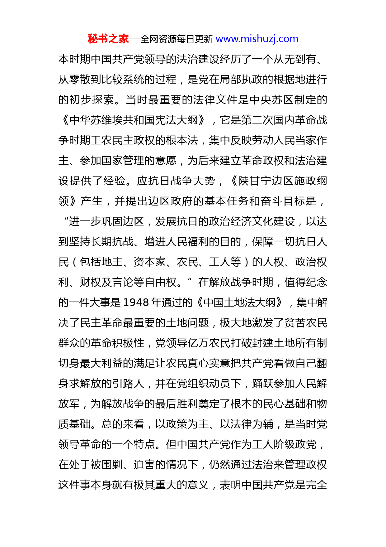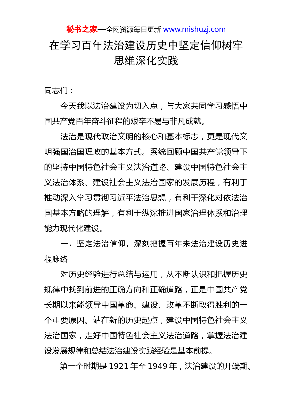 秘书之家—全网资源每日更新www.mishuzj.com在学习百年法治建设历史中坚定信仰树牢思维深化实践同志们:今天我以法治建设为切入点,与大家共同学习感悟中国共产党百年奋斗征程的艰辛不易与非凡成就。法治是现代政治文明的核心和基本标志,更是现代文明强国治国理政的基本方式。系统回顾中国共产党领导下的坚持中国特色社会主义法治道路、建设中国特色社会主义法治体系、建设社会主义法治国家的发展历程,有利于推动深入学习贯彻习近平法治思想,有利于深化对依法治国基本方略的理解,有利于纵深推进国家治理体系和治理能力现代化建设。一、坚定法治信仰,深刻把握百年来法治建设历史进程脉络对历史经验进行总结与运用,从不断认识和把握历史规律中找到前进的正确方向和正确道路,正是中国共产党长期以来能领导中国革命、建设、改革不断取得胜利的一个重要原因。站在新的历史起点,建设中国特色社会主义法治国家,走好中国特色社会主义法治道路,掌握法治建设发展规律和总结法治建设实践经验是基本前提。第一个时期是1921年至1949年,法治建设的开端期。秘书之家—全网资源每日更新www.mishuzj.com本时期中国共产党领导的法治建设经历了一个从无到有、从零散到比较系统的过程,是党在局部执政的根据地进行的初步探索。当时最重要的法律文件是中央苏区制定的《中华苏维埃共和国宪法大纲》,它是第二次国内革命战争时期工农民主政权的根本法,集中反映劳动人民当家作主、参加国家管理的意愿,为后来建立革命政权和法治建设提供了经验。应抗日战争大势,《陕甘宁边区施政纲领》产生,并提出边区政府的基本任务和奋斗目标是,“进一步巩固边区,发展抗日的政治经济文化建设,以达到坚持长期抗战、增进人民福利的目的,保障一切抗日人民(包括地主、资本家、农民、工人等)的人权、政治权利、财权及言论等自由权。”在解放战争时期,值得纪念的一件大事是1948年通过的《中国土地法大纲》,集中解决了民主革命最重要的土地问题,极大地激发了贫苦农民群众的革命积极性,党领导亿万农民打破封建土地所有制切身最大利益的满足让农民真心实意把共产党看做自己翻身求解放的引路人,并在党组织动员下,踊跃参加人民解放军,为解放战争的最后胜利奠定了根本的民心基础和物质基础。总的来看,以政策为主、以法律为辅,是当时党领导革命的一个特点。但中国共产党作为工人阶级政党,在处于被围剿、迫害的情况下,仍然通过法治来管理政权这件事本身就有极其重大的意义,表明中国共产党是完全秘书之家—全网资源每日更新www.mishuzj.com不同于旧式革命者的新型先进政党,对承担的艰巨历史使命有高度的自觉。第二个时期是1949年至1978年,法治建设的奠基期。这是我国社会主义法治建设取得重要成就而又遭受挫折的时期。新中国的成立实现了民族独立和人民解放,在全国范围内建立了巩固的政权,在这样的背景下,法制建设选择了一条与中国历史上的各种法制彻底决裂、全新地构造中国社会主义法治的道路。首先,制定了《中国人民政治协商会议共同纲领》,宣布废除国民党的《六法全书》,制定保护人民的法律、法令,建立人民司法制度,以临时宪法的形式奠定了新政权的宪制基础和框架。其次,以立法的形式固定了根据地与解放区社会改造的核心实践,具有代表性的成就为1950年通过的《中华人民共和国婚姻法》《中华人民共和国土地改革法》和《惩治贪污条例》前者是人的解放,后者是土地的解放,最后者是公权力的约束。最后,逐步建立以《宪法》为核心的人民民主专政的法律制度,仅1949年到1957年,中央颁布的法律法规共有九百多部。但随着1956年苏共二十大的发酵,匈牙利事件的冲击以及整风运动的变化,中共八大确立的建设社会主义法制的思想被否定了,大踏步进入社会主义建设阶段的新中国又被拉回到了革命语境中,在不断革命论之下群众运动全面取代了法制。在十年“文革”期间,司法机秘书之家—全网资源每日更新www.mishuzj.com构受到严重破坏,全国人民代表大会没有开过一次会议,没有制定过一部法律。第三个阶段是1978年至2014年,法治建设的发展期。这是中国共产党确立依法治国方略、社会主义法治建设取得重要进展的时期,全党全国人民对社会主义法治的认识日益深刻并形成共识。十一届三中全会以来,党中央把发展社会主义民主、健全社会主义法治提到前所未有的高度并将之作为中国共产党在新时期社会主义现代化建设的基本方针和重要目标任务。至此,新时期法制建设走上快车道。1978年3月宪法恢复人民检察院,1978年5月正式成立最高人民检察院,1979年9月决定设立司法部,1982年制定了新宪法,相继通过了包括刑法、刑事诉讼法、民事诉讼法(试行)、新婚姻法在内的一批基本法律,涉及各个领域。其后,1997年党的十五大提出要“进一步扩大社会主义民主,健全社会主义法制,依法治国,建设社会主义法治国家”,把依法治国做为党领导人民治理国家的基本方略。1999年3月,九届全国人大二次会议通过的宪法修正案,将“依法治国,建设社会主义法治国家”载入宪法,使之上升为一项宪法原则。标志着党在治国理政方式上实现了由过去主要依靠政策、依靠行政手段,转向主要依靠法律手段的根本转变;标志着我