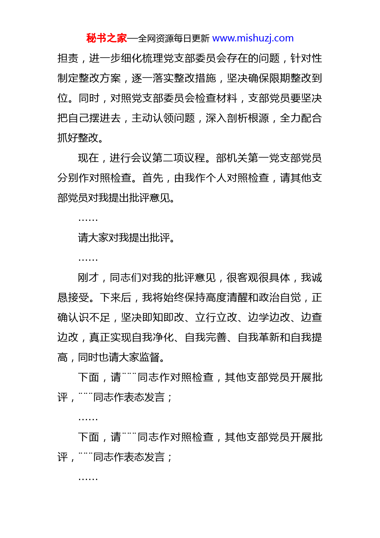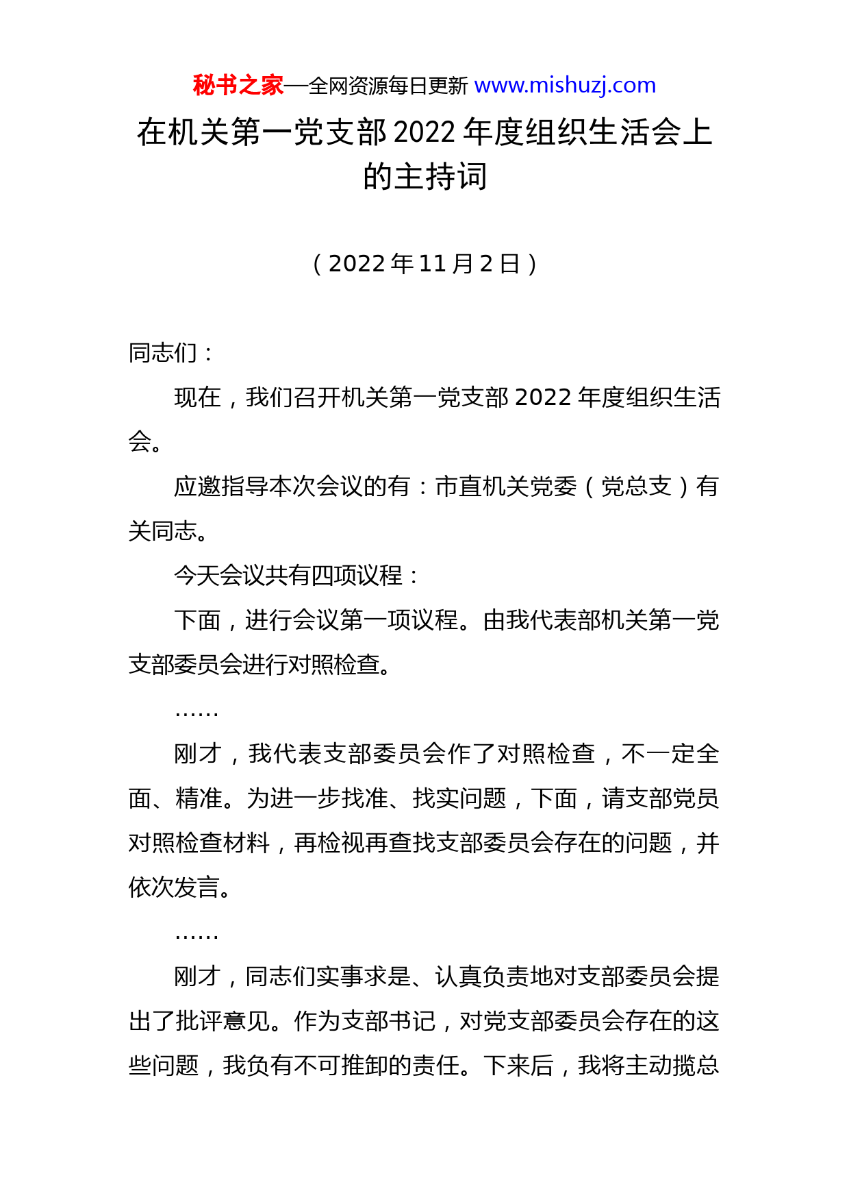 秘书之家—全网资源每日更新www.mishuzj.com在机关第一党支部2022年度组织生活会上的主持词(2022年11月2日)同志们:现在,我们召开机关第一党支部2022年度组织生活会。应邀指导本次会议的有:市直机关党委(党总支)有关同志。今天会议共有四项议程:下面,进行会议第一项议程。由我代表部机关第一党支部委员会进行对照检查。……刚才,我代表支部委员会作了对照检查,不一定全面、精准。为进一步找准、找实问题,下面,请支部党员对照检查材料,再检视再查找支部委员会存在的问题,并依次发言。……刚才,同志们实事求是、认真负责地对支部委员会提出了批评意见。作为支部书记,对党支部委员会存在的这些问题,我负有不可推卸的责任。下来后,我将主动揽总秘书之家—全网资源每日更新www.mishuzj.com担责,进一步细化梳理党支部委员会存在的问题,针对性制定整改方案,逐一落实整改措施,坚决确保限期整改到位。同时,对照党支部委员会检查材料,支部党员要坚决把自己摆进去,主动认领问题,深入剖析根源,全力配合抓好整改。现在,进行会议第二项议程。部机关第一党支部党员分别作对照检查。首先,由我作个人对照检查,请其他支部党员对我提出批评意见。……请大家对我提出批评。……刚才,同志们对我的批评意见,很客观很具体,我诚恳接受。下来后,我将始终保持高度清醒和政治自觉,正确认识不足,坚决即知即改、立行立改、边学边改、边查边改,真正实现自我净化、自我完善、自我革新和自我提高,同时也请大家监督。下面,请¨¨¨同志作对照检查,其他支部党员开展批评,¨¨¨同志作表态发言;……下面,请¨¨¨同志作对照检查,其他支部党员开展批评,¨¨¨同志作表态发言;……秘书之家—全网资源每日更新www.mishuzj.com现在,进行会议第三项议程。请市直机关党委(党总支)到会同志作点评。……现在,进行会议第四项议程。开展民主评议。请¨¨¨同志发一下民主测评表。大家将拿到两张测评表,一张是对党支部工作的测评表,一张是对党员的民主测评表。请大家实事求是地在相应栏目划勾,在勾党员民主测评表时要请注意,其中“优秀”评议意见不超过党支部党员人数的三分之一。……同志们,本次组织生活会各项议程进行完毕。今天的会议很成功,大家在批评与自我批评的同时,亮明了整改态度,明确了下一步努力方向和整改措施,体现了全面整改、彻底整改的决心,起到了“红脸出汗”的作用,增强了党内政治生活的政治性、时代性、原则性和战斗性,达到了统一思想、提升境界、团结鼓劲、凝心聚力的效果。希望大家严格按照市委的部署要求,以此次组织生活会为契机,提高政治站位,强化整改落实,确保党中央、省委、市委各项决策部署在组织系统不折不扣得到贯彻落实。下面,我再讲几点意见:一是进一步强化理论学习。大家要始终坚持把学习党的创新理论作为终身必修课,坚持学原文、读原著、悟原秘书之家—全网资源每日更新www.mishuzj.com理,在学深悟透中加强理论修养,在融会贯通中强化系统把握,不断提高政治判断力、政治领悟力、政治执行力,推动学习贯彻习近平新时代中国特色社会主义思想走深、走实,做“两个确立”的坚决拥护者和“两个维护”的坚定践行者,以史为鉴、开创未来,埋头苦干、勇毅前行,为全面建设社会主义现代化广安、迎接党的大会和省委第十二次党代会召开贡献力量。二是进一步强化作风建设。大家要时刻自重自省自警自励,做到慎独慎初慎微慎友,带头执行中央八项规定及其实施细则精神,严格遵守各项党纪党规,常修从政之德,常怀律己之心,常思贪欲之害,常戒非分之想。始终敬畏权力、敬畏组织、敬畏纪律,力戒官僚主义、形式主义,清白做人、干净做事,自觉防微杜渐、主动接受监督,以清廉作风带动党风政风民风,巩固组织系统风清气正的良好政治生态。三是进一步强化担当作为。2022年是党的大会和省十二次党代会召开之年,是实施“十四五”规划的关键之年,是落实市第六次党代会部署的开局之年。要坚持围绕“政治引领、标准提升、基础规范”工作思路,各尽其职、各负其责,牢固树立“昼无为、夜难寐”的责任感,自觉挑最重的担子、啃最硬的骨头,以强大的斗争精神、不懈的奋斗姿态推动组织工作高质量发展,为加快建成川秘书之家—全网资源每日更新www.mishuzj.com渝合作示范区、全面建设社会主义现代化广安提供坚强组织保证。今天的会议到此结束!