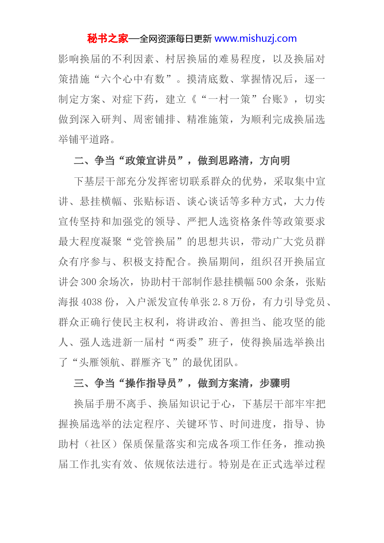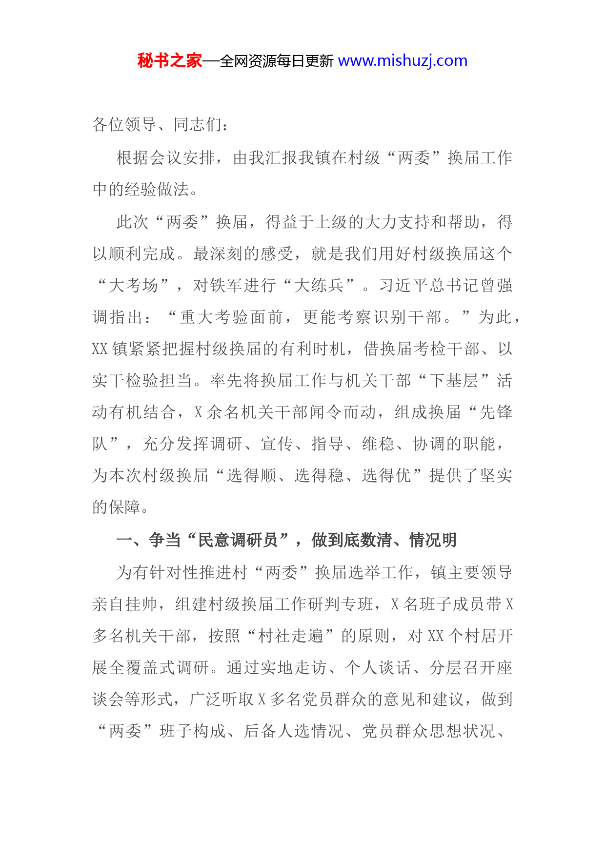 秘书之家—全网资源每日更新www.mishuzj.com各位领导、同志们:根据会议安排,由我汇报我镇在村级“两委”换届工作中的经验做法。此次“两委”换届,得益于上级的大力支持和帮助,得以顺利完成。最深刻的感受,就是我们用好村级换届这个“大考场”,对铁军进行“大练兵”。习近平总书记曾强调指出:“重大考验面前,更能考察识别干部。”为此,XX镇紧紧把握村级换届的有利时机,借换届考检干部、以实干检验担当。率先将换届工作与机关干部“下基层”活动有机结合,X余名机关干部闻令而动,组成换届“先锋队”,充分发挥调研、宣传、指导、维稳、协调的职能,为本次村级换届“选得顺、选得稳、选得优”提供了坚实的保障。一、争当“民意调研员”,做到底数清、情况明为有针对性推进村“两委”换届选举工作,镇主要领导亲自挂帅,组建村级换届工作研判专班,X名班子成员带X多名机关干部,按照“村社走遍”的原则,对XX个村居开展全覆盖式调研。通过实地走访、个人谈话、分层召开座谈会等形式,广泛听取X多名党员群众的意见和建议,做到“两委”班子构成、后备人选情况、党员群众思想状况、秘书之家—全网资源每日更新www.mishuzj.com影响换届的不利因素、村居换届的难易程度,以及换届对策措施“六个心中有数”。摸清底数、掌握情况后,逐一制定方案、对症下药,建立《“一村一策”台账》,切实做到深入研判、周密铺排、精准施策,为顺利完成换届选举铺平道路。二、争当“政策宣讲员”,做到思路清,方向明下基层干部充分发挥密切联系群众的优势,采取集中宣讲、悬挂横幅、张贴标语、谈心谈话等多种方式,大力传宣传坚持和加强党的领导、严把人选资格条件等政策要求最大程度凝聚“党管换届”的思想共识,带动广大党员群众有序参与、积极支持配合。换届期间,组织召开换届宣讲会300余场次,协助村干部制作悬挂横幅500余条,张贴海报4038份,入户派发宣传单张2.8万份,有力引导党员、群众正确行使民主权利,将讲政治、善担当、能攻坚的能人、强人选进新一届村“两委”班子,使得换届选举换出了“头雁领航、群雁齐飞”的最优团队。三、争当“操作指导员”,做到方案清,步骤明换届手册不离手、换届知识记于心,下基层干部牢牢把握换届选举的法定程序、关键环节、时间进度,指导、协助村(社区)保质保量落实和完成各项工作任务,推动换届工作扎实有效、依规依法进行。特别是在正式选举过程秘书之家—全网资源每日更新www.mishuzj.com中叫响“看我的、跟我上”,积极利用自身“本土优势”配合村居做好党员通知、选民登记等工作,广泛动员有条件的人员回乡投票,有力保证参选率和投票率;深入做好村居发展蓝图宣传,组织建议人选推介,让党员群众尽快熟悉候选人,及早争取人气和口碑,助力组织意图人选顺利当选;协调组织村(居)民按时参加投票,协助维持好换届现场秩序,保证换届选举工作依规、顺利、高效开展。四、争当“维稳安保员”,做到难点清,规矩明坚持“矛盾早发现、问题早解决、思想早引导”的原则,用心用情用腿走好群众路线,选派474人次机关干部深入了解难点村、重点村存在的矛盾问题和潜在隐患,全面排查可能影响换届选举的矛盾纠纷和倾向性、苗头性问题。对排查出来的重点村、难点村,逐一拉单列表,协调区、镇有关部门,抓好整顿治理。鲜明采取“打扶并举”战术,按照“一村一策”要求,通过调解纠纷、安抚解释、谈心谈话等有针对性的措施,从源头上减少矛盾、缓解矛盾、解决矛盾,使得整个换届过程平稳有序、风清气正。五、争当“接力协调员”,做到责任清,任务明为使新一届村“两委”成员尽快进入角色,下基层干部主动履行职责、承担任务,积极协助抓落实、抓培训、抓思想、抓储备,不断巩固换届选举工作成果。特别是协助秘书之家—全网资源每日更新www.mishuzj.com镇党委抓好新老班子交接工作,完成公章、帐簿、债权、债务和其它集体财产的交接手续,确保新一届班子正常运作。同时,对落选干部及时安慰稳定情绪,减少新当选村“两委”班子阻力;对部分未能当选的素质较好、能力较强,并在群众中有一定影响力的人才,协助该村将其纳入后备干部队伍进行重点培养,建立素质优良、数量充足、结构合理的村级后备干部储备库。在村级换届这个“大考场”中,XX“铁军”身先士卒、心无旁骛、不辱使命,考出了忠诚、考出了本领、考出了干劲,有力地推动了全镇村(社区)“两委”换届选举工作圆满完成。最伟大的力量是同心合力,在接下来的各类“新考场”中,XX镇将秉持和发扬这份“铁军”精神,凝聚各级干部的智慧和担当,不断奋勇前行,夺取新的胜利!