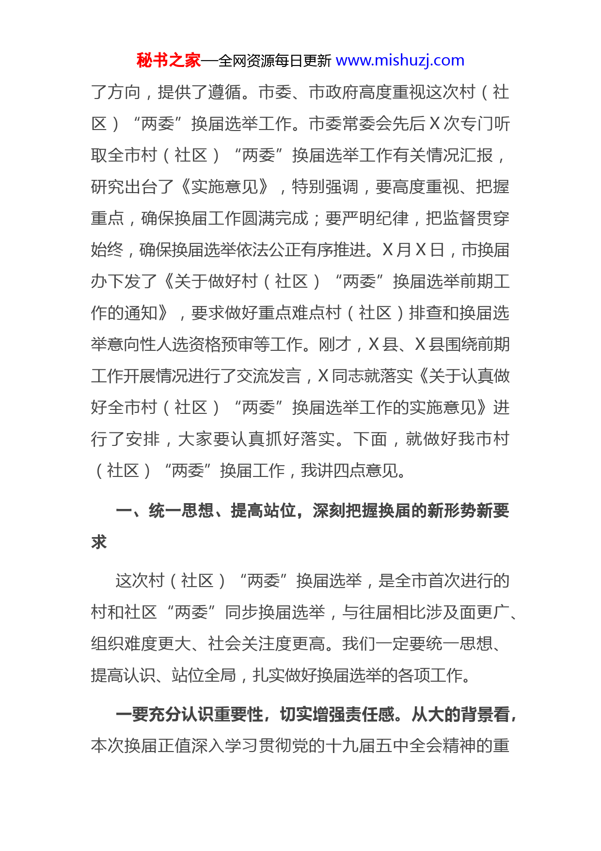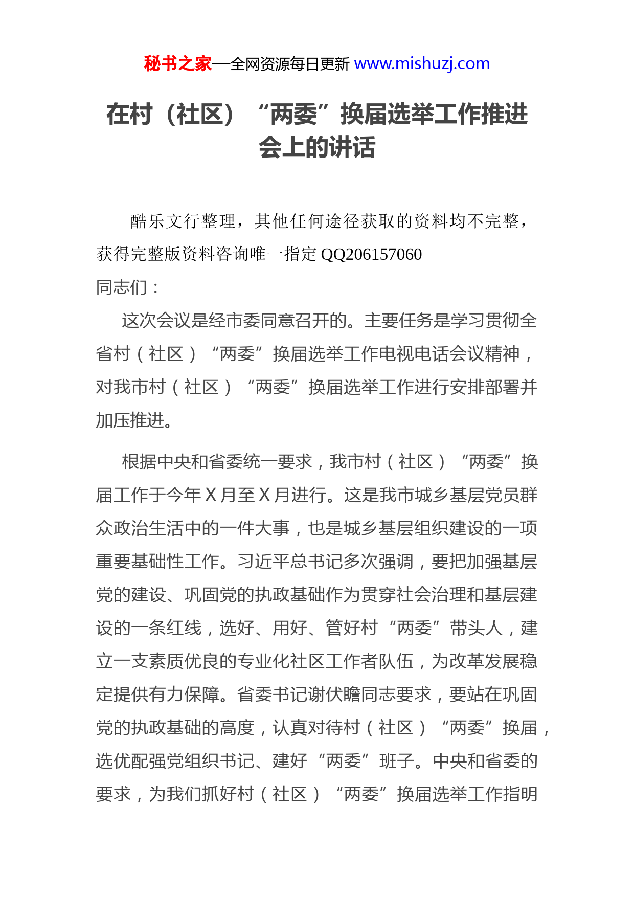 秘书之家—全网资源每日更新www.mishuzj.com在村(社区)“两委”换届选举工作推进会上的讲话酷乐文行整理,其他任何途径获取的资料均不完整,获得完整版资料咨询唯一指定QQ206157060同志们:这次会议是经市委同意召开的。主要任务是学习贯彻全省村(社区)“两委”换届选举工作电视电话会议精神,对我市村(社区)“两委”换届选举工作进行安排部署并加压推进。根据中央和省委统一要求,我市村(社区)“两委”换届工作于今年X月至X月进行。这是我市城乡基层党员群众政治生活中的一件大事,也是城乡基层组织建设的一项重要基础性工作。习近平总书记多次强调,要把加强基层党的建设、巩固党的执政基础作为贯穿社会治理和基层建设的一条红线,选好、用好、管好村“两委”带头人,建立一支素质优良的专业化社区工作者队伍,为改革发展稳定提供有力保障。省委书记谢伏瞻同志要求,要站在巩固党的执政基础的高度,认真对待村(社区)“两委”换届,选优配强党组织书记、建好“两委”班子。中央和省委的要求,为我们抓好村(社区)“两委”换届选举工作指明秘书之家—全网资源每日更新www.mishuzj.com了方向,提供了遵循。市委、市政府高度重视这次村(社区)“两委”换届选举工作。市委常委会先后X次专门听取全市村(社区)“两委”换届选举工作有关情况汇报,研究出台了《实施意见》,特别强调,要高度重视、把握重点,确保换届工作圆满完成;要严明纪律,把监督贯穿始终,确保换届选举依法公正有序推进。X月X日,市换届办下发了《关于做好村(社区)“两委”换届选举前期工作的通知》,要求做好重点难点村(社区)排查和换届选举意向性人选资格预审等工作。刚才,X县、X县围绕前期工作开展情况进行了交流发言,X同志就落实《关于认真做好全市村(社区)“两委”换届选举工作的实施意见》进行了安排,大家要认真抓好落实。下面,就做好我市村(社区)“两委”换届工作,我讲四点意见。一、统一思想、提高站位,深刻把握换届的新形势新要求这次村(社区)“两委”换届选举,是全市首次进行的村和社区“两委”同步换届选举,与往届相比涉及面更广、组织难度更大、社会关注度更高。我们一定要统一思想、提高认识、站位全局,扎实做好换届选举的各项工作。一要充分认识重要性,切实增强责任感。从大的背景看,本次换届正值深入学习贯彻党的十九届五中全会精神的重秘书之家—全网资源每日更新www.mishuzj.com要阶段。党的十九届五中全会描绘了二〇三五年远景目标广大党员群众人心振奋,备受鼓舞,对未来充满期望,也寄予厚望,更希望新时代有新进步、新变化。对于广大党员群众来讲,村(社区)“两委”换届选举是他们直接面对的第一件大事,能否搞好村(社区)“两委”换届,能否选优配强“两委”班子,深刻回应着广大党员群众的新期盼,直接影响着党在农村和社区的执政基础,对于进一步巩固深化“不忘初心、牢记使命”主题教育成果、推动党的十九届五中全会精神在X落地生根、推进全面从严治党向基层延伸有着极为重要的意义。从发展形势看,本次换届处于我市走好“一小步、两大步”、决胜全面小康、开启现代化建设新征程的关键时期。而我市城乡二元化结构突出的问题仍然存在,城市发展好于农村发展,短板仍在农村。乡村振兴战略、打赢脱贫攻坚战等与农村息息相关的一系列重大部署,都需要农村党员群众一一落实。推动乡村组织振兴,需要打造千千万万个坚强的农村基层党组织,培养千千万万名优秀的农村基层党组织书记,深化村民自治实践,发展农民合作经济组织,建立健全党委领导、政府负责、社会协同、公众参与、法治保障的现代乡村社会治理体制。因此,能否通过此次换届把党性强、有思路、能担当、群众公认的优秀人才选出来,建强村级组织,直接影响着我市农村今后一个时期的改革发展稳定大秘书之家—全网资源每日更新www.mishuzj.com局。从目标任务看,基层治理是国家治理体系的关键一环,加强和创新社会治理,重点在基层,难点在基层,关键在基层。落实好基层改革各项任务,推动基层社会治理自治法治德治“三治并重”,要靠换届选出的新班子来组织实施。做好这次换届工作,是在党的坚强领导下推进基层治理法治化的重要实践。二要准确把握特殊性,切实增强使命感。村(社区)换届虽然是常规性工作,但这次换届与以往相比,面临许多特殊的情况。这次换届,恰逢全国“两会”胜利闭幕,对贯彻落实党的十九届历次全会关于乡村振兴战略部署和举措有着十分重要的意义。同时进行的工作还有我市人大、政府、政协换届,多项重要工作同步交叉进行,在工作摆布、时间安排、力量调配等方面,更需要统筹谋划、协同推进。这次换届,涵盖全市X个村(社区),加之村委会、居委会换届政策有别、要求不同,还要结合X专项斗争,工作量大,任务艰巨,要求业务指导更加详细具体到位。这次换届,是在中央和省委巡视双重叠加下进行的,一些有矛盾纠纷隐患的村(社区)党员干部群众思想极易产生波动,稍有不慎,就会对全市乃至全省工作大局产生负面影响。秘书之家—全网资源每日更新www.mishuzj.com三要高度重视复杂性,切实增强紧迫感。从选情判断看,本次换届面临许多新挑战,形势更加复杂,任务更加艰巨选举竞争将更为激烈。随着我市加强“两
