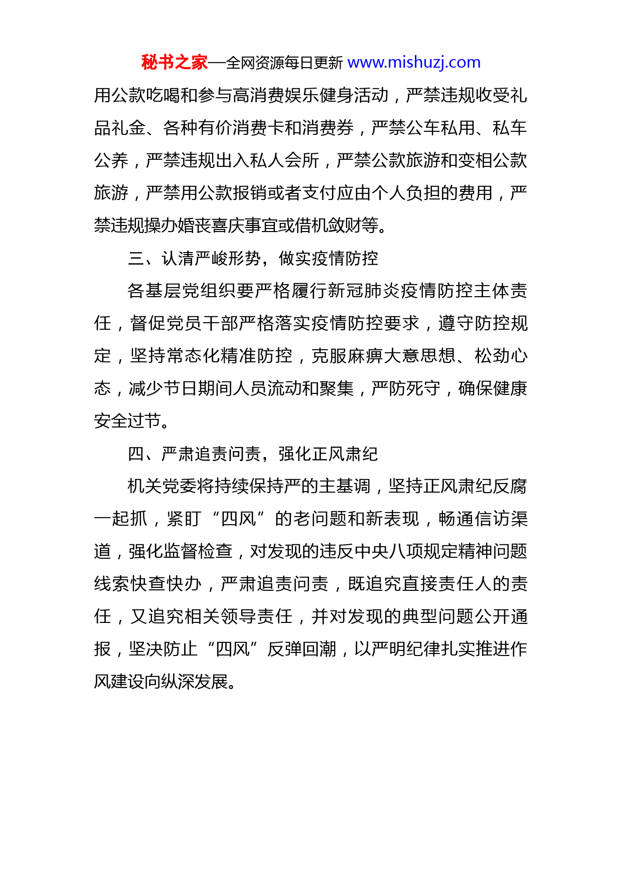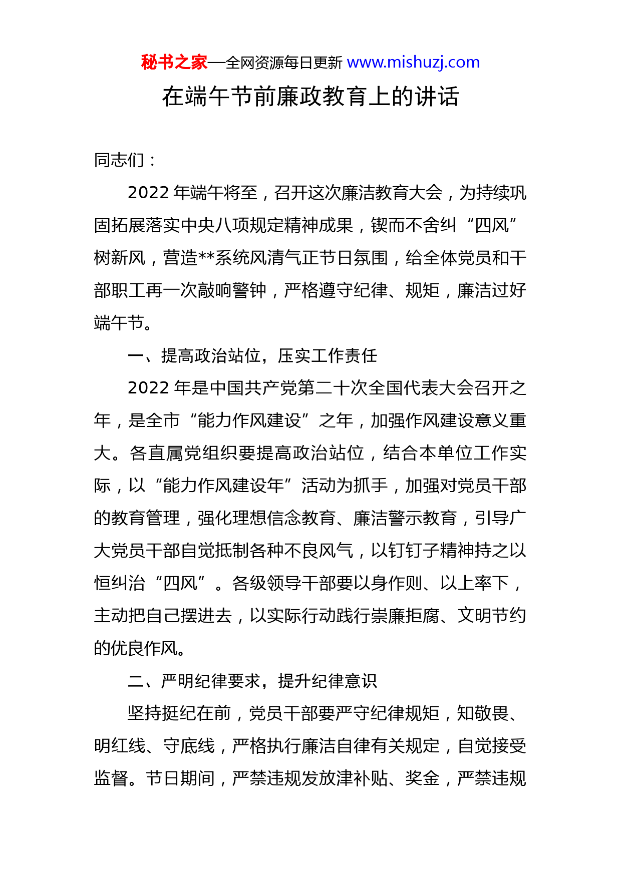 秘书之家—全网资源每日更新www.mishuzj.com在端午节前廉政教育上的讲话同志们:2022年端午将至,召开这次廉洁教育大会,为持续巩固拓展落实中央八项规定精神成果,锲而不舍纠“四风”树新风,营造系统风清气正节日氛围,给全体党员和干部职工再一次敲响警钟,严格遵守纪律、规矩,廉洁过好端午节。一、提高政治站位,压实工作责任2022年是中国共产党第二十次全国代表大会召开之年,是全市“能力作风建设”之年,加强作风建设意义重大。各直属党组织要提高政治站位,结合本单位工作实际,以“能力作风建设年”活动为抓手,加强对党员干部的教育管理,强化理想信念教育、廉洁警示教育,引导广大党员干部自觉抵制各种不良风气,以钉钉子精神持之以恒纠治“四风”。各级领导干部要以身作则、以上率下,主动把自己摆进去,以实际行动践行崇廉拒腐、文明节约的优良作风。二、严明纪律要求,提升纪律意识坚持挺纪在前,党员干部要严守纪律规矩,知敬畏、明红线、守底线,严格执行廉洁自律有关规定,自觉接受监督。节日期间,严禁违规发放津补贴、奖金,严禁违规秘书之家—全网资源每日更新www.mishuzj.com用公款吃喝和参与高消费娱乐健身活动,严禁违规收受礼品礼金、各种有价消费卡和消费券,严禁公车私用、私车公养,严禁违规出入私人会所,严禁公款旅游和变相公款旅游,严禁用公款报销或者支付应由个人负担的费用,严禁违规操办婚丧喜庆事宜或借机敛财等。三、认清严峻形势,做实疫情防控各基层党组织要严格履行新冠肺炎疫情防控主体责任,督促党员干部严格落实疫情防控要求,遵守防控规定,坚持常态化精准防控,克服麻痹大意思想、松劲心态,减少节日期间人员流动和聚集,严防死守,确保健康安全过节。四、严肃追责问责,强化正风肃纪机关党委将持续保持严的主基调,坚持正风肃纪反腐一起抓,紧盯“四风”的老问题和新表现,畅通信访渠道,强化监督检查,对发现的违反中央八项规定精神问题线索快查快办,严肃追责问责,既追究直接责任人的责任,又追究相关领导责任,并对发现的典型问题公开通报,坚决防止“四风”反弹回潮,以严明纪律扎实推进作风建设向纵深发展。