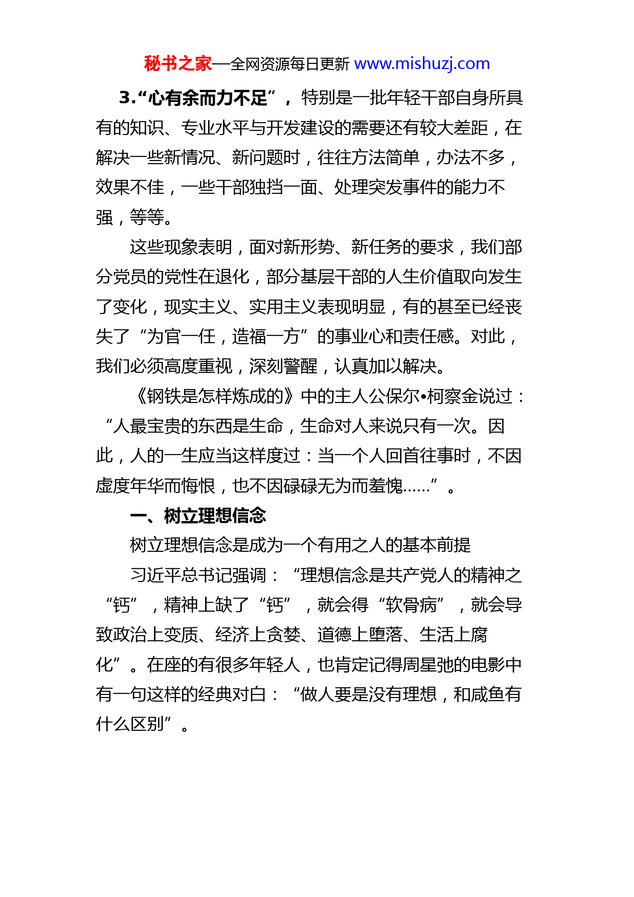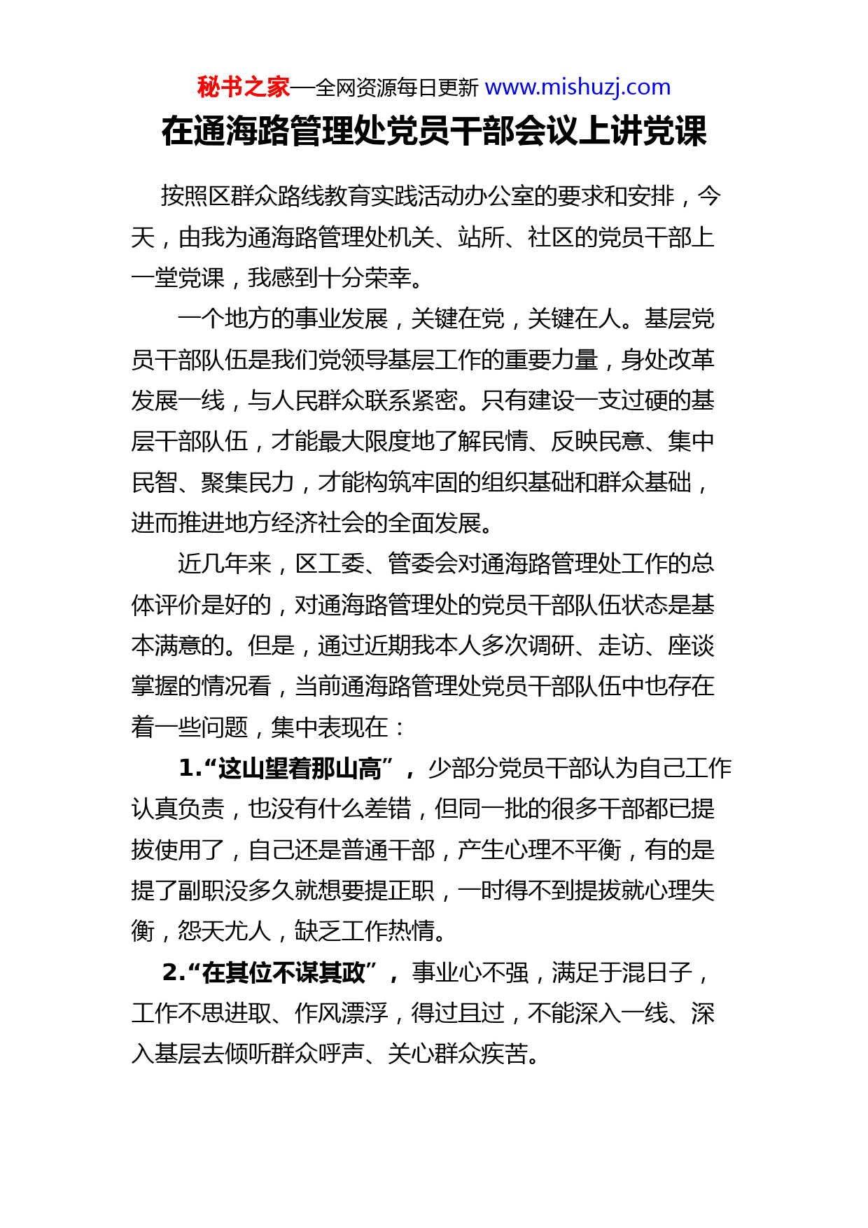 秘书之家—全网资源每日更新www.mishuzj.com在通海路管理处党员干部会议上讲党课按照区群众路线教育实践活动办公室的要求和安排,今天,由我为通海路管理处机关、站所、社区的党员干部上一堂党课,我感到十分荣幸。一个地方的事业发展,关键在党,关键在人。基层党员干部队伍是我们党领导基层工作的重要力量,身处改革发展一线,与人民群众联系紧密。只有建设一支过硬的基层干部队伍,才能最大限度地了解民情、反映民意、集中民智、聚集民力,才能构筑牢固的组织基础和群众基础,进而推进地方经济社会的全面发展。近几年来,区工委、管委会对通海路管理处工作的总体评价是好的,对通海路管理处的党员干部队伍状态是基本满意的。但是,通过近期我本人多次调研、走访、座谈掌握的情况看,当前通海路管理处党员干部队伍中也存在着一些问题,集中表现在:1.“这山望着那山高”,少部分党员干部认为自己工作认真负责,也没有什么差错,但同一批的很多干部都已提拔使用了,自己还是普通干部,产生心理不平衡,有的是提了副职没多久就想要提正职,一时得不到提拔就心理失衡,怨天尤人,缺乏工作热情。2.“在其位不谋其政”,事业心不强,满足于混日子,工作不思进取、作风漂浮,得过且过,不能深入一线、深入基层去倾听群众呼声、关心群众疾苦。秘书之家—全网资源每日更新www.mishuzj.com3.“心有余而力不足”,特别是一批年轻干部自身所具有的知识、专业水平与开发建设的需要还有较大差距,在解决一些新情况、新问题时,往往方法简单,办法不多,效果不佳,一些干部独挡一面、处理突发事件的能力不强,等等。这些现象表明,面对新形势、新任务的要求,我们部分党员的党性在退化,部分基层干部的人生价值取向发生了变化,现实主义、实用主义表现明显,有的甚至已经丧失了“为官一任,造福一方”的事业心和责任感。对此,我们必须高度重视,深刻警醒,认真加以解决。《钢铁是怎样炼成的》中的主人公保尔•柯察金说过:“人最宝贵的东西是生命,生命对人来说只有一次。因此,人的一生应当这样度过:当一个人回首往事时,不因虚度年华而悔恨,也不因碌碌无为而羞愧……”。一、树立理想信念树立理想信念是成为一个有用之人的基本前提习近平总书记强调:“理想信念是共产党人的精神之“钙”,精神上缺了“钙”,就会得“软骨病”,就会导致政治上变质、经济上贪婪、道德上堕落、生活上腐化”。在座的有很多年轻人,也肯定记得周星弛的电影中有一句这样的经典对白:“做人要是没有理想,和咸鱼有什么区别”。秘书之家—全网资源每日更新www.mishuzj.com人活着总是要有一点思想的,信仰上总要有一个支柱才能活得更坚定、更勇敢、更顽强;人要有意义地活着,就应该为某种有意义的东西而坚守。究竟怎样做人,做一个什么样的人,对这个问题分析得最透彻、最深刻、最全面的还是毛泽东同志。他在《纪念白求恩》一文中旗帜鲜明地提出了我们共产党人的做人主张。做人,要做一个高尚的人。所谓“高尚的人”,就是有崇高的理想、坚定的信念和高尚情操的人。对于一名党员来说,加入党组织,献身共产主义事业,更好地为人民服务,在让他人更幸福中实现自身价值,既是一种政治信念的体现,更是彰显自身价值和能力的机遇。对于一名普通公职人员来说,只有把远大理想和现实岗位相结合,组织需求与个体追求相统一,服务社会,奉献人民,甘作人民的孺子牛,才能使自己的世界观、人生观、价值观得以升华。正是秉持这样的人生理想和崇高信念,焦裕禄、孔繁森、郑培民等模范人物才为人民服务不言苦,为党的事业献身不遗憾。做人,要做一个纯粹的人。就是彻底地摆脱了动物本性,能够把自己的欲望限制在合理的范围内的人,做到立党为公,执政为民。要以德载物,用心做事,坚忍不拔,自强不息,干净干事,在平凡中创造自己的奇迹,在平凡中保持共产党人的高风亮节,在平凡中做到一生不悔。正如著名诗人藏克家在《有的人》中所写:“有的人活着,秘书之家—全网资源每日更新www.mishuzj.com他已经死了;有的人死了,他还活着。……他活着为了多数人更好活的人,群众把他抬举地很高,很高。”当一个人帮助他人、奉献社会的时候,他是快乐的,幸福的,有成就感的。做人,要做一个有道德的人。就是要注重道德修养,以为人民服务为核心,以集体主义为原则,以诚实守信为重点,自觉地遵守以社会公道、职业道德、家庭美德为主要内容的公民道德。做到见义勇为,助人为乐、敬老爱幼、爱国守法、明礼诚信、团结友善、勤俭自强、敬业奉献。做人,要做一个脱离了低级趣味的人。就是光明磊落、公道正派、落落大方、襟怀坦荡。“不饮盗泉之水,不食嗟来之食”的人。正确处理国家、社会、集体利益与个人利益的关系,公与私的关系。如果将人按处理公与私问题的不同态度划分成六种:即:“大公无私为圣人,公而忘私为贤人,先公后私为好人,有公有私为常人,先私后公为小人,损公肥私为罪人。”按照这种划分,我们各级党员领导干部都应该是“圣人”或“贤人”。如果认为这样的要求太高并很难做到的话,起码也应做一个先公后私的“好人”,总不能去做那种先私后公的“小人”,更不能去做那种损公肥私的“罪人”。做人,更要做一个有益于人民的人。就是要