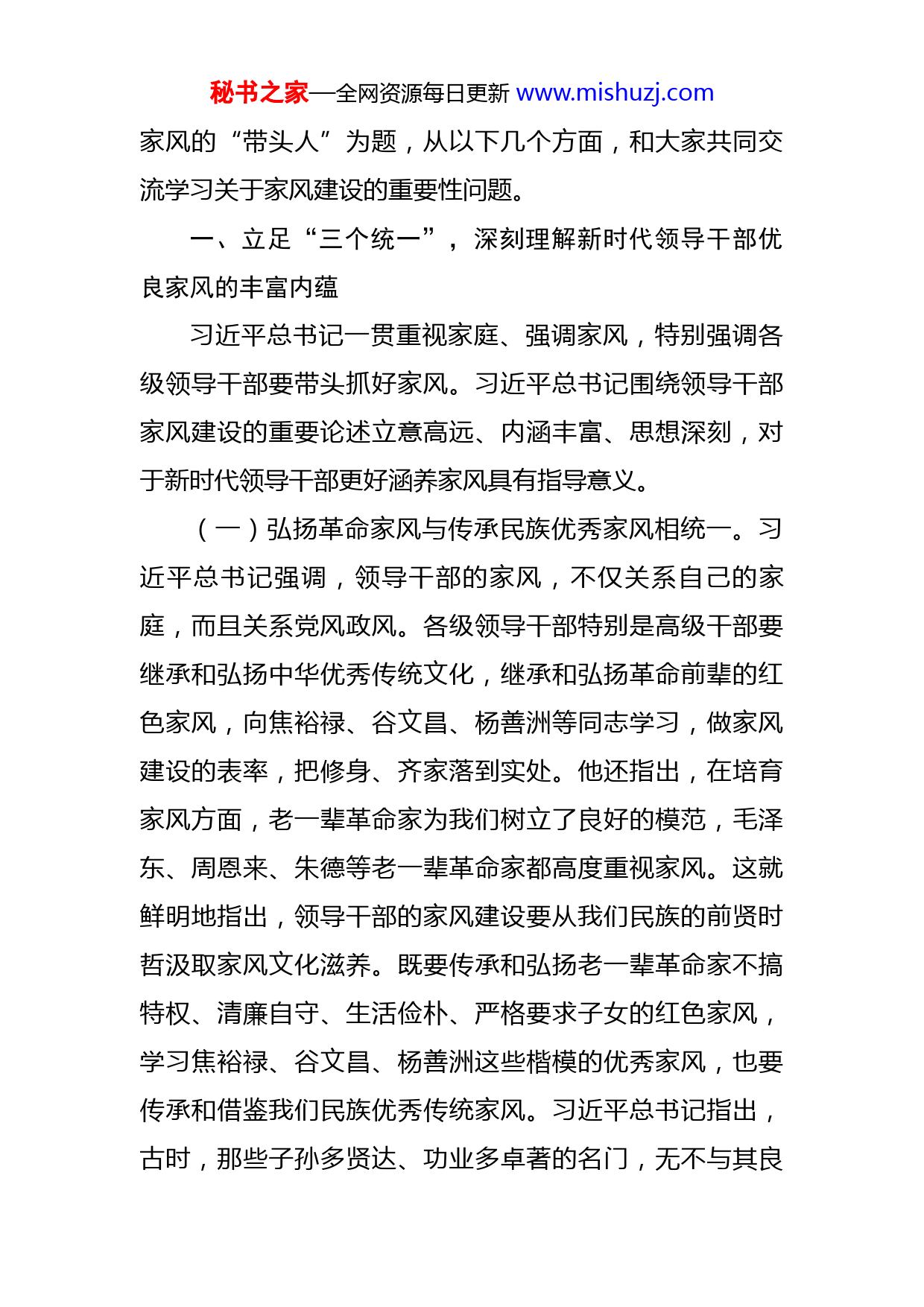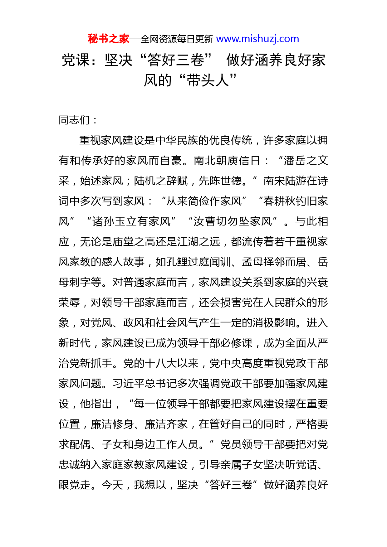 秘书之家—全网资源每日更新www.mishuzj.com党课:坚决“答好三卷”做好涵养良好家风的“带头人”同志们:重视家风建设是中华民族的优良传统,许多家庭以拥有和传承好的家风而自豪。南北朝庾信日:“潘岳之文采,始述家风;陆机之辞赋,先陈世德。”南宋陆游在诗词中多次写到家风:“从来简俭作家风”“春耕秋钓旧家风”“诸孙玉立有家风”“汝曹切勿坠家风”。与此相应,无论是庙堂之高还是江湖之远,都流传着若干重视家风家教的感人故事,如孔鲤过庭闻训、孟母择邻而居、岳母刺字等。对普通家庭而言,家风建设关系到家庭的兴衰荣辱,对领导干部家庭而言,还会损害党在人民群众的形象,对党风、政风和社会风气产生一定的消极影响。进入新时代,家风建设已成为领导干部必修课,成为全面从严治党新抓手。党的十八大以来,党中央高度重视党政干部家风问题。习近平总书记多次强调党政干部要加强家风建设,他指出,“每一位领导干部都要把家风建设摆在重要位置,廉洁修身、廉洁齐家,在管好自己的同时,严格要求配偶、子女和身边工作人员。”党员领导干部要把对党忠诚纳入家庭家教家风建设,引导亲属子女坚决听党话、跟党走。今天,我想以,坚决“答好三卷”做好涵养良好秘书之家—全网资源每日更新www.mishuzj.com家风的“带头人”为题,从以下几个方面,和大家共同交流学习关于家风建设的重要性问题。一、立足“三个统一”,深刻理解新时代领导干部优良家风的丰富内蕴习近平总书记一贯重视家庭、强调家风,特别强调各级领导干部要带头抓好家风。习近平总书记围绕领导干部家风建设的重要论述立意高远、内涵丰富、思想深刻,对于新时代领导干部更好涵养家风具有指导意义。(一)弘扬革命家风与传承民族优秀家风相统一。习近平总书记强调,领导干部的家风,不仅关系自己的家庭,而且关系党风政风。各级领导干部特别是高级干部要继承和弘扬中华优秀传统文化,继承和弘扬革命前辈的红色家风,向焦裕禄、谷文昌、杨善洲等同志学习,做家风建设的表率,把修身、齐家落到实处。他还指出,在培育家风方面,老一辈革命家为我们树立了良好的模范,毛泽东、周恩来、朱德等老一辈革命家都高度重视家风。这就鲜明地指出,领导干部的家风建设要从我们民族的前贤时哲汲取家风文化滋养。既要传承和弘扬老一辈革命家不搞特权、清廉自守、生活俭朴、严格要求子女的红色家风,学习焦裕禄、谷文昌、杨善洲这些楷模的优秀家风,也要传承和借鉴我们民族优秀传统家风。习近平总书记指出,古时,那些子孙多贤达、功业多卓著的名门,无不与其良秘书之家—全网资源每日更新www.mishuzj.com好家风的传承息息相关。北宋杨家兴隆三代,将帅满门,人人忠肝义胆、战功卓著。究其缘由,不由让人感叹“杨家儿孙,无论将宦,必以精血肝胆报国”之家风的分量。红色家风、时代家风和优秀传统家风共同构成我们民族家风文化,更应成为领导干部家风建设的丰富滋养。(二)严以律己与严以教家相统一。习近平总书记指出,严私德,就是要严格约束自己的操守和行为。所有党员、干部都要戒贪止欲、克己奉公,切实把人民赋予的权力用来造福于人民。要把家风建设摆在重要位置,廉洁修身,廉洁齐家,防止“枕边风”成为贪腐的导火索,防止子女打着自己的旗号非法牟利,防止身边人把自己“拉下水”。他要求领导干部要加强自我约束,坚决反对特权思想,教育管理好配偶和亲属,共建家庭防线,共筑拒腐屏障,使廉洁家风落在实地。习近平总书记在河南省兰考县常委扩大会议上提到,焦裕禄严守党纪党规,教育儿子不能搞特殊、看白戏,从不利用手中权力为自己和亲属谋取好处。焦裕禄起草的《干部十不准》对干部廉洁自律做出了具体规定,体现了从严治党的自觉性,也将党性锻炼融入家庭教育之中。(三)爱小家与爱大家相统一。“家国情怀、对党忠诚”也是习近平总书记注重家庭家教家风建设重要论述的理论特色之一。习近平总书记特别强调,党员领导干部要秘书之家—全网资源每日更新www.mishuzj.com把对党忠诚纳入家庭家教家风建设,引导亲属子女坚决听党话、跟党走。习近平总书记倡导多与家人相处,他谈到自己尽管工作忙,但只要有时间,就同家人在一起。他还告诫领导干部,除了工作需要以外,少出去应酬,多回家吃饭。用这些时间多读点书,多思考点问题。并指出领导干部要培养一些积板健康的兴趣爱好,,即便有了一点空闲时间,陪伴家人、尽享亲情,清茶一杯、手捧一卷,操持雅好、神游物外,强身健体、锤炼意志,这样的安排才有品位。他强调,热爱小家,陪伴家人、尽享亲情,更要爱人民、爱国家这个大家,他引用古语提醒领导干部,不为爱亲危其社稷,故日社稷戚于亲。要他们始终以国家社稷为重,不能为了子女亲属而危害国家的利益,特别是中央领导同志、中央委员要带头反对特权,严格家风家教,为全党做出表率。二、紧扣“三个需要”,充分认识当前建设优良家风的必要性社会的良好民风是以千千万万的良好家风为基础,执政党的党风政风也与广大领导干部的家风密切相关,党员干部家风建设在构建优良党风社风民风中具有重要作用。因此,要充分认识当前建设良好家风的必要性。(一)建设优良家风是净化党风、政风、社会风气的迫切需要。党的十八