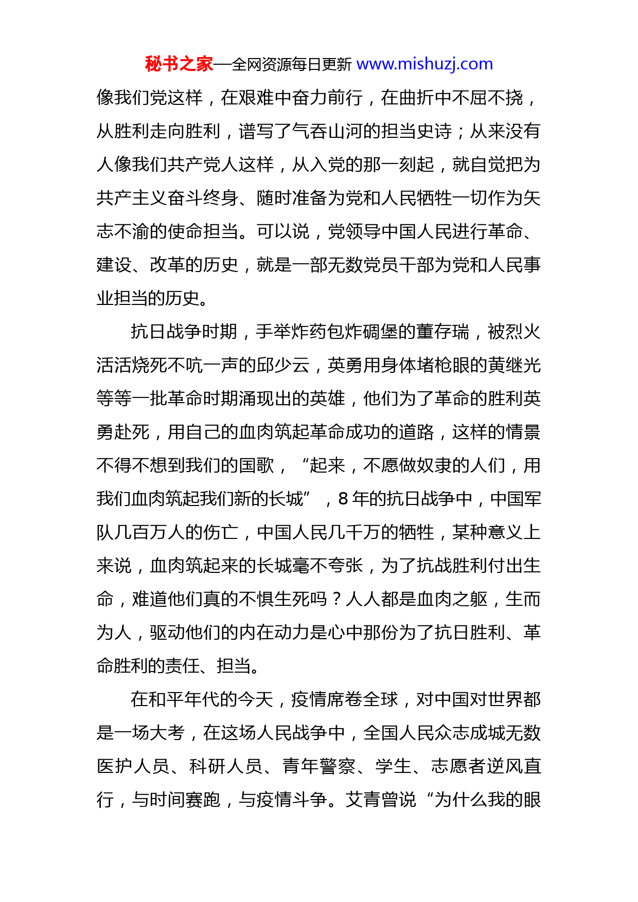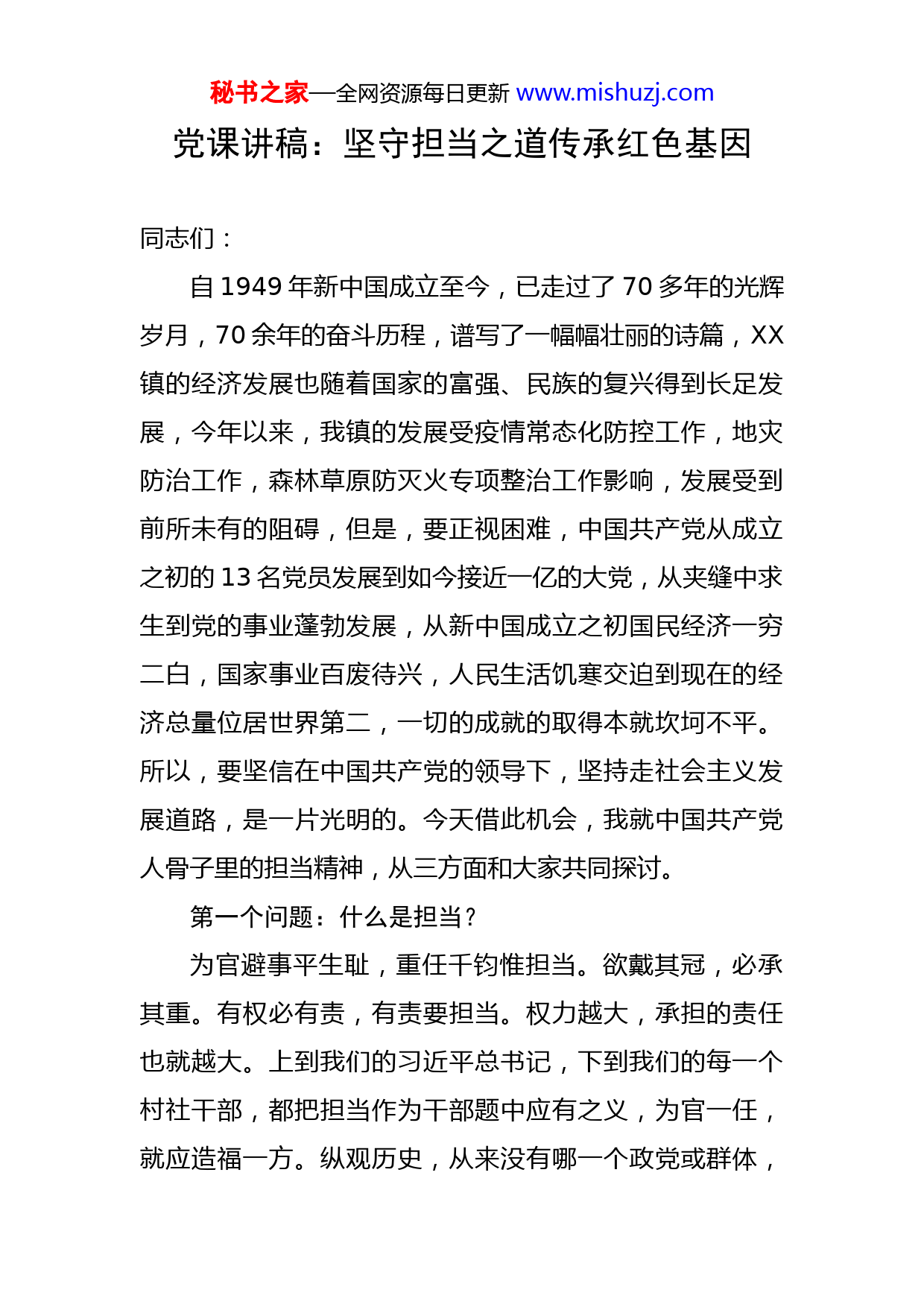 秘书之家—全网资源每日更新www.mishuzj.com党课讲稿:坚守担当之道传承红色基因同志们:自1949年新中国成立至今,已走过了70多年的光辉岁月,70余年的奋斗历程,谱写了一幅幅壮丽的诗篇,XX镇的经济发展也随着国家的富强、民族的复兴得到长足发展,今年以来,我镇的发展受疫情常态化防控工作,地灾防治工作,森林草原防灭火专项整治工作影响,发展受到前所未有的阻碍,但是,要正视困难,中国共产党从成立之初的13名党员发展到如今接近一亿的大党,从夹缝中求生到党的事业蓬勃发展,从新中国成立之初国民经济一穷二白,国家事业百废待兴,人民生活饥寒交迫到现在的经济总量位居世界第二,一切的成就的取得本就坎坷不平。所以,要坚信在中国共产党的领导下,坚持走社会主义发展道路,是一片光明的。今天借此机会,我就中国共产党人骨子里的担当精神,从三方面和大家共同探讨。第一个问题:什么是担当?为官避事平生耻,重任千钧惟担当。欲戴其冠,必承其重。有权必有责,有责要担当。权力越大,承担的责任也就越大。上到我们的习近平总书记,下到我们的每一个村社干部,都把担当作为干部题中应有之义,为官一任,就应造福一方。纵观历史,从来没有哪一个政党或群体,秘书之家—全网资源每日更新www.mishuzj.com像我们党这样,在艰难中奋力前行,在曲折中不屈不挠,从胜利走向胜利,谱写了气吞山河的担当史诗;从来没有人像我们共产党人这样,从入党的那一刻起,就自觉把为共产主义奋斗终身、随时准备为党和人民牺牲一切作为矢志不渝的使命担当。可以说,党领导中国人民进行革命、建设、改革的历史,就是一部无数党员干部为党和人民事业担当的历史。抗日战争时期,手举炸药包炸碉堡的董存瑞,被烈火活活烧死不吭一声的邱少云,英勇用身体堵枪眼的黄继光等等一批革命时期涌现出的英雄,他们为了革命的胜利英勇赴死,用自己的血肉筑起革命成功的道路,这样的情景不得不想到我们的国歌,“起来,不愿做奴隶的人们,用我们血肉筑起我们新的长城”,8年的抗日战争中,中国军队几百万人的伤亡,中国人民几千万的牺牲,某种意义上来说,血肉筑起来的长城毫不夸张,为了抗战胜利付出生命,难道他们真的不惧生死吗?人人都是血肉之躯,生而为人,驱动他们的内在动力是心中那份为了抗日胜利、革命胜利的责任、担当。在和平年代的今天,疫情席卷全球,对中国对世界都是一场大考,在这场人民战争中,全国人民众志成城无数医护人员、科研人员、青年警察、学生、志愿者逆风直行,与时间赛跑,与疫情斗争。艾青曾说“为什么我的眼秘书之家—全网资源每日更新www.mishuzj.com里常含泪水,因为我对这片土地爱得深沉”,中国人民在危难时刻总能将自己的吗,命运同民族命运紧密联系在一起,共克时艰。中国还在抗击国内疫情的同时,及时向国际社会分享中国的防控和治疗经验,并积极给予其他国家力所能及的援助。沧海横流方显英雄本色,这场疫情防控阻击战中,不仅体现了中国社会主义制度的优势、中国治理的优势,还充分体现了中华民族的责任担当、中国的大国责任担当、中国共产党的历史担当。什么是担当?什么是中华民族骨子里的担当?什么是中国共产党的担当?这就是。第二个问题:担当的意义在何处?新时代党员干部必须勇挑重担,以攻坚克难的勇气,引领担当作为的风气,事不避难、义不避责,创造出无愧于新时代的业绩。着眼现实,担当是干部面对新形势迎接新挑战的迫切需要。新时代是奋斗者的时代,也是担当者的时代。面对新形势,迎接新挑战,迫切需要更多的干部勇挑重担、奋发有为。可以说,具有强烈担当精神的干部越多,推动决战脱贫攻坚、决胜全面小康、实现高质量跨越式发展就越有力量。当前,XX全会,都提出了要打造XX,坚持“征拆不止、改造不止、建设不止、清廉不止”,用活头脑、用活人才、用活政策、用活资金,加快推进重点基础项目秘书之家—全网资源每日更新www.mishuzj.com建设,努力实现依山傍水、显山露水、城景相融、一街一景、四季花开,打造XX最美县城,着力建设公园城市,着力创响“省级文明城市”“国家卫生城市”等六张城市名片,打造“XX河谷都市走廊绿色发展示范区”,建设美丽幸福文明和谐新XX。干部是全会精神的践行者,作为“关键少数”,身处关键岗位、关键领域、关键环节,组织和人民寄予厚望,干部不干,谁干?干部不担当,谁来担当?在新的历史条件下,要认清XX、XX发展的新坐标,立足当下、把握机遇、克难攻坚,不断锤炼担当精神,在其位谋其政,带头在主动服务和融入国家发展战略中担当作为,在实现高质量跨越式发展中担当作为,接好历史的接力棒,在新一轮竞争中占据先机、赢得优势。面向未来,担当是干部奋力实现中国梦的使命所在。“纷繁世事多元应,击鼓催征稳驭舟。”党的二十大作出了中国特色社会主义进入了新时代的重大论断,明确提出了实现中华民族伟大复兴中国梦的历史使命。新征程召唤新使命,新使命需要新担当。伟大梦想不是等得来、喊得来的,而是拼出来、干出来的。实现梦想的每一步都不可能轻而易举,未来必定会面临这样那样的风险挑战,甚至会遇到难以想象的惊涛骇浪。需要广大干部以“横刀立马、舍我其谁”的胆识,“锲而不舍、金石可镂”的意志,切实增强对党忠诚、为党分忧、为党尽责