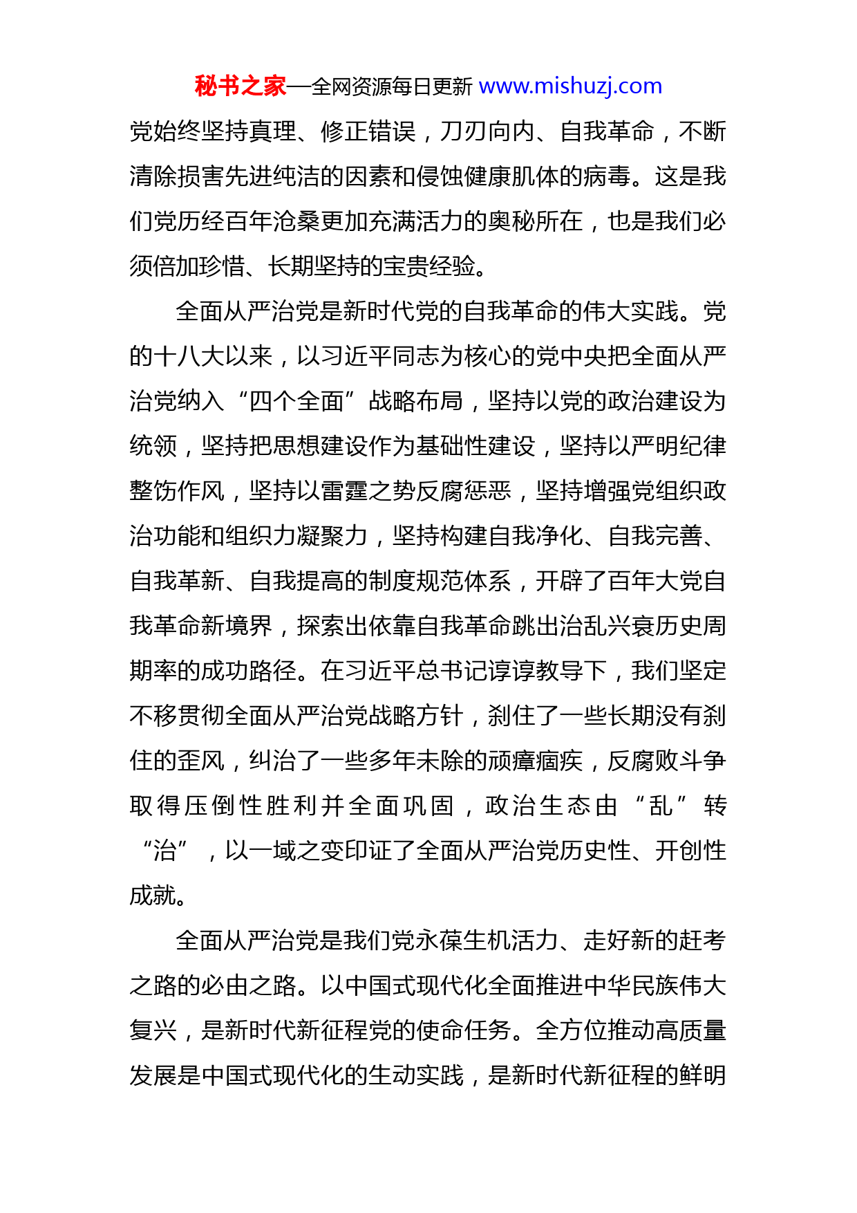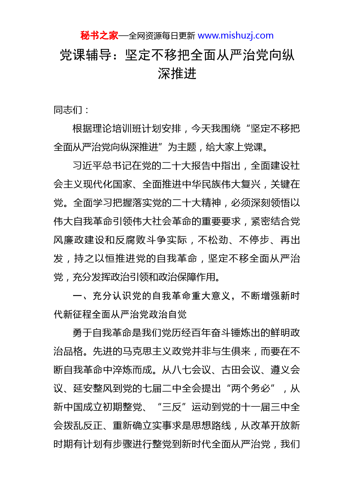 秘书之家—全网资源每日更新www.mishuzj.com党课辅导:坚定不移把全面从严治党向纵深推进同志们:根据理论培训班计划安排,今天我围绕“坚定不移把全面从严治党向纵深推进”为主题,给大家上党课。习近平总书记在党的二十大报告中指出,全面建设社会主义现代化国家、全面推进中华民族伟大复兴,关键在党。全面学习把握落实党的二十大精神,必须深刻领悟以伟大自我革命引领伟大社会革命的重要要求,紧密结合党风廉政建设和反腐败斗争实际,不松劲、不停步、再出发,持之以恒推进党的自我革命,坚定不移全面从严治党,充分发挥政治引领和政治保障作用。一、充分认识党的自我革命重大意义,不断增强新时代新征程全面从严治党政治自觉勇于自我革命是我们党历经百年奋斗锤炼出的鲜明政治品格。先进的马克思主义政党并非与生俱来,而要在不断自我革命中淬炼而成。从八七会议、古田会议、遵义会议、延安整风到党的七届二中全会提出“两个务必”,从新中国成立初期整党、“三反”运动到党的十一届三中全会拨乱反正、重新确立实事求是思想路线,从改革开放新时期有计划有步骤进行整党到新时代全面从严治党,我们秘书之家—全网资源每日更新www.mishuzj.com党始终坚持真理、修正错误,刀刃向内、自我革命,不断清除损害先进纯洁的因素和侵蚀健康肌体的病毒。这是我们党历经百年沧桑更加充满活力的奥秘所在,也是我们必须倍加珍惜、长期坚持的宝贵经验。全面从严治党是新时代党的自我革命的伟大实践。党的十八大以来,以习近平同志为核心的党中央把全面从严治党纳入“四个全面”战略布局,坚持以党的政治建设为统领,坚持把思想建设作为基础性建设,坚持以严明纪律整饬作风,坚持以雷霆之势反腐惩恶,坚持增强党组织政治功能和组织力凝聚力,坚持构建自我净化、自我完善、自我革新、自我提高的制度规范体系,开辟了百年大党自我革命新境界,探索出依靠自我革命跳出治乱兴衰历史周期率的成功路径。在习近平总书记谆谆教导下,我们坚定不移贯彻全面从严治党战略方针,刹住了一些长期没有刹住的歪风,纠治了一些多年未除的顽瘴痼疾,反腐败斗争取得压倒性胜利并全面巩固,政治生态由“乱”转“治”,以一域之变印证了全面从严治党历史性、开创性成就。全面从严治党是我们党永葆生机活力、走好新的赶考之路的必由之路。以中国式现代化全面推进中华民族伟大复兴,是新时代新征程党的使命任务。全方位推动高质量发展是中国式现代化的生动实践,是新时代新征程的鲜明秘书之家—全网资源每日更新www.mishuzj.com主题。我们处在一个既充满挑战又充满希望的时代,必将遇到许多可以预见和难以预见的风险挑战。越是光荣艰巨的使命、波澜壮阔的征程,越是需要全面从严治党的引领和保障。我们必须从党的百年奋斗历程中吸收养分,从新时代伟大胜利中激发力量,从走过的弯路曲折中汲取教训,以彻底的自我革命精神检视自身,以高度自觉的全面从严治党凝聚党心民心,把全体各级党组织建设得更加坚强有力,引领保障全方位推动高质量发展行稳致远。二、深刻把握永远在路上重大判断,始终保持新时代新征程全面从严治党战略定力全面从严治党永远在路上,党的自我革命永远在路上。习近平总书记在党的二十大报告中作出的这一重大判断,既彰显不忘初心、一路走来的历史主动,又昭示牢记使命、砥砺奋进的政治自觉,充分表明了我们党坚持自我革命、深化管党治党的坚定意志。永远在路上,体现着解决大党独有难题的清醒和坚定。我们党是世界上最大的马克思主义执政党,大有大的优势,大也有大的难处。新时代新征程,党面临的执政考验、改革开放考验、市场经济考验、外部环境考验将长期存在,精神懈怠危险、能力不足危险、脱离群众危险、消极腐败危险将长期存在,政治不纯、思想不纯、组织不纯、作风不纯问题尚未根除,加强自身建设是一个永恒课秘书之家—全网资源每日更新www.mishuzj.com题。我们必须时刻保持永远在路上的战略定力,坚定扛起管党治党政治责任,不断清除侵蚀健康肌体的病原体,不断提高全体各级党组织和广大党员干部的自身免疫力。永远在路上,凝结着新时代管党治党实践的经验总结。党的十八大以来,我们党坚持党要管党、全面从严治党,以刮骨疗毒的勇气向党内顽瘴痼疾开刀,以坚如磐石的意志正风肃纪反腐,有力消除了党、国家、军队内部严重隐患,根本扭转了管党治党宽松软状况,推动党和国家事业取得历史性成就、发生历史性变革。同时实践也证明,不正之风与腐败问题具有长期性、顽固性、复杂性,稍有放松就可能反弹回潮。我们必须始终牢记系统性塌方式腐败沉痛教训,坚决摒弃松劲歇脚、疲劳厌战的消极情绪,坚决杜绝降调、变调的错误期待,以驰而不息、久久为功的韧劲,一个问题一个问题纠治,一年接着一年用力,坚持不懈把全面从严治党推向纵深。永远在路上,彰显着坚持严的基调不动摇的鲜明态度。严是我们党管党治党一以贯之的原则要求和鲜明标识。当前,反腐败斗争形势依然严峻复杂,防范利益集团成伙作势、“围猎”腐蚀还任重道远,有效应对腐败手段隐形变异、翻新升级还任重道远,清理系统性腐败、化解风险隐患还任重道远,铲除腐败滋生土壤、实现海晏河清还