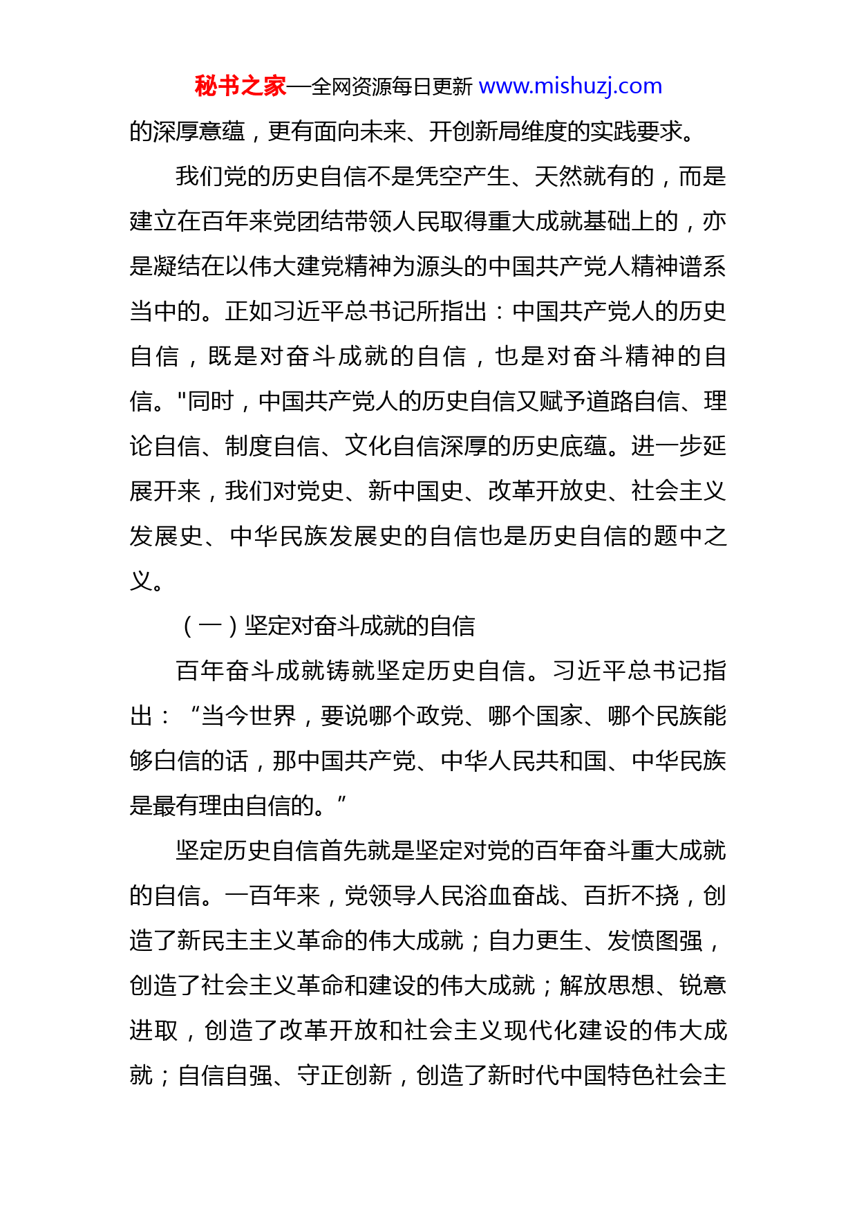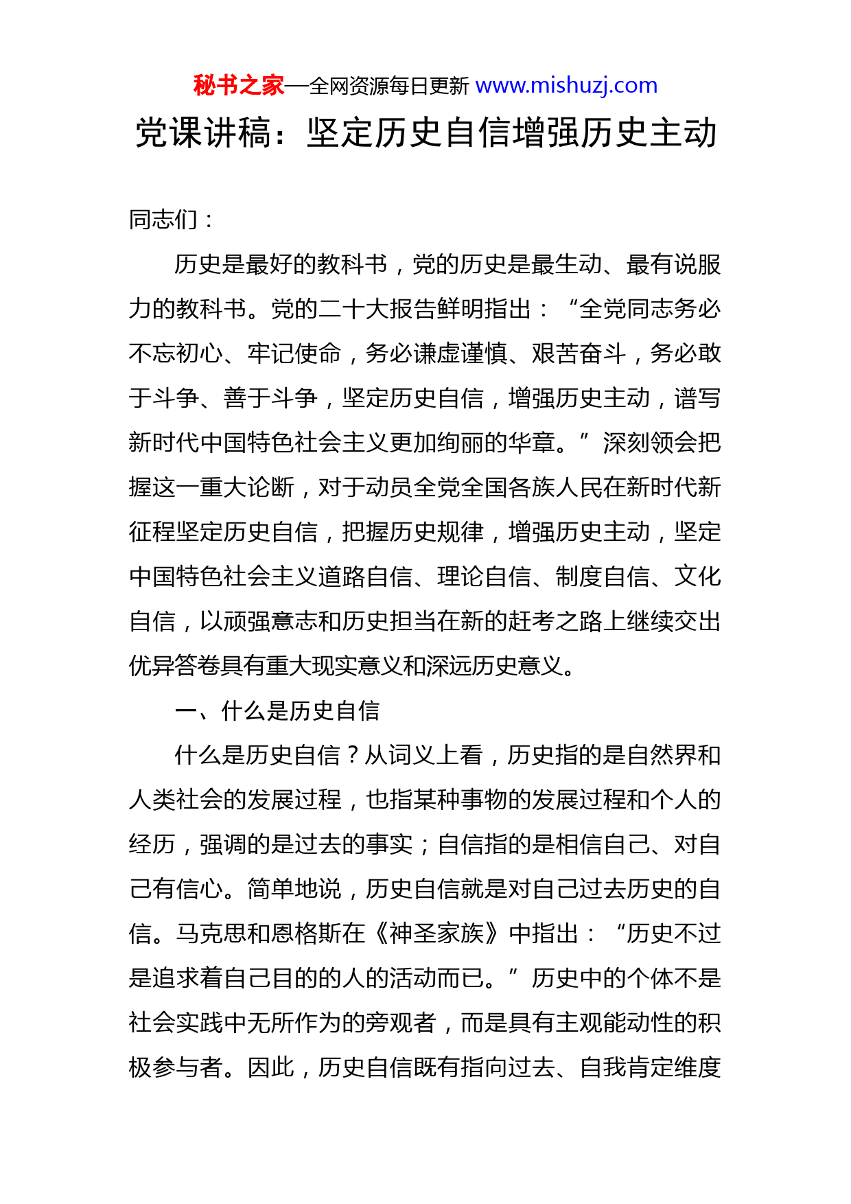 秘书之家—全网资源每日更新www.mishuzj.com党课讲稿:坚定历史自信增强历史主动同志们:历史是最好的教科书,党的历史是最生动、最有说服力的教科书。党的二十大报告鲜明指出:“全党同志务必不忘初心、牢记使命,务必谦虚谨慎、艰苦奋斗,务必敢于斗争、善于斗争,坚定历史自信,增强历史主动,谱写新时代中国特色社会主义更加绚丽的华章。”深刻领会把握这一重大论断,对于动员全党全国各族人民在新时代新征程坚定历史自信,把握历史规律,增强历史主动,坚定中国特色社会主义道路自信、理论自信、制度自信、文化自信,以顽强意志和历史担当在新的赶考之路上继续交出优异答卷具有重大现实意义和深远历史意义。一、什么是历史自信什么是历史自信?从词义上看,历史指的是自然界和人类社会的发展过程,也指某种事物的发展过程和个人的经历,强调的是过去的事实;自信指的是相信自己、对自己有信心。简单地说,历史自信就是对自己过去历史的自信。马克思和恩格斯在《神圣家族》中指出:“历史不过是追求着自己目的的人的活动而已。”历史中的个体不是社会实践中无所作为的旁观者,而是具有主观能动性的积极参与者。因此,历史自信既有指向过去、自我肯定维度秘书之家—全网资源每日更新www.mishuzj.com的深厚意蕴,更有面向未来、开创新局维度的实践要求。我们党的历史自信不是凭空产生、天然就有的,而是建立在百年来党团结带领人民取得重大成就基础上的,亦是凝结在以伟大建党精神为源头的中国共产党人精神谱系当中的。正如习近平总书记所指出:中国共产党人的历史自信,既是对奋斗成就的自信,也是对奋斗精神的自信。"同时,中国共产党人的历史自信又赋予道路自信、理论自信、制度自信、文化自信深厚的历史底蕴。进一步延展开来,我们对党史、新中国史、改革开放史、社会主义发展史、中华民族发展史的自信也是历史自信的题中之义。(一)坚定对奋斗成就的自信百年奋斗成就铸就坚定历史自信。习近平总书记指出:“当今世界,要说哪个政党、哪个国家、哪个民族能够白信的话,那中国共产党、中华人民共和国、中华民族是最有理由自信的。”坚定历史自信首先就是坚定对党的百年奋斗重大成就的自信。一百年来,党领导人民浴血奋战、百折不挠,创造了新民主主义革命的伟大成就;自力更生、发愤图强,创造了社会主义革命和建设的伟大成就;解放思想、锐意进取,创造了改革开放和社会主义现代化建设的伟大成就;自信自强、守正创新,创造了新时代中国特色社会主秘书之家—全网资源每日更新www.mishuzj.com义的伟大成就。经过全党全国各族人民持续奋斗,我们实现了第一个百年奋斗目标,在中华大地上全面建成了小康社会,历史性地解决了绝对贫困问题,正在意气风发向着全面建成社会主义现代化强国的第二个百年奋斗目标迈进。正如习近平总书记所强调的:这份令人刮目相看的百年成绩单,是一代又一代中国共产党人用理想和信仰书写的,用鲜血和生命铸就的,用拼搏和奉献赢得的。每一位中国共产党人都有理由为此感到自豪。新时代十年来的伟大变革在党史、新中国史、改革开放史社会主义发展史、中华民族发展史上具有里程碑意义,进一步坚定和增强了我们的历史自信。过去五年和新时代以来的十年涉滩之险、爬坡之艰、闯关之难叠加,百年变局和世纪疫情交织!以习近平同志为核心的党中央团结带领全国各族人民砥砺前行,推动党和国家事业实现一系列突破性进展,取得一系列标志性成果,成功推进和拓展了中国式现代化,保持了经济发展和疫情防控世界领先的地位,“中国之治”与“西方之乱”对比更加鲜明。刚刚过去的2022年,面对风高浪急的国际环境和艰巨繁重的国内改革发展稳定任务,以习近平同志为核心的党中央统筹国内国际两个大局,统筹疫情防控和经济社会发展,统筹发展和安全,加大宏观调控力度,应对超预期因素冲击,保持了经济社会大局稳定。根据国家统计局2023年1秘书之家—全网资源每日更新www.mishuzj.com月17日公布的数据,初步核算,2022年全年国内生产总值为1210207亿元,经济总量突破120万亿元,按不变价格计算,比上年增长3%。这是我国经济总量继2020年、2021年连续突破100万亿元、110万亿元之后,又跃上新的台阶。按年均汇率计算,120万亿元折合美元约18万亿美元,稳居世界第二位,发展基础更牢、质量更优、动力更充沛。历史雄辩的证明,没有共产党就没有新中国,就没有中国人民的幸福生活,就没有中华民族的伟大复兴。历史和人民选择了中国共产党,中国共产党没有辜负历史和人民的选择。坚定历史自信,就要充分认识到社会主义是拼出来、干出来、拿命换来的不仅过去如此,新时代也是如此,进而从学习和总结党的历史中增强道路自信、理论自信、制度自信、文化自信,咬定青山不放松,风雨无阻向前进。(二)坚定对奋斗精神的自信伟大的事业孕育伟大的精神,伟大的精神推进伟大的事业。世界上最大的幸福莫过于为人民幸福而奋斗。为人民幸福而奋斗是坚定历史自信的精神内核。毛泽东指出:“人是要有一点精神的,无产阶级的革命精神就是由这里头出来的。”邓小平指出:“没有一点闯的精神,没有一点‘冒’的精神,没有一股气呀、劲呀,就走不出一条好路,走不出一条新路,就干不出新的