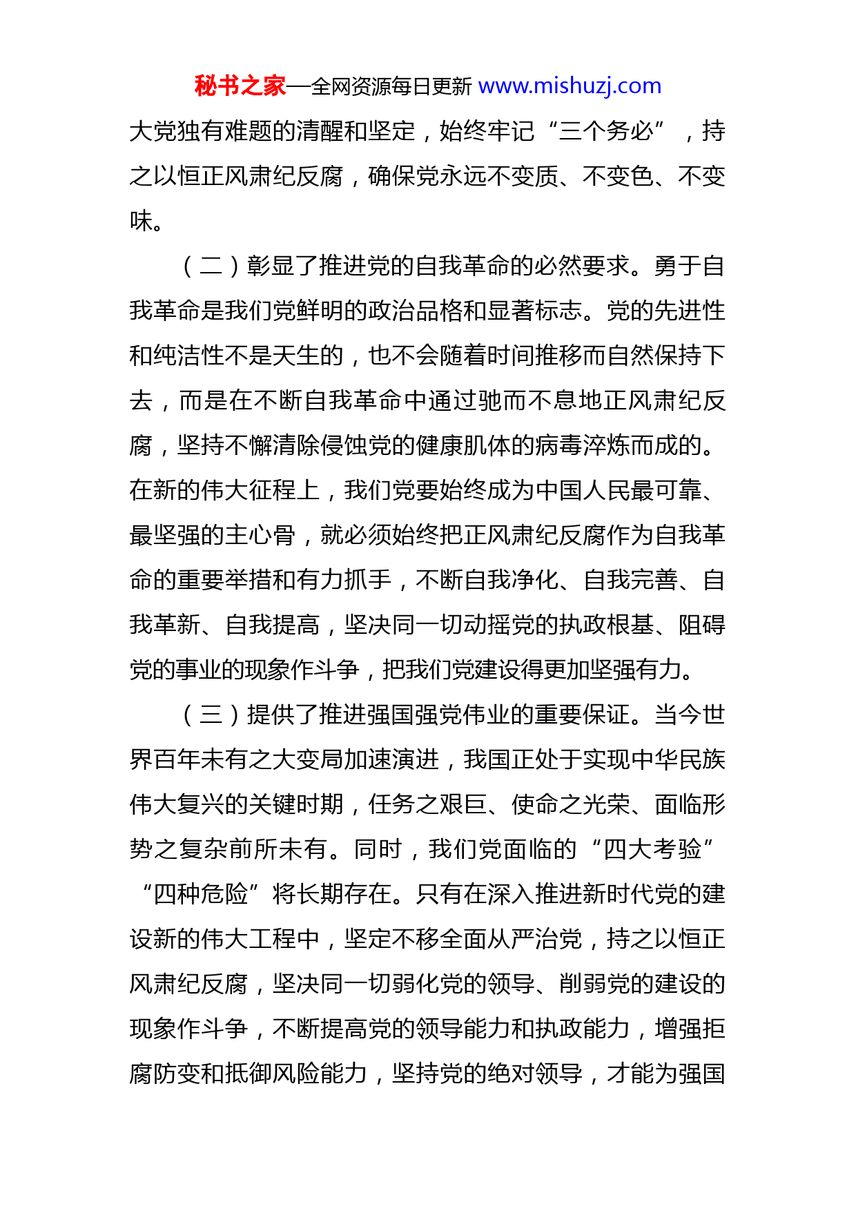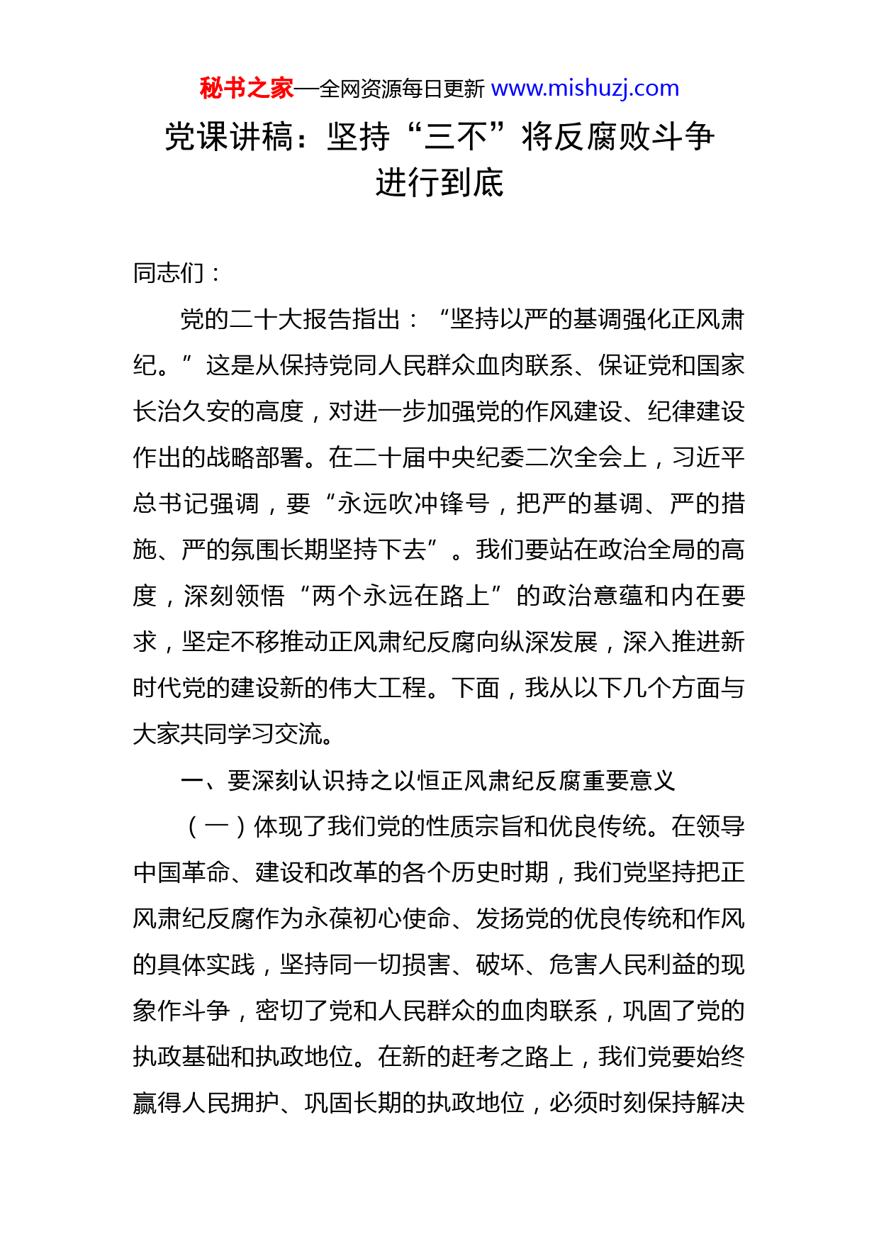 秘书之家—全网资源每日更新www.mishuzj.com党课讲稿:坚持“三不”将反腐败斗争进行到底同志们:党的二十大报告指出:“坚持以严的基调强化正风肃纪。”这是从保持党同人民群众血肉联系、保证党和国家长治久安的高度,对进一步加强党的作风建设、纪律建设作出的战略部署。在二十届中央纪委二次全会上,习近平总书记强调,要“永远吹冲锋号,把严的基调、严的措施、严的氛围长期坚持下去”。我们要站在政治全局的高度,深刻领悟“两个永远在路上”的政治意蕴和内在要求,坚定不移推动正风肃纪反腐向纵深发展,深入推进新时代党的建设新的伟大工程。下面,我从以下几个方面与大家共同学习交流。一、要深刻认识持之以恒正风肃纪反腐重要意义(一)体现了我们党的性质宗旨和优良传统。在领导中国革命、建设和改革的各个历史时期,我们党坚持把正风肃纪反腐作为永葆初心使命、发扬党的优良传统和作风的具体实践,坚持同一切损害、破坏、危害人民利益的现象作斗争,密切了党和人民群众的血肉联系,巩固了党的执政基础和执政地位。在新的赶考之路上,我们党要始终赢得人民拥护、巩固长期的执政地位,必须时刻保持解决秘书之家—全网资源每日更新www.mishuzj.com大党独有难题的清醒和坚定,始终牢记“三个务必”,持之以恒正风肃纪反腐,确保党永远不变质、不变色、不变味。(二)彰显了推进党的自我革命的必然要求。勇于自我革命是我们党鲜明的政治品格和显著标志。党的先进性和纯洁性不是天生的,也不会随着时间推移而自然保持下去,而是在不断自我革命中通过驰而不息地正风肃纪反腐,坚持不懈清除侵蚀党的健康肌体的病毒淬炼而成的。在新的伟大征程上,我们党要始终成为中国人民最可靠、最坚强的主心骨,就必须始终把正风肃纪反腐作为自我革命的重要举措和有力抓手,不断自我净化、自我完善、自我革新、自我提高,坚决同一切动摇党的执政根基、阻碍党的事业的现象作斗争,把我们党建设得更加坚强有力。(三)提供了推进强国强党伟业的重要保证。当今世界百年未有之大变局加速演进,我国正处于实现中华民族伟大复兴的关键时期,任务之艰巨、使命之光荣、面临形势之复杂前所未有。同时,我们党面临的“四大考验”“四种危险”将长期存在。只有在深入推进新时代党的建设新的伟大工程中,坚定不移全面从严治党,持之以恒正风肃纪反腐,坚决同一切弱化党的领导、削弱党的建设的现象作斗争,不断提高党的领导能力和执政能力,增强拒腐防变和抵御风险能力,坚持党的绝对领导,才能为强国秘书之家—全网资源每日更新www.mishuzj.com强党伟业提供坚强有力的政治保证。二、要准确把握以严的基调强化正风肃纪价值意蕴(一)“严”是我们党的鲜亮底色和独特优势。我们党是靠革命理想和铁的纪律组织起来的马克思主义政党。党的十八大以来,以习近平同志为核心的党中央以前所未有的勇气和定力推进全面从严治党,推动管党治党宽松软状况得到根本扭转。只有一以贯之持续从严,才能永葆党的先进性和纯洁性,确保我们党始终成为中国特色社会主义事业的坚强领导核心。(二)“严”才能保证正风肃纪有效性。无论是作风问题还是纪律问题,都具有顽固性、反复性,扭住不放、久久为功才能收到实效。要保持严的基调不动摇,锲而不舍落实中央八项规定精神,持续纠治“四风”问题,坚决防反弹回潮、防隐形变异、防疲劳厌战。把握作风建设地区性、行业性、阶段性特点,针对普遍发生、反复出现的问题深化整治,推进作风建设常态化长效化。(三)“严”是对广大党员干部的真正爱护。严管和厚爱具有高度一致性,必须坚持严管厚爱结合、激励约束并重。要贯通纪法情理,既抓早抓小、防微杜渐,咬耳扯袖、红脸出汗,又促使违纪违法受处理的党员干部知错改错、真心悔过。在严格执纪执法过程中,始终坚持实事求是,精准把握事实证据、思想态度、纪法标准,落实“三秘书之家—全网资源每日更新www.mishuzj.com个区分开来”,对受诬告陷害干部及时澄清正名。三、坚持“三不”,将反腐败斗争进行到底(一)要持之以恒高压惩治不动摇。一要坚持严的主基调,高擎利剑,挥起铁拳,坚决查处违反党的纪律规矩和法律法规的腐败问题,坚决清除心存侥幸、不知敬畏、不知收敛、胆大妄为的腐败分子,发现一起、查处一起,决不手软、决不姑息。要坚持长震慑的大方向,坚定持久作战的信心和决心,以猛药去疴、壮士断腕的巨大勇气,敢于同腐败现象作斗争,一仗接着一仗打,不断释放永不停歇、长期震慑的强烈信号。二要坚持全覆盖的总方针,紧盯经济发展的各个领域、百姓关注的焦点难点问题,坚持受贿行贿一起查,毫不手软地“打虎”“拍蝇”“猎狐”,切实做到全覆盖;要聚焦重点部位、关键环节,深挖细查背后的利益链,坚决铲除滋生腐败的土壤;要持续整治漠视群众利益的不正之风,严查民生领域“微腐败”,促进社会公平正义、保障群众合法权益。(二)要持之以恒严格约束不松劲。一要进一步健全法规制度,着眼腐败问题易于滋生的盲点,坚持以宪法、党章为根本遵循,及时修订完善法律、法规和纪律条例,着力构建适应新时代全面从严治党要求、有效制约党员干部权力运行的制度体系,让党员干部在制度的刚性约束下公正行使权力