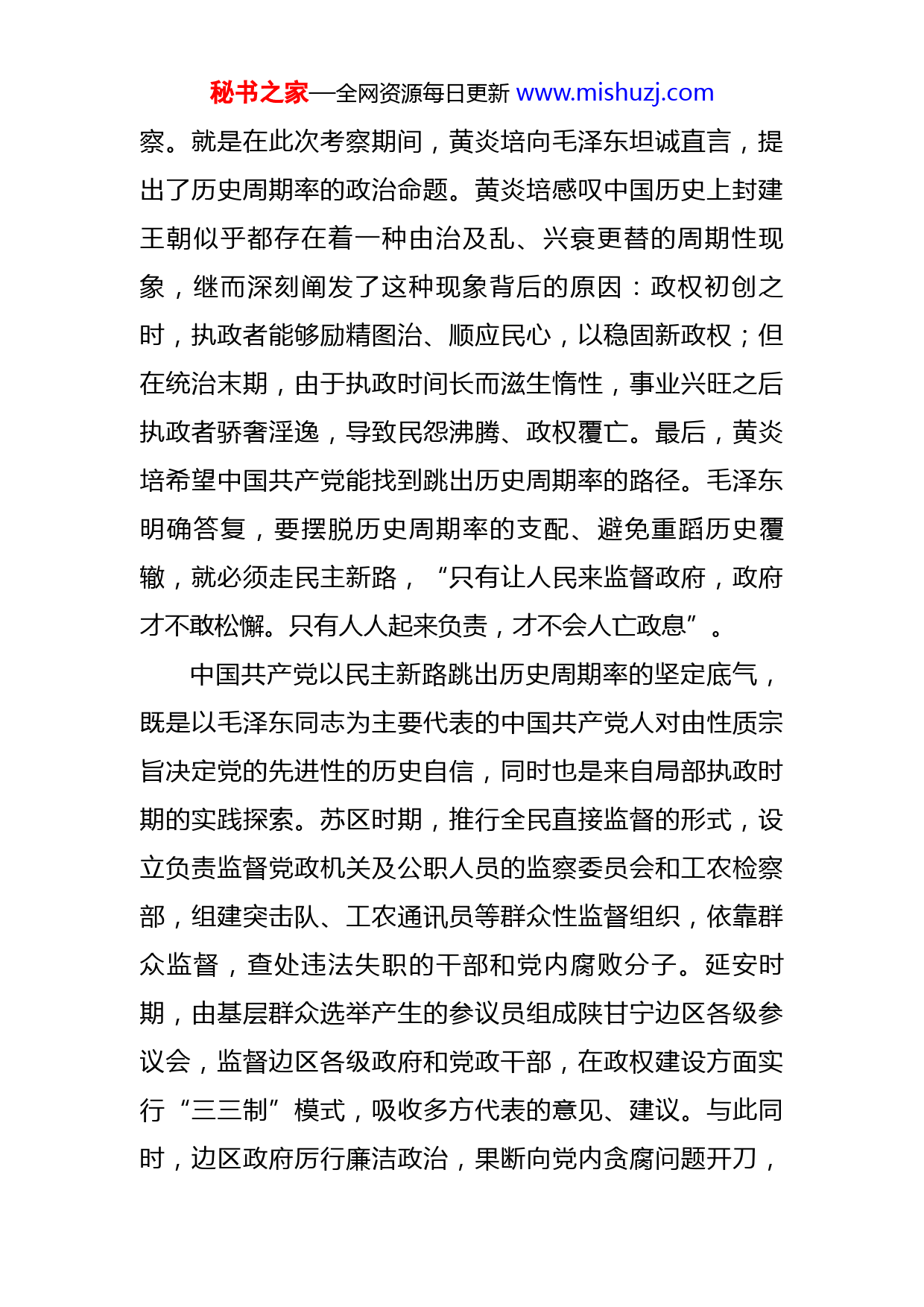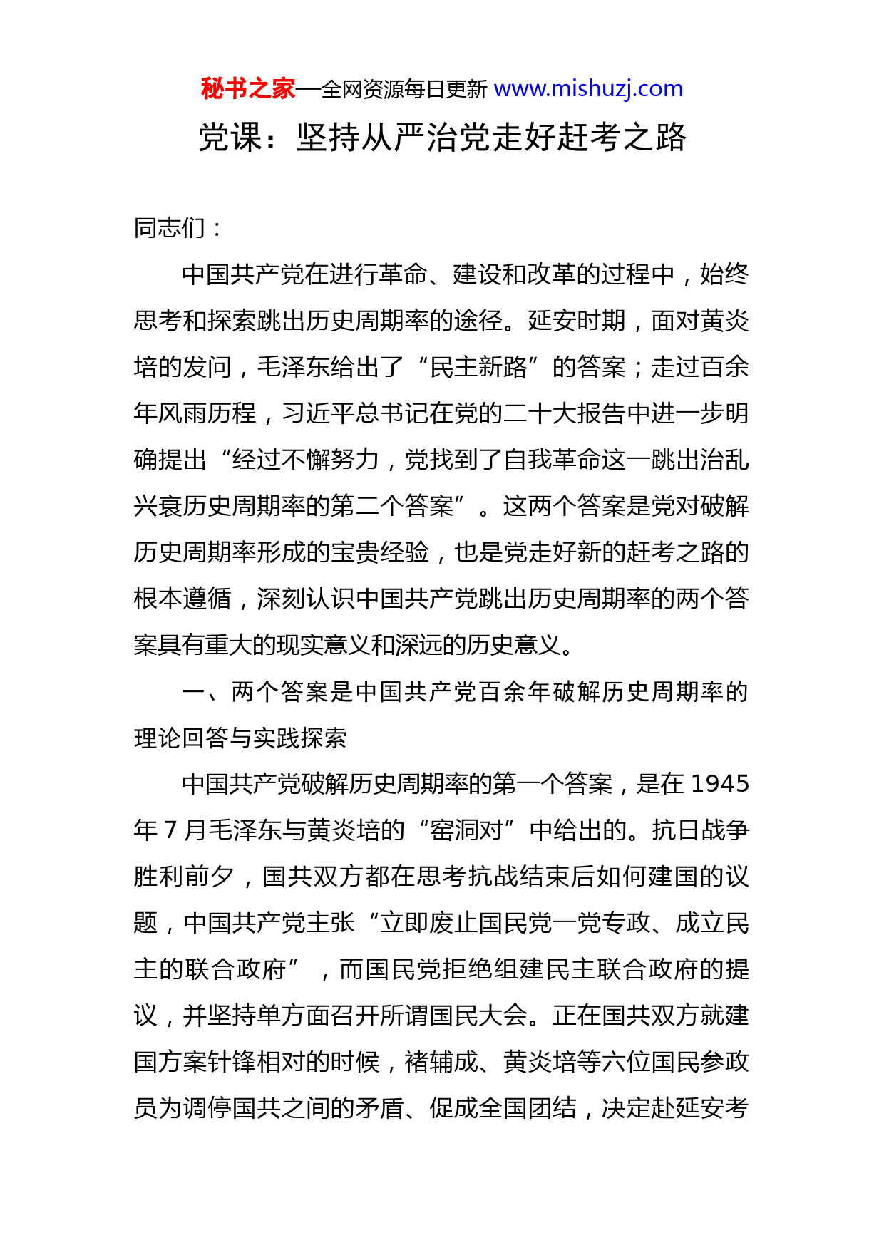 秘书之家—全网资源每日更新www.mishuzj.com党课:坚持从严治党走好赶考之路同志们:中国共产党在进行革命、建设和改革的过程中,始终思考和探索跳出历史周期率的途径。延安时期,面对黄炎培的发问,毛泽东给出了“民主新路”的答案;走过百余年风雨历程,习近平总书记在党的二十大报告中进一步明确提出“经过不懈努力,党找到了自我革命这一跳出治乱兴衰历史周期率的第二个答案”。这两个答案是党对破解历史周期率形成的宝贵经验,也是党走好新的赶考之路的根本遵循,深刻认识中国共产党跳出历史周期率的两个答案具有重大的现实意义和深远的历史意义。一、两个答案是中国共产党百余年破解历史周期率的理论回答与实践探索中国共产党破解历史周期率的第一个答案,是在1945年7月毛泽东与黄炎培的“窑洞对”中给出的。抗日战争胜利前夕,国共双方都在思考抗战结束后如何建国的议题,中国共产党主张“立即废止国民党一党专政、成立民主的联合政府”,而国民党拒绝组建民主联合政府的提议,并坚持单方面召开所谓国民大会。正在国共双方就建国方案针锋相对的时候,褚辅成、黄炎培等六位国民参政员为调停国共之间的矛盾、促成全国团结,决定赴延安考秘书之家—全网资源每日更新www.mishuzj.com察。就是在此次考察期间,黄炎培向毛泽东坦诚直言,提出了历史周期率的政治命题。黄炎培感叹中国历史上封建王朝似乎都存在着一种由治及乱、兴衰更替的周期性现象,继而深刻阐发了这种现象背后的原因:政权初创之时,执政者能够励精图治、顺应民心,以稳固新政权;但在统治末期,由于执政时间长而滋生惰性,事业兴旺之后执政者骄奢淫逸,导致民怨沸腾、政权覆亡。最后,黄炎培希望中国共产党能找到跳出历史周期率的路径。毛泽东明确答复,要摆脱历史周期率的支配、避免重蹈历史覆辙,就必须走民主新路,“只有让人民来监督政府,政府才不敢松懈。只有人人起来负责,才不会人亡政息”。中国共产党以民主新路跳出历史周期率的坚定底气,既是以毛泽东同志为主要代表的中国共产党人对由性质宗旨决定党的先进性的历史自信,同时也是来自局部执政时期的实践探索。苏区时期,推行全民直接监督的形式,设立负责监督党政机关及公职人员的监察委员会和工农检察部,组建突击队、工农通讯员等群众性监督组织,依靠群众监督,查处违法失职的干部和党内腐败分子。延安时期,由基层群众选举产生的参议员组成陕甘宁边区各级参议会,监督边区各级政府和党政干部,在政权建设方面实行“三三制”模式,吸收多方代表的意见、建议。与此同时,边区政府厉行廉洁政治,果断向党内贪腐问题开刀,秘书之家—全网资源每日更新www.mishuzj.com特别是经过延安整风运动和党的七大形成的党内高度团结统一的局面,中国共产党对发展党内民主和人民民主充满信心。当然,解决历史周期率难题,对于任何政党而言都绝非易事,并非一劳永逸,要不懈探索,立足实际,总结经验教训,根据时代要求不断探寻解决历史周期率难题的实践路径。新中国成立后,中国共产党持续将跳出历史周期率的第一个答案付诸实践,建立人民代表大会制度、中国共产党领导的多党合作和政治协商制度,为发展人民民主提供制度支撑。与此同时,针对党内蔓延的贪腐风气,迅速开展“三反”运动,调动群众监督的积极性,毫不留情地惩办刘青山、张子善等腐败分子,使新生的人民政权得到巩固和发展。改革开放后,党推行政务公开和党务公开制度,鼓励群众多提批评建议;实行特邀监察员制度,打通人民群众与监察机关之间的联系;将基层群众自治制度确立为我国的基本政治制度,人民民主迈向新的发展阶段。随着长期执政和发展社会主义市场经济,中国共产党的历史方位发生深刻变化,今天的历史条件已经和延安“窑洞对”时有了很大不同,特别是面临的执政考验、改革开放考验、市场经济考验、外部环境考验将长期存在,以及党面临的精神懈怠危险、能力不足危险、脱离群众危险、消极腐败危险将长期存在。在这种情况下,如何解决秘书之家—全网资源每日更新www.mishuzj.com历史周期率问题,确保党的执政地位稳固长久,需要集中全党智慧结合新的时代条件寻找问题的答案。党的十八大以来,习近平总书记深刻洞察党面临的严峻形势和复杂挑战,秉持强烈的忧患意识和历史主动精神,在多种场合强调历史周期率的问题,并在治国理政的实践中深入探索解决该问题的路径,纠治党内歪风邪气,连续开展党内集中教育活动,以零容忍的态度严惩贪腐,经过刮骨疗毒式的反腐败斗争,消除了党内的严重隐患,党内政治生态得到净化和改善,党的先进性和纯洁性得到有力保证,党的长期执政地位得到巩固。实践推动理论的深化和发展。习近平总书记结合党自身建设的历史经验,特别是新时代推进全面从严治党的经验,创造性地提出自我革命战略思想,并基于对建设长期执政的马克思主义政党规律性认识的深化,将自我革命与实现党长期执政之间的关系有机衔接起来,从而对解决历史周期率问题有了新的回答,提出自我革命是中国共产党跳出治乱兴衰历史周期率的第二个答案。在党的百余年探索中,民主新路与自我革命共同构成了破解历史周期率难题的两个答案,正如习近平总书记所指出:“一百年来,党外靠发展