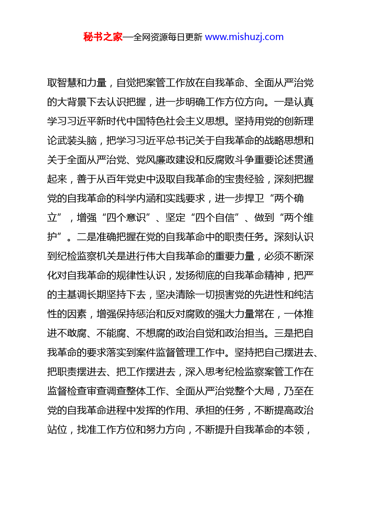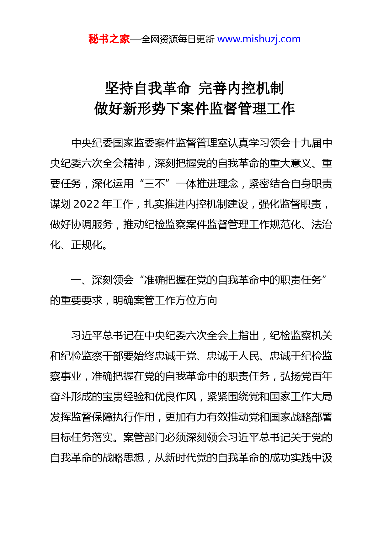 秘书之家—全网资源每日更新www.mishuzj.com坚持自我革命完善内控机制做好新形势下案件监督管理工作中央纪委国家监委案件监督管理室认真学习领会十九届中央纪委六次全会精神,深刻把握党的自我革命的重大意义、重要任务,深化运用“三不”一体推进理念,紧密结合自身职责谋划2022年工作,扎实推进内控机制建设,强化监督职责,做好协调服务,推动纪检监察案件监督管理工作规范化、法治化、正规化。一、深刻领会“准确把握在党的自我革命中的职责任务”的重要要求,明确案管工作方位方向习近平总书记在中央纪委六次全会上指出,纪检监察机关和纪检监察干部要始终忠诚于党、忠诚于人民、忠诚于纪检监察事业,准确把握在党的自我革命中的职责任务,弘扬党百年奋斗形成的宝贵经验和优良作风,紧紧围绕党和国家工作大局发挥监督保障执行作用,更加有力有效推动党和国家战略部署目标任务落实。案管部门必须深刻领会习近平总书记关于党的自我革命的战略思想,从新时代党的自我革命的成功实践中汲秘书之家—全网资源每日更新www.mishuzj.com取智慧和力量,自觉把案管工作放在自我革命、全面从严治党的大背景下去认识把握,进一步明确工作方位方向。一是认真学习习近平新时代中国特色社会主义思想。坚持用党的创新理论武装头脑,把学习习近平总书记关于自我革命的战略思想和关于全面从严治党、党风廉政建设和反腐败斗争重要论述贯通起来,善于从百年党史中汲取自我革命的宝贵经验,深刻把握党的自我革命的科学内涵和实践要求,进一步捍卫“两个确立”,增强“四个意识”、坚定“四个自信”、做到“两个维护”。二是准确把握在党的自我革命中的职责任务。深刻认识到纪检监察机关是进行伟大自我革命的重要力量,必须不断深化对自我革命的规律性认识,发扬彻底的自我革命精神,把严的主基调长期坚持下去,坚决清除一切损害党的先进性和纯洁性的因素,增强保持惩治和反对腐败的强大力量常在,一体推进不敢腐、不能腐、不想腐的政治自觉和政治担当。三是把自我革命的要求落实到案件监督管理工作中。坚持把自己摆进去、把职责摆进去、把工作摆进去,深入思考纪检监察案管工作在监督检查审查调查整体工作、全面从严治党整个大局,乃至在党的自我革命进程中发挥的作用、承担的任务,不断提高政治站位,找准工作方位和努力方向,不断提升自我革命的本领,秘书之家—全网资源每日更新www.mishuzj.com以高度负责的政治态度做好案管工作,为全面从严治党、党风廉政建设和反腐败斗争贡献应有力量。二、深刻领会“把不敢腐、不能腐、不想腐一体推进的理念贯穿自身建设”的重要要求,牢记案管部门职责使命习近平总书记在中央纪委六次全会上强调,要把不敢腐、不能腐、不想腐一体推进的理念贯穿自身建设,以更高的标准、更严的纪律要求自己。打铁必须自身硬。案管部门必须从党的自我革命、全面从严治党大局出发,牢记纪检监察机关内部监督部门的职责使命和工作要求,把“三不”一体推进的理念贯穿其中,突出监督职责,加强监督执纪执法权力运行内控机制建设,防范违规违纪违法行使权力,防止“灯下黑”。一是深刻认识“谁来监督纪委”,不断强化自我监督。习近平总书记强调监督者要接受更严格的监督和约束,提出“谁来监督纪委”的重大命题。在中央纪委六次全会上,再次强调监督别人首先要管好自己,纪检监察机关要自觉接受严格的监督和约束。习近平总书记对“谁来监督纪委”给出了明确答案,主要靠自我监督。纪检监察机关是党和国家监督专责机关,在监督别人的同时要不断强化自我监督,态度要鲜明坚定,举措要务实有秘书之家—全网资源每日更新www.mishuzj.com效。二是深刻把握“如何监督纪委”,加强内控机制建设。监督纪委的核心就在于监督纪委的权力。强化对权力的监督,关键是内部要管住人、看住事。但人不是抽象的存在,而是由工作中一个个具体事项构成的。看不住事、看不住工作,也就管不住人,权力就会失控。所以,回答好“如何监督纪委”,必须加强内控机制建设,规范监督执纪执法权力运行。案管部门作为内部监督部门,负责监督检查审查调查全流程监管,在规范权力运行、强化内控机制建设中承担着义不容辞的责任。三是将“三不”一体推进的理念贯穿内控机制建设之中。案管部门贯彻落实中央纪委六次全会精神,必须把“三不”一体推进理念贯穿内部监督之中,在规范权力行使、防止不作为乱作为上也要“三不”同向发力,着力发现和纠治问题形成“不敢”的震慑,加强制度机制建设夯实“不能”的基础,寓监督于服务之中促进养成“不想”的自觉,切实提升监督管理的综合效能,推进纪检监察工作规范化、法治化、正规化。三、认真贯彻落实中央纪委六次全会部署的各项工作任务,扎实有效做好案件监督管理工作秘书之家—全网资源每日更新www.mishuzj.com案管部门贯彻落实中央纪委六次全会精神,必须认真贯彻落实《中华人民共和国监察法实施条例》《纪检监察机关案件监督管理工作规则》等规定,全面履行线索管理、组织协调、监督检查、督促办理、统计分析五项职能,依规依纪依法强化对监督执纪执法权力运行的监督,用信息化手段提升监督水平、规范化水平,推动案管工
