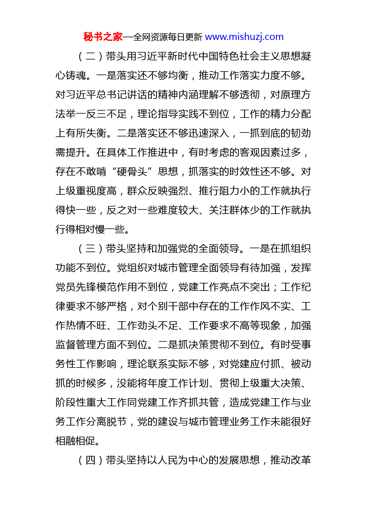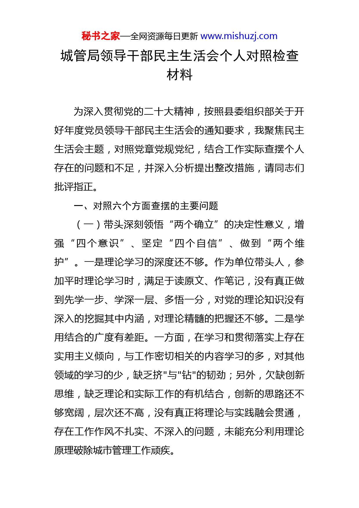 秘书之家—全网资源每日更新www.mishuzj.com城管局领导干部民主生活会个人对照检查材料为深入贯彻党的二十大精神,按照县委组织部关于开好年度党员领导干部民主生活会的通知要求,我聚焦民主生活会主题,对照党章党规党纪,结合工作实际查摆个人存在的问题和不足,并深入分析提出整改措施,请同志们批评指正。一、对照六个方面查摆的主要问题(一)带头深刻领悟“两个确立”的决定性意义,增强“四个意识”、坚定“四个自信”、做到“两个维护”。一是理论学习的深度还不够。作为单位带头人,参加平时理论学习时,满足于读原文、作笔记,没有真正做到先学一步、学深一层、多悟一分,对党的理论知识没有深入的挖掘其中内涵,对理论精髓的把握还不够。二是学用结合的广度有差距。一方面,在学习和贯彻落实上存在实用主义倾向,与工作密切相关的内容学习的多,对其他领域的学习的少,缺乏挤"与"钻"的韧劲;另外,欠缺创新思维,缺乏理论和实际工作的有机结合,创新的思路还不够宽阔,层次还不高,没有真正将理论与实践融会贯通,存在工作作风不扎实、不深入的问题,未能充分利用理论原理破除城市管理工作顽疾。秘书之家—全网资源每日更新www.mishuzj.com(二)带头用习近平新时代中国特色社会主义思想凝心铸魂。一是落实还不够均衡,推动工作落实力度不够。对习近平总书记讲话的精神内涵理解不够透彻,对原理方法举一反三不足,理论指导实践不到位,工作的精力分配上有所失衡。二是落实还不够迅速深入,一抓到底的韧劲需提升。在具体工作推进中,有时考虑的客观因素过多,存在不敢啃“硬骨头”思想,抓落实的时效性还不够。对上级重视度高,群众反映强烈、推行阻力小的工作就执行得快一些,反之对一些难度较大、关注群体少的工作就执行得相对慢一些。(三)带头坚持和加强党的全面领导。一是在抓组织功能不到位。党组织对城市管理全面领导有待加强,发挥党员先锋模范作用不到位,党建工作亮点不突出;工作纪律要求不够严格,对个别干部中存在的工作作风不实、工作热情不旺、工作劲头不足、工作要求不高等现象,加强监督管理方面不到位。二是抓决策贯彻不到位。有时受事务性工作影响,理论联系实际不够,对党建应付抓、被动抓的时候多,没能将年度工作计划、贯彻上级重大决策、阶段性重大工作同党建工作齐抓共管,造成党建工作与业务工作分离脱节,党的建设与城市管理业务工作未能很好相融相促。(四)带头坚持以人民为中心的发展思想,推动改革秘书之家—全网资源每日更新www.mishuzj.com发展稳定。一是用心用情用力还不够。坐等上门多、主动问需少,特别是在联系挂点村,对农村群众往往是重要节日、活动期间送温暖偏多,平时主动帮助解决实质性问题较少。二是为民务实意识有所弱化。没有完全摆正自己的位置,对以人民为中心发展思想的落实途径、走好群众的路线的方式方法,还没有做到结合本单位的实际情况进行有效的提炼整合,自己对于摸清群众需求、优化服务链条有所忽略,工作精力用于开会和日常事务过多用于联系群众,与一般干部及群众接触不够。(四)带头发扬斗争精神,防范化解风险挑战。一是攻坚克难锐气不足,开拓进取精神有所松懈。认为自己提升空间有限,从而进取心、责任心、上进心减退,干劲、拼劲、闯劲不足,拼搏奋斗精神有所丧失;面对城市管理问题反复等难点,虽然也结合实际工作进行了研究思考,但有时还缺少攻城拔寨的担当精神,在发展思路、发展目标发展措施上还缺乏大的动作,有时还存在小进则满的情绪。二是创新意识还需进一步加强。对于部分日常工作,有时满足于按部就班落实上级要求,勇于破除自我设限、善于创新方式方法,破除惯性思维,勇于斗争改变做得还不够到位。有始终保持高尚的奉献品德和精神。(六)带头落实全面从严治党政治责任。一是落实党风廉政建设责任力度有待加强。存在“说得多、做得少”秘书之家—全网资源每日更新www.mishuzj.com的现象,抓廉政教育方式方法较为单一,只注重于会议上的案件通报、文件传达、观看警示教育片等形式,以发生在身边的反面典型案例开展警示教育,深入剖析触及思想灵魂还不够。二是从严从紧的意识不足,监督管理不够严格。平时在会上学习部署教育得多,开展廉政谈话等次数少。工作存在“老好人”心态,对分管领域和干部身上的缺点和错误思想提醒不多批评教育不够,“啄木鸟”作用发挥不到位,缺乏较真碰硬的狠劲。二、产生问题的原因分析(一)理论学习的基础不够扎实。把精力主要放在了日常事务、生产和业务学习上,在理论学习上存在着一定的片面性,没有完全处理好工学矛盾,学习形式多限于集体学习,静下心抽时间对理论学习不够深入细致,学习不够及时、不够主动、不够深入,思想改造不够彻底,导致理想出现弱化,对习近平新时代中国特色社会主义思想的丰富内涵和精神实质理解不够,不能很好的与城市管理工作紧密结合。(二)为民服务的意识不够深刻。自已是从基层一步一步成长起来的领导干部,自认为对民心民情、民意民需是深刻理解的。但随着主管工作的不断增多,慢慢减少了基层调研、疏远了基层群众,对民生诉求体察不够,关注不够,对自身的岗位职责,有时看得不重、想得不远,有秘书之家—全网资源每
