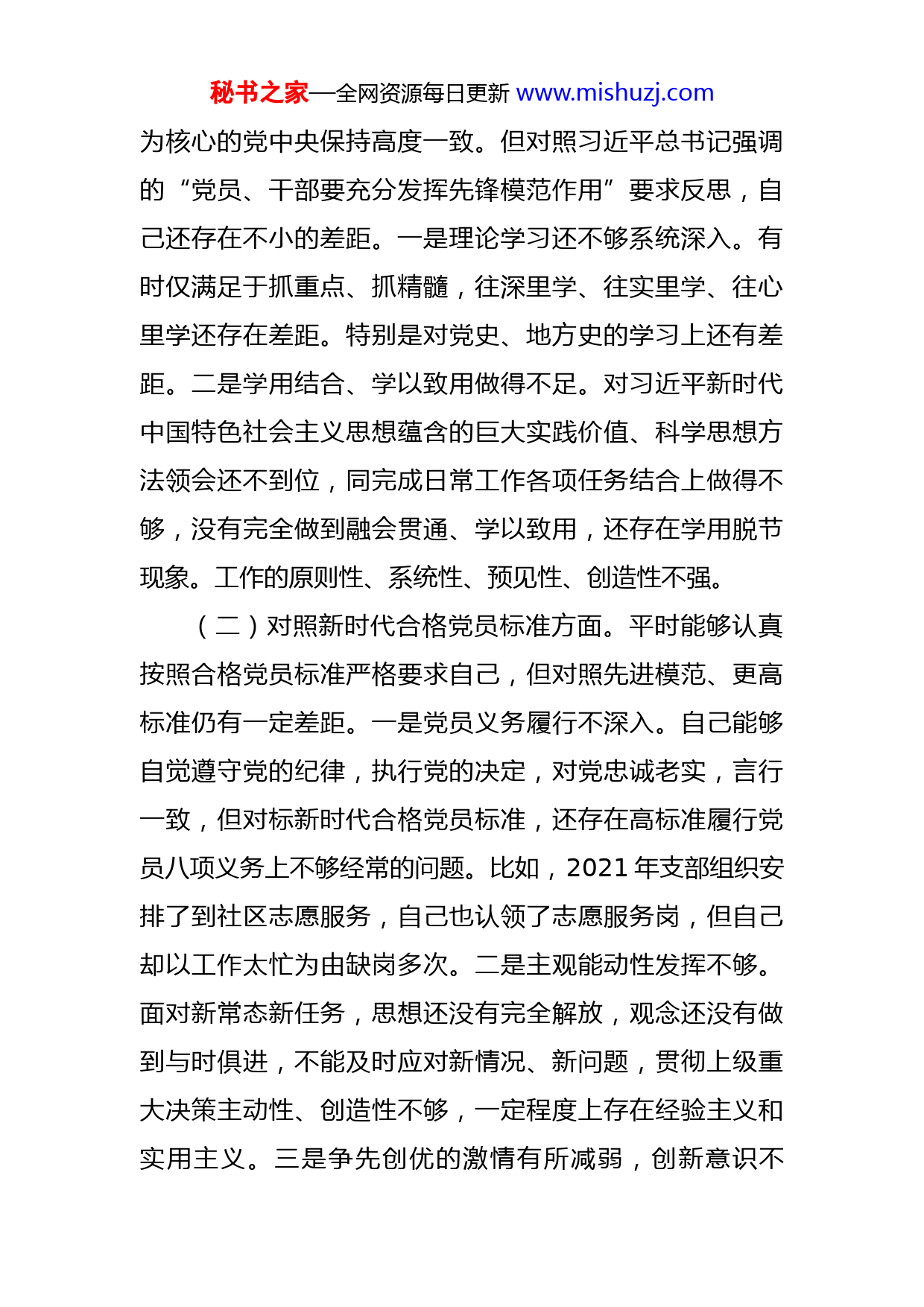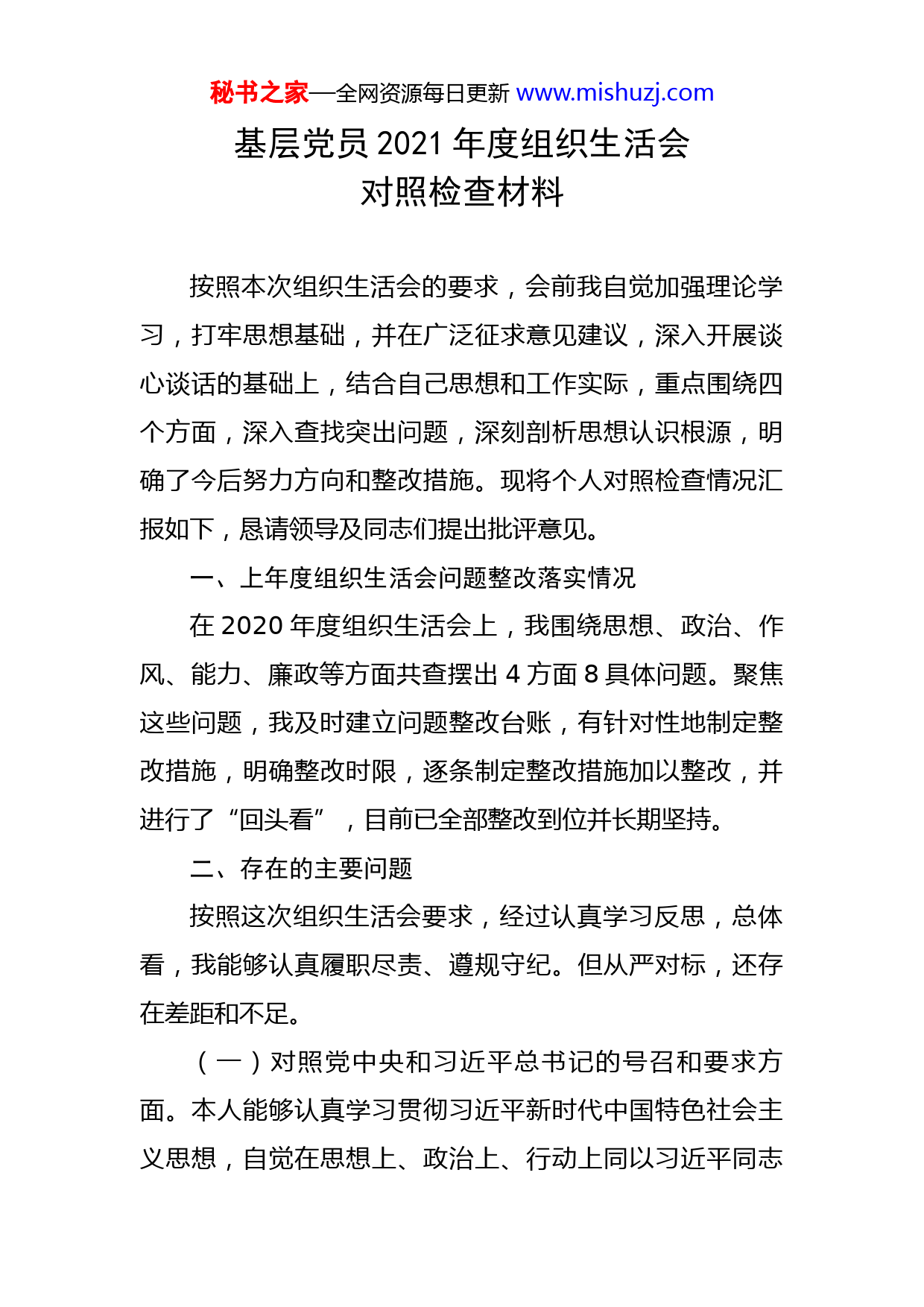 秘书之家—全网资源每日更新www.mishuzj.com基层党员2021年度组织生活会对照检查材料按照本次组织生活会的要求,会前我自觉加强理论学习,打牢思想基础,并在广泛征求意见建议,深入开展谈心谈话的基础上,结合自己思想和工作实际,重点围绕四个方面,深入查找突出问题,深刻剖析思想认识根源,明确了今后努力方向和整改措施。现将个人对照检查情况汇报如下,恳请领导及同志们提出批评意见。一、上年度组织生活会问题整改落实情况在2020年度组织生活会上,我围绕思想、政治、作风、能力、廉政等方面共查摆出4方面8具体问题。聚焦这些问题,我及时建立问题整改台账,有针对性地制定整改措施,明确整改时限,逐条制定整改措施加以整改,并进行了“回头看”,目前已全部整改到位并长期坚持。二、存在的主要问题按照这次组织生活会要求,经过认真学习反思,总体看,我能够认真履职尽责、遵规守纪。但从严对标,还存在差距和不足。(一)对照党中央和习近平总书记的号召和要求方面。本人能够认真学习贯彻习近平新时代中国特色社会主义思想,自觉在思想上、政治上、行动上同以习近平同志秘书之家—全网资源每日更新www.mishuzj.com为核心的党中央保持高度一致。但对照习近平总书记强调的“党员、干部要充分发挥先锋模范作用”要求反思,自己还存在不小的差距。一是理论学习还不够系统深入。有时仅满足于抓重点、抓精髓,往深里学、往实里学、往心里学还存在差距。特别是对党史、地方史的学习上还有差距。二是学用结合、学以致用做得不足。对习近平新时代中国特色社会主义思想蕴含的巨大实践价值、科学思想方法领会还不到位,同完成日常工作各项任务结合上做得不够,没有完全做到融会贯通、学以致用,还存在学用脱节现象。工作的原则性、系统性、预见性、创造性不强。(二)对照新时代合格党员标准方面。平时能够认真按照合格党员标准严格要求自己,但对照先进模范、更高标准仍有一定差距。一是党员义务履行不深入。自己能够自觉遵守党的纪律,执行党的决定,对党忠诚老实,言行一致,但对标新时代合格党员标准,还存在高标准履行党员八项义务上不够经常的问题。比如,2021年支部组织安排了到社区志愿服务,自己也认领了志愿服务岗,但自己却以工作太忙为由缺岗多次。二是主观能动性发挥不够。面对新常态新任务,思想还没有完全解放,观念还没有做到与时俱进,不能及时应对新情况、新问题,贯彻上级重大决策主动性、创造性不够,一定程度上存在经验主义和实用主义。三是争先创优的激情有所减弱,创新意识不秘书之家—全网资源每日更新www.mishuzj.com够。工作中还存思路陈旧,创新意识不高的现象,缺乏探索精神,有时还习惯用一些老办法、老套路、老思维来想问题、干工作,常规性工作多,亮点工作少。(三)对照入党誓词方面。本人能够认真贯彻落实中央八项规定精神,严守纪律规矩,主动接受监督,切实发挥好示范作用。但对照高标准严要求还有不足。一是党性修养不够经常。落实党日、党课、双重组织生活、开展批评与自我批评等还不够严格,有时存在失之于软、失之于宽的问题,对当前社会上一些不良现象,从本质上认识不足,对身边出现的错误思想,旗帜鲜明批驳不够,挺身而出与消极言行、不良现象斗争还不够坚决。二是政治能力培养不够扎实。能够认真对照习近平总书记倡导的思维理念、工作作风、党性原则来要求自己,自觉加强政治能力提升,但在严肃党内制度、过好组织生活等方面,还不能完全达到主席强调的“讲党性不讲私情、讲真理不讲面子”、“领导干部必须带头从谏如流、敢于直言”的要求,有时还存有明哲保身的观念,还留有求稳保稳的思想。比如有时会满足于不出失误、不踩红线、不犯错误,对一些小事小节的危害性认识不足,从小事入手,从小节做起,警钟长鸣的自觉性还有待持续加强。(四)对照革命先辈和先进典型方面。一是宗旨意识不强,群众观念淡薄,脱离群众,漠视群众的问题。由于秘书之家—全网资源每日更新www.mishuzj.com受到各种思潮和周围环境的影响,本人全心全意为群众服务的意识不强了,群众观念淡薄了。二是责任心和执行力弱化,工作效率不高,责任心和执行力弱化。不思进取,得过且过,不求无功但求无过。有时心情烦躁,办事拖拉工作效率不高,有事不关己高高挂起之心态。三是缺乏干事激情,精神状态不佳,创新能力不强。有时候精神萎靡不振不想干事;有时候思想服化,一味按政策办事缺乏创新意识。三、存在问题的原因分析对于以上存在的突出问题,自己进行了深入剖析,产生问题的原因主要有以下几个方面:(一)理论学习还有差距。对理论学习的重要性认识不够,没有把理论学习摆在突出位置,没有制定科学的学习计划,学习主动性、自觉性不强,缺乏深入钻研的精神,存在“以干代学”现象。没有将强化理论武装、坚定理想信念提升到讲政治的高度去谋划和推进,导致人生观、世界观和价值观这个“总开关”拧得不紧,思想的警觉性、政治的敏锐性降低。(二)党性锤炼还有差距。随着社会的深刻变革,经济的快速发展,文化的相互激荡,对自身的思想观念和价值取向产生了一些不良影响,对工作缺乏高标准、严要求的自觉性,因而在抓落实上只求过得去、不求过得硬,欠秘书之家
