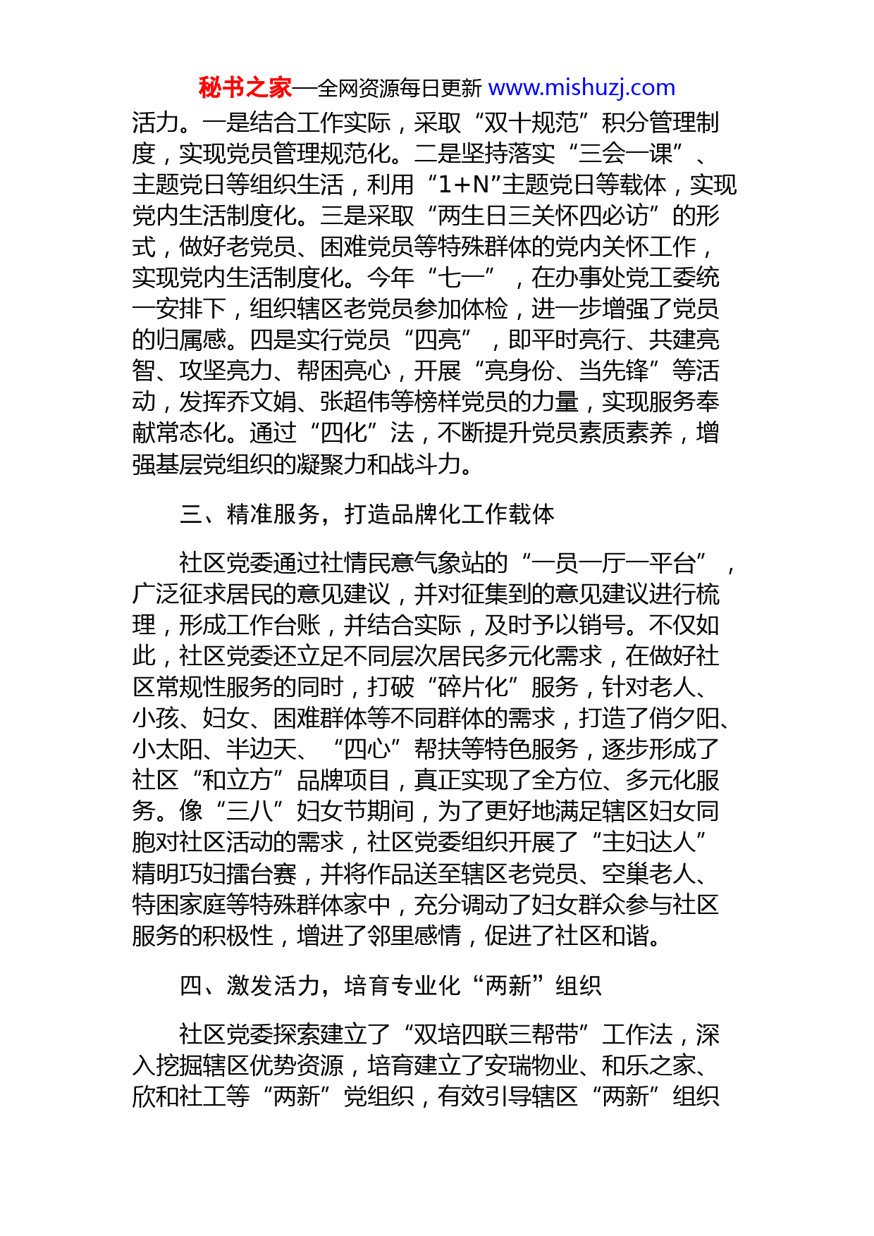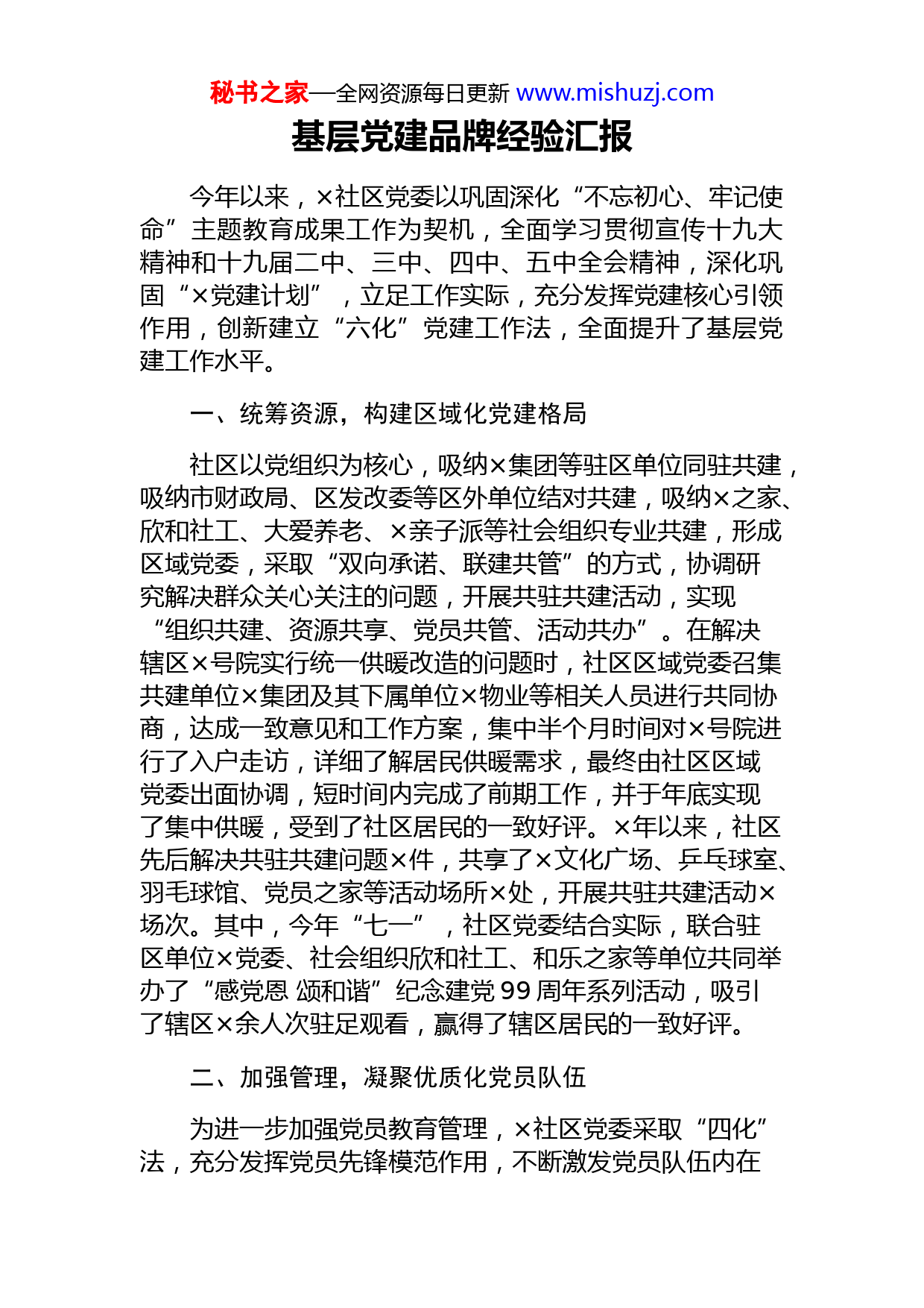 秘书之家—全网资源每日更新www.mishuzj.com基层党建品牌经验汇报今年以来,×社区党委以巩固深化“不忘初心、牢记使命”主题教育成果工作为契机,全面学习贯彻宣传十九大精神和十九届二中、三中、四中、五中全会精神,深化巩固“×党建计划”,立足工作实际,充分发挥党建核心引领作用,创新建立“六化”党建工作法,全面提升了基层党建工作水平。一、统筹资源,构建区域化党建格局社区以党组织为核心,吸纳×集团等驻区单位同驻共建,吸纳市财政局、区发改委等区外单位结对共建,吸纳×之家、欣和社工、大爱养老、×亲子派等社会组织专业共建,形成区域党委,采取“双向承诺、联建共管”的方式,协调研究解决群众关心关注的问题,开展共驻共建活动,实现“组织共建、资源共享、党员共管、活动共办”。在解决辖区×号院实行统一供暖改造的问题时,社区区域党委召集共建单位×集团及其下属单位×物业等相关人员进行共同协商,达成一致意见和工作方案,集中半个月时间对×号院进行了入户走访,详细了解居民供暖需求,最终由社区区域党委出面协调,短时间内完成了前期工作,并于年底实现了集中供暖,受到了社区居民的一致好评。×年以来,社区先后解决共驻共建问题×件,共享了×文化广场、乒乓球室、羽毛球馆、党员之家等活动场所×处,开展共驻共建活动×场次。其中,今年“七一”,社区党委结合实际,联合驻区单位×党委、社会组织欣和社工、和乐之家等单位共同举办了“感党恩颂和谐”纪念建党99周年系列活动,吸引了辖区×余人次驻足观看,赢得了辖区居民的一致好评。二、加强管理,凝聚优质化党员队伍为进一步加强党员教育管理,×社区党委采取“四化”法,充分发挥党员先锋模范作用,不断激发党员队伍内在秘书之家—全网资源每日更新www.mishuzj.com活力。一是结合工作实际,采取“双十规范”积分管理制度,实现党员管理规范化。二是坚持落实“三会一课”、主题党日等组织生活,利用“1+N”主题党日等载体,实现党内生活制度化。三是采取“两生日三关怀四必访”的形式,做好老党员、困难党员等特殊群体的党内关怀工作,实现党内生活制度化。今年“七一”,在办事处党工委统一安排下,组织辖区老党员参加体检,进一步增强了党员的归属感。四是实行党员“四亮”,即平时亮行、共建亮智、攻坚亮力、帮困亮心,开展“亮身份、当先锋”等活动,发挥乔文娟、张超伟等榜样党员的力量,实现服务奉献常态化。通过“四化”法,不断提升党员素质素养,增强基层党组织的凝聚力和战斗力。三、精准服务,打造品牌化工作载体社区党委通过社情民意气象站的“一员一厅一平台”,广泛征求居民的意见建议,并对征集到的意见建议进行梳理,形成工作台账,并结合实际,及时予以销号。不仅如此,社区党委还立足不同层次居民多元化需求,在做好社区常规性服务的同时,打破“碎片化”服务,针对老人、小孩、妇女、困难群体等不同群体的需求,打造了俏夕阳、小太阳、半边天、“四心”帮扶等特色服务,逐步形成了社区“和立方”品牌项目,真正实现了全方位、多元化服务。像“三八”妇女节期间,为了更好地满足辖区妇女同胞对社区活动的需求,社区党委组织开展了“主妇达人”精明巧妇擂台赛,并将作品送至辖区老党员、空巢老人、特困家庭等特殊群体家中,充分调动了妇女群众参与社区服务的积极性,增进了邻里感情,促进了社区和谐。四、激发活力,培育专业化“两新”组织社区党委探索建立了“双培四联三帮带”工作法,深入挖掘辖区优势资源,培育建立了安瑞物业、和乐之家、欣和社工等“两新”党组织,有效引导辖区“两新”组织秘书之家—全网资源每日更新www.mishuzj.com党组织积极参与社区建设和服务工作。其中,社区党委还结合“三社联动”工作,建立了社区社会组织服务中心,积极引进了欣和社工、×亲子派、大爱养老等社会组织,引导其充分发挥专业优势,实现社区服务的专业化、规范化、激发其内在活力,呈现“组织联建凝聚合力、党员联管增强活力、资源联享催生推力、服务联供激发动力”的互利共赢的良好局面。像2019年,在上级支持和帮助下,社区党委以“正家风倡文明”家庭创建项目为契机,引进了×市欣和社会工作服务中心,并鼓励引导其建立了党支部,开展了“幸福家庭坊”等活动,加强了基层党支部的战斗堡垒作用,更增进了居民对社区的归属感。五、规范机制,实现民主化社区治理针对关系群众切身利益的热点难点问题,社区党委始终坚持实行民主决策。2020年×月,×家属院属于破产单位,多年来由于下水道淤泥堵塞,每逢下大雨,路上就污水横流,严重影响小区居民出行。社区党委了解情况后,逐户走访居民,最终通过“一征三议两公开”工作法,对小区下水道进行整修清淤,受到居民一致好评。近年来,社区先后运用“一征三议两公开”工作法解决了×小区规划停车位、电焊条厂家属院水泵房改造等事项。日常工作中,社区还在居务监督委员会的基础上,设立社区“四大员”(党风政风监督员、社情民意信息员、社区事务评议员、社区建设献策员),将老党员、老干部、热心居民等吸纳进来,采取“三权四式”监督法,对社区干部履职情况、社区办公经费、社区政策落实、廉洁从政等实行全过程监督,进一步激发了社区居民参