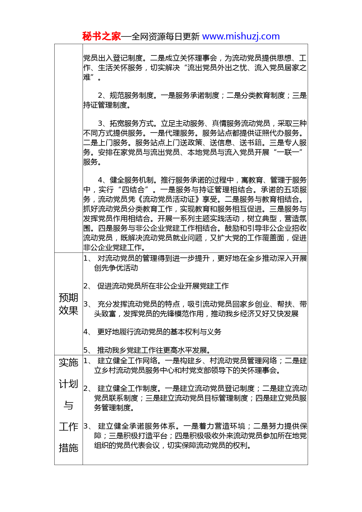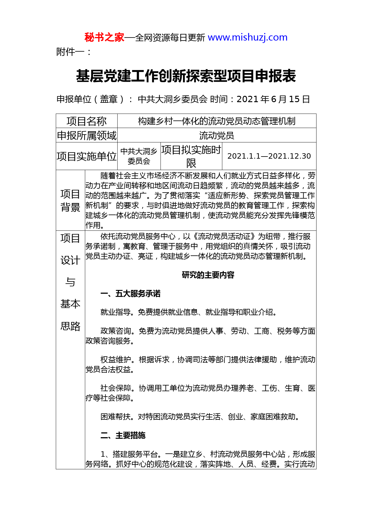 秘书之家—全网资源每日更新www.mishuzj.com附件一:基层党建工作创新探索型项目申报表申报单位(盖章):中共大洞乡委员会时间:2021年6月15日项目名称构建乡村一体化的流动党员动态管理机制申报所属领域流动党员项目实施单位中共大洞乡委员会项目拟实施时限2021.1.1—2021.12.30项目背景随着社会主义市场经济不断发展和人们就业方式日益多样化,劳动力在产业间转移和地区间流动日趋频繁,流动的党员越来越多,流动的范围越来越广。为了贯彻落实“适应新形势、探索党员管理工作新机制”的要求,与时俱进地做好流动党员的教育管理工作,探索构建城乡一体化的流动党员管理机制,使流动党员能充分发挥先锋模范作用。项目设计与基本思路依托流动党员服务中心,以《流动党员活动证》为纽带,推行服务承诺制,寓教育、管理于服务中,用党组织的真情关怀,吸引流动党员主动办证、亮证,构建城乡一体化的流动党员动态管理新机制。研究的主要内容一、五大服务承诺就业指导。免费提供就业信息、就业指导和职业介绍。政策咨询。免费为流动党员提供人事、劳动、工商、税务等方面政策咨询服务。权益维护。根据诉求,协调司法等部门提供法律援助,维护流动党员合法权益。社会保障。协调用工单位为流动党员办理养老、工伤、生育、医疗等社会保障。困难帮扶。对特困流动党员实行生活、创业、家庭困难救助。二、主要措施1、搭建服务平台。一是建立乡、村流动党员服务中心站,形成服务网络。抓好中心的规范化建设,落实阵地、人员、经费。实行流动秘书之家—全网资源每日更新www.mishuzj.com党员出入登记制度。二是成立关怀理事会,为流动党员提供思想、工作、生活关怀服务,切实解决“流出党员外出之忧、流入党员居家之难”。2、规范服务制度。一是服务承诺制度;二是分类教育制度;三是持证管理制度。3、拓宽服务方式。立足主动服务、真情服务流动党员,采取三种不同方式提供服务。一是代理服务。服务站点都提供证照代办服务。二是上门服务。服务站点上门送政策、送信息、送书籍。三是专人服务。安排在家党员与流出党员、本地党员与流入党员开展“一联一”服务。4、健全服务机制。推行服务承诺的过程中,寓教育、管理于服务中,实行“四结合”。一是服务与持证管理相结合。承诺的五项服务,流动党员凭《流动党员活动证》享受。二是服务与教育相结合。抓好流动党员分类教育工作,实现教育和服务相互促进。三是服务与发挥党员作用相结合。开展一系列主题实践活动,树立典型,营造氛围。四是服务与非公企业党建工作相结合。鼓励和引导非公企业招收流动党员,既解决流动党员就业问题,又扩大党的工作覆盖面,促进非公企业党建工作。预期效果1、对流动党员的管理得到进一步提升,更好地在全乡推动深入开展创先争优活动2、促进流动党员所在非公企业开展党建工作3、充分发挥流动党员的特点,吸引流动党员回家乡创业、帮扶、带头致富,发挥党员的先锋模范作用,推动我乡经济又好又快发展4、更好地履行流动党员的基本权利与义务5、推动我乡党建工作往更高水平发展。实施计划与工作措施1、建立健全工作网络。一是构建乡、村流动党员管理网络;二是建立乡村流动党员服务中心和村党支部领导下的关怀理事会。2、建立健全工作制度。一是建立流动党员登记制度;二是建立流动党员联系制度;三是建立流动党员目标管理制度;四是建立党员服务管理制度。3、建立健全承诺服务体系。一是着力营造环境;二是努力提供保障;三是积极打造平台;四是积极吸收外来流动党员参加所在地党组织的党员代表会议,切实保障流动党员的权利。秘书之家—全网资源每日更新www.mishuzj.com4、成立由党委书记为组长,党委副书记为常务副组长的领导小组,纳入基层党建工作责任制,切实加强领导和指导。强化流动党员领导小组相关部门的沟通和协作,定期通报和研究创新项目工作。5、加强对创新项目工作的督促检查。及时总结推广好的经验和做法,并形成总结上报县委组织部验收。项目领办领导(第一责任人)肖兵责任主体(责任直接单位)中共大洞乡委员会县委组织部审核意见注:该表申报项目,主要是针对基层党建工作重点、热点、难点问题,拟从点上进行创新探索的党建工作项目。