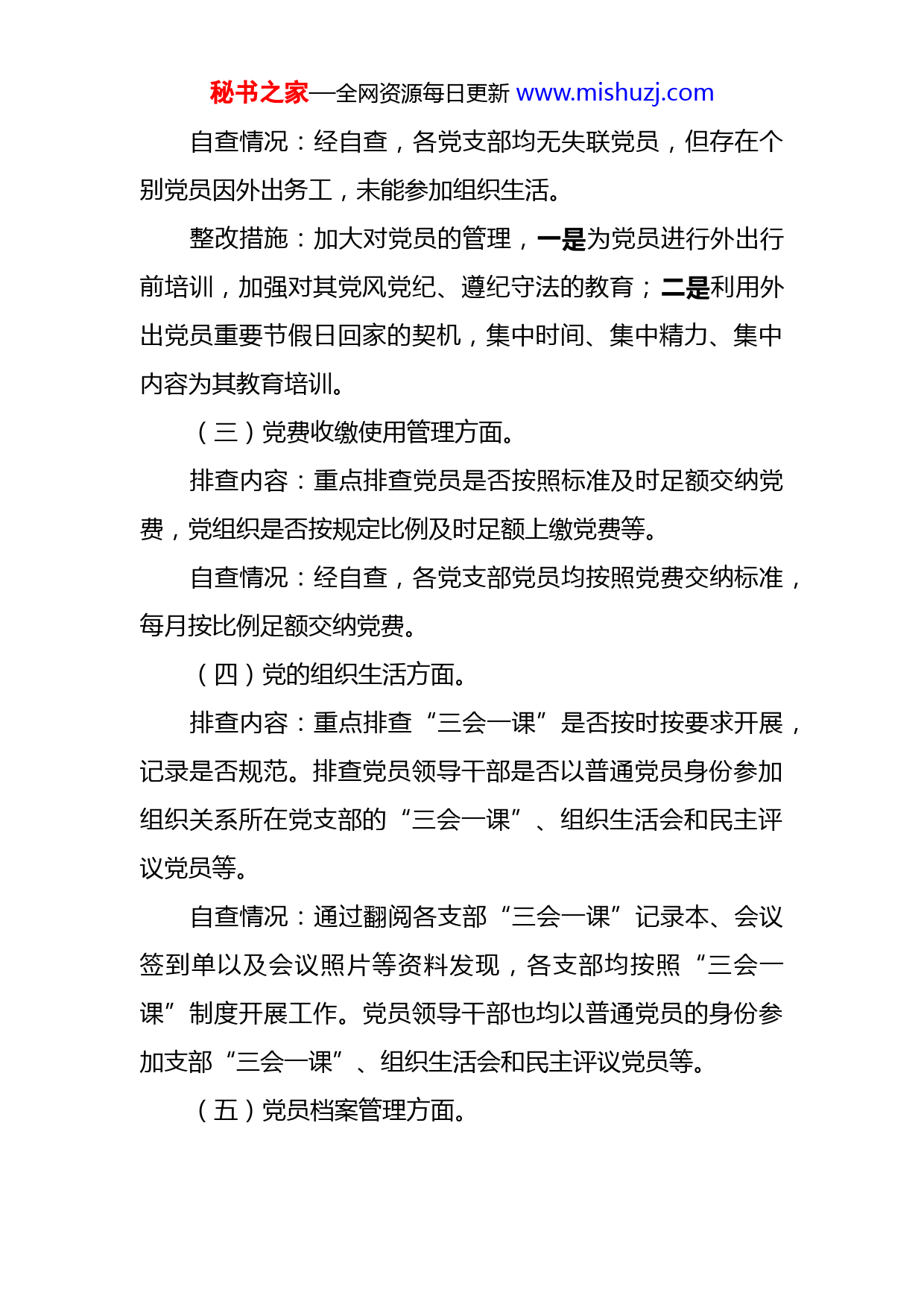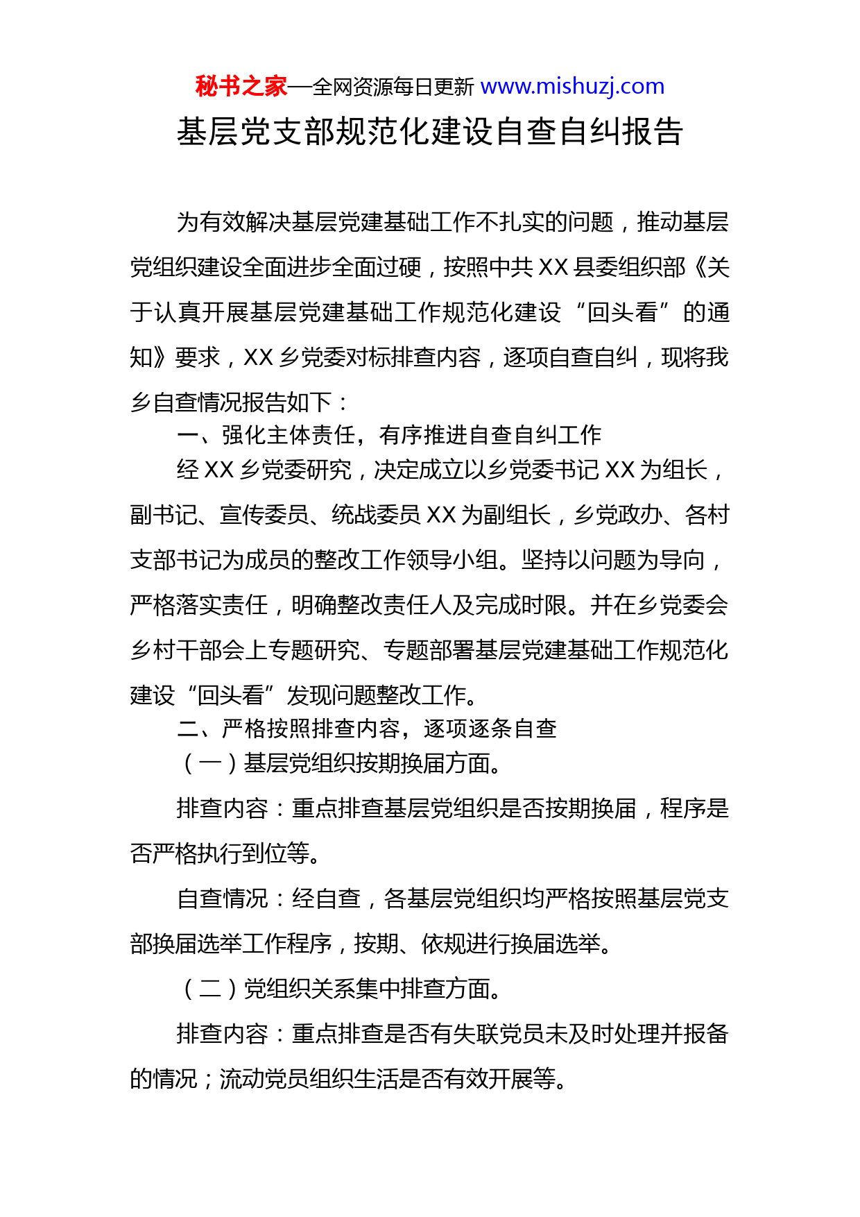 秘书之家—全网资源每日更新www.mishuzj.com基层党支部规范化建设自查自纠报告为有效解决基层党建基础工作不扎实的问题,推动基层党组织建设全面进步全面过硬,按照中共XX县委组织部《关于认真开展基层党建基础工作规范化建设“回头看”的通知》要求,XX乡党委对标排查内容,逐项自查自纠,现将我乡自查情况报告如下:一、强化主体责任,有序推进自查自纠工作经XX乡党委研究,决定成立以乡党委书记XX为组长,副书记、宣传委员、统战委员XX为副组长,乡党政办、各村支部书记为成员的整改工作领导小组。坚持以问题为导向,严格落实责任,明确整改责任人及完成时限。并在乡党委会乡村干部会上专题研究、专题部署基层党建基础工作规范化建设“回头看”发现问题整改工作。二、严格按照排查内容,逐项逐条自查(一)基层党组织按期换届方面。排查内容:重点排查基层党组织是否按期换届,程序是否严格执行到位等。自查情况:经自查,各基层党组织均严格按照基层党支部换届选举工作程序,按期、依规进行换届选举。(二)党组织关系集中排查方面。排查内容:重点排查是否有失联党员未及时处理并报备的情况;流动党员组织生活是否有效开展等。秘书之家—全网资源每日更新www.mishuzj.com自查情况:经自查,各党支部均无失联党员,但存在个别党员因外出务工,未能参加组织生活。整改措施:加大对党员的管理,一是为党员进行外出行前培训,加强对其党风党纪、遵纪守法的教育;二是利用外出党员重要节假日回家的契机,集中时间、集中精力、集中内容为其教育培训。(三)党费收缴使用管理方面。排查内容:重点排查党员是否按照标准及时足额交纳党费,党组织是否按规定比例及时足额上缴党费等。自查情况:经自查,各党支部党员均按照党费交纳标准,每月按比例足额交纳党费。(四)党的组织生活方面。排查内容:重点排查“三会一课”是否按时按要求开展,记录是否规范。排查党员领导干部是否以普通党员身份参加组织关系所在党支部的“三会一课”、组织生活会和民主评议党员等。自查情况:通过翻阅各支部“三会一课”记录本、会议签到单以及会议照片等资料发现,各支部均按照“三会一课”制度开展工作。党员领导干部也均以普通党员的身份参加支部“三会一课”、组织生活会和民主评议党员等。(五)党员档案管理方面。秘书之家—全网资源每日更新www.mishuzj.com排查内容:重点排查党员人数是否清楚,是否每个党员均有党员档案,排查党员档案缺失或不齐全的是否按规定补办完善。自查情况:经自查,部分党员档案不完善,整改措施:由各支部书记对接相应党员进行党员档案的完善。(六)基层党组织设置方面。排查内容:重点排查是否存在“超大党支部”“袖珍党支部”“空壳党支部”等基层党组织设置不规范的突出问题。自查情况:经自查,不存在“超大党支部”、“袖珍党支部”、“空壳党支部”等基层党组织设置不规范的突出问题。(七)发展党员方面。排查内容:重点排查2019年来是否存在带病入党、弄虚作假、近亲繁殖、违规异地入党、人情党员等违规违纪发展党员的突出问题;排查党组织是否存在3年及以上未发展党员的突出问题。自查情况:经自查,各支部均不存在带病入党、弄虚作假、近亲繁殖、违规异地入党、人情党员等违规违纪发展党员的突出问题;各支部不存在3年以上未发展党员的情况。(八)阵地保障方面。秘书之家—全网资源每日更新www.mishuzj.com排查内容:重点排查是否抓好活动阵地管理使用和维护工作,是否规范悬挂村级活动场所标识标牌。自查情况:经自查,各支部按照村级组织活动场所管理使用工作规范开展工作,抓好活动阵地管理使用和维护工作规范悬挂村级活动场所标识标牌。(九)村党组织班子建设方面。排查内容:一是重点排查是否严格执行村干部坐班值班、党务村务财务公开等制度。二是重点排查是否按要求推进好书记选育、后备力量“薪火培育”计划,排查每个村是否至少动态培养储备2名后备力量。三是针对软弱涣散党组织“回头看”,重点排查是否做好“五看五对照”和“四项评估”。自查情况:各支部均严格执行党务村务财务公开等制度;按要求推进好书记选育、后备力量“薪火培育”计划,至少动态培养储备2名后备力量;2019年XX乡无软弱涣散党组织。(十)工作保障方面。排查内容:重点排查村干部基本报酬是否按月、足额发放,村干部绩效报酬和养老保险、离职补助是否发放到位。自查情况:经查乡财政所相关台账资料,村干部基本报酬均按月、足额发放,村干部绩效报酬和养老保险、离职补助均已发放到位。秘书之家—全网资源每日更新www.mishuzj.com(十一)“五个一”帮扶工作方面。排查内容:一是重点排查贫困村第一书记、驻村工作队队员是否脱产驻村、吃住在村。二是重点排查贫困村第一书记、驻村工作队队员是否切实履职尽责。自查情况:我乡各贫困村第一书记、驻村工作队队员均严格按照脱产驻村、吃住在村要求开展帮扶工作;第一书记驻村工作队队员也切实履职尽责。三、下一步工作计划(一)提高政治站位,强化责任意识。各党支部要坚持把基层党建基础工作规范化建设作为一项政治任务、常规任务,长期保持基层党建工作规范化,在日常工作中注重问题排查,列出问题、责任、整改、成效