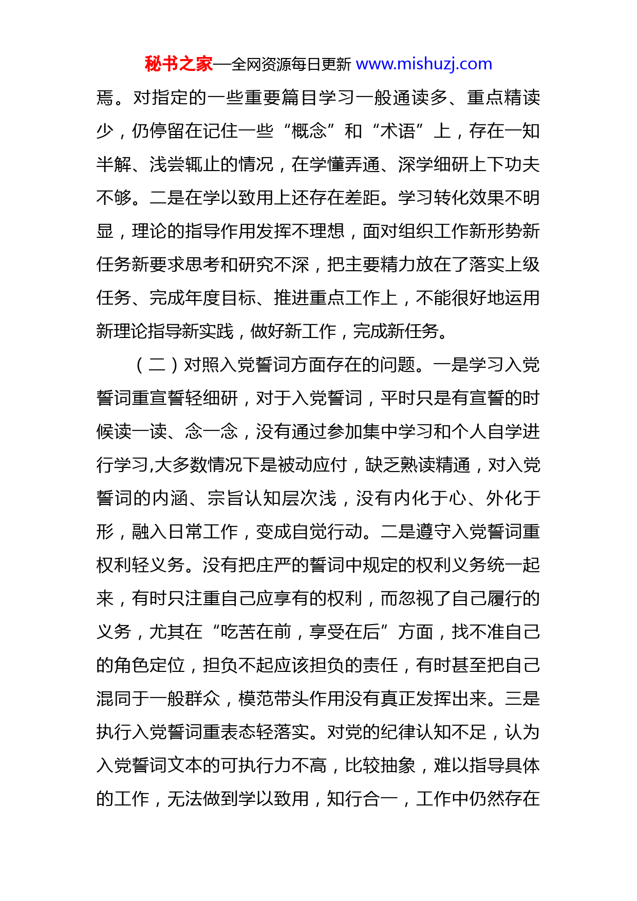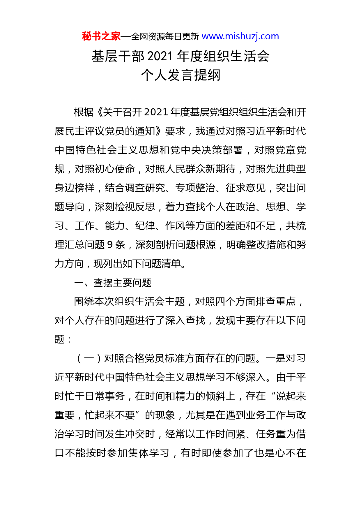 秘书之家—全网资源每日更新www.mishuzj.com基层干部2021年度组织生活会个人发言提纲根据《关于召开2021年度基层党组织组织生活会和开展民主评议党员的通知》要求,我通过对照习近平新时代中国特色社会主义思想和党中央决策部署,对照党章党规,对照初心使命,对照人民群众新期待,对照先进典型身边榜样,结合调查研究、专项整治、征求意见,突出问题导向,深刻检视反思,着力查找个人在政治、思想、学习、工作、能力、纪律、作风等方面的差距和不足,共梳理汇总问题9条,深刻剖析问题根源,明确整改措施和努力方向,现列出如下问题清单。一、查摆主要问题围绕本次组织生活会主题,对照四个方面排查重点,对个人存在的问题进行了深入查找,发现主要存在以下问题:(一)对照合格党员标准方面存在的问题。一是对习近平新时代中国特色社会主义思想学习不够深入。由于平时忙于日常事务,在时间和精力的倾斜上,存在“说起来重要,忙起来不要”的现象,尤其是在遇到业务工作与政治学习时间发生冲突时,经常以工作时间紧、任务重为借口不能按时参加集体学习,有时即使参加了也是心不在秘书之家—全网资源每日更新www.mishuzj.com焉。对指定的一些重要篇目学习一般通读多、重点精读少,仍停留在记住一些“概念”和“术语”上,存在一知半解、浅尝辄止的情况,在学懂弄通、深学细研上下功夫不够。二是在学以致用上还存在差距。学习转化效果不明显,理论的指导作用发挥不理想,面对组织工作新形势新任务新要求思考和研究不深,把主要精力放在了落实上级任务、完成年度目标、推进重点工作上,不能很好地运用新理论指导新实践,做好新工作,完成新任务。(二)对照入党誓词方面存在的问题。一是学习入党誓词重宣誓轻细研,对于入党誓词,平时只是有宣誓的时候读一读、念一念,没有通过参加集中学习和个人自学进行学习,大多数情况下是被动应付,缺乏熟读精通,对入党誓词的内涵、宗旨认知层次浅,没有内化于心、外化于形,融入日常工作,变成自觉行动。二是遵守入党誓词重权利轻义务。没有把庄严的誓词中规定的权利义务统一起来,有时只注重自己应享有的权利,而忽视了自己履行的义务,尤其在“吃苦在前,享受在后”方面,找不准自己的角色定位,担负不起应该担负的责任,有时甚至把自己混同于一般群众,模范带头作用没有真正发挥出来。三是执行入党誓词重表态轻落实。对党的纪律认知不足,认为入党誓词文本的可执行力不高,比较抽象,难以指导具体的工作,无法做到学以致用,知行合一,工作中仍然存在秘书之家—全网资源每日更新www.mishuzj.com执行不严、缺乏一以贯之现象。(三)对照身边先进典型方面存在的问题方面。一是思想觉悟有待提高。作为一名党员干部,虽然在平时的工作生活中,能够立足本职,做好工作,但还没有在工作、生活、学习等各方面走在前、做表率,在身先士卒、发挥党员先锋模范作用方面还不够充分有力。二是主动服务意识不强。习惯于群众来电来信来访反映问题,不能主动走到群众中去发现问题、解决问题,有时虽能走访入户但是走访也是流于形式,走走样子,没有带着问题、带着政策、带着解决问题心态去走访,达不到预期的效果。(四)对照人民群众的期待方面。一是深入基层一线较少,对基层党建工作情况了解不够,到基层调研较少,和群众交流少,对真正的难点、痛点、堵点的突出问题,了解的不够深入,没有紧密联系群众、联系实际,解刨麻雀,认真分析,加以整改解决。二是性子急躁,修养不够。主动到上级汇报思想、交流工作较少。只顾埋头工作,不顾抬头望路。有时担心自己不善言辞反而“坏事”,有简单做事的心理,忽视了“磨刀不误砍柴工”的道理。二、产生问题原因分析针对上述问题,我进行了深入的思考。从表面上看,这些问题虽然出现在日常工作中,但根源却在思想上,主秘书之家—全网资源每日更新www.mishuzj.com要表现在几个方面:一是政治理论学习不深入。在学懂、弄通、做实习近平新时中国特色社会主义思想上不扎实、不深入,主动性、规划性、系统性不足,存在头痛医头、脚痛医脚的现象,客观上以工作忙、压力大、事务性工作多为借口,把学习当成“软指标”,放松了对政治理论和业务知识的深入学习,没有处理好工学关系。二是对党员宗旨意识理解不深。公仆意识淡薄全心全意为人民服务,是我们党的一贯宗旨。但在实际工作中,仅仅满足于干好眼前的工作,对其他方面的工作很少去想、去做。这些问题的根源在于全心全意为人民服务的宗旨观念、做人民公仆的意识淡薄。三是党性修养不坚定。在工作中进取意识、奋斗精神开始消减,出现松懈苗头,只求过得去、不出错,放松了对党性修养的要求,放松了对增强自我净化,自我完善、自我革新、自我提高能力的重视。党性修养不强,思想就容易滑坡,精神就容易空虚,作风就容易松懈,各种问题就会随之而来。四是敢于担当精神不够。担当劲头不足,思想不够解放,工作按部就班、因循守旧、求稳怕变,习惯用老思维、老办法、老套路解决问题和推进工作。有时对个别工作也有所思考,但思想上总有这样那样的顾虑,导致思路秘书之家—全网资源每日更新www.mishuzj.com和想法没有充分实践。很多问题表面上是工作问题,实质还是责任意识和担当精神不