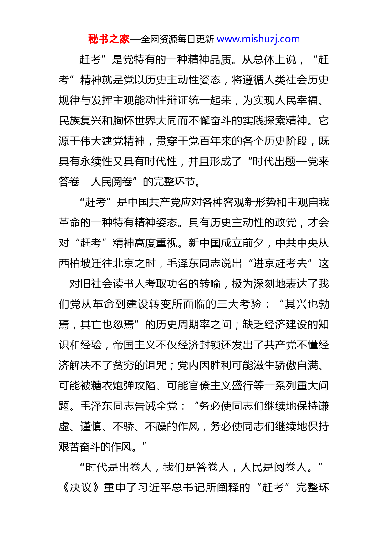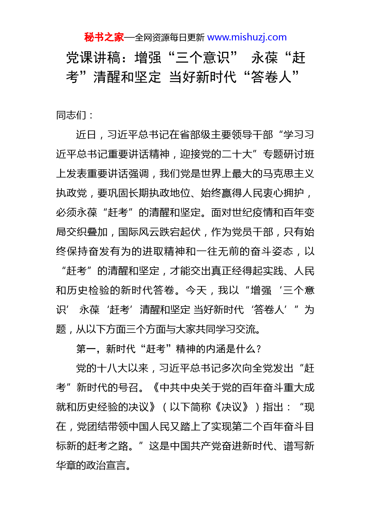 秘书之家—全网资源每日更新www.mishuzj.com党课讲稿:增强“三个意识”永葆“赶考”清醒和坚定当好新时代“答卷人”同志们:近日,习近平总书记在省部级主要领导干部“学习习近平总书记重要讲话精神,迎接党的二十大”专题研讨班上发表重要讲话强调,我们党是世界上最大的马克思主义执政党,要巩固长期执政地位、始终赢得人民衷心拥护,必须永葆“赶考”的清醒和坚定。面对世纪疫情和百年变局交织叠加,国际风云跌宕起伏,作为党员干部,只有始终保持奋发有为的进取精神和一往无前的奋斗姿态,以“赶考”的清醒和坚定,才能交出真正经得起实践、人民和历史检验的新时代答卷。今天,我以“增强‘三个意识’永葆‘赶考’清醒和坚定当好新时代‘答卷人’”为题,从以下方面三个方面与大家共同学习交流。第一,新时代“赶考”精神的内涵是什么?党的十八大以来,习近平总书记多次向全党发出“赶考”新时代的号召。《中共中央关于党的百年奋斗重大成就和历史经验的决议》(以下简称《决议》)指出:“现在,党团结带领中国人民又踏上了实现第二个百年奋斗目标新的赶考之路。”这是中国共产党奋进新时代、谱写新华章的政治宣言。秘书之家—全网资源每日更新www.mishuzj.com赶考”是党特有的一种精神品质。从总体上说,“赶考”精神就是党以历史主动性姿态,将遵循人类社会历史规律与发挥主观能动性辩证统一起来,为实现人民幸福、民族复兴和胸怀世界大同而不懈奋斗的实践探索精神。它源于伟大建党精神,贯穿于党百年来的各个历史阶段,既具有永续性又具有时代性,并且形成了“时代出题—党来答卷—人民阅卷”的完整环节。“赶考”是中国共产党应对各种客观新形势和主观自我革命的一种特有精神姿态。具有历史主动性的政党,才会对“赶考”精神高度重视。新中国成立前夕,中共中央从西柏坡迁往北京之时,毛泽东同志说出“进京赶考去”这一对旧社会读书人考取功名的转喻,极为深刻地表达了我们党从革命到建设转变所面临的三大考验:“其兴也勃焉,其亡也忽焉”的历史周期率之问;缺乏经济建设的知识和经验,帝国主义不仅经济封锁还发出了共产党不懂经济解决不了贫穷的诅咒;党内因胜利可能滋生骄傲自满、可能被糖衣炮弹攻陷、可能官僚主义盛行等一系列重大问题。毛泽东同志告诫全党:“务必使同志们继续地保持谦虚、谨慎、不骄、不躁的作风,务必使同志们继续地保持艰苦奋斗的作风。”“时代是出卷人,我们是答卷人,人民是阅卷人。”《决议》重申了习近平总书记所阐释的“赶考”完整环秘书之家—全网资源每日更新www.mishuzj.com节,使“赶考”具体化、历史化了。将“时代”拟人化,其特殊价值在于具有历史主动性的党因解答时代问题而昭示其理论自觉,以马克思主义世界观和方法论来把握时代脉搏。问题是时代的呼声,人民的呼声表征着时代问题,时代问题就是由反映这个历史阶段的社会矛盾构成的。历史是人民的事业,符合人民事业的历史才是进步的历史。只有人民才是给答题者打分的真正评判者。第二,为什么要永葆“赶考”的清醒和坚定?(一)永葆“赶考”的清醒和坚定,源自基因传承。一代代中华英雄儿女坚持革命理想高于天,永远听党话跟党走,一不怕苦、二不怕死,高度自觉、严明纪律,独立自主、探索创新,全心全意为人民服务,形成了我党军特有的红色基因。这种革命精神的赓续、弘扬和传承,不断拓展、完善和创新,从未在“赶考”路上有丝毫懈怠。革命精神因信仰而目光远大、追求高远,因忠诚而爱党爱国、矢志不渝,因追求而勇于拼搏、自强不息,因忘我而无私奉献,无怨无悔,经受各种考验和检验,始终长盛不衰、青春永驻。(二)永葆“赶考”的清醒和坚定,源自形势任务。1949年3月23日,中共中央即将离开西柏坡前往北京时,毛泽东提出著名的“赶考”命题,说“我们决不当李自成!我们都希望考个好成绩!”70多年的实践证明,秘书之家—全网资源每日更新www.mishuzj.com我们党在这场历史性考试中取得优异成绩。同时,我们党也清醒地认识到,这场考试还在继续,“赶考”是个永恒的时代命题。党的十八大以来,党风廉政建设和反腐败斗争取得举世瞩目的历史性成就,但形势依然严峻复杂,任务依然艰巨繁重,政治问题和经济问题交织,传统腐败和新型腐败交织,腐败问题和不正之风交织,党风廉政建设永远在路上,反腐败没有选择,必须知难而进。(三)永葆“赶考”的清醒和坚定,源自人民期盼。政之所兴,在得民心、顺民意。民心是最大的政治,我们党来自人民,根基在人民,始终与人民群众鱼水情深。党的根本宗旨是全心全意为人民服务,党的各项事业为了人民、植根人民、依靠人民,只有以全面从严治党的实际行动和成效回应人民期盼,才能不断增强人民群众对党中央的信心、信任和信赖,不断厚植党长期执政的政治基础。时代是出卷人,我们是答卷人,人民是阅卷人。我们每一代共产党人薪火相传、接力奋斗,都要不断地接受人民的“考试”、执政的“考试”,确保向人民和历史交出满意的答卷。第三,如何永葆“赶考”的清醒和坚定?(一)要切实增强忧患意识。“生于忧患,死于安乐。”当前,世界百年未有之大变局加速演进,世界之变、时代之变、历史之变的特征更加明显。越是在发展的秘书之家—全