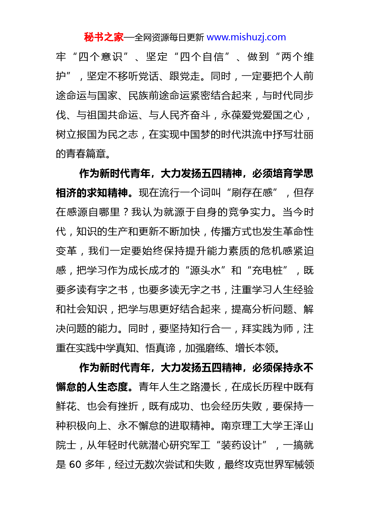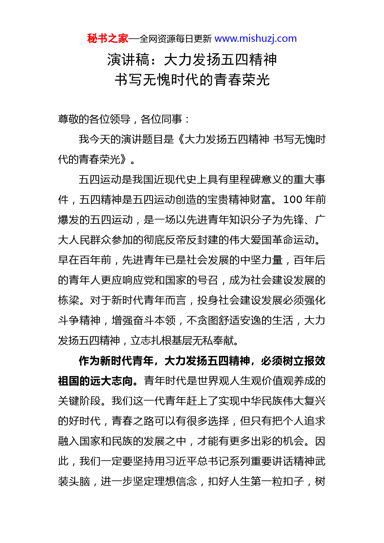 秘书之家—全网资源每日更新www.mishuzj.com演讲稿:大力发扬五四精神书写无愧时代的青春荣光尊敬的各位领导,各位同事:我今天的演讲题目是《大力发扬五四精神书写无愧时代的青春荣光》。五四运动是我国近现代史上具有里程碑意义的重大事件,五四精神是五四运动创造的宝贵精神财富。100年前爆发的五四运动,是一场以先进青年知识分子为先锋、广大人民群众参加的彻底反帝反封建的伟大爱国革命运动。早在百年前,先进青年已是社会发展的中坚力量,百年后的青年人更应响应党和国家的号召,成为社会建设发展的栋梁。对于新时代青年而言,投身社会建设发展必须强化斗争精神,增强奋斗本领,不贪图舒适安逸的生活,大力发扬五四精神,立志扎根基层无私奉献。作为新时代青年,大力发扬五四精神,必须树立报效祖国的远大志向。青年时代是世界观人生观价值观养成的关键阶段。我们这一代青年赶上了实现中华民族伟大复兴的好时代,青春之路可以有很多选择,但只有把个人追求融入国家和民族的发展之中,才能有更多出彩的机会。因此,我们一定要坚持用习近平总书记系列重要讲话精神武装头脑,进一步坚定理想信念,扣好人生第一粒扣子,树秘书之家—全网资源每日更新www.mishuzj.com牢“四个意识”、坚定“四个自信”、做到“两个维护”,坚定不移听党话、跟党走。同时,一定要把个人前途命运与国家、民族前途命运紧密结合起来,与时代同步伐、与祖国共命运、与人民齐奋斗,永葆爱党爱国之心,树立报国为民之志,在实现中国梦的时代洪流中抒写壮丽的青春篇章。作为新时代青年,大力发扬五四精神,必须培育学思相济的求知精神。现在流行一个词叫“刷存在感”,但存在感源自哪里?我认为就源于自身的竞争实力。当今时代,知识的生产和更新不断加快,传播方式也发生革命性变革,我们一定要始终保持提升能力素质的危机感紧迫感,把学习作为成长成才的“源头水”和“充电桩”,既要多读有字之书,也要多读无字之书,注重学习人生经验和社会知识,把学与思更好结合起来,提高分析问题、解决问题的能力。同时,要坚持知行合一,拜实践为师,注重在实践中学真知、悟真谛,加强磨练、增长本领。作为新时代青年,大力发扬五四精神,必须保持永不懈怠的人生态度。青年人生之路漫长,在成长历程中既有鲜花、也会有挫折,既有成功、也会经历失败,要保持一种积极向上、永不懈怠的进取精神。南京理工大学王泽山院士,从年轻时代就潜心研究军工“装药设计”,一搞就是60多年,经过无数次尝试和失败,最终攻克世界军械领秘书之家—全网资源每日更新www.mishuzj.com域多项技术难题,3次获得国家最高科技大奖,十分令人钦佩。现在我们有些年轻人满怀梦想但缺乏实现梦想的动力,渴望成功却没有攻坚克难的勇气,有的事业稍有起色就忘记了创业艰辛。天上不会掉馅饼,任何成功都是奋斗得来的。因此,我们一定要保持一往无前的意志品质,善于从挫折中汲取教训,在压力下经受锻炼,以永不满足、勇争一流的行动为青春增色、为事业加分。青年兴则国家兴,青年强则国家强。五四运动所体现的百折不挠、自强不息的民族精神永不过时,所创造的救亡图存、振兴中华的爱国主义精神永不过时。新时代要有新作为。作为新时代的青年,我们始终要把个人理想融入民族复兴伟大理想和中国特色社会主义思想,在自己的工作岗位上勇当生力军,勇做突击队,脚踏实地,理想远大,努力担当时代赋予的责任,用力书写无愧时代的荣光。我的演讲完毕,谢谢大家!