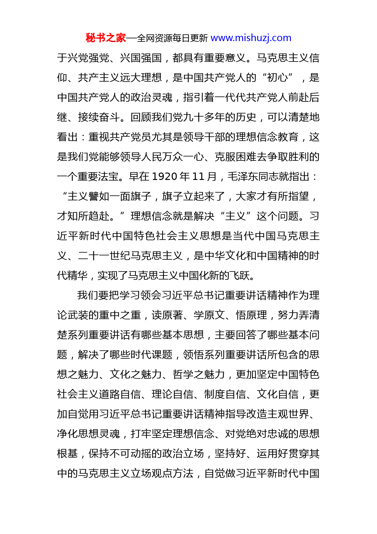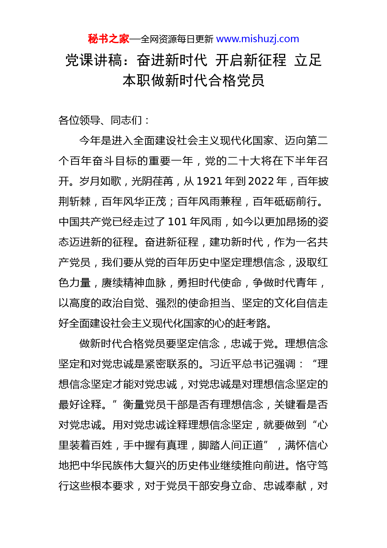 秘书之家—全网资源每日更新www.mishuzj.com党课讲稿:奋进新时代开启新征程立足本职做新时代合格党员各位领导、同志们:今年是进入全面建设社会主义现代化国家、迈向第二个百年奋斗目标的重要一年,党的二十大将在下半年召开。岁月如歌,光阴荏苒,从1921年到2022年,百年披荆斩棘,百年风华正茂;百年风雨兼程,百年砥砺前行。中国共产党已经走过了101年风雨,如今以更加昂扬的姿态迈进新的征程。奋进新征程,建功新时代,作为一名共产党员,我们要从党的百年历史中坚定理想信念,汲取红色力量,赓续精神血脉,勇担时代使命,争做时代青年,以高度的政治自觉、强烈的使命担当、坚定的文化自信走好全面建设社会主义现代化国家的心的赶考路。做新时代合格党员要坚定信念,忠诚于党。理想信念坚定和对党忠诚是紧密联系的。习近平总书记强调:“理想信念坚定才能对党忠诚,对党忠诚是对理想信念坚定的最好诠释。”衡量党员干部是否有理想信念,关键看是否对党忠诚。用对党忠诚诠释理想信念坚定,就要做到“心里装着百姓,手中握有真理,脚踏人间正道”,满怀信心地把中华民族伟大复兴的历史伟业继续推向前进。恪守笃行这些根本要求,对于党员干部安身立命、忠诚奉献,对秘书之家—全网资源每日更新www.mishuzj.com于兴党强党、兴国强国,都具有重要意义。马克思主义信仰、共产主义远大理想,是中国共产党人的“初心”,是中国共产党人的政治灵魂,指引着一代代共产党人前赴后继、接续奋斗。回顾我们党九十多年的历史,可以清楚地看出:重视共产党员尤其是领导干部的理想信念教育,这是我们党能够领导人民万众一心、克服困难去争取胜利的一个重要法宝。早在1920年11月,毛泽东同志就指出:“主义譬如一面旗子,旗子立起来了,大家才有所指望,才知所趋赴。”理想信念就是解决“主义”这个问题。习近平新时代中国特色社会主义思想是当代中国马克思主义、二十一世纪马克思主义,是中华文化和中国精神的时代精华,实现了马克思主义中国化新的飞跃。我们要把学习领会习近平总书记重要讲话精神作为理论武装的重中之重,读原著、学原文、悟原理,努力弄清楚系列重要讲话有哪些基本思想,主要回答了哪些基本问题,解决了哪些时代课题,领悟系列重要讲话所包含的思想之魅力、文化之魅力、哲学之魅力,更加坚定中国特色社会主义道路自信、理论自信、制度自信、文化自信,更加自觉用习近平总书记重要讲话精神指导改造主观世界、净化思想灵魂,打牢坚定理想信念、对党绝对忠诚的思想根基,保持不可动摇的政治立场,坚持好、运用好贯穿其中的马克思主义立场观点方法,自觉做习近平新时代中国秘书之家—全网资源每日更新www.mishuzj.com特色社会主义思想的坚定信仰者和忠实践行者。要经常重温入党誓词,校对思想指标,把好行为之舵,遵守党员的基本权利、义务和党的纪律,把对党忠诚作为人生、事业、奋斗的底色,转化为价值追求和工作准则,保持政治定力,走好每一步路;要把学习党章党规作为人生“必修课”,时刻牢记自己的第一身份是共产党员,第一职责是为党工作,尊崇党章、学习党章、遵守党章、维护党章,守住法律底线、纪律底线、政策底线、道德底线,始终做到在党爱党、在党言党、在党为党。做新时代合格党员要牢记职责,敢于担当。敢于担当是一种品格。古人云“任其职,尽其责;在其位,谋其政”。担当是党员干部职责道义和从政准则,是党员干部干事创业的基本条件。新时代是担当者、奋斗者的时代。敢担当有作为,是党和人民对新时代党员干部的基本要求和殷切期盼。党的干部是党的事业的骨干,是人民的公仆,勇于担当,是一种责任、一种精神、更是一种能力,每个时代有每个时代的历史担当,作为党员干部就是要时刻把想担当、能担当、敢担当作为人生修为和为官从政的时代课题来回答与践行。作为党的干部必须坚持原则、认真负责,面对大是大非敢于亮剑,面对矛盾敢于迎难而上,面对危机敢于挺身而出,面对失误敢于承担责任,面对歪风邪气敢于坚决斗秘书之家—全网资源每日更新www.mishuzj.com争。清正廉洁,党的干部必须敬畏权力、管好权力、慎用权力,守住自己的政治生命,保持拒腐蚀、永不沾的政治本色。要始终胸怀大局、牢记使命,守土有责、守土尽责,以铁的信念、铁的担当把党对人民的庄严承诺,落实到自身积极作为、开拓进取的实际行动中。要保持在工作中学习、在学习中工作的理念,学习前辈们的工作经验,学习同事们的工作方法,学习书本上、文件上的各种知识,不断地增强自己的能力本领;在本职业务上狠下功夫,吃深吃透各项业务相关政策,对业务知识融会贯通,把平凡琐碎的业务做到极致,把棘手难办的业务做到“门清”,真正成为本职业务工作的行家里手;要掌握科学的思想方法和工作方法,处理问题讲究策略,有勇有谋、有胆有识、有理有节。要坚持终身学习的态度。作为每一位党员干部首先要端正学习态度,只有把学习当作一种事业,一种追求,一种责任,一种习惯,学习才有持久的动力。要舍得下功夫,要挤时间,多读书,学习专业理论,了解相关法规政策,把书本上的知识,经过消化吸收、扬弃创新,变成自己的东西,不能浮光掠影、蜻蜓点水、浅尝辄止。还要注意学习方法,要把现实需要作为学习的强