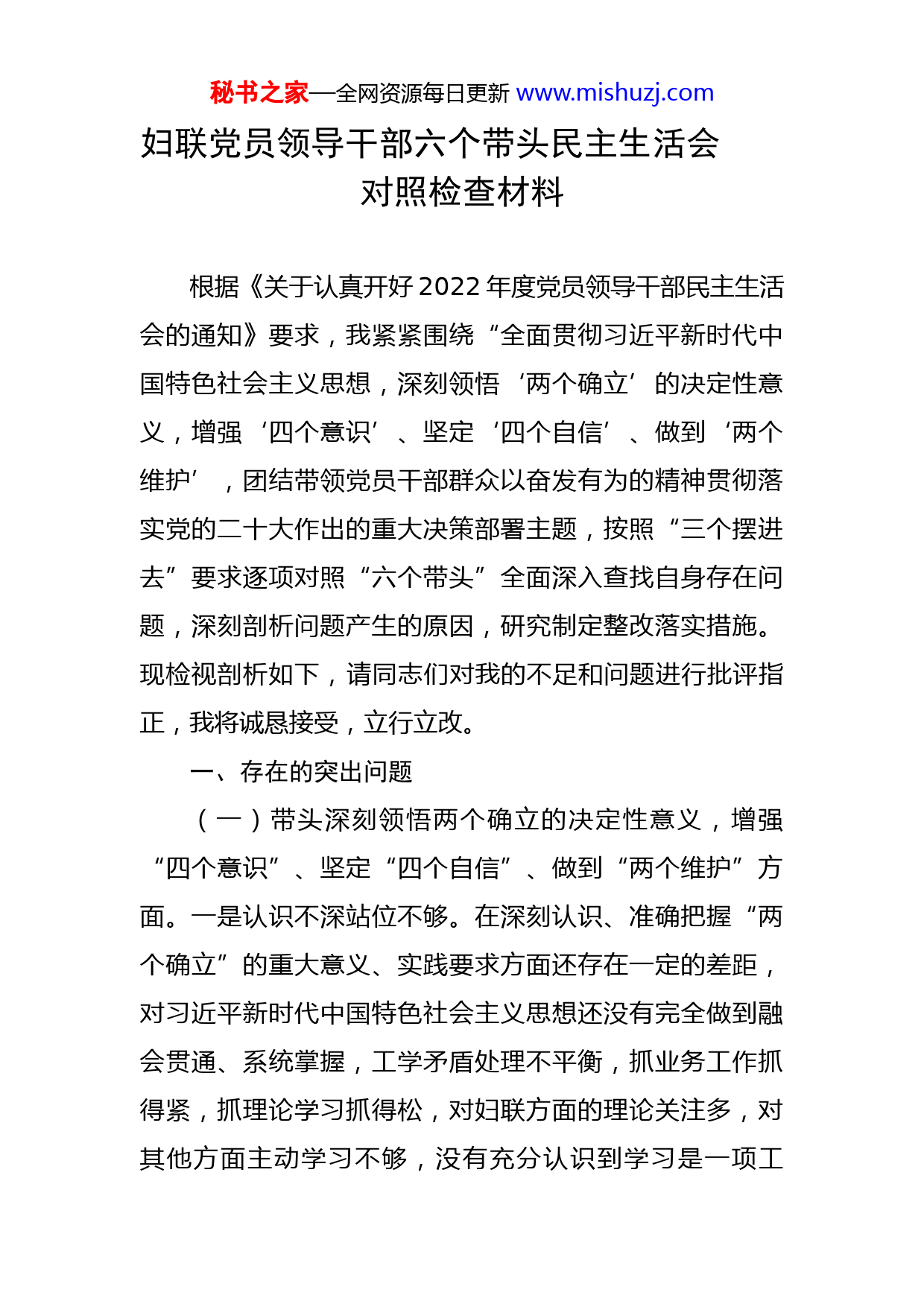 秘书之家—全网资源每日更新www.mishuzj.com妇联党员领导干部六个带头民主生活会对照检查材料根据《关于认真开好2022年度党员领导干部民主生活会的通知》要求,我紧紧围绕“全面贯彻习近平新时代中国特色社会主义思想,深刻领悟‘两个确立’的决定性意义,增强‘四个意识’、坚定‘四个自信’、做到‘两个维护’,团结带领党员干部群众以奋发有为的精神贯彻落实党的二十大作出的重大决策部署主题,按照“三个摆进去”要求逐项对照“六个带头”全面深入查找自身存在问题,深刻剖析问题产生的原因,研究制定整改落实措施。现检视剖析如下,请同志们对我的不足和问题进行批评指正,我将诚恳接受,立行立改。一、存在的突出问题(一)带头深刻领悟两个确立的决定性意义,增强“四个意识”、坚定“四个自信”、做到“两个维护”方面。一是认识不深站位不够。在深刻认识、准确把握“两个确立”的重大意义、实践要求方面还存在一定的差距,对习近平新时代中国特色社会主义思想还没有完全做到融会贯通、系统掌握,工学矛盾处理不平衡,抓业务工作抓得紧,抓理论学习抓得松,对妇联方面的理论关注多,对其他方面主动学习不够,没有充分认识到学习是一项工秘书之家—全网资源每日更新www.mishuzj.com作,也是一项制度,导致理论学习自由度大,从而使得学习的深度不够。二是政治能力不够强。对党的重要决策部署的领会把握还不够深入,对政治大局的认识还缺乏敏锐洞察力,站在全局上思考谋划工作还不够。比如,在工作中,主要按照XX主要领导要求和上级文件精神开展工作,未能做到提前谋划、提前布置,工作的预见性不够。三是理论指导实践不够实。在学以致用、学用结合上做得还不够,在推动XX工作的改革创新、提升伍素质上,抓得还不够扎实。(二)带头用习近平新时代中国特色社会主义思想凝心铸魂方面。一是处理棘手复杂问题的魄力不够。面对深化改革攻坚挺进的形势背景,所分管工作面临越来越多的新情况新问题新考验,有时存在畏难情绪,一些问题还没有得到有效的解决。随着年龄的增长,在牢记我们党的宗旨方面全心全意为职工服务有偏差,特别是如何做好普惠职工的工作方面思路不广,方法不多,有些经过实践证明能够普惠职工的工作没有坚持好,如职工非工伤意外伤害,职工家庭火灾补助等工作推动不力,尽责不够,存在船到码头车到站的思想。(三)带头坚持和加强党的全面领导方面。一是深入基层调研不够经常。存在坚持为干部群众服务思想树立不够好,深入基层不够多,服务群众面不够广的问题。只局秘书之家—全网资源每日更新www.mishuzj.com限在固有的干部服务领域,权益维护还存在死角。有时在推动整体工作落实上统筹不够。二是履职尽责还有差距。面对疫情防控的严峻形势,本人能够奋战一线,加班加点,带领分管部室人员坚持抓隐患摸排、抓常态防控,抓复工复产,确保工作顺利开展。但对照高标准要求,自己在履职状态、担当精神上还有差距和不足。三是还存在关心群众、解决难题不够的现象。工作中服务意识不强,有时坐等上门多,主动问需少,同群众主动沟通、主动关心少,即使交流和谈心也是说教多、倾听少,公事多、感情少;有时对群众反映的热点、难点问题处理不够及时,内心还是有畏难情绪,怕麻烦、怕担责任。(四)带头坚持以人民为中心的发展思想,推动改革发展稳定方面。一是政治敏锐性还不强。对新时期党面临的“四大危险”“四大考验”认识不深,越认真学习习近平总书记重要论述,就越觉得要站稳政治立场,将思想政治建设置于首位,将“政治性”作为妇联工作的灵与魂,就越觉得自己对核心意识和看齐意识的领会不深刻,在维护核心,拥戴核心,向习近平总书记看齐,向党中央看齐,向党的理论和路线方针政策看齐上,有时讲在嘴上、写在纸上、唱高调,搞花架子,做表面文章。二是斗争意识还不强。如对一些消极负面的言论,没有从政治的高度充分认识其严重危害性,有时候在遇到大是大非的问题、秘书之家—全网资源每日更新www.mishuzj.com党员干部发表不正端议论没有及时反驳,认为自己管住自己就行了,没必要争论,没有及时斗争。(五)带头发扬斗争精神,防范化解风险挑战方面。一是落实党风廉政建设责任力度有待加强。存在“说得多、做得少”的现象,抓廉政教育方式方法较为单一,只注重于会议上的案件通报、文件传达、观看警示教育片等形式;自我反省还不够,深入剖析触及思想灵魂还不够。二是监督管理不够严格。对落实全面从严治党的严峻性、复杂性、艰巨性认识不够深刻到位,平时在会上学习部署教育得多,开展廉政谈话、廉政提醒,咬耳扯袖不够经常。对分管领域和干部身上的缺点和错误思想提醒不多、批评教育不够,监督作用发挥不到位,开展工作、部署任务,提要求的时候多,跟踪督查深入推进做的少,检查工作只停留在听听汇报、看看材料、查查资料,喜欢讲成绩,不爱谈问题,目标考核管理、激励约束流于形式。(六)带头落实全面从严治党政治责任方面:能够较好地履行监督执纪执法主责主业,党风廉政建设和反腐败工作贡献力量。但也存在自身落实“一岗双责”不到位的问题,对自己所分管的人员教育监督管理,监督提醒还不够到位,没有真正做到拉下面子、硬起手腕。二、产生问题的根