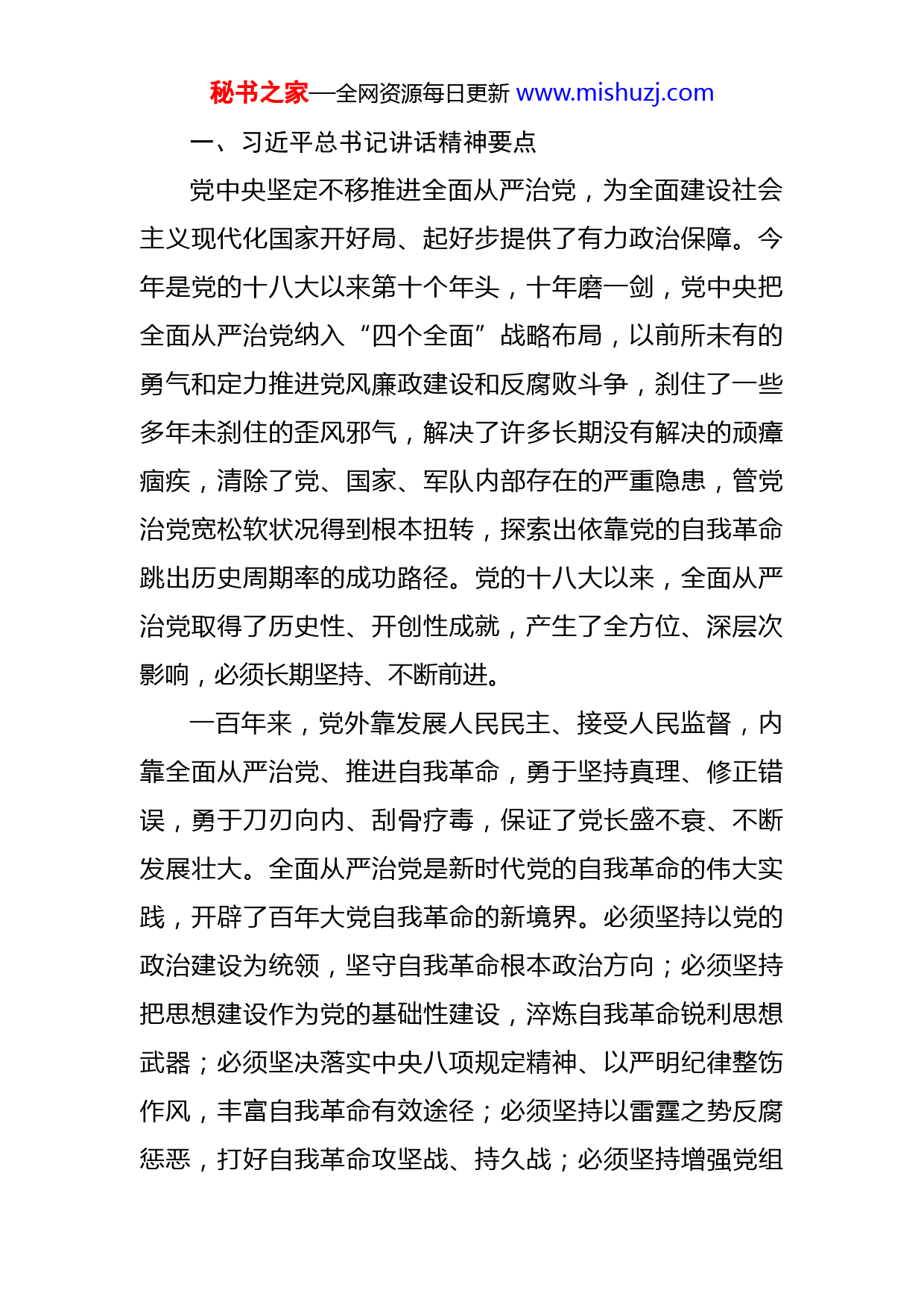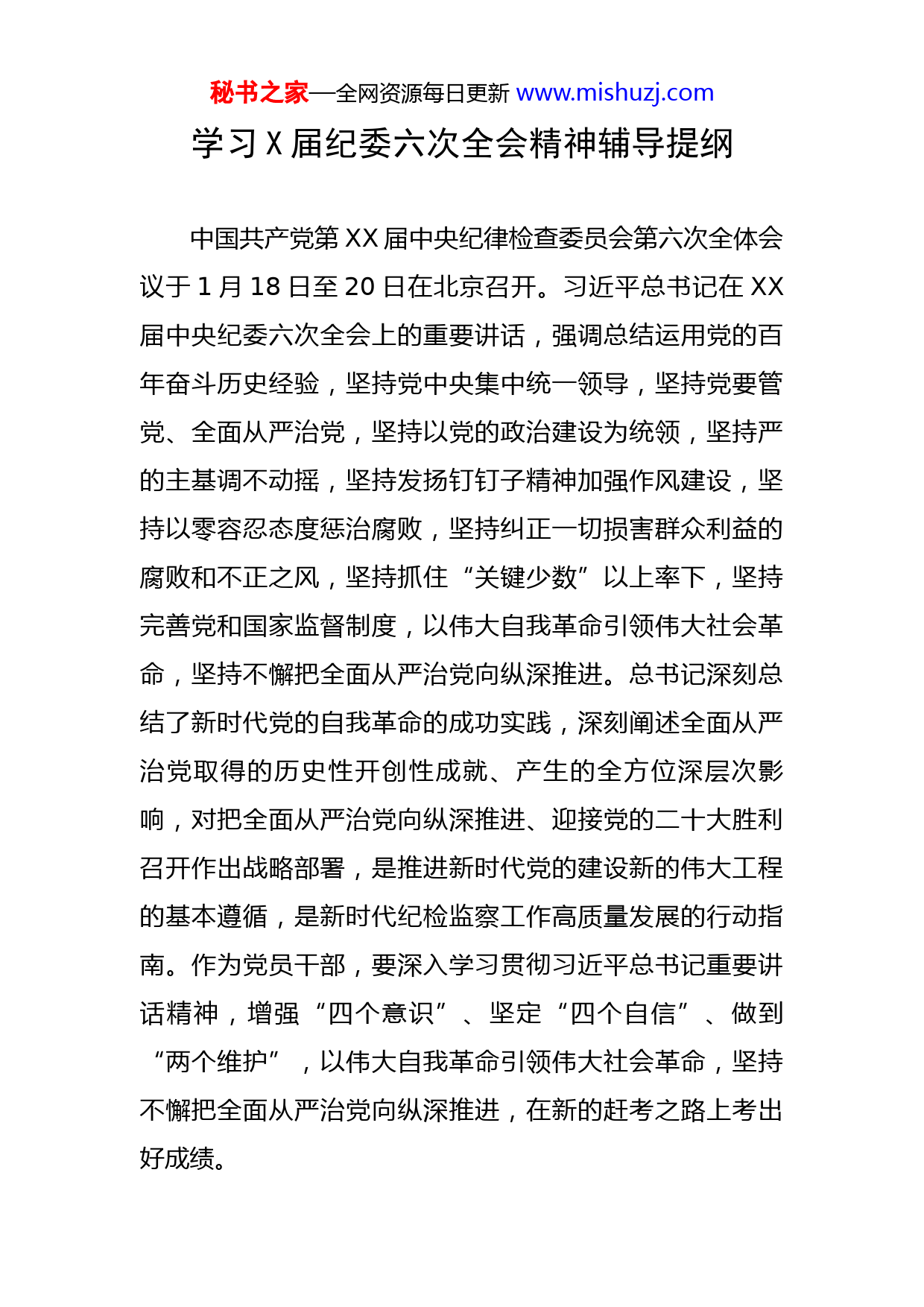 秘书之家—全网资源每日更新www.mishuzj.com学习X届纪委六次全会精神辅导提纲中国共产党第XX届中央纪律检查委员会第六次全体会议于1月18日至20日在北京召开。习近平总书记在XX届中央纪委六次全会上的重要讲话,强调总结运用党的百年奋斗历史经验,坚持党中央集中统一领导,坚持党要管党、全面从严治党,坚持以党的政治建设为统领,坚持严的主基调不动摇,坚持发扬钉钉子精神加强作风建设,坚持以零容忍态度惩治腐败,坚持纠正一切损害群众利益的腐败和不正之风,坚持抓住“关键少数”以上率下,坚持完善党和国家监督制度,以伟大自我革命引领伟大社会革命,坚持不懈把全面从严治党向纵深推进。总书记深刻总结了新时代党的自我革命的成功实践,深刻阐述全面从严治党取得的历史性开创性成就、产生的全方位深层次影响,对把全面从严治党向纵深推进、迎接党的二十大胜利召开作出战略部署,是推进新时代党的建设新的伟大工程的基本遵循,是新时代纪检监察工作高质量发展的行动指南。作为党员干部,要深入学习贯彻习近平总书记重要讲话精神,增强“四个意识”、坚定“四个自信”、做到“两个维护”,以伟大自我革命引领伟大社会革命,坚持不懈把全面从严治党向纵深推进,在新的赶考之路上考出好成绩。秘书之家—全网资源每日更新www.mishuzj.com一、习近平总书记讲话精神要点党中央坚定不移推进全面从严治党,为全面建设社会主义现代化国家开好局、起好步提供了有力政治保障。今年是党的十八大以来第十个年头,十年磨一剑,党中央把全面从严治党纳入“四个全面”战略布局,以前所未有的勇气和定力推进党风廉政建设和反腐败斗争,刹住了一些多年未刹住的歪风邪气,解决了许多长期没有解决的顽瘴痼疾,清除了党、国家、军队内部存在的严重隐患,管党治党宽松软状况得到根本扭转,探索出依靠党的自我革命跳出历史周期率的成功路径。党的十八大以来,全面从严治党取得了历史性、开创性成就,产生了全方位、深层次影响,必须长期坚持、不断前进。一百年来,党外靠发展人民民主、接受人民监督,内靠全面从严治党、推进自我革命,勇于坚持真理、修正错误,勇于刀刃向内、刮骨疗毒,保证了党长盛不衰、不断发展壮大。全面从严治党是新时代党的自我革命的伟大实践,开辟了百年大党自我革命的新境界。必须坚持以党的政治建设为统领,坚守自我革命根本政治方向;必须坚持把思想建设作为党的基础性建设,淬炼自我革命锐利思想武器;必须坚决落实中央八项规定精神、以严明纪律整饬作风,丰富自我革命有效途径;必须坚持以雷霆之势反腐惩恶,打好自我革命攻坚战、持久战;必须坚持增强党组秘书之家—全网资源每日更新www.mishuzj.com织政治功能和组织力凝聚力,锻造敢于善于斗争、勇于自我革命的干部队伍;必须坚持构建自我净化、自我完善、自我革新、自我提高的制度规范体系,为推进伟大自我革命提供制度保障。党的十八大以来,我们继承和发展马克思主义建党学说,总结运用党的百年奋斗历史经验,深入推进管党治党实践创新、理论创新、制度创新,对建设什么样的长期执政的马克思主义政党、怎样建设长期执政的马克思主义政党的规律性认识达到新的高度。这就是坚持党中央集中统一领导,坚持党要管党、全面从严治党,坚持以党的政治建设为统领,坚持严的主基调不动摇,坚持发扬钉钉子精神加强作风建设,坚持以零容忍态度惩治腐败,坚持纠正一切损害群众利益的腐败和不正之风,坚持抓住“关键少数”以上率下,坚持完善党和国家监督制度,形成全面覆盖、常态长效的监督合力。要巩固拓展党史学习教育成果,更加坚定自觉地牢记初心使命、开创发展新局。要深入学习贯彻党的XX届X中X会精神,持之以恒推进党史学习、教育、宣传,引导全党坚定历史自信,让初心使命在内心深处真正扎根,把忠诚于党和人民落到行动上,继承弘扬党的光荣传统和优良作风,为党和人民事业赤诚奉献,在新的赶考之路上考出好成绩。秘书之家—全网资源每日更新www.mishuzj.com要强化政治监督,确保完整、准确、全面贯彻新发展理念。要把握新发展阶段、贯彻新发展理念、构建新发展格局、推动高质量发展,引导督促党员、干部真正悟透党中央大政方针,时时处处向党中央看齐,扎扎实实贯彻党中央决策部署,不打折扣、不做表面文章,纠正自由主义、本位主义、保护主义,不因一时一地利益而打小算盘、耍小聪明,确保执行不偏向、不变通、不走样。要保持反腐败政治定力,不断实现不敢腐、不能腐、不想腐一体推进的战略目标。我们必须清醒认识到,腐败和反腐败较量还在激烈进行,并呈现出一些新的阶段性特征,防范形形色色的利益集团成伙作势、“围猎”腐蚀还任重道远,有效应对腐败手段隐形变异、翻新升级还任重道远,彻底铲除腐败滋生土壤、实现海晏河清还任重道远,清理系统性腐败、化解风险隐患还任重道远。我们要保持清醒头脑,永远吹冲锋号,牢记反腐败永远在路上。只要存在腐败问题产生的土壤和条件,腐败现象就不会根除,我们的反腐败斗争也就不可能停歇。领导干部特别是高级干部要带头落实关于加强新时代廉洁文化建设的意见,从思想上固本培元,提高党性觉悟,增强拒腐防变能力。领导干部要增强政治敏锐性和政治鉴别力