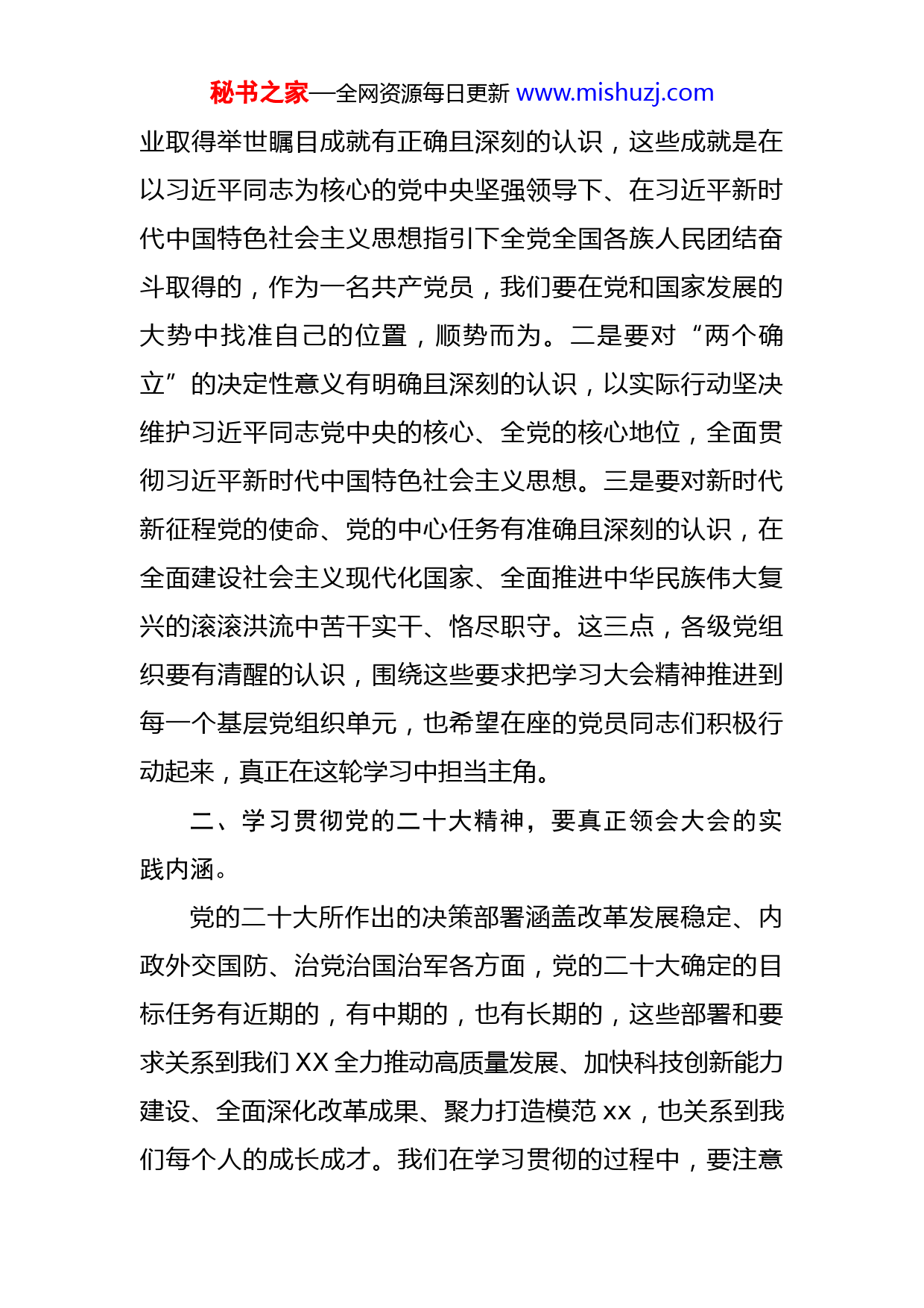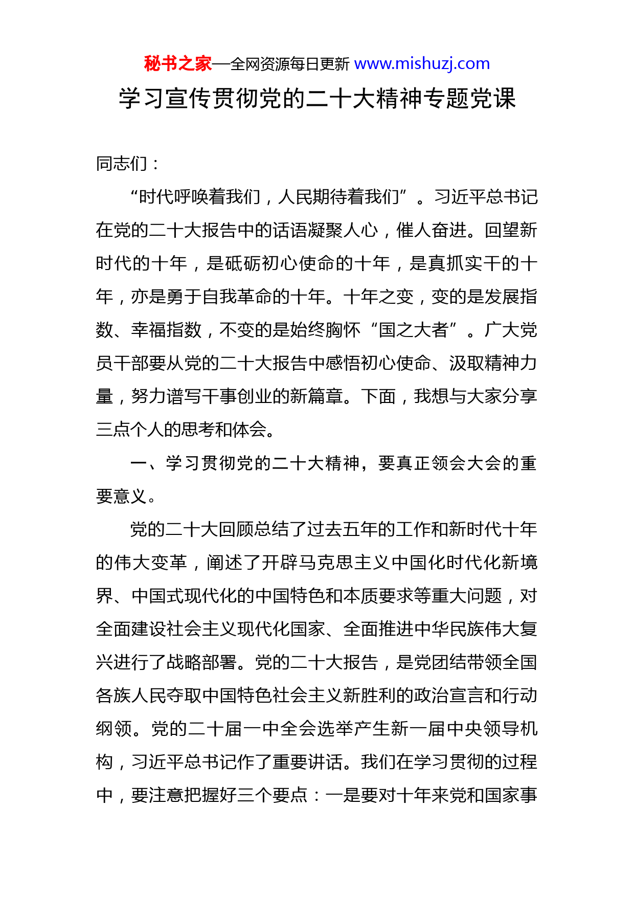 秘书之家—全网资源每日更新www.mishuzj.com学习宣传贯彻党的二十大精神专题党课同志们:“时代呼唤着我们,人民期待着我们”。习近平总书记在党的二十大报告中的话语凝聚人心,催人奋进。回望新时代的十年,是砥砺初心使命的十年,是真抓实干的十年,亦是勇于自我革命的十年。十年之变,变的是发展指数、幸福指数,不变的是始终胸怀“国之大者”。广大党员干部要从党的二十大报告中感悟初心使命、汲取精神力量,努力谱写干事创业的新篇章。下面,我想与大家分享三点个人的思考和体会。一、学习贯彻党的二十大精神,要真正领会大会的重要意义。党的二十大回顾总结了过去五年的工作和新时代十年的伟大变革,阐述了开辟马克思主义中国化时代化新境界、中国式现代化的中国特色和本质要求等重大问题,对全面建设社会主义现代化国家、全面推进中华民族伟大复兴进行了战略部署。党的二十大报告,是党团结带领全国各族人民夺取中国特色社会主义新胜利的政治宣言和行动纲领。党的二十届一中全会选举产生新一届中央领导机构,习近平总书记作了重要讲话。我们在学习贯彻的过程中,要注意把握好三个要点:一是要对十年来党和国家事秘书之家—全网资源每日更新www.mishuzj.com业取得举世瞩目成就有正确且深刻的认识,这些成就是在以习近平同志为核心的党中央坚强领导下、在习近平新时代中国特色社会主义思想指引下全党全国各族人民团结奋斗取得的,作为一名共产党员,我们要在党和国家发展的大势中找准自己的位置,顺势而为。二是要对“两个确立”的决定性意义有明确且深刻的认识,以实际行动坚决维护习近平同志党中央的核心、全党的核心地位,全面贯彻习近平新时代中国特色社会主义思想。三是要对新时代新征程党的使命、党的中心任务有准确且深刻的认识,在全面建设社会主义现代化国家、全面推进中华民族伟大复兴的滚滚洪流中苦干实干、恪尽职守。这三点,各级党组织要有清醒的认识,围绕这些要求把学习大会精神推进到每一个基层党组织单元,也希望在座的党员同志们积极行动起来,真正在这轮学习中担当主角。二、学习贯彻党的二十大精神,要真正领会大会的实践内涵。党的二十大所作出的决策部署涵盖改革发展稳定、内政外交国防、治党治国治军各方面,党的二十大确定的目标任务有近期的,有中期的,也有长期的,这些部署和要求关系到我们XX全力推动高质量发展、加快科技创新能力建设、全面深化改革成果、聚力打造模范xx,也关系到我们每个人的成长成才。我们在学习贯彻的过程中,要注意秘书之家—全网资源每日更新www.mishuzj.com把握好三个关键:一是要在党中央关于国内外形势的分析研判中找到适合我们发展的机遇,结合疫情防控不断变化的复杂形势和市场规模不断缩减的压力,增强忧患意识,强化底线思维,未雨绸缪做好思想准备和工作准备。二是要在各项具体工作中弘扬伟大建党精神,特别是要敢于斗争、善于斗争,担当作为、求真务实,边学习边把各项工作抓紧抓好,边贯彻边不断形成工作成效。三是要把坚持和加强党中央集中统一领导记在心上、落在实处,通过严格遵守党章和党内政治生活准则,提升增强“四个意识”、坚定“四个自信”、做到“两个维护”的实践能力,推进政治判断力、政治领悟力、政治执行力落到实处。这三点,全体党员干部要不断提醒自己,党的二十大精神丰富且厚重,要完全吃透需要狠下功夫、勤下功夫,报告中的任何内容都与我们的工作紧密相关,不能有所忽略,更不能打哪怕一丁点儿折扣。三、学习贯彻党的二十大精神,要真正把自己摆进去、把工作摆进去。党的二十大作出了很多新的部署、提出了很多新的要求,作为一名共产党员,如果学做分离、知行脱节,就难以达到学习目的,学习也就失去了意义、更无从贯彻落实。习近平总书记在报告中对广大青年提出的“坚定不移听党话、跟党走,怀抱梦想又脚踏实地,敢想敢为又善作秘书之家—全网资源每日更新www.mishuzj.com善成”的要求,十分形象地描摹出了共产党员应该有的奋斗姿态。对每一名共产党员,我们在学习贯彻的过程中,要注意把握好三个重点:一是要以实际行动诠释忠诚,“对党忠诚、永不叛党”是写在入党誓词里面的,是对党员党性的基本要求。对党和人民绝对、彻底、无条件的忠诚是广大党员,特别是党员干部要坚守的政治品格,是重大原则问题,这个认识必须要到位。作为一名96年入党的老党员,我有幸经历了改革开放的高潮,亲眼见证了祖国大地发生的翻天覆地变化,深切感受到党的事业的伟大,能够成为党的一员,确实感到十分自豪。我们每位共产党员都应当为自己是其中的一员而倍感光荣、感恩报恩,把党摆在心头正中,不忘初心、不改初衷,忠诚于党、忠诚于事业、忠诚于岗位,坚定执行党组织的决策部署。二是要以实际行动诠释担当,担任党委书记的X年来,我和机关、基层的同志接触都比较多,感觉大家作风扎实、工作努力,付出了很多心血,我对大家的工作是满意的。我常讲,党员干部要注重把勇于担当作为思想自觉和行为追求,发挥积极性主动性创造性把各方面工作跟上,做全XX的表率。从思想上而言,就是要胸怀“国之大者”,以xx的利益最大化为重来考虑问题、处理问题,使各项工作紧贴党组织需要、适