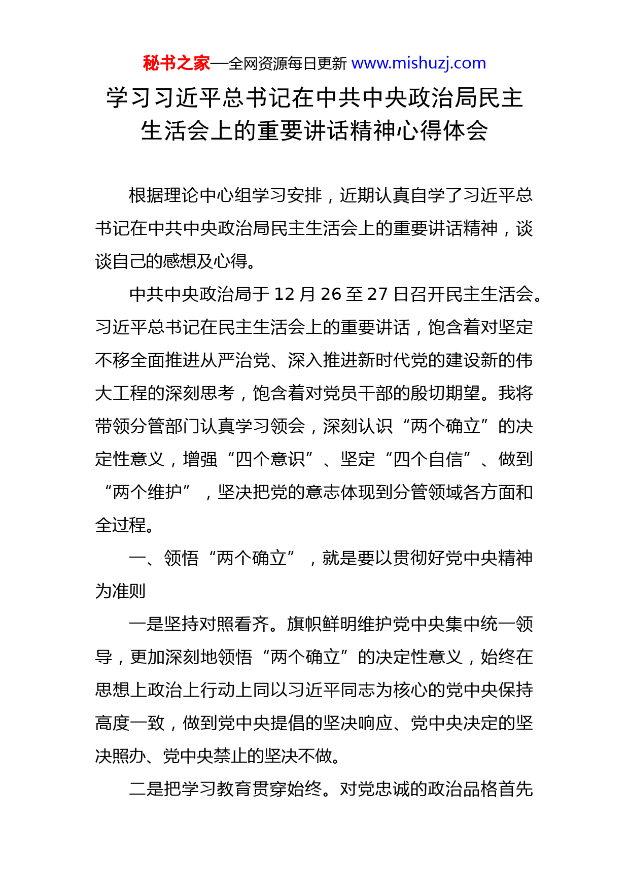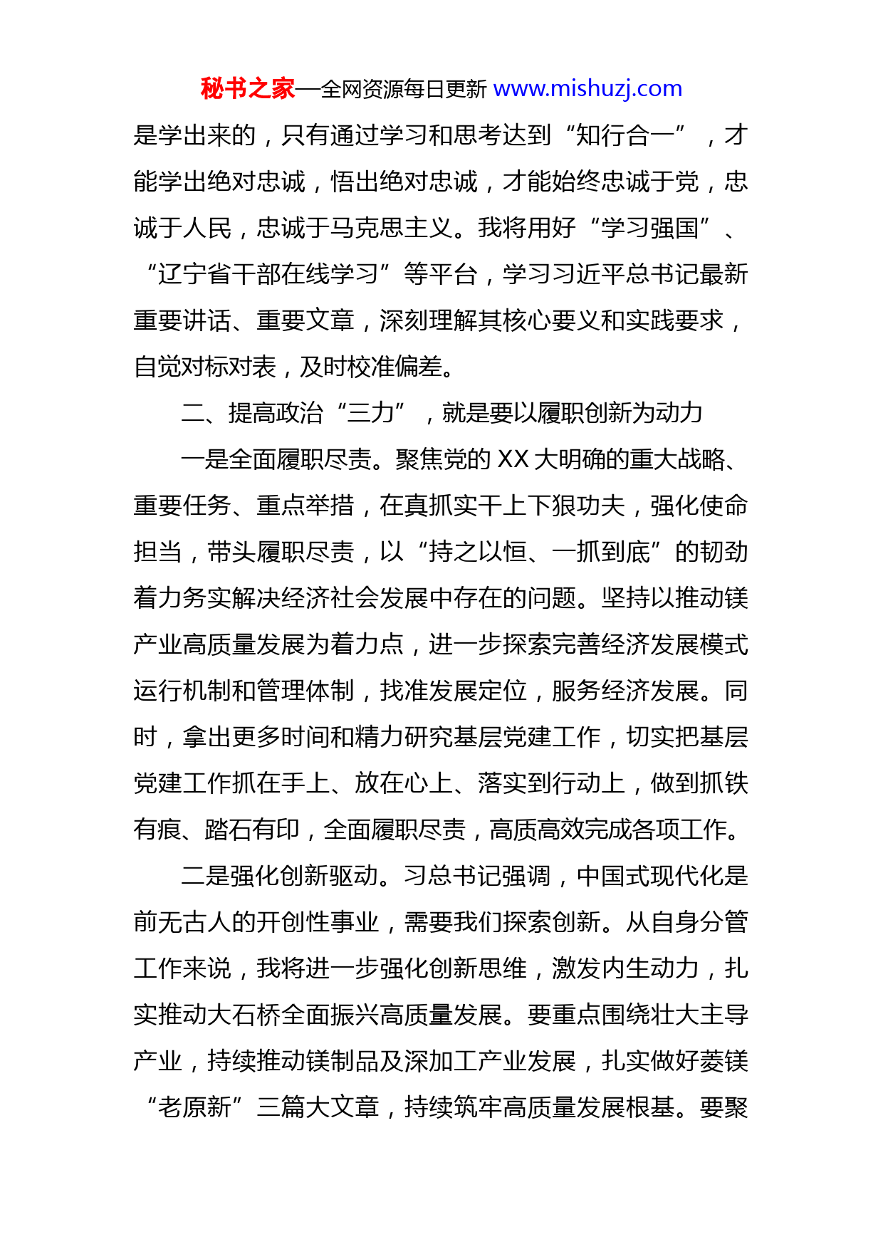 秘书之家—全网资源每日更新www.mishuzj.com学习习近平总书记在中共中央政治局民主生活会上的重要讲话精神心得体会根据理论中心组学习安排,近期认真自学了习近平总书记在中共中央政治局民主生活会上的重要讲话精神,谈谈自己的感想及心得。中共中央政治局于12月26至27日召开民主生活会。习近平总书记在民主生活会上的重要讲话,饱含着对坚定不移全面推进从严治党、深入推进新时代党的建设新的伟大工程的深刻思考,饱含着对党员干部的殷切期望。我将带领分管部门认真学习领会,深刻认识“两个确立”的决定性意义,增强“四个意识”、坚定“四个自信”、做到“两个维护”,坚决把党的意志体现到分管领域各方面和全过程。一、领悟“两个确立”,就是要以贯彻好党中央精神为准则一是坚持对照看齐。旗帜鲜明维护党中央集中统一领导,更加深刻地领悟“两个确立”的决定性意义,始终在思想上政治上行动上同以习近平同志为核心的党中央保持高度一致,做到党中央提倡的坚决响应、党中央决定的坚决照办、党中央禁止的坚决不做。二是把学习教育贯穿始终。对党忠诚的政治品格首先秘书之家—全网资源每日更新www.mishuzj.com是学出来的,只有通过学习和思考达到“知行合一”,才能学出绝对忠诚,悟出绝对忠诚,才能始终忠诚于党,忠诚于人民,忠诚于马克思主义。我将用好“学习强国”、“辽宁省干部在线学习”等平台,学习习近平总书记最新重要讲话、重要文章,深刻理解其核心要义和实践要求,自觉对标对表,及时校准偏差。二、提高政治“三力”,就是要以履职创新为动力一是全面履职尽责。聚焦党的XX大明确的重大战略、重要任务、重点举措,在真抓实干上下狠功夫,强化使命担当,带头履职尽责,以“持之以恒、一抓到底”的韧劲着力务实解决经济社会发展中存在的问题。坚持以推动镁产业高质量发展为着力点,进一步探索完善经济发展模式运行机制和管理体制,找准发展定位,服务经济发展。同时,拿出更多时间和精力研究基层党建工作,切实把基层党建工作抓在手上、放在心上、落实到行动上,做到抓铁有痕、踏石有印,全面履职尽责,高质高效完成各项工作。二是强化创新驱动。习总书记强调,中国式现代化是前无古人的开创性事业,需要我们探索创新。从自身分管工作来说,我将进一步强化创新思维,激发内生动力,扎实推动大石桥全面振兴高质量发展。要重点围绕壮大主导产业,持续推动镁制品及深加工产业发展,扎实做好菱镁“老原新”三篇大文章,持续筑牢高质量发展根基。要聚秘书之家—全网资源每日更新www.mishuzj.com焦争创国家创新型县,深入实施主导产业“智能制造”工程和中小企业“数字化赋能”“节能减排”等行动,全力拖动技改升级项目建设,再打造一批绿色工厂和智能车间。三、狠抓工作落实,就是要以担当实干为根本一是善于担当作为。习总书记提出,把党的XX大描绘的宏伟蓝图变成美好现实,需要各级领导干部担当作为。我将深入学习贯彻落实党的XX大精神,深入贯彻新发展理念,聚焦高质量发展目标,紧扣中心任务,带头崇尚实干狠抓落实,在坚决做好疫情防控、防范化解重大风险、环保整治的基础上,以深化供给侧结构性改革为主线,集中精力抓好产业发展、招商引资、民生补短板、生态文明建设等各项工作,扎实推动各项事业发展取得新成效。二是发扬斗争精神。要敢于斗争、善于斗争,知重负重、知难克难、知险化险。主动识变应变求变,更好地统筹发展与安全,更好地防范化解风险挑战,在各种困难挑战面前始终充满激情、富于创造、勇于担当,依靠顽强斗争打开事业发展新天地。四、强化作风建设,就是要以清正廉洁为关键一是带头贯彻落实各项廉洁规定。认真践行廉洁从政承诺,自觉遵守党的各项制度和纪律。按照《中国共产党章程》的各项规定严格要求自己,自觉遵守政治纪律和政治规矩,让纪律意识和规矩意识成为工作和生活的出发点秘书之家—全网资源每日更新www.mishuzj.com和基准点,做到自重、自省、自警,努力抵制不正之风侵蚀,不搞特权、不谋私利,老老实实做人,踏踏实实干事自觉接受党组织和群众的监督,始终保持艰苦奋斗、求真务实、清正廉洁的工作作风。二是坚持把全面从严治党牢牢抓在手上。把提高治理能力作为新时代干部队伍建设的重大任务,坚持严管和厚爱结合、激励和约束并重,带领分管领域党员干部坚定坚决贯彻落实中央、省市的各项决策部署。坚持把制度执行力和治理能力作为干部选拔任用、考核评价的重要依据,使干部能上能下成为常态。