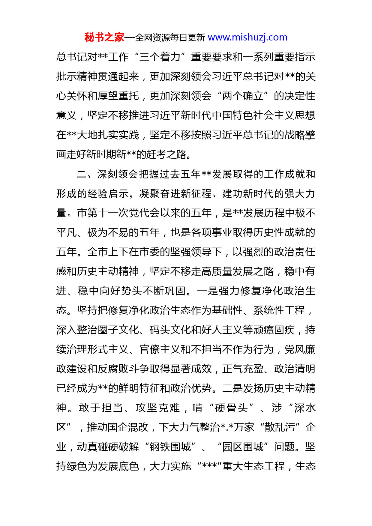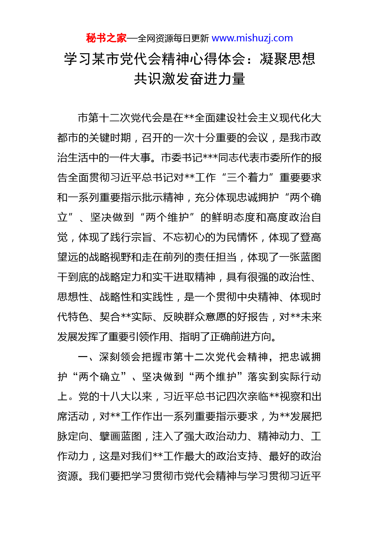 秘书之家—全网资源每日更新www.mishuzj.com学习某市党代会精神心得体会:凝聚思想共识激发奋进力量市第十二次党代会是在全面建设社会主义现代化大都市的关键时期,召开的一次十分重要的会议,是我市政治生活中的一件大事。市委书记同志代表市委所作的报告全面贯彻习近平总书记对工作“三个着力”重要要求和一系列重要指示批示精神,充分体现忠诚拥护“两个确立”、坚决做到“两个维护”的鲜明态度和高度政治自觉,体现了践行宗旨、不忘初心的为民情怀,体现了登高望远的战略视野和走在前列的责任担当,体现了一张蓝图干到底的战略定力和实干进取精神,具有很强的政治性、思想性、战略性和实践性,是一个贯彻中央精神、体现时代特色、契合实际、反映群众意愿的好报告,对未来发展发挥了重要引领作用、指明了正确前进方向。一、深刻领会把握市第十二次党代会精神,把忠诚拥护“两个确立”、坚决做到“两个维护”落实到实际行动上。党的十八大以来,习近平总书记四次亲临视察和出席活动,对工作作出一系列重要指示要求,为发展把脉定向、擘画蓝图,注入了强大政治动力、精神动力、工作动力,这是对我们工作最大的政治支持、最好的政治资源。我们要把学习贯彻市党代会精神与学习贯彻习近平秘书之家—全网资源每日更新www.mishuzj.com总书记对工作“三个着力”重要要求和一系列重要指示批示精神贯通起来,更加深刻领会习近平总书记对的关心关怀和厚望重托,更加深刻领会“两个确立”的决定性意义,坚定不移推进习近平新时代中国特色社会主义思想在大地扎实实践,坚定不移按照习近平总书记的战略擘画走好新时期新的赶考之路。二、深刻领会把握过去五年发展取得的工作成就和形成的经验启示,凝聚奋进新征程、建功新时代的强大力量。市第十一次党代会以来的五年,是发展历程中极不平凡、极为不易的五年,也是各项事业取得历史性成就的五年。全市上下在市委的坚强领导下,以强烈的政治责任感和历史主动精神,坚定不移走高质量发展之路,稳中有进、稳中向好势头不断巩固。一是强力修复净化政治生态。坚持把修复净化政治生态作为基础性、系统性工程,深入整治圈子文化、码头文化和好人主义等顽瘴固疾,持续治理形式主义、官僚主义和不担当不作为行为,党风廉政建设和反腐败斗争取得显著成效,正气充盈、政治清明已经成为的鲜明特征和政治优势。二是发扬历史主动精神。敢于担当、攻坚克难,啃“硬骨头”、涉“深水区”,推动国企混改,下大力气整治.万家“散乱污”企业,动真碰硬破解“钢铁围城”、“园区围城”问题。坚持绿色为发展底色,大力实施“”重大生态工程,生态秘书之家—全网资源每日更新www.mishuzj.com环境质量明显提升,天更蓝了、地更绿了、水更清了、空气更清新了。三是民生答卷有温度有质感。牢固树立以人民为中心的发展思想,带着百姓关切、怀着为民情怀、挂着群众冷暖,坚持每年实施项民心工程,棚户区改造、提前和延长供暖、解决历史遗留产权证办理问题等一件件“小实事”汇聚成可观可感的“大民生”,群众更加心齐气顺。四是统筹疫情防控和经济社会发展取得重大战略成果。坚持人民至上、生命至上,坚持疫情防控总策略、总方针,科学精准、以快制快,打赢了“一船两机三楼”遭遇战、进口冷链阻击战、奥密克戎疫情攻坚战,构筑起首都疫情防控“护城河”,展现了疫情防控的新担当,有力维护了人民群众生命健康,也为经济社会发展创造了条件、提供了保障。三、深刻领会把握全面建设社会主义现代化大都市的总体要求和奋斗目标,努力为高质量发展添砖加瓦、喝彩加力。未来5年是大有可为的战略机遇期、优势叠加的历史窗口期,是处于转型升级的决战决胜期、构建新发展格局的争先进位期。要抢抓战略机遇期和窗口期,增强历史紧迫感、历史责任感,咬定目标,担当实干。要以人民至上的价值取向,恪守初心、增强本领,深化践行初心使命、矢志担当作为的思想认识,全面提升干事创业能力,以干部的辛苦指数换来群众的幸福指数,以实打实的秘书之家—全网资源每日更新www.mishuzj.com发展成果不断惠及广大人民群众。要以锲而不舍的责任意识,紧盯工作、全力推进,时刻牢记市政府研究室以文辅政的重要职责,聚焦提笔能写、开口能讲、咨政能研的目标,统筹推进学习工作化、工作学习化,坚持求知善读、注重思考,吃透“上情、中情、下情、外情”,在履职尽责、当好参谋助手上下功夫。要以舍我其谁的担当精神,履职尽责、真抓实干,保持“时时放心不下”的责任感,以“功成不必在我”的精神境界和“功成必定有我”的责任担当,一心一意谋发展,心无旁骛干事业,以舍我其谁的担当精神,履职尽责、真抓实干。