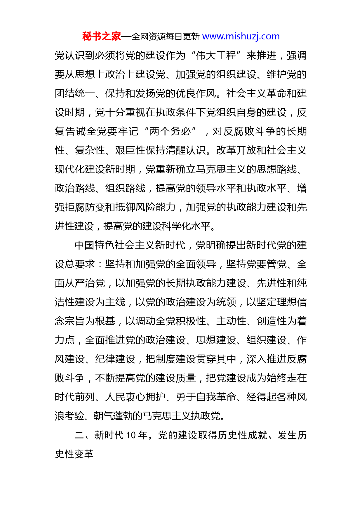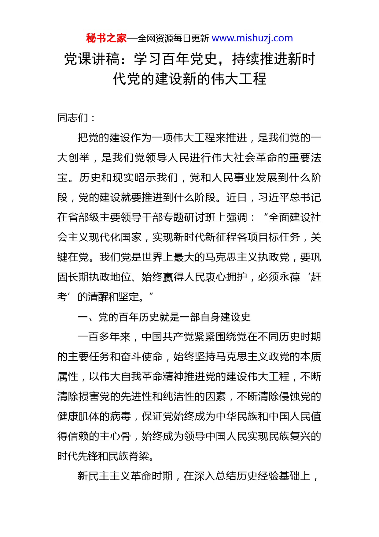 秘书之家—全网资源每日更新www.mishuzj.com党课讲稿:学习百年党史,持续推进新时代党的建设新的伟大工程同志们:把党的建设作为一项伟大工程来推进,是我们党的一大创举,是我们党领导人民进行伟大社会革命的重要法宝。历史和现实昭示我们,党和人民事业发展到什么阶段,党的建设就要推进到什么阶段。近日,习近平总书记在省部级主要领导干部专题研讨班上强调:“全面建设社会主义现代化国家,实现新时代新征程各项目标任务,关键在党。我们党是世界上最大的马克思主义执政党,要巩固长期执政地位、始终赢得人民衷心拥护,必须永葆‘赶考’的清醒和坚定。”一、党的百年历史就是一部自身建设史一百多年来,中国共产党紧紧围绕党在不同历史时期的主要任务和奋斗使命,始终坚持马克思主义政党的本质属性,以伟大自我革命精神推进党的建设伟大工程,不断清除损害党的先进性和纯洁性的因素,不断清除侵蚀党的健康肌体的病毒,保证党始终成为中华民族和中国人民值得信赖的主心骨,始终成为领导中国人民实现民族复兴的时代先锋和民族脊梁。新民主主义革命时期,在深入总结历史经验基础上,秘书之家—全网资源每日更新www.mishuzj.com党认识到必须将党的建设作为“伟大工程”来推进,强调要从思想上政治上建设党、加强党的组织建设、维护党的团结统一、保持和发扬党的优良作风。社会主义革命和建设时期,党十分重视在执政条件下党组织自身的建设,反复告诫全党要牢记“两个务必”,对反腐败斗争的长期性、复杂性、艰巨性保持清醒认识。改革开放和社会主义现代化建设新时期,党重新确立马克思主义的思想路线、政治路线、组织路线,提高党的领导水平和执政水平、增强拒腐防变和抵御风险能力,加强党的执政能力建设和先进性建设,提高党的建设科学化水平。中国特色社会主义新时代,党明确提出新时代党的建设总要求:坚持和加强党的全面领导,坚持党要管党、全面从严治党,以加强党的长期执政能力建设、先进性和纯洁性建设为主线,以党的政治建设为统领,以坚定理想信念宗旨为根基,以调动全党积极性、主动性、创造性为着力点,全面推进党的政治建设、思想建设、组织建设、作风建设、纪律建设,把制度建设贯穿其中,深入推进反腐败斗争,不断提高党的建设质量,把党建设成为始终走在时代前列、人民衷心拥护、勇于自我革命、经得起各种风浪考验、朝气蓬勃的马克思主义执政党。二、新时代10年,党的建设取得历史性成就、发生历史性变革秘书之家—全网资源每日更新www.mishuzj.com实现伟大梦想、进行伟大斗争、推进伟大事业,必须建设伟大工程。2012年11月15日,习近平总书记在中外记者见面会上庄严宣示:“新形势下,我们党面临着许多严峻挑战,党内存在着许多亟待解决的问题。尤其是一些党员干部中发生的贪污腐败、脱离群众、形式主义、官僚主义等问题,必须下大气力解决。全党必须警醒起来。打铁还需自身硬。”党的十八大以来,习近平总书记立足中国特色社会主义进入新时代这个新的历史方位,回答和解决了坚持和发展新时代中国特色社会主义究竟需要一个什么样的党、怎样建设这样一个党这一新时代中国马克思主义执政党建设的重大课题,提出了新时代党的建设必须坚持的重大政治原则,明确了新时代党的建设目标,制定了新时代党的建设主线,确立了新时代党的建设的总体布局,做出了新时代党的建设的战略部署。从伟大实践来看,以习近平同志为核心的党中央针对党内一度存在的“七个有之”等严重影响党的形象和威信、严重损害党群干群关系的突出问题,以猛药去疴、重典治乱的决心,以刮骨疗毒、壮士断腕的勇气,以永远在路上的清醒和坚定,坚持严的主基调,突出抓住“关键少数”,落实主体责任和监督责任,强化监督执纪问责,把全面从严治党贯穿于党的建设各方面。以党的政治建设为统领,抓住了马克思主义执政党建设的根本点、关键点,秘书之家—全网资源每日更新www.mishuzj.com对党的各方面建设必将起到纲举目张的作用。以坚定理想信念宗旨为根基,强调的是共产党人的初心和政治灵魂。通过加强党的建设,使广大党员干部自觉成为共产主义远大理想和中国特色社会主义共同理想的坚定信仰者和忠实实践者。以调动全党积极性、主动性、创造性为着力点,强调的是推进新时代中国特色社会主义伟大事业必须尊重党员的主体地位和首创精神,最大限度调动广大党员干部积极性、主动性、创造性,推动形成想作为、敢作为、善作为的良好政治生态。经过坚决斗争,全面从严治党的政治引领和政治保障作用充分发挥,党的自我净化、自我完善、自我革新、自我提高能力显著增强,管党治党宽松软状况得到根本扭转,反腐败斗争取得压倒性胜利并全面巩固,消除了党、国家、军队内部存在的严重隐患,党在革命性锻造中更加坚强。我们党勇于结合新的实践不断推进理论创新,善于用新的理论指导新的实践,马克思主义在中国大地上展现出强大而有说服力的真理力量,中国特色社会主义旗帜正引领中华民族伟大复兴呈现出前所未有的光明前景。新时代10年党的建设伟大变革,确保党在新时代坚持和发展中国特色社会主义的历史进程中始终成为坚强领导核心,具有里程碑意义。三、新时代新征程,必须坚定不移