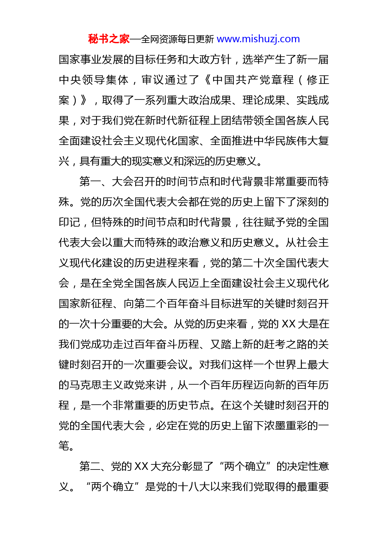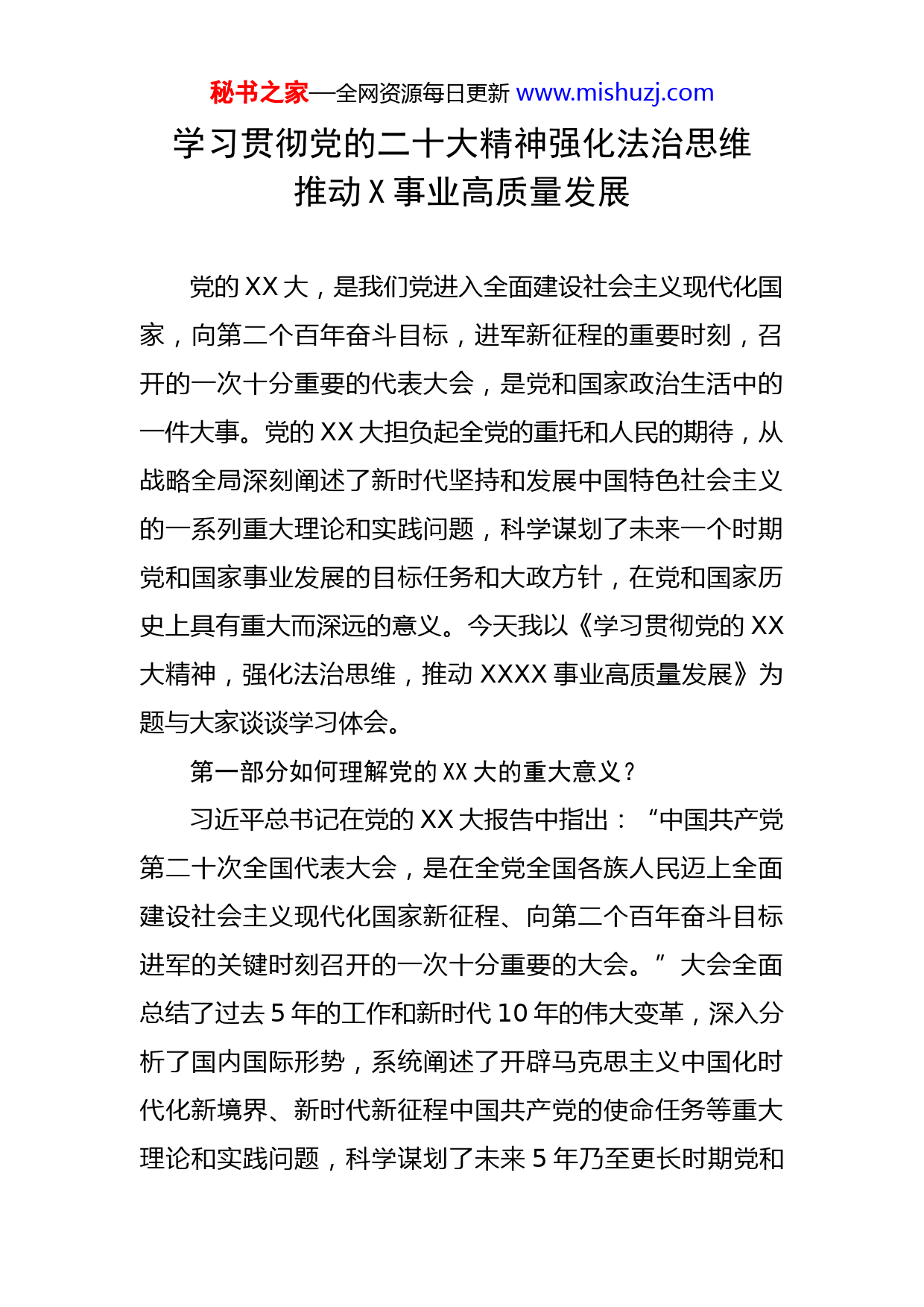 秘书之家—全网资源每日更新www.mishuzj.com学习贯彻党的二十大精神强化法治思维推动X事业高质量发展党的XX大,是我们党进入全面建设社会主义现代化国家,向第二个百年奋斗目标,进军新征程的重要时刻,召开的一次十分重要的代表大会,是党和国家政治生活中的一件大事。党的XX大担负起全党的重托和人民的期待,从战略全局深刻阐述了新时代坚持和发展中国特色社会主义的一系列重大理论和实践问题,科学谋划了未来一个时期党和国家事业发展的目标任务和大政方针,在党和国家历史上具有重大而深远的意义。今天我以《学习贯彻党的XX大精神,强化法治思维,推动XXXX事业高质量发展》为题与大家谈谈学习体会。第一部分如何理解党的XX大的重大意义?习近平总书记在党的XX大报告中指出:“中国共产党第二十次全国代表大会,是在全党全国各族人民迈上全面建设社会主义现代化国家新征程、向第二个百年奋斗目标进军的关键时刻召开的一次十分重要的大会。”大会全面总结了过去5年的工作和新时代10年的伟大变革,深入分析了国内国际形势,系统阐述了开辟马克思主义中国化时代化新境界、新时代新征程中国共产党的使命任务等重大理论和实践问题,科学谋划了未来5年乃至更长时期党和秘书之家—全网资源每日更新www.mishuzj.com国家事业发展的目标任务和大政方针,选举产生了新一届中央领导集体,审议通过了《中国共产党章程(修正案)》,取得了一系列重大政治成果、理论成果、实践成果,对于我们党在新时代新征程上团结带领全国各族人民全面建设社会主义现代化国家、全面推进中华民族伟大复兴,具有重大的现实意义和深远的历史意义。第一、大会召开的时间节点和时代背景非常重要而特殊。党的历次全国代表大会都在党的历史上留下了深刻的印记,但特殊的时间节点和时代背景,往往赋予党的全国代表大会以重大而特殊的政治意义和历史意义。从社会主义现代化建设的历史进程来看,党的第二十次全国代表大会,是在全党全国各族人民迈上全面建设社会主义现代化国家新征程、向第二个百年奋斗目标进军的关键时刻召开的一次十分重要的大会。从党的历史来看,党的XX大是在我们党成功走过百年奋斗历程、又踏上新的赶考之路的关键时刻召开的一次重要会议。对我们这样一个世界上最大的马克思主义政党来讲,从一个百年历程迈向新的百年历程,是一个非常重要的历史节点。在这个关键时刻召开的党的全国代表大会,必定在党的历史上留下浓墨重彩的一笔。第二、党的XX大充分彰显了“两个确立”的决定性意义。“两个确立”是党的十八大以来我们党取得的最重要秘书之家—全网资源每日更新www.mishuzj.com政治成果。党的十八大以来,我们党在实践中确立了习近平总书记党中央的核心、全党的核心地位,确立了习近平总书记提出的新理念新思想新战略在党和国家事业发展中的指导地位。新时代的伟大实践充分证明,确立习近平总书记党中央的核心、全党的核心地位,确立习近平新时代中国特色社会主义思想的指导地位,反映了全党全军全国各族人民共同心愿,对新时代党和国家事业发展、对推进中华民族伟大复兴历史进程具有决定性意义。党的XX大旗帜鲜明地坚持和维护“两个确立”,二十届一中全会选举习近平同志继续担任党的总书记,强调坚决维护习近平总书记党中央的核心、全党的核心地位,坚决维护党中央权威和集中统一领导,全面贯彻习近平新时代中国特色社会主义思想。这是确保党的核心和指导思想长期稳定,充分发挥马克思主义执政党的强大政治优势,推动中国特色社会主义事业行稳致远的根本之策。第三、党的XX大取得了一系列具有长期指导意义的重大理论和实践创新成果。党的XX大报告在总结党的十八大以来我们党取得的重大理论和实践创新成果基础上,提出了许多新理念、新思想、新战略、新举措。比如,提出了“两个全面”(全面建设社会主义现代化国家、全面推进中华民族伟大复兴)这一新时代新征程党的奋斗目标;提出了“三个务必”(务必不忘初心、牢记使命,务必谦虚秘书之家—全网资源每日更新www.mishuzj.com谨慎、艰苦奋斗,务必敢于斗争、善于斗争)这一新时代党的作风建设的根本遵循;深刻阐明了党的理论创新“两个结合”、“六个必须坚持”,深刻体现了习近平新时代中国特色社会主义思想的世界观方法论和贯穿其中的立场观点方法;系统阐述了中国式现代化的中国特色、本质要求和必须牢牢把握的重大原则;突出强调了科教兴国、全面依法治国、国家安全等方面的重大部署,这些对于新时代新征程党和国家事业发展都具有重大而长远的指导作用。第四、党的XX大科学回答了“以党的自我革命引领社会革命”这一重大历史命题。习近平总书记在党的十九届六中全会上系统阐述了党的自我革命的深刻内涵和重大意义,强调这是我们党给出的跳出治乱兴衰历史周期率的第二个答案。党的XX大报告围绕“以党的自我革命引领社会革命”,提出“时刻保持解决大党独有难题的清醒和坚定”、“两个长期存在”、“两个永远在路上”、深入推进新时代党的建设新的伟大工程、健全全面从严治党体系等重要思想;提出坚持和加强党中央集中统一领导、坚持不懈用习近平新时代中国特色社会主义思想凝心铸
