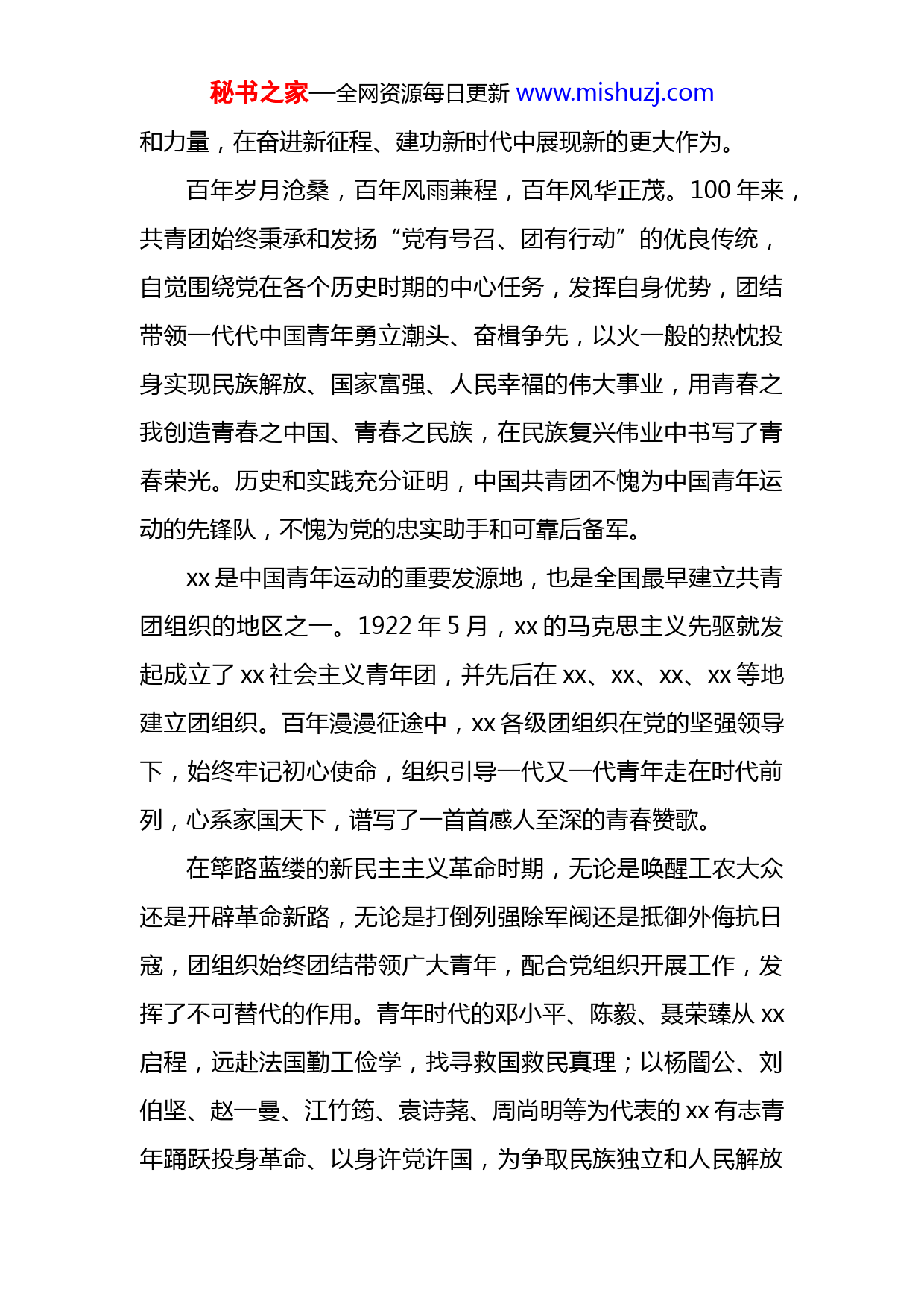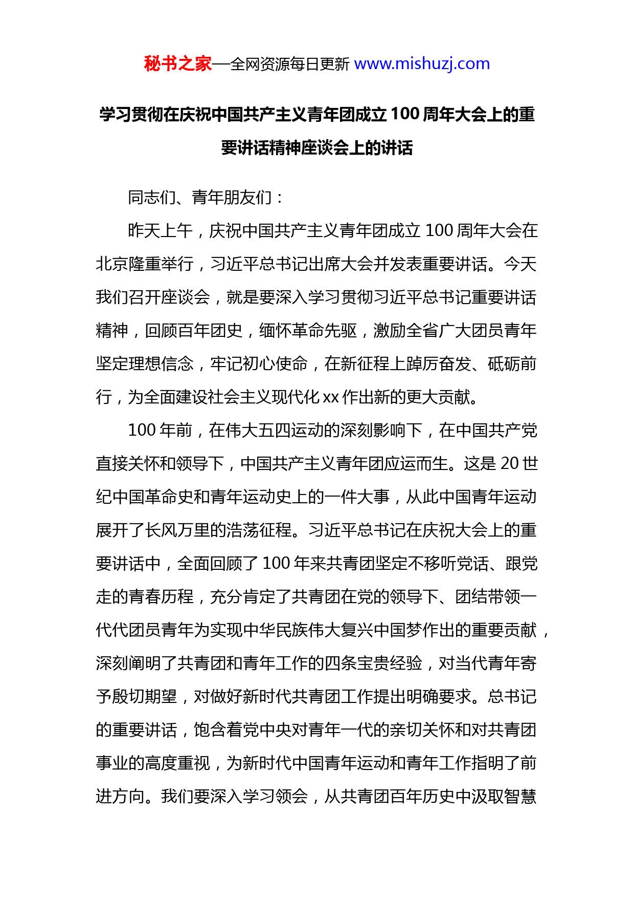 秘书之家—全网资源每日更新www.mishuzj.com学习贯彻在庆祝中国共产主义青年团成立100周年大会上的重要讲话精神座谈会上的讲话同志们、青年朋友们:昨天上午,庆祝中国共产主义青年团成立100周年大会在北京隆重举行,习近平总书记出席大会并发表重要讲话。今天我们召开座谈会,就是要深入学习贯彻习近平总书记重要讲话精神,回顾百年团史,缅怀革命先驱,激励全省广大团员青年坚定理想信念,牢记初心使命,在新征程上踔厉奋发、砥砺前行,为全面建设社会主义现代化xx作出新的更大贡献。100年前,在伟大五四运动的深刻影响下,在中国共产党直接关怀和领导下,中国共产主义青年团应运而生。这是20世纪中国革命史和青年运动史上的一件大事,从此中国青年运动展开了长风万里的浩荡征程。习近平总书记在庆祝大会上的重要讲话中,全面回顾了100年来共青团坚定不移听党话、跟党走的青春历程,充分肯定了共青团在党的领导下、团结带领一代代团员青年为实现中华民族伟大复兴中国梦作出的重要贡献,深刻阐明了共青团和青年工作的四条宝贵经验,对当代青年寄予殷切期望,对做好新时代共青团工作提出明确要求。总书记的重要讲话,饱含着党中央对青年一代的亲切关怀和对共青团事业的高度重视,为新时代中国青年运动和青年工作指明了前进方向。我们要深入学习领会,从共青团百年历史中汲取智慧秘书之家—全网资源每日更新www.mishuzj.com和力量,在奋进新征程、建功新时代中展现新的更大作为。百年岁月沧桑,百年风雨兼程,百年风华正茂。100年来,共青团始终秉承和发扬“党有号召、团有行动”的优良传统,自觉围绕党在各个历史时期的中心任务,发挥自身优势,团结带领一代代中国青年勇立潮头、奋楫争先,以火一般的热忱投身实现民族解放、国家富强、人民幸福的伟大事业,用青春之我创造青春之中国、青春之民族,在民族复兴伟业中书写了青春荣光。历史和实践充分证明,中国共青团不愧为中国青年运动的先锋队,不愧为党的忠实助手和可靠后备军。xx是中国青年运动的重要发源地,也是全国最早建立共青团组织的地区之一。1922年5月,xx的马克思主义先驱就发起成立了xx社会主义青年团,并先后在xx、xx、xx、xx等地建立团组织。百年漫漫征途中,xx各级团组织在党的坚强领导下,始终牢记初心使命,组织引导一代又一代青年走在时代前列,心系家国天下,谱写了一首首感人至深的青春赞歌。在筚路蓝缕的新民主主义革命时期,无论是唤醒工农大众还是开辟革命新路,无论是打倒列强除军阀还是抵御外侮抗日寇,团组织始终团结带领广大青年,配合党组织开展工作,发挥了不可替代的作用。青年时代的邓小平、陈毅、聂荣臻从xx启程,远赴法国勤工俭学,找寻救国救民真理;以杨闇公、刘伯坚、赵一曼、江竹筠、袁诗荛、周尚明等为代表的xx有志青年踊跃投身革命、以身许党许国,为争取民族独立和人民解放秘书之家—全网资源每日更新www.mishuzj.com冲锋陷阵、抛洒热血,用信念和生命铸就起一座座巍峨丰碑。在如火如荼的社会主义革命和建设时期,各级团组织组建起一支支青年突击队、青年垦荒队、青年扫盲队,满怀豪情投身社会主义改造的伟大实践。从xx走出去的黄继光、邱少云、柴云振等一批青年英雄,义无反顾奔赴抗美援朝前线;正值青年的邓稼先、于敏等“两弹元勋”扎根xx的崇山峻岭,“干惊天动地事、做隐姓埋名人”;丁爱谱、杨桂兰等一大批热血青年来到“三线建设”主战场,“三块石头一口锅、帐篷搭在山窝窝”,创造了深山建大厂、峡谷起钢城的人间奇迹。在波澜壮阔的改革开放和社会主义现代化建设新时期,各级团组织大力弘扬“敢为天下先”的改革创新精神,深入开展新长征突击手、青年岗位能手、青年文明号、希望工程、保护母亲河等一系列主题活动,引领带动广大团员青年始终奋战在改革发展最前沿,涌现出王瑛、胡小燕、蒋佳冀等一批青年改革先锋,在xx改革开放时代洪流中书写了绚烂的青春华章。中国特色社会主义进入新时代,全省各级团组织和广大团员青年牢记习近平总书记谆谆教诲,坚持自信自强、守正创新,积极投身治蜀兴川火热实践,谱写了青春无悔的时代乐章。大家始终高举党的旗帜,坚定不移听党话跟党走,自觉把个人奋斗融入党和人民的共同奋斗中,展现了对党和国家的赤忱热爱;大家始终与xx改革发展同频共振,在科技攻关最前沿、创新创业第一线、脱贫攻坚主战场、社会服务各领域,到处都活跃着秘书之家—全网资源每日更新www.mishuzj.com青年人的奋斗身影,展现了拼搏奋进的昂扬风貌;大家面对抗震救灾、抗洪抢险、疫情防控、森林草原防灭火等急难险重任务冲锋在前,一支支青年突击队、一批批青年志愿者,积极请战、踊跃参战,在人民最需要的时候挺身而出、不畏艰险、舍生忘死,展现了堪当大任的青春风采;大家扎根基层服务群众,把平凡的岗位作为成就人生的舞台,依靠勤劳和汗水创造出非凡的业绩,展现了甘于奉献的优良品格。刚才xx、xx、xx、xx、xx、xx6位青年代表,从不同侧面讲述了立足本职建功立业的收获体会,抒发了与祖国同发展、与人民共奋进的理想抱负,情真意切,感人至深,彰显了新时代xx青年的责任担当和奋斗激情。一代人有一代人的际遇,一代青年有一代青年的使命。习近平总书记深情寄语