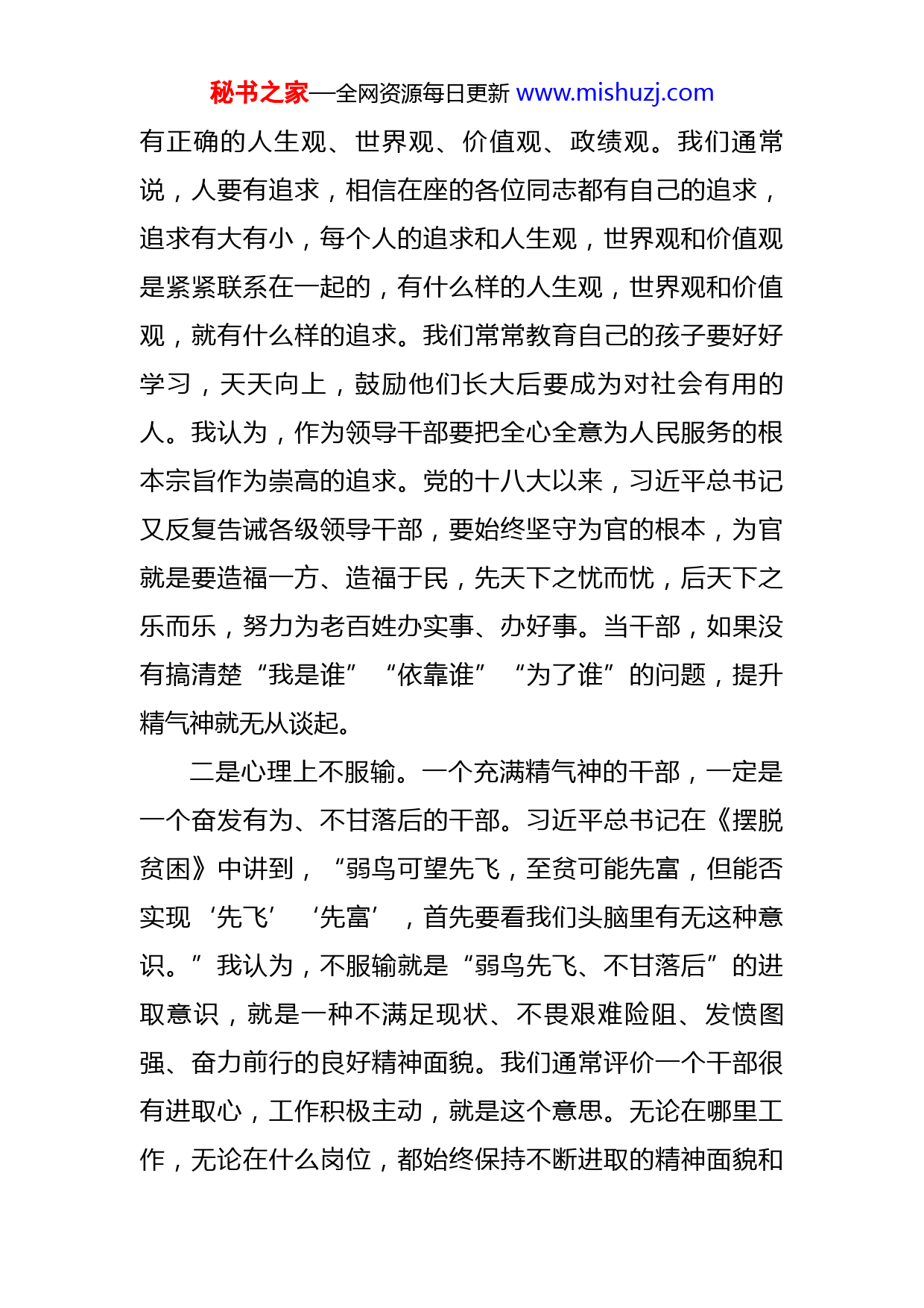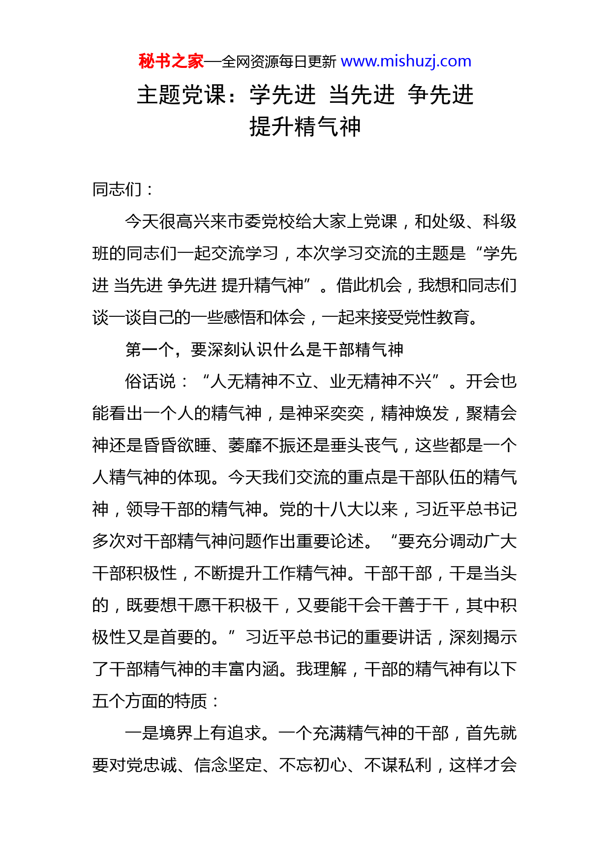 秘书之家—全网资源每日更新www.mishuzj.com主题党课:学先进当先进争先进提升精气神同志们:今天很高兴来市委党校给大家上党课,和处级、科级班的同志们一起交流学习,本次学习交流的主题是“学先进当先进争先进提升精气神”。借此机会,我想和同志们谈一谈自己的一些感悟和体会,一起来接受党性教育。第一个,要深刻认识什么是干部精气神俗话说:“人无精神不立、业无精神不兴”。开会也能看出一个人的精气神,是神采奕奕,精神焕发,聚精会神还是昏昏欲睡、萎靡不振还是垂头丧气,这些都是一个人精气神的体现。今天我们交流的重点是干部队伍的精气神,领导干部的精气神。党的十八大以来,习近平总书记多次对干部精气神问题作出重要论述。“要充分调动广大干部积极性,不断提升工作精气神。干部干部,干是当头的,既要想干愿干积极干,又要能干会干善于干,其中积极性又是首要的。”习近平总书记的重要讲话,深刻揭示了干部精气神的丰富内涵。我理解,干部的精气神有以下五个方面的特质:一是境界上有追求。一个充满精气神的干部,首先就要对党忠诚、信念坚定、不忘初心、不谋私利,这样才会秘书之家—全网资源每日更新www.mishuzj.com有正确的人生观、世界观、价值观、政绩观。我们通常说,人要有追求,相信在座的各位同志都有自己的追求,追求有大有小,每个人的追求和人生观,世界观和价值观是紧紧联系在一起的,有什么样的人生观,世界观和价值观,就有什么样的追求。我们常常教育自己的孩子要好好学习,天天向上,鼓励他们长大后要成为对社会有用的人。我认为,作为领导干部要把全心全意为人民服务的根本宗旨作为崇高的追求。党的十八大以来,习近平总书记又反复告诫各级领导干部,要始终坚守为官的根本,为官就是要造福一方、造福于民,先天下之忧而忧,后天下之乐而乐,努力为老百姓办实事、办好事。当干部,如果没有搞清楚“我是谁”“依靠谁”“为了谁”的问题,提升精气神就无从谈起。二是心理上不服输。一个充满精气神的干部,一定是一个奋发有为、不甘落后的干部。习近平总书记在《摆脱贫困》中讲到,“弱鸟可望先飞,至贫可能先富,但能否实现‘先飞’‘先富’,首先要看我们头脑里有无这种意识。”我认为,不服输就是“弱鸟先飞、不甘落后”的进取意识,就是一种不满足现状、不畏艰难险阻、发愤图强、奋力前行的良好精神面貌。我们通常评价一个干部很有进取心,工作积极主动,就是这个意思。无论在哪里工作,无论在什么岗位,都始终保持不断进取的精神面貌和秘书之家—全网资源每日更新www.mishuzj.com积极向上的工作状态。我们学习先进代表,就要自觉增强弱鸟先飞、不甘落后的进取意识、责任意识,摆脱思想和意识的贫困。当前,x市的经济在全省较为落后,广大党员干部更要传承好思想好传统好作风,别人能做到的我们也能做到,而且要做得更好。三是状态上有拼劲。一个充满精气神的干部,必定是一个意志力坚定、做事有韧劲,能坚持不懈、久久为功的干部。在我看来,一个具备良好精气神的干部,工作上一定是一个拼命三郎,一定是饱含激情,一定是把工作当作事业来干,不达目的决不罢休。我们干事业,就是要像砍柴一样,一刀接着一刀砍,一棒接着一棒干,一张蓝图干到底,只有这样才能干出一番事业。如果东一榔头、西一棒子,不仅半途而废,更会劳民伤财。群众最反感的就是这样的干部。特别是一些艰难、复杂的工作,不可能一蹴而就、立竿见影。我们学习先进,其中重要一个方面就是要学习工匠精神,认准了一件事,就持之以恒地干下去,不管遇到多大的困难,都能初心不改,不达目的不罢休。在日常生活中,对领导交代的难事,不好办的事,有些同志是愉快地接受,想尽办法,努力拼命,去把这件事干成;有些同志是推三阻四,想尽各种理由不干,摞挑子;有些同志活接了也不干,干不成,想尽各种理由,看问题一大堆。这些现象,究其原因,缺乏的就是一种拼劲和闯秘书之家—全网资源每日更新www.mishuzj.com劲。我认为,只要你拼了,没有什么困难抗不下,只要努力了,认真了,没有什么硬骨头啃不下,只有想不想干的问题。四是作风上肯实干。一个充满精气神的干部,应该是一个干在实处、走在前列的干部。提出要行动至上,像接力赛一样,一棒接着一棒干下去,脚踏实地干出成效来。“空谈误国,实干兴邦。”一个干部有没有精气神,就要看是否有行动至上的务实作风,是在空谈,还是在实干。在现实生活中,很多这样的情况,以文件落实文件,以会议落实会议,纸上谈兵,坐而论道。上级文件下来,不落实,也不督促,这样的情况比比皆是,这些都是空谈的典型表现。从先进代表身上,我们更加深刻地理解了什么叫“等不起的危机感,慢不得的紧迫感,坐不住的责任感。”时代的发展,社会的进步,特别需要“背着石头上山也要干”,撸起袖子加油干,始终保持强烈的事业心和责任感,敢于负责、勇于担当,崇尚实干、力戒空谈,以担当尽责、奋发有为书写精彩人生。五是情感上勤为民。一个充满精气神的干部,还应该是情为民所系、权为民所用、利为民所谋的干部。习近平总书记态度鲜明地指出,“当官,当共产党的‘官’,只有一个宗旨,就是造福于民。”他还指出,造福于民还要与民相知心,要切实改进领导作风,深入群众,密切党同秘书