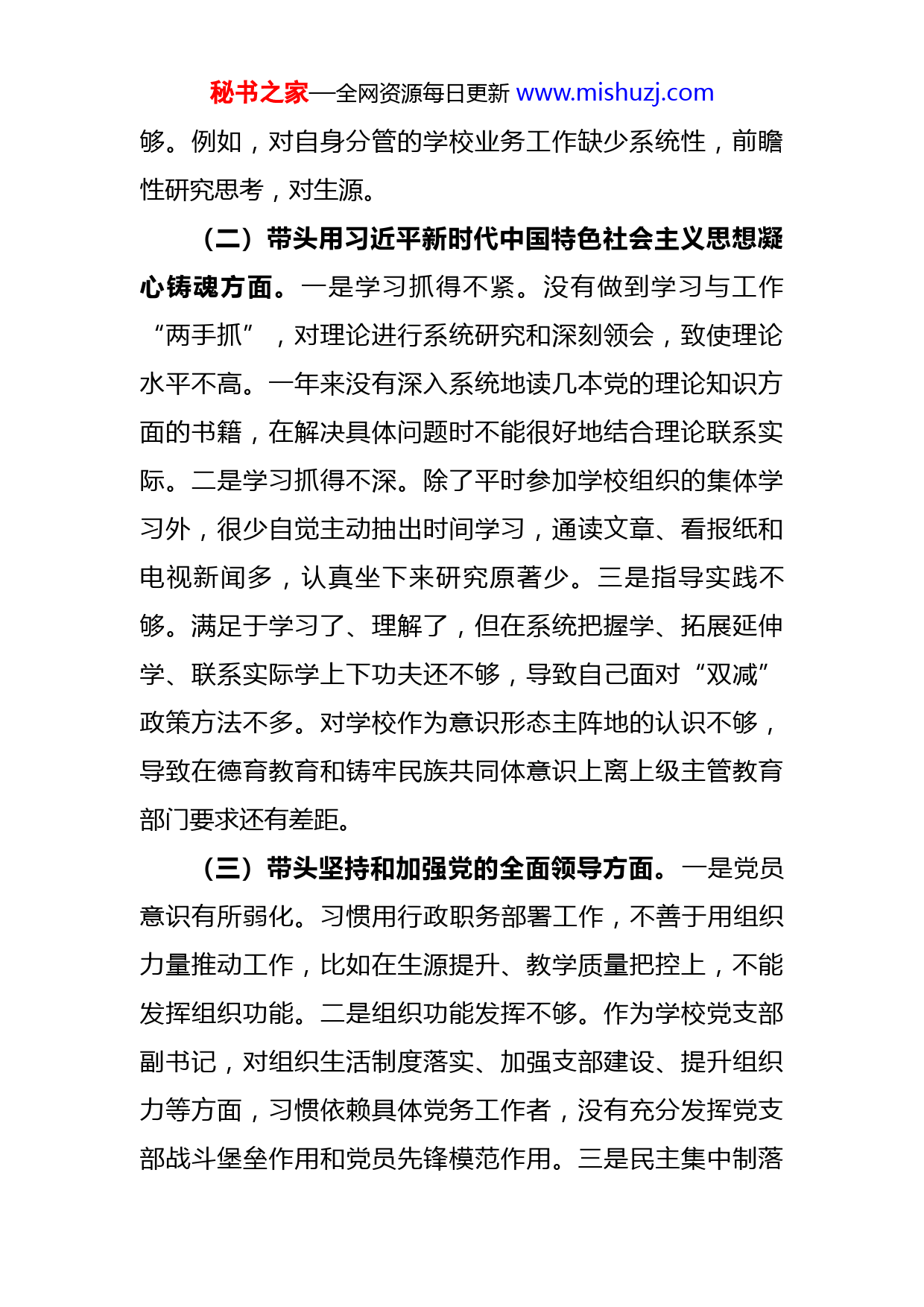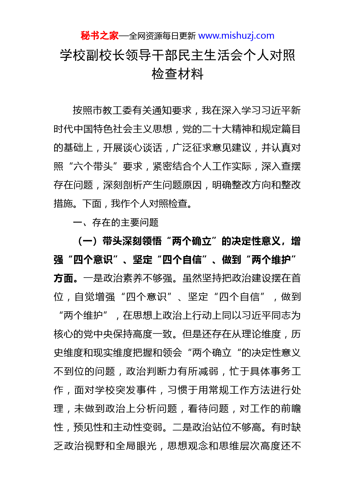 秘书之家—全网资源每日更新www.mishuzj.com学校副校长领导干部民主生活会个人对照检查材料按照市教工委有关通知要求,我在深入学习习近平新时代中国特色社会主义思想,党的二十大精神和规定篇目的基础上,开展谈心谈话,广泛征求意见建议,并认真对照“六个带头”要求,紧密结合个人工作实际,深入查摆存在问题,深刻剖析产生问题原因,明确整改方向和整改措施。下面,我作个人对照检查。一、存在的主要问题(一)带头深刻领悟“两个确立”的决定性意义,增强“四个意识”、坚定“四个自信”、做到“两个维护”方面。一是政治素养不够强。虽然坚持把政治建设摆在首位,自觉增强“四个意识”、坚定“四个自信”,做到“两个维护”,在思想上政治上行动上同以习近平同志为核心的党中央保持高度一致。但是还存在从理论维度,历史维度和现实维度把握和领会“两个确立“的决定性意义不到位的问题,政治判断力有所减弱,忙于具体事务工作,面对学校突发事件,习惯于用常规工作方法进行处理,未做到政治上分析问题,看待问题,对工作的前瞻性,预见性和主动性变弱。二是政治站位不够高。有时缺乏政治视野和全局眼光,思想观念和思维层次高度还不秘书之家—全网资源每日更新www.mishuzj.com够。例如,对自身分管的学校业务工作缺少系统性,前瞻性研究思考,对生源。(二)带头用习近平新时代中国特色社会主义思想凝心铸魂方面。一是学习抓得不紧。没有做到学习与工作“两手抓”,对理论进行系统研究和深刻领会,致使理论水平不高。一年来没有深入系统地读几本党的理论知识方面的书籍,在解决具体问题时不能很好地结合理论联系实际。二是学习抓得不深。除了平时参加学校组织的集体学习外,很少自觉主动抽出时间学习,通读文章、看报纸和电视新闻多,认真坐下来研究原著少。三是指导实践不够。满足于学习了、理解了,但在系统把握学、拓展延伸学、联系实际学上下功夫还不够,导致自己面对“双减”政策方法不多。对学校作为意识形态主阵地的认识不够,导致在德育教育和铸牢民族共同体意识上离上级主管教育部门要求还有差距。(三)带头坚持和加强党的全面领导方面。一是党员意识有所弱化。习惯用行政职务部署工作,不善于用组织力量推动工作,比如在生源提升、教学质量把控上,不能发挥组织功能。二是组织功能发挥不够。作为学校党支部副书记,对组织生活制度落实、加强支部建设、提升组织力等方面,习惯依赖具体党务工作者,没有充分发挥党支部战斗堡垒作用和党员先锋模范作用。三是民主集中制落秘书之家—全网资源每日更新www.mishuzj.com实有所不足。坚持党内同志关系还不够,遇到急难险重问题,习惯以行政手段解决问题,在听取同志意见建议,形成建设合力上有待提升。(四)带头坚持以人民为中心的发展思想,推动改革发展稳定方面。一是教育树人的思想树得还不牢。对做好人民教育,提升人民素质的责任心和使命感还不够,在提升生源质量和数量这个制约学校长远发展的核心问题上存在等靠思想,缺乏靠前一步、主动作为的魄力。二是办好人民教育的信心还不够。主要表现在面对“双减”政策时,自己预判性不够,没有充电认识到教育的核心是树人、育人,一味考虑上级要求,忽视教育主体感受。三是提升教育质量方法不多。受疫情影响,今年全年基本是采用线上教育手段进行。导致一些传统的评价方法不适用,对教学质量无法实现有效评价。(五)带头发扬斗争精神,防范化解风险挑战方面。一是标准有所弱化。完成教学指标任务的标准有所降低,在抓工作推进落实上还存在一手软、一手硬的现象。在具体工作中,还存在认为安排了即是落实了,追求形式、忽略实效,缺乏一竿子到底精神。二是创新动力不足。有安于现状、求稳、怕出问题的思想,在一定程度上缺乏闯劲、精神状态有所懈怠。对得心应手的业务抓得多一些、实一些,对难度大、见效慢的工作抓得虚一些、少一些,秘书之家—全网资源每日更新www.mishuzj.com一些新想法只停留在心动而无行动的状态。三是主动意识不强。习惯惯性思维,缺乏破局能力。在抓好常态化疫情防控工作中,离事事带头、以上率下要求还有一定差距。没有深层次地认识到学校是教书育人的主阵地,是新时代党的治疆方略践行者、传播者,平时注重教育质量和教学成绩,忽视对教职员工的意识形态教育,导致少数人员喜欢讲牢骚话、传播小道消息和负面新闻。(六)带头落实全面从严治党政治责任方面。一是存在好人主义。干部监督管理不严格,好人主义思想较浓,对一些苗头性问题警钟敲得多,会上讲得硬,实际执行软,工作安排的多,抓日常监管相对不够,制度的执行力和约束力没有充分发挥,对干部廉洁从政的日常行为规范情况的监管还不够到位。二是底线思维树得不牢。存在“说得多、做得少”的现象,廉政教育抓得不紧,多以开会、谈话的方式进行教育,方式单一、氛围不浓,惩治和预防体系建设及发挥作用不理想。三是一岗双责任落实还不够。总认为问题没发生在我单位就不管不间,存在事不关己高高挂起等心理。对上年度民主生活会上查摆的问题,自己能够认真抓好整改并建立长效机制。本人不存在信仰宗教、购买股票、基金等情况;不存在利用名贵特产等资源谋取私利、名利输