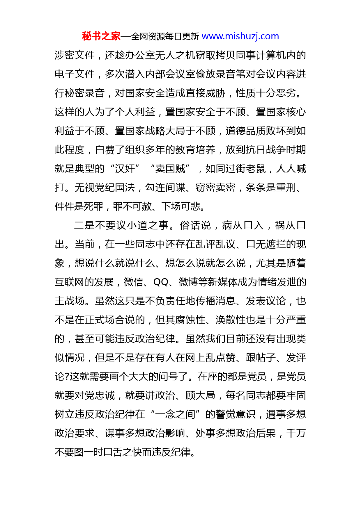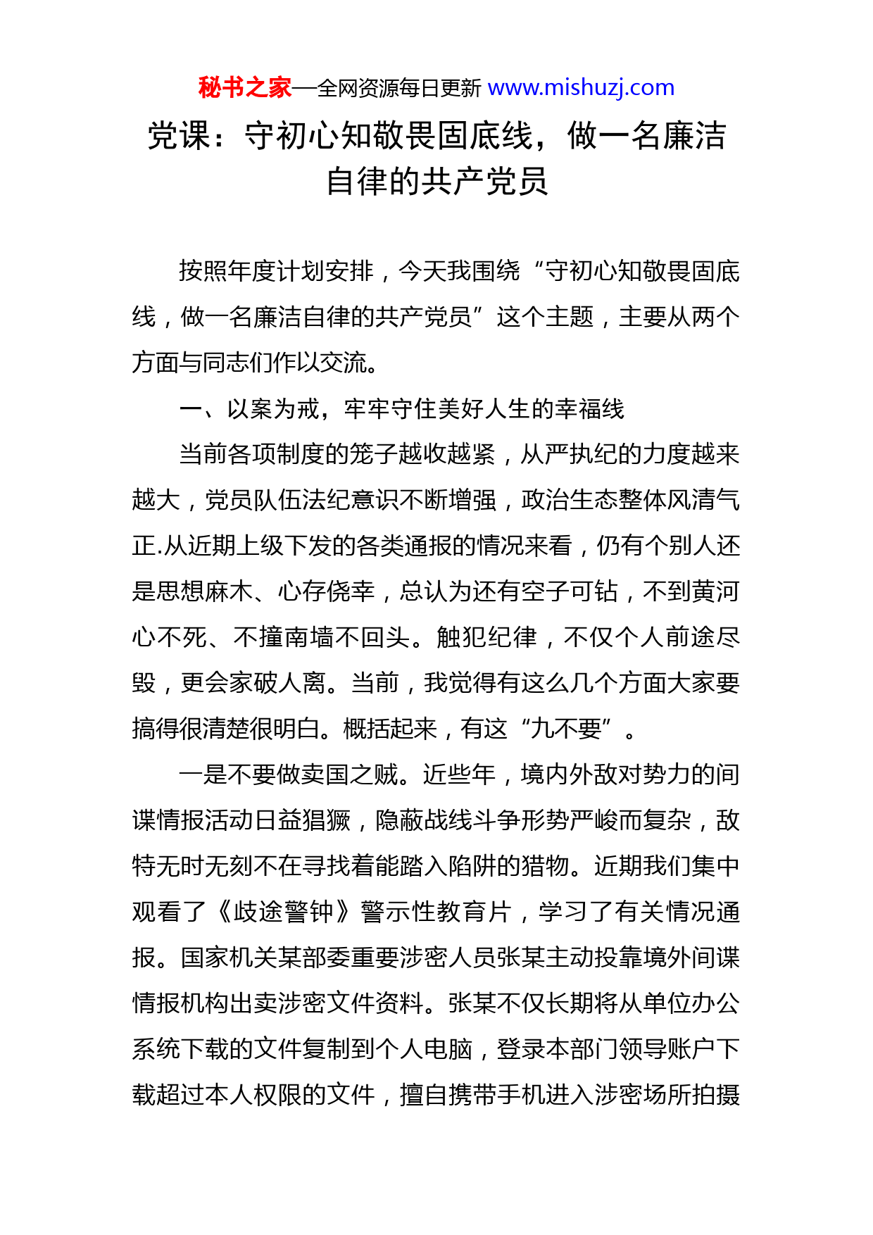秘书之家—全网资源每日更新www.mishuzj.com党课:守初心知敬畏固底线,做一名廉洁自律的共产党员按照年度计划安排,今天我围绕“守初心知敬畏固底线,做一名廉洁自律的共产党员”这个主题,主要从两个方面与同志们作以交流。一、以案为戒,牢牢守住美好人生的幸福线当前各项制度的笼子越收越紧,从严执纪的力度越来越大,党员队伍法纪意识不断增强,政治生态整体风清气正.从近期上级下发的各类通报的情况来看,仍有个别人还是思想麻木、心存侥幸,总认为还有空子可钻,不到黄河心不死、不撞南墙不回头。触犯纪律,不仅个人前途尽毁,更会家破人离。当前,我觉得有这么几个方面大家要搞得很清楚很明白。概括起来,有这“九不要”。一是不要做卖国之贼。近些年,境内外敌对势力的间谍情报活动日益猖獗,隐蔽战线斗争形势严峻而复杂,敌特无时无刻不在寻找着能踏入陷阱的猎物。近期我们集中观看了《歧途警钟》警示性教育片,学习了有关情况通报。国家机关某部委重要涉密人员张某主动投靠境外间谍情报机构出卖涉密文件资料。张某不仅长期将从单位办公系统下载的文件复制到个人电脑,登录本部门领导账户下载超过本人权限的文件,擅自携带手机进入涉密场所拍摄秘书之家—全网资源每日更新www.mishuzj.com涉密文件,还趁办公室无人之机窃取拷贝同事计算机内的电子文件,多次潜入内部会议室偷放录音笔对会议内容进行秘密录音,对国家安全造成直接威胁,性质十分恶劣。这样的人为了个人利益,置国家安全于不顾、置国家核心利益于不顾、置国家战略大局于不顾,道德品质败坏到如此程度,白费了组织多年的教育培养,放到抗日战争时期就是典型的“汉奸”“卖国贼”,如同过街老鼠,人人喊打。无视党纪国法,勾连间谍、窃密卖密,条条是重刑、件件是死罪,罪不可赦、下场可悲。二是不要议小道之事。俗话说,病从口入,祸从口出。当前,在一些同志中还存在乱评乱议、口无遮拦的现象,想说什么就说什么、想怎么说就怎么说,尤其是随着互联网的发展,微信、QQ、微博等新媒体成为情绪发泄的主战场。虽然这只是不负责任地传播消息、发表议论,也不是在正式场合说的,但其腐蚀性、涣散性也是十分严重的,甚至可能违反政治纪律。虽然我们目前还没有出现类似情况,但是不是存在有人在网上乱点赞、跟帖子、发评论?这就需要画个大大的问号了。在座的都是党员,是党员就要对党忠诚,就要讲政治、顾大局,每名同志都要牢固树立违反政治纪律在“一念之间”的警觉意识,遇事多想政治要求、谋事多想政治影响、处事多想政治后果,千万不要图一时口舌之快而违反纪律。秘书之家—全网资源每日更新www.mishuzj.com三是不要贪杯中之酒。同志们要想一想一杯酒付出的代价有多大,有可能是自己的政治生命提前收场,为了那“一时爽”,带来了“一世悔”,实在是得不偿失。说到喝酒,还要和大家着重强调一下酒驾醉驾问题。关于酒驾醉驾的通报我们学到过很多,每个通报都让人警醒,都是血的教训。大家要知道,酒驾违法、醉驾入刑。酒驾违反了《治安管理处罚法》和《道路交通安全法》,醉驾违反了《刑法》,必须依法追究刑事责任。依据党纪条规,醉驾要给予开除党籍、行政降职处理。从发生的案件教训看,酒后驾车发生交通事故,轻则伤人、重则亡人,不是赔几十万甚至上百万,就是把命搭上,给他人和家人造成灾难性后果,并且按照规定要求必须给予开除党籍处分、行政降职处理,一处理就意味着政治前途全部归零,不但葬送了前程、还断送了后路,辛辛苦苦十几年,一下回到解放前。所以,我要奉劝大家“莫贪杯,杯中有铁纪”。四是不要有非分之想。人有非分之想,必有非分之行。不符合共产党员精神品格要求、不符合政策法规的,都是非分之想。我们都要明白,手中的权力是服务人民群众的,决不能用自己手中的权力干一些违法乱纪的事,也不能习惯于耍点小特权、占点小便宜,让部属办点小私事、搞点小保障,这是典型的官僚主义。大家要记住,公权姓公,要依法用权,不要总想着搞点特权。什么时候觉秘书之家—全网资源每日更新www.mishuzj.com得自己有权了、好使了、说了算了,那可能离触碰红线也就不远了。五是不要沾赌博之毒。赌博,往往渗透在现代化的物质文化之中,具有很强的欺骗性、诱惑性和腐蚀性。近些年,赌博引起的事故案件、不胜枚举.事实证明,无论是传统赌博还是新兴的网络赌博,一旦沾染,轻则负债累累、家破人亡,重则受到法律制裁,甚至搭上性命。我们要养成老老实实靠工资生活、靠合法收入生活的习惯和自觉,保持清醒、努力拼搏,才能远离伤害、赢得未来。六是不要拿不义之财。莫伸手、伸手必被捉。很多事情不要以为只有你知我知天知地知,搞得很隐蔽,谁也发现不了。天网恢恢疏而不漏,久下的账早晚要还的.这几年,先后有中央纪委通报的多起顶风违纪违法案件,多起涉及基层敏感事务方面顶风违纪违法问题。有的到了麻木不仁、顽固不化的地步,其中,有某局长利用职务之便收受钱款共计28.74万元,某医院领导收受部属钱物折合17.35万元,违规办理转正事宜等案件问题,相关责任人受到党纪处分和行政处理。这些违法违纪典型问题,都是拿了不该拿的,花了不该花的,胆大妄为、不知敬畏。七是不要去是非之地。是非之地就会